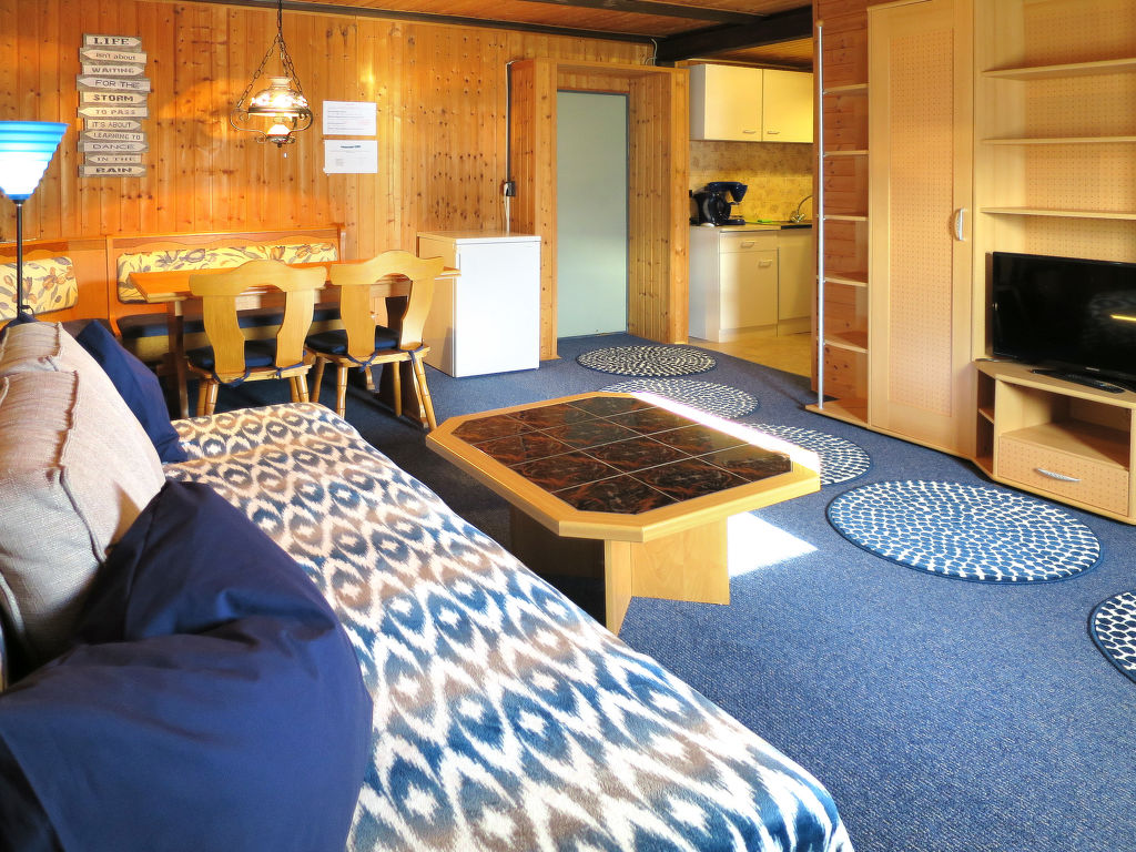 3-Zimmer-Wohnung, Dachgeschoss, ca. 50 m². Über Balkon und Vorraum in Wohnraum mit Sitzgruppe, Essplatz (Eckbank), offene Küche (4 Platten, Backofen, Geschirrspüler, Kühlschrank, Kaffeemaschine, Wasserkocher) und Balkonausgang. Doppelzimmer, von hier in Doppelzimmer (Dachschräge) mit Bad/Dusche/WC.