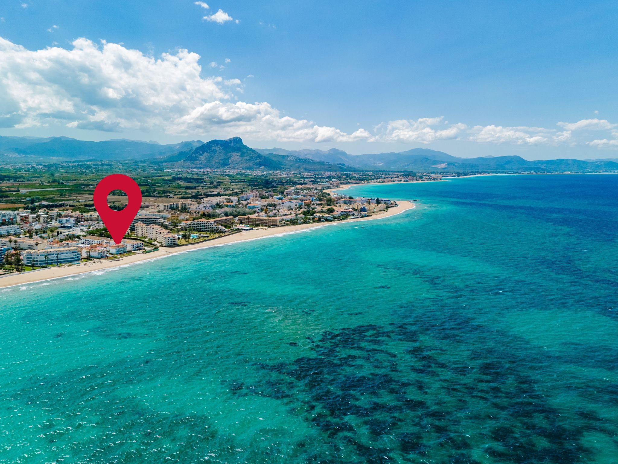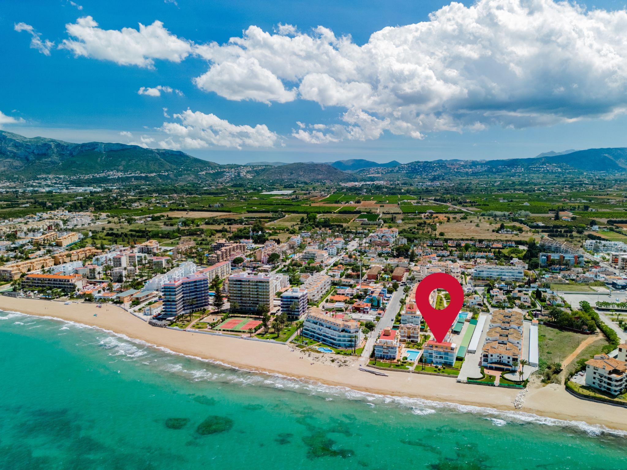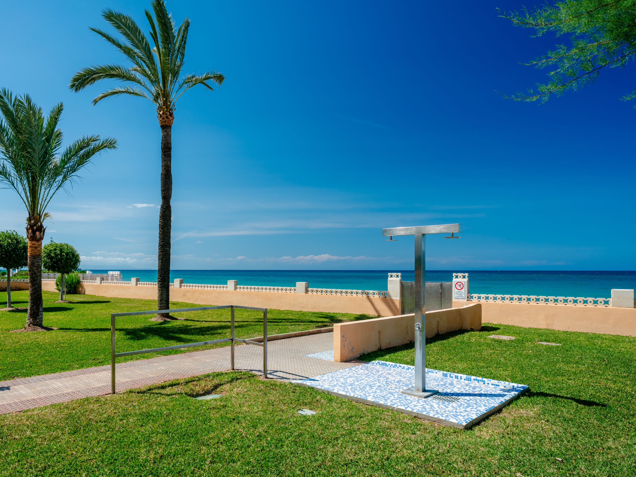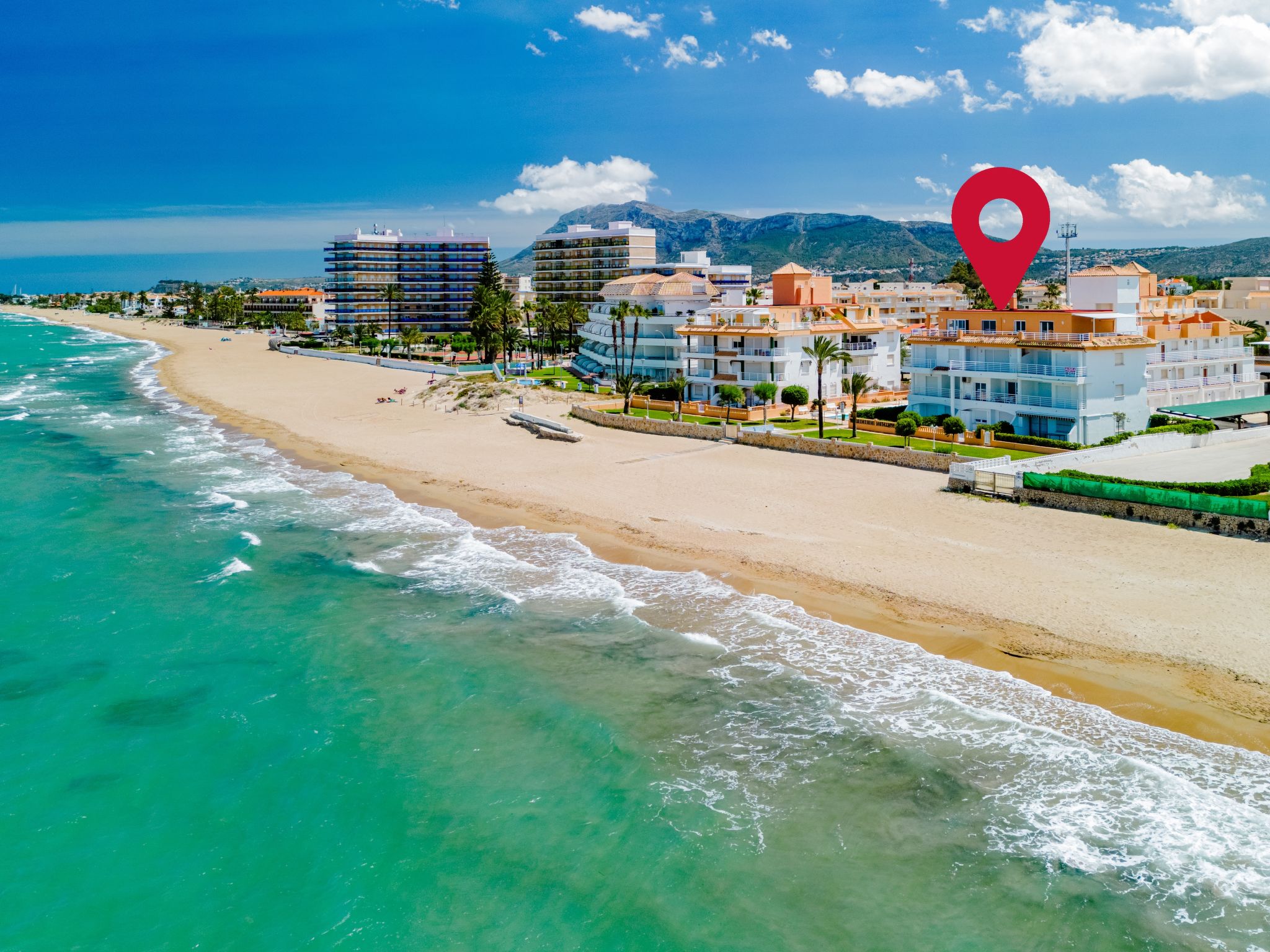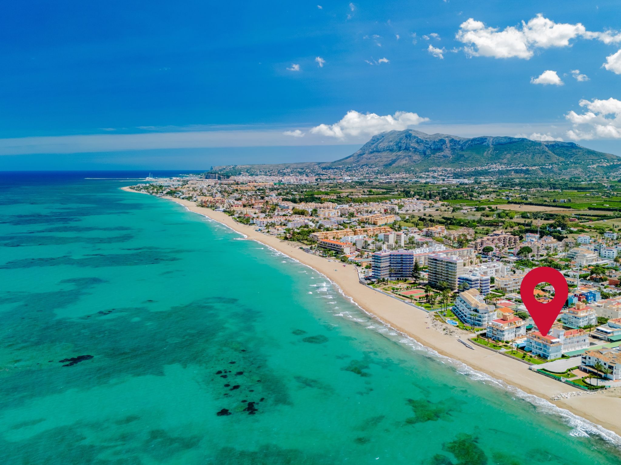Les Marines 4 km von Dénia: Appartementhaus "Talima". Im Bezirk Les Marines, 50 m vom Meer, 15 m vom Strand, direkter Zugang zum Strand, in einer Sackgasse. Zur Mitbenutzung: Garten (eingezäunt) mit Rasen, Schwimmbad (16 x 8 m, 75 - 250 cm tief, saisonale Verfügbarkeit: 01.Jan.-31.Dez.). Aussendusche. Supermarkt 450 m, Restaurant 200 m, Bar, Café 450 m.