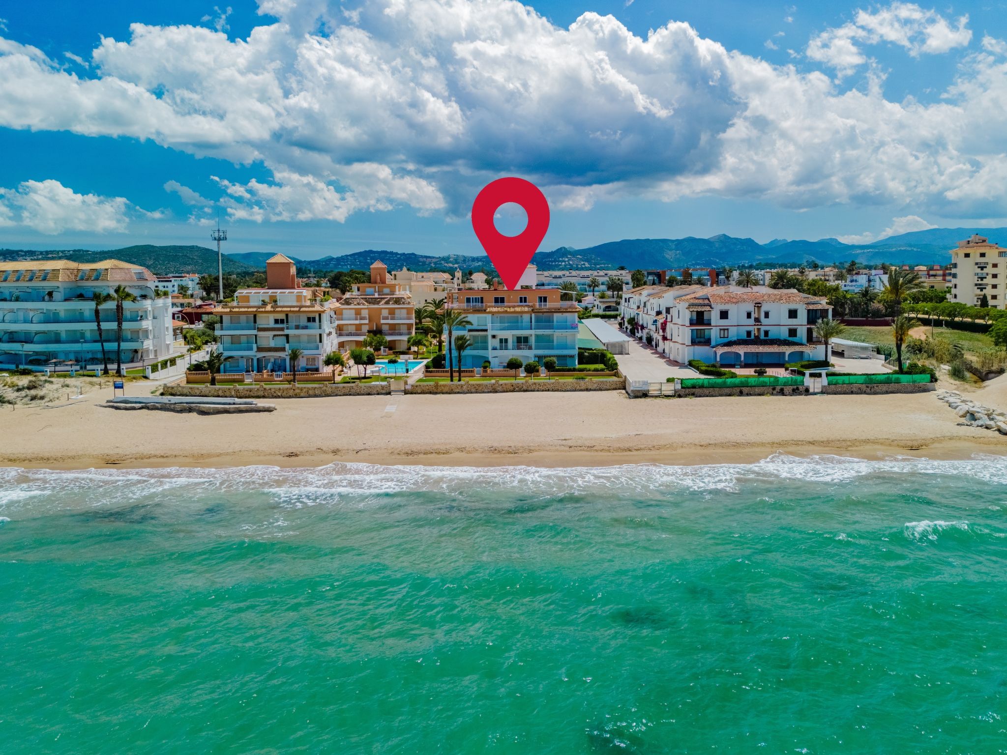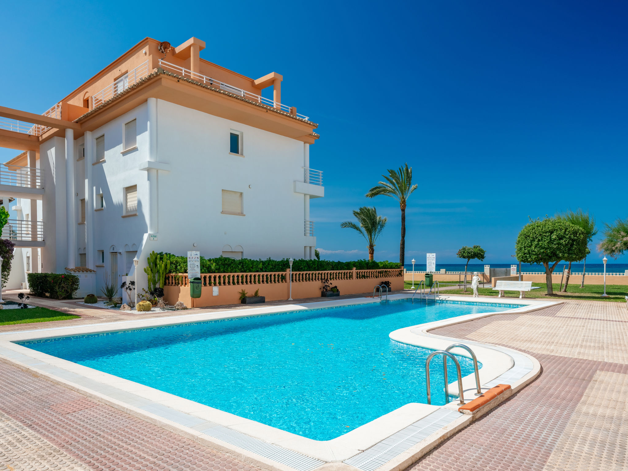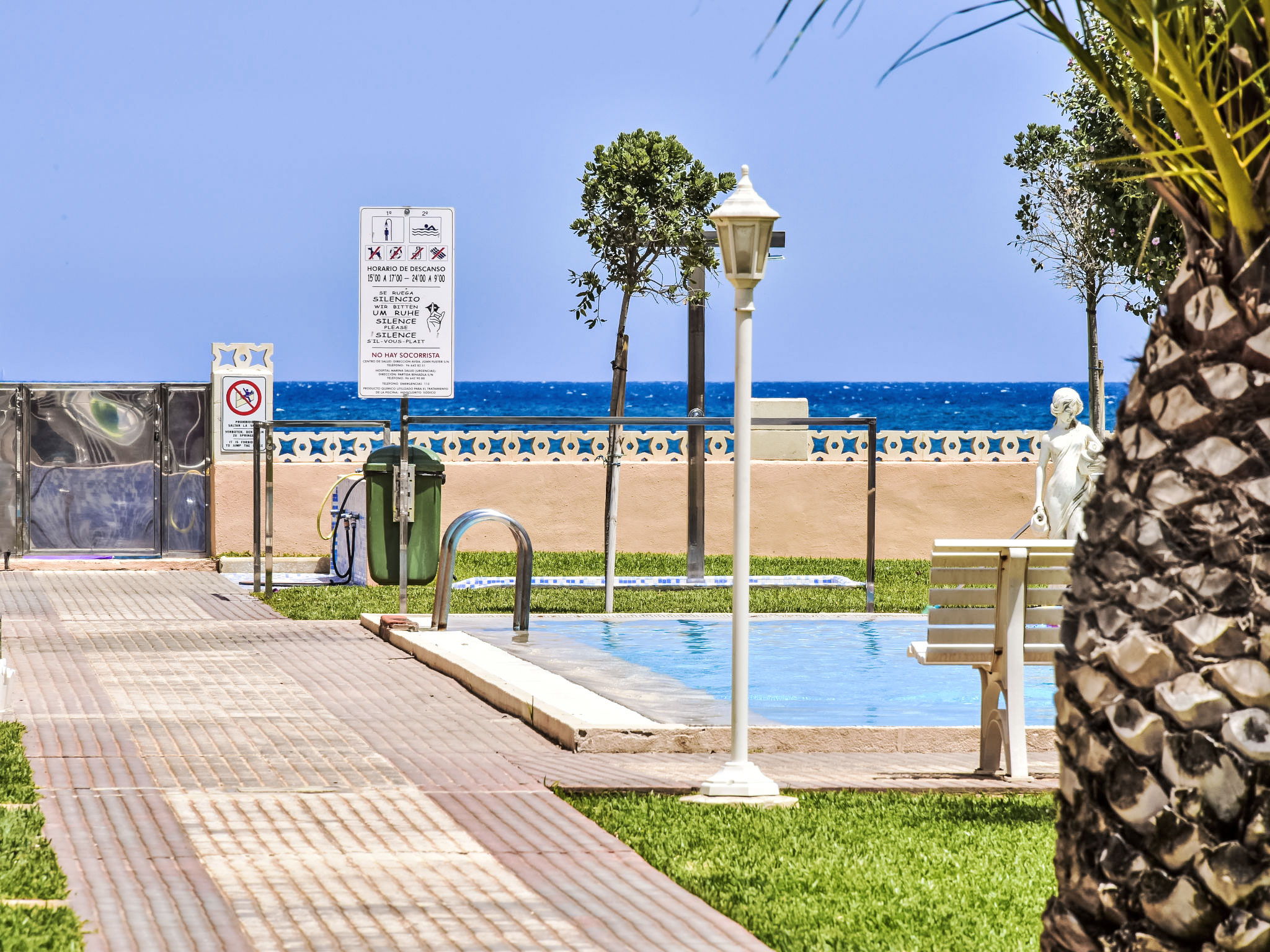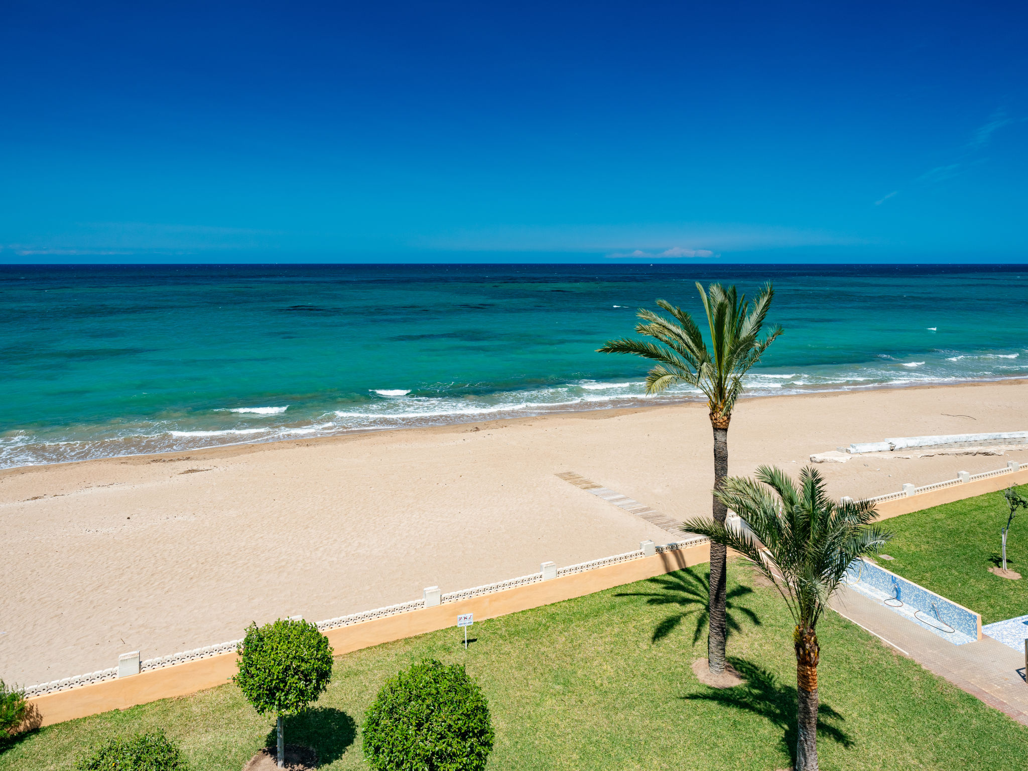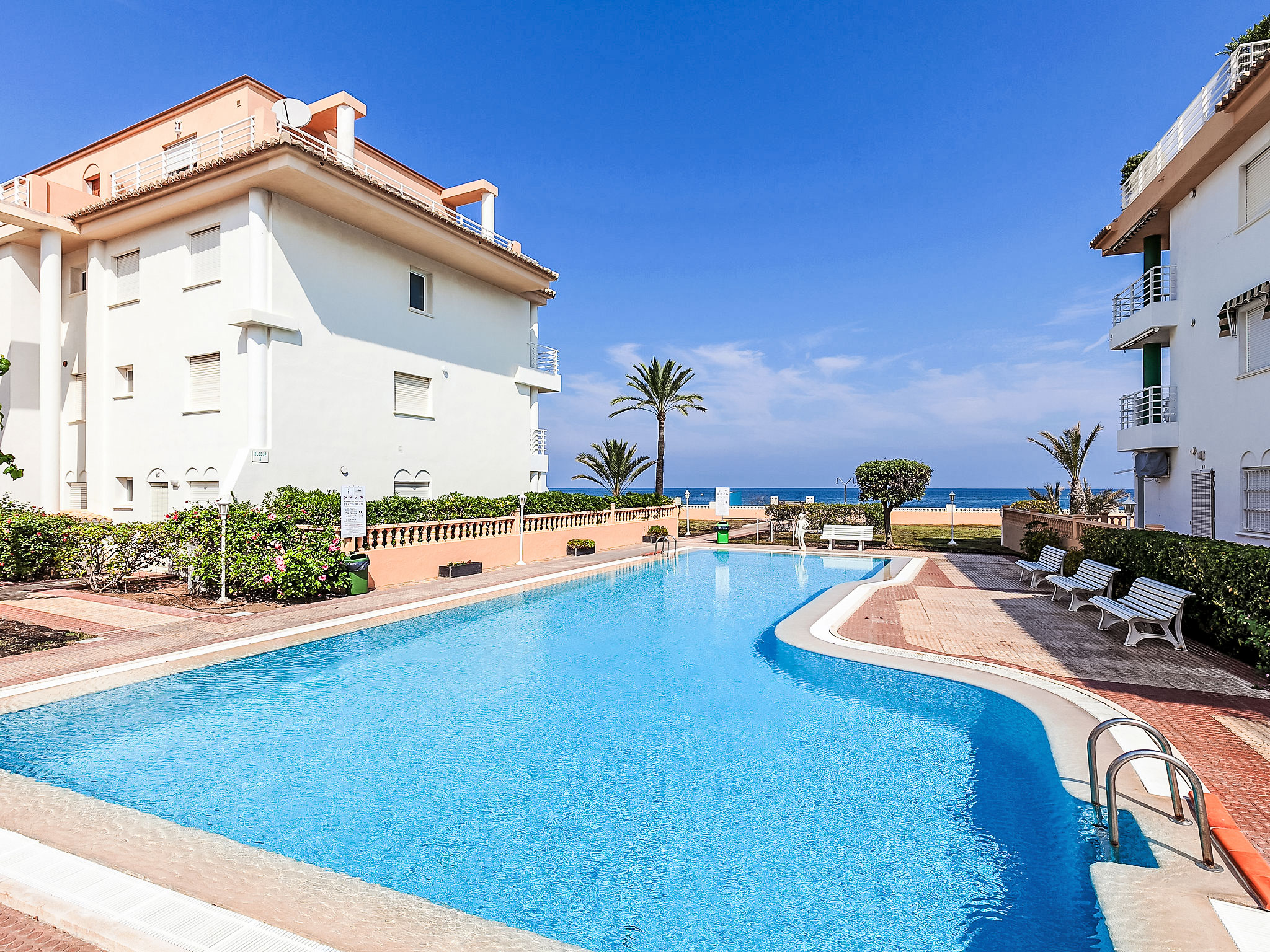 Les Marines 4 km von Dénia: Appartementhaus "Talima". Im Bezirk Les Marines, 50 m vom Meer, 15 m vom Strand, direkter Zugang zum Strand, in einer Sackgasse. Zur Mitbenutzung: Garten (eingezäunt) mit Rasen, Schwimmbad (16 x 8 m, 75 - 250 cm tief, saisonale Verfügbarkeit: 01.Jan.-31.Dez.). Aussendusche. Supermarkt 450 m, Restaurant 200 m, Bar, Café 450 m.