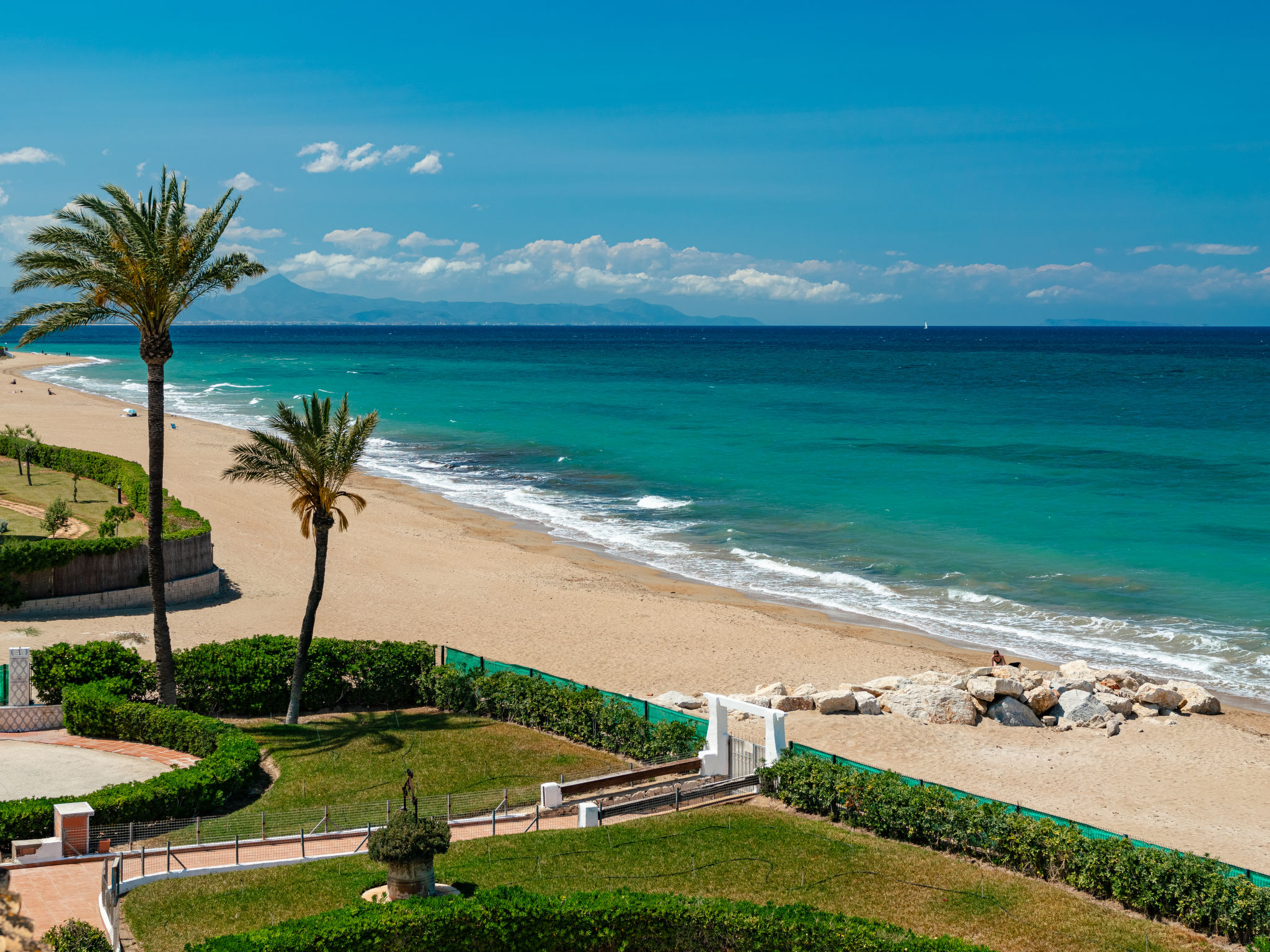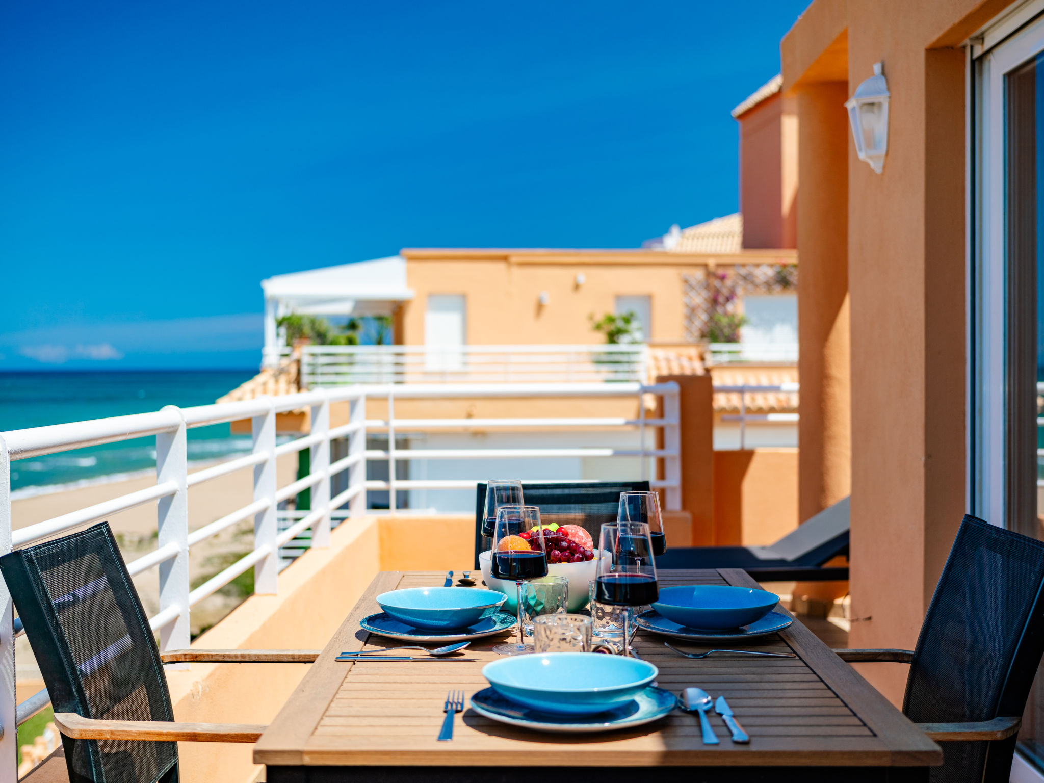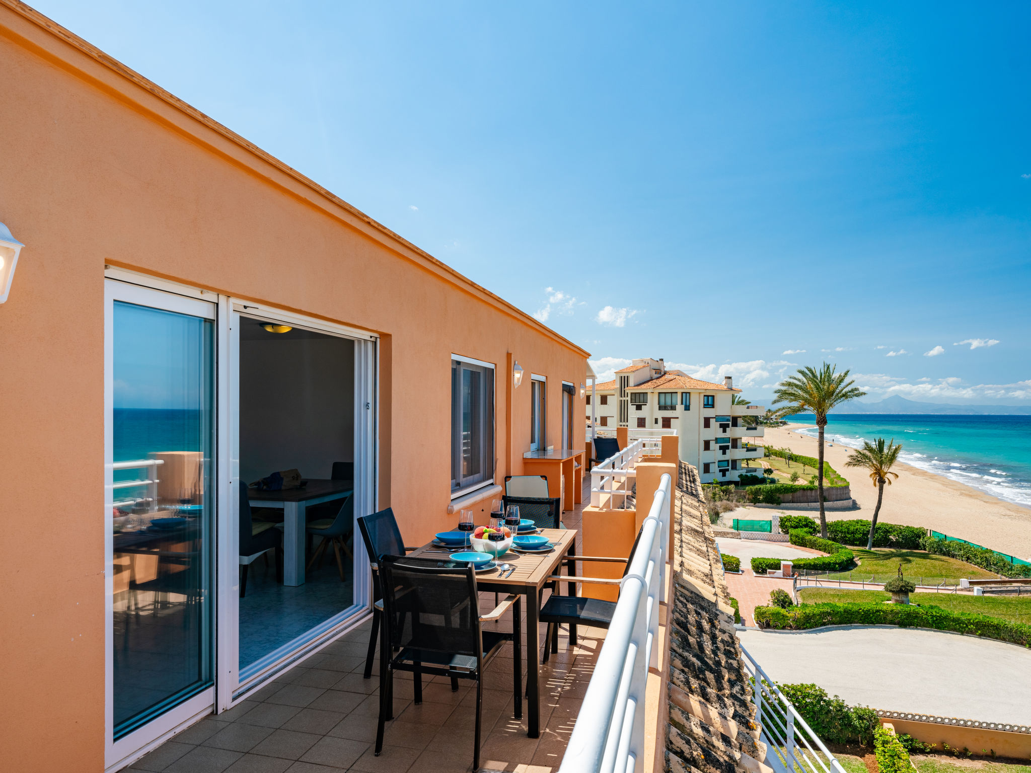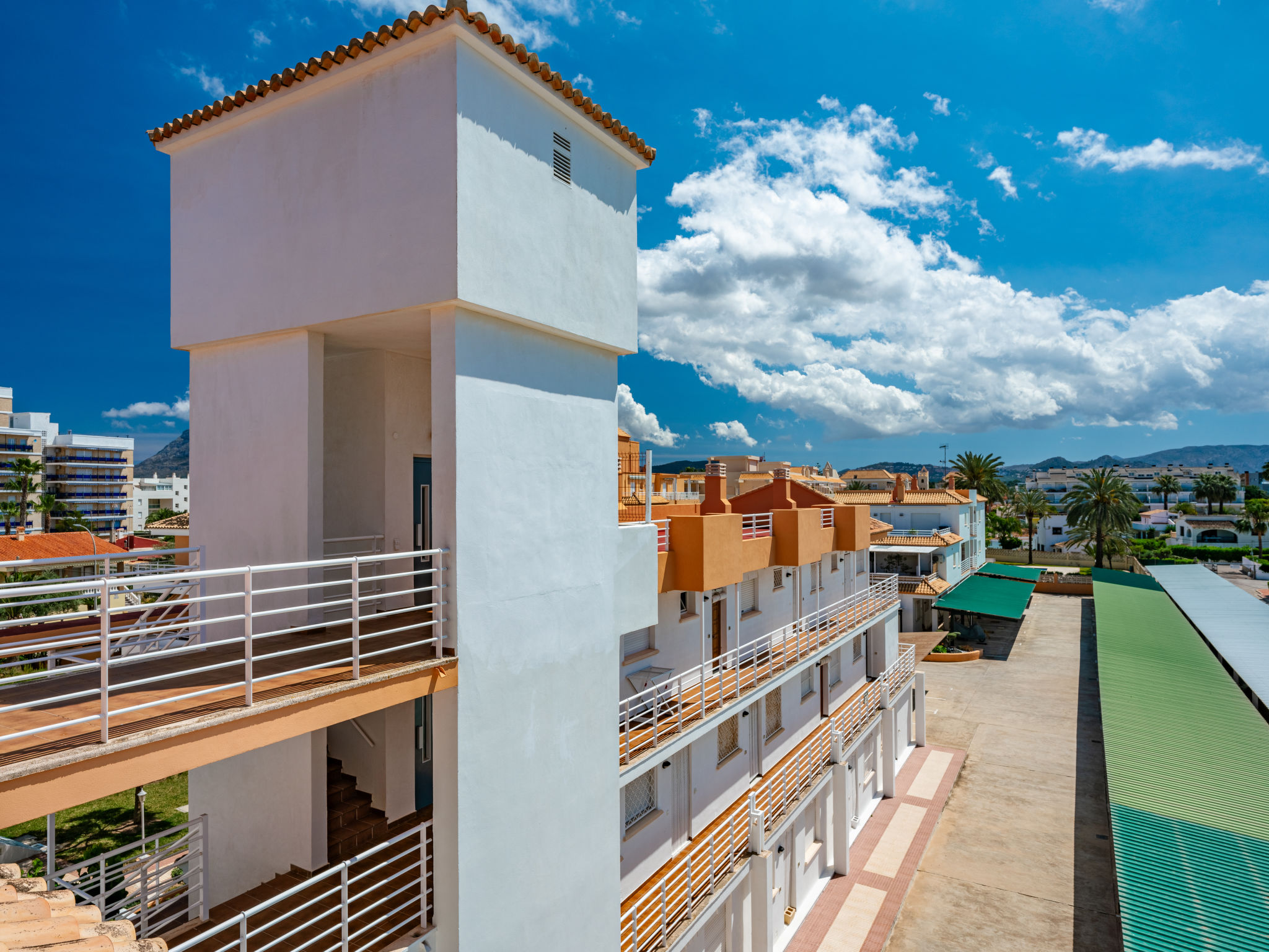 Les Marines 4 km von Dénia: Appartementhaus "Talima". Im Bezirk Les Marines, 50 m vom Meer, 15 m vom Strand, direkter Zugang zum Strand, in einer Sackgasse. Zur Mitbenutzung: Garten (eingezäunt) mit Rasen, Schwimmbad (16 x 8 m, 75 - 250 cm tief, saisonale Verfügbarkeit: 01.Jan.-31.Dez.). Aussendusche. Supermarkt 450 m, Restaurant 200 m, Bar, Café 450 m.