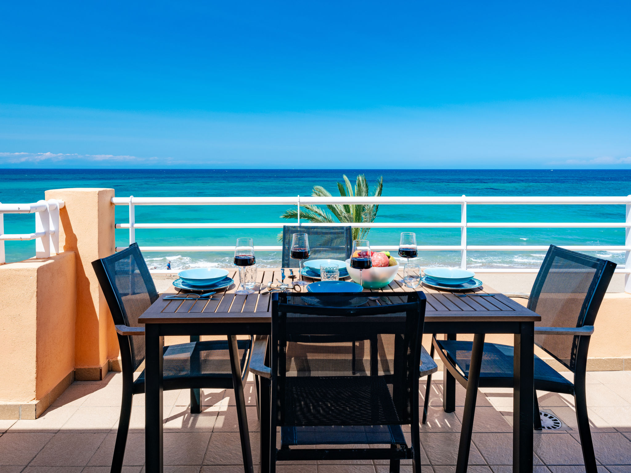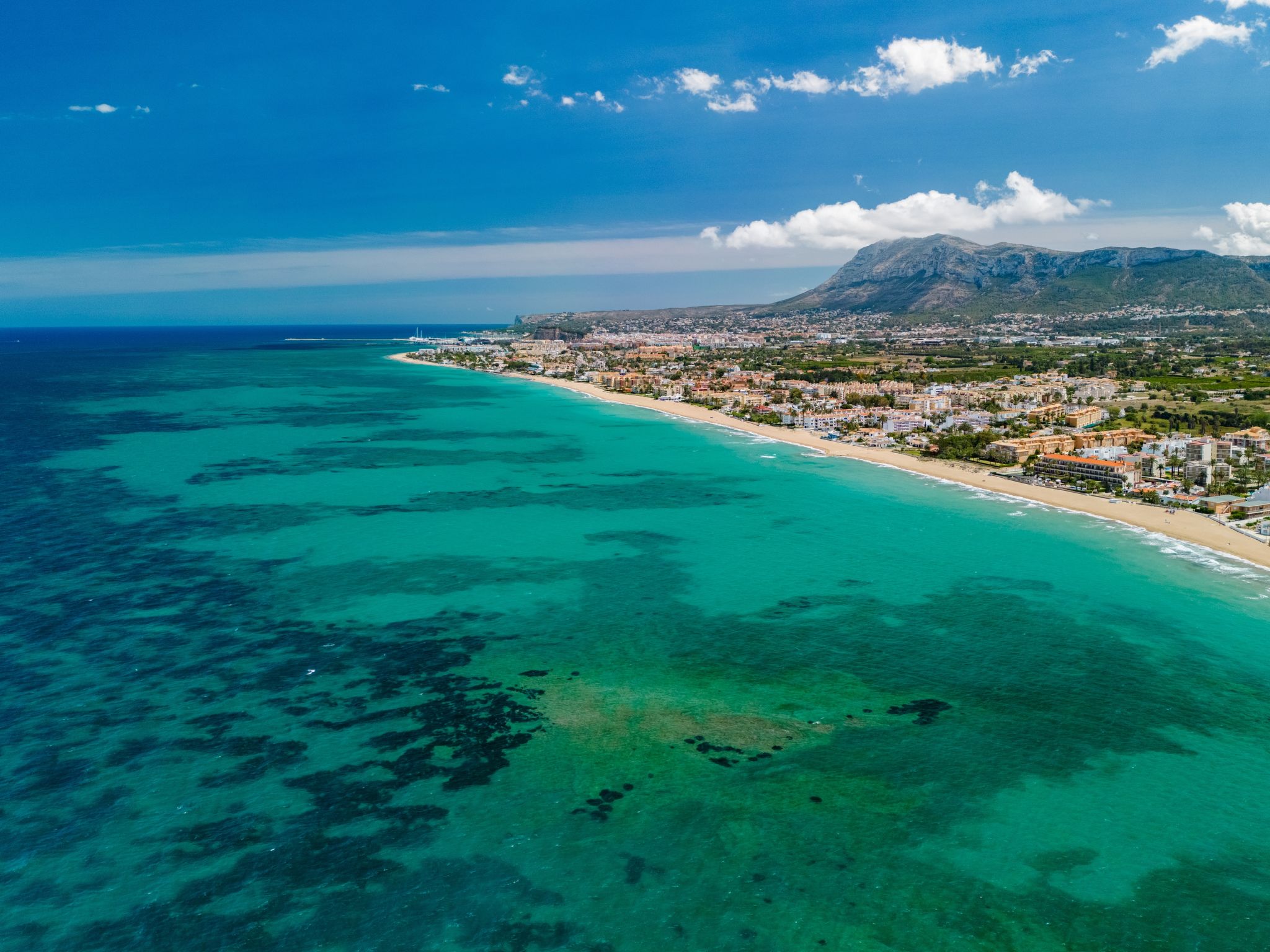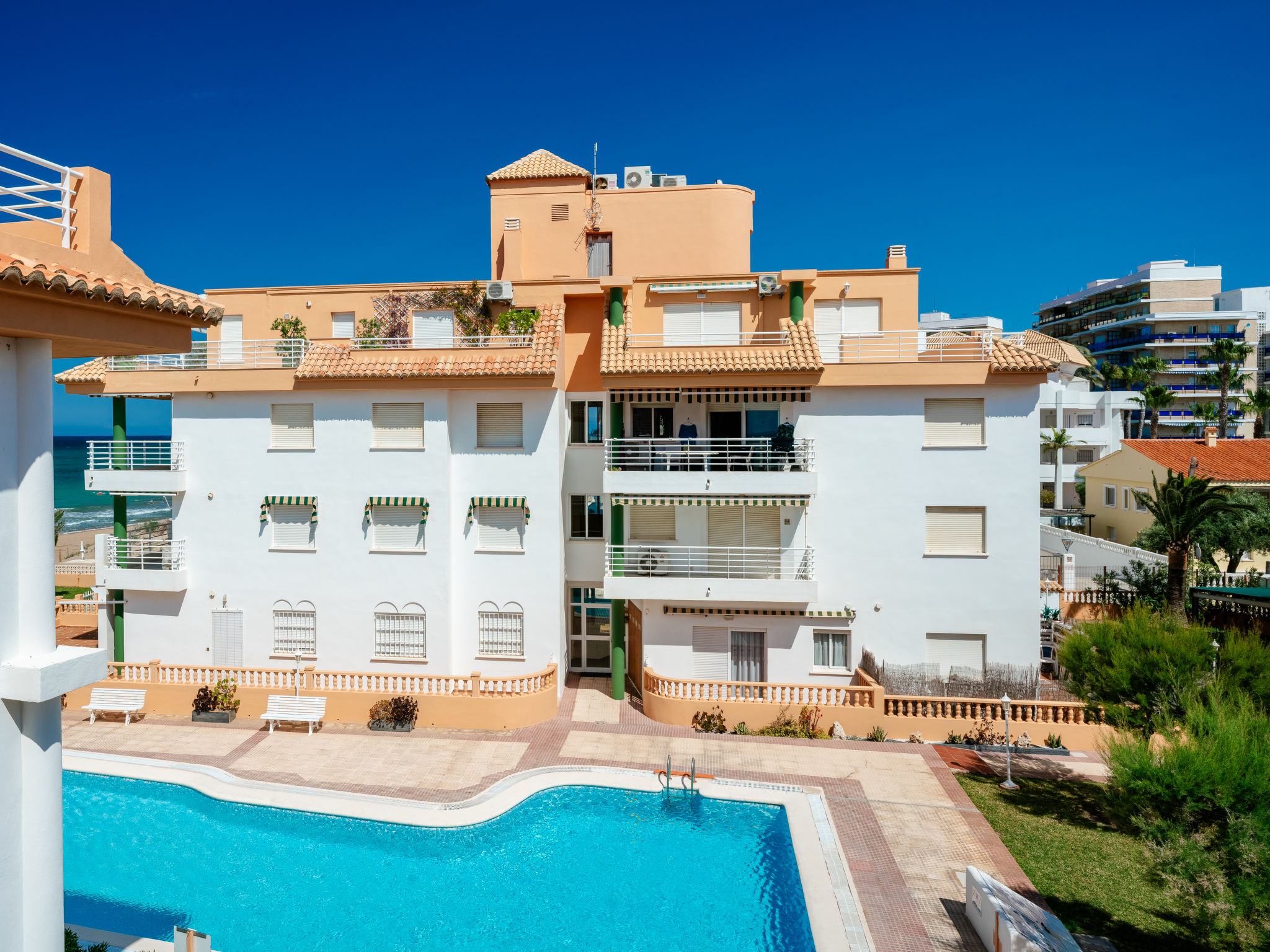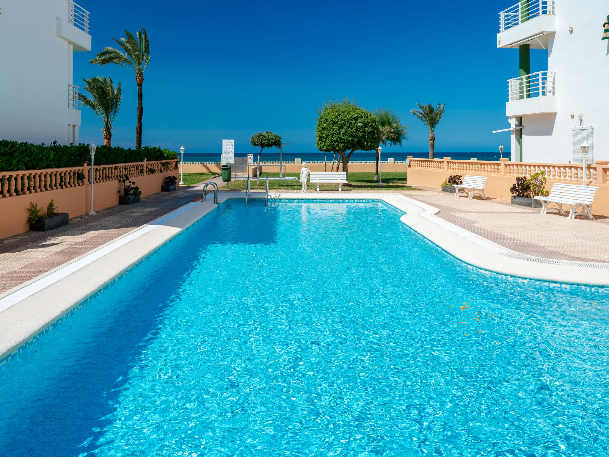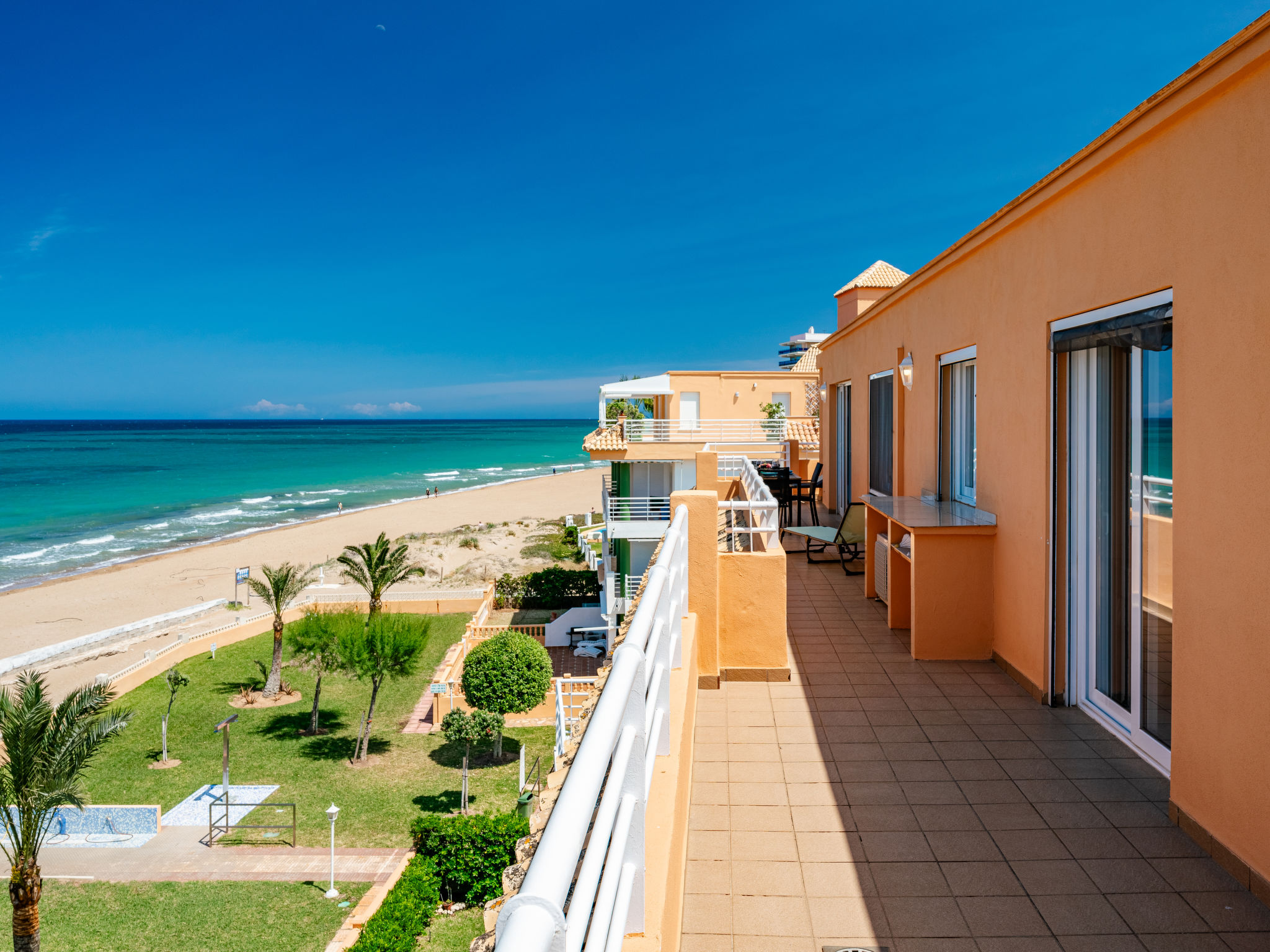 Les Marines 4 km von Dénia: Appartementhaus "Talima". Im Bezirk Les Marines, 50 m vom Meer, 15 m vom Strand, direkter Zugang zum Strand, in einer Sackgasse. Zur Mitbenutzung: Garten (eingezäunt) mit Rasen, Schwimmbad (16 x 8 m, 75 - 250 cm tief, saisonale Verfügbarkeit: 01.Jan.-31.Dez.). Aussendusche. Supermarkt 450 m, Restaurant 200 m, Bar, Café 450 m.