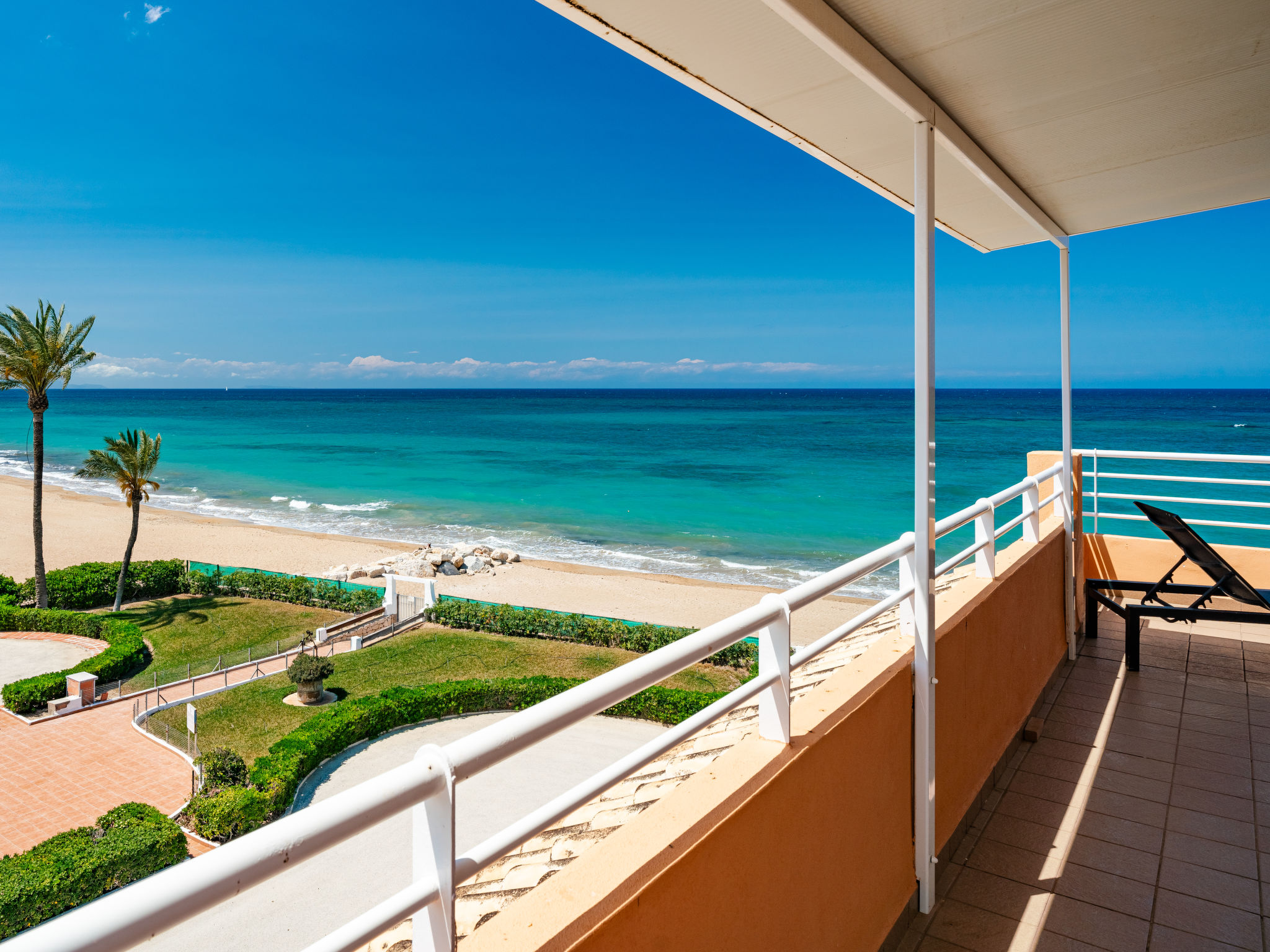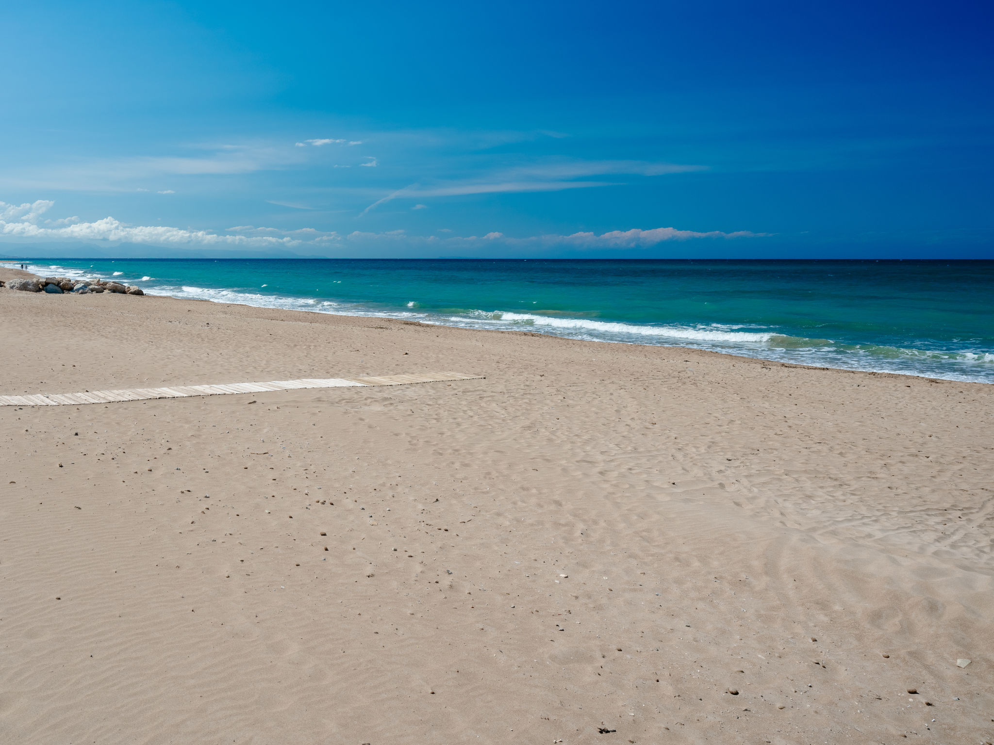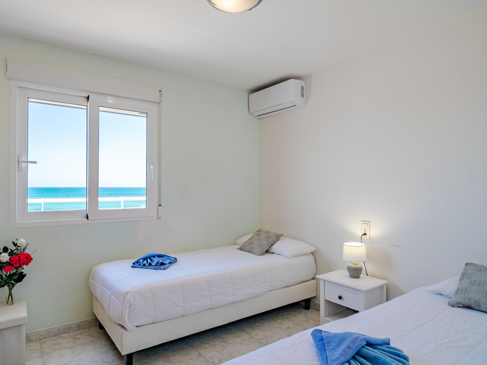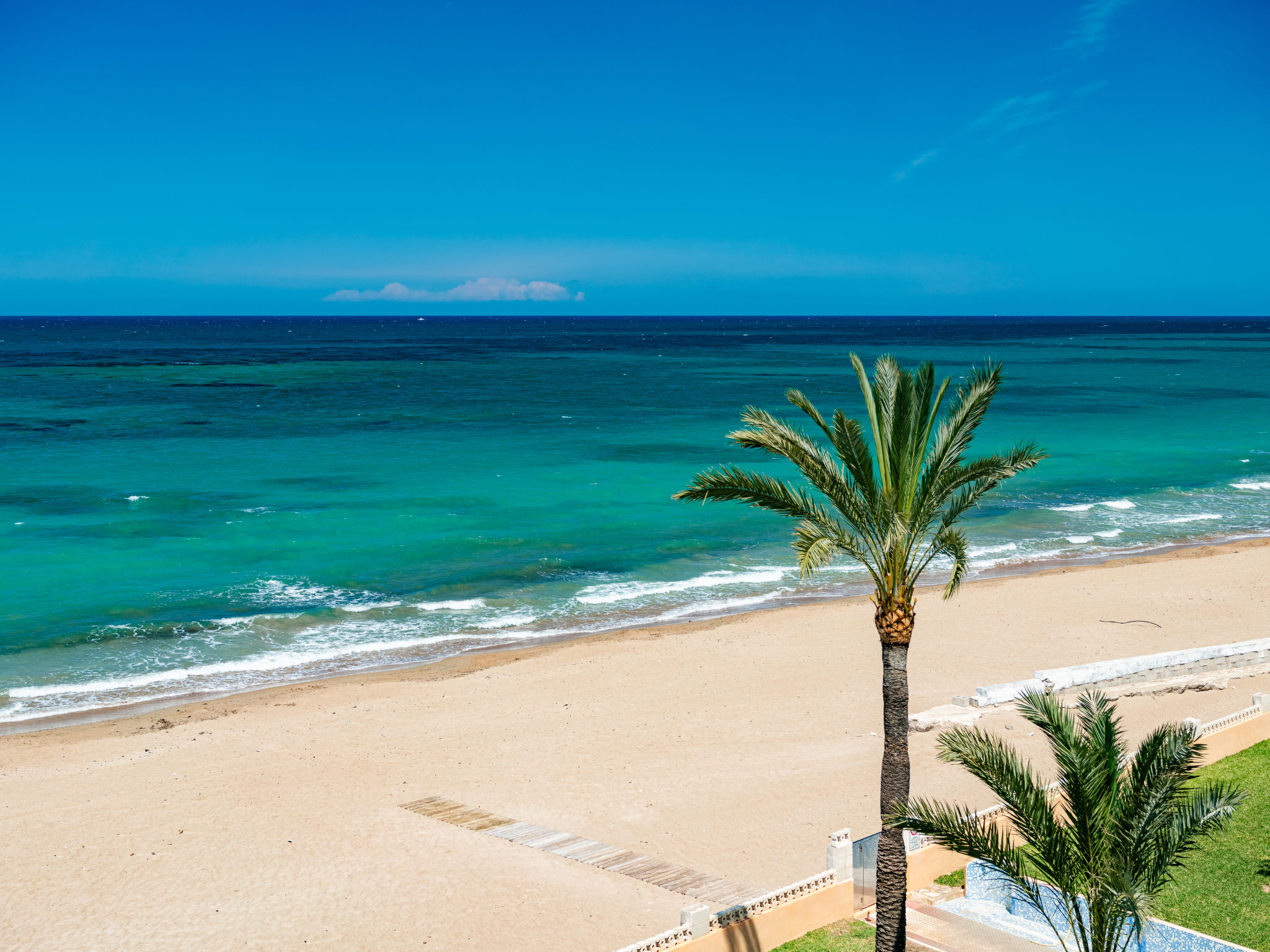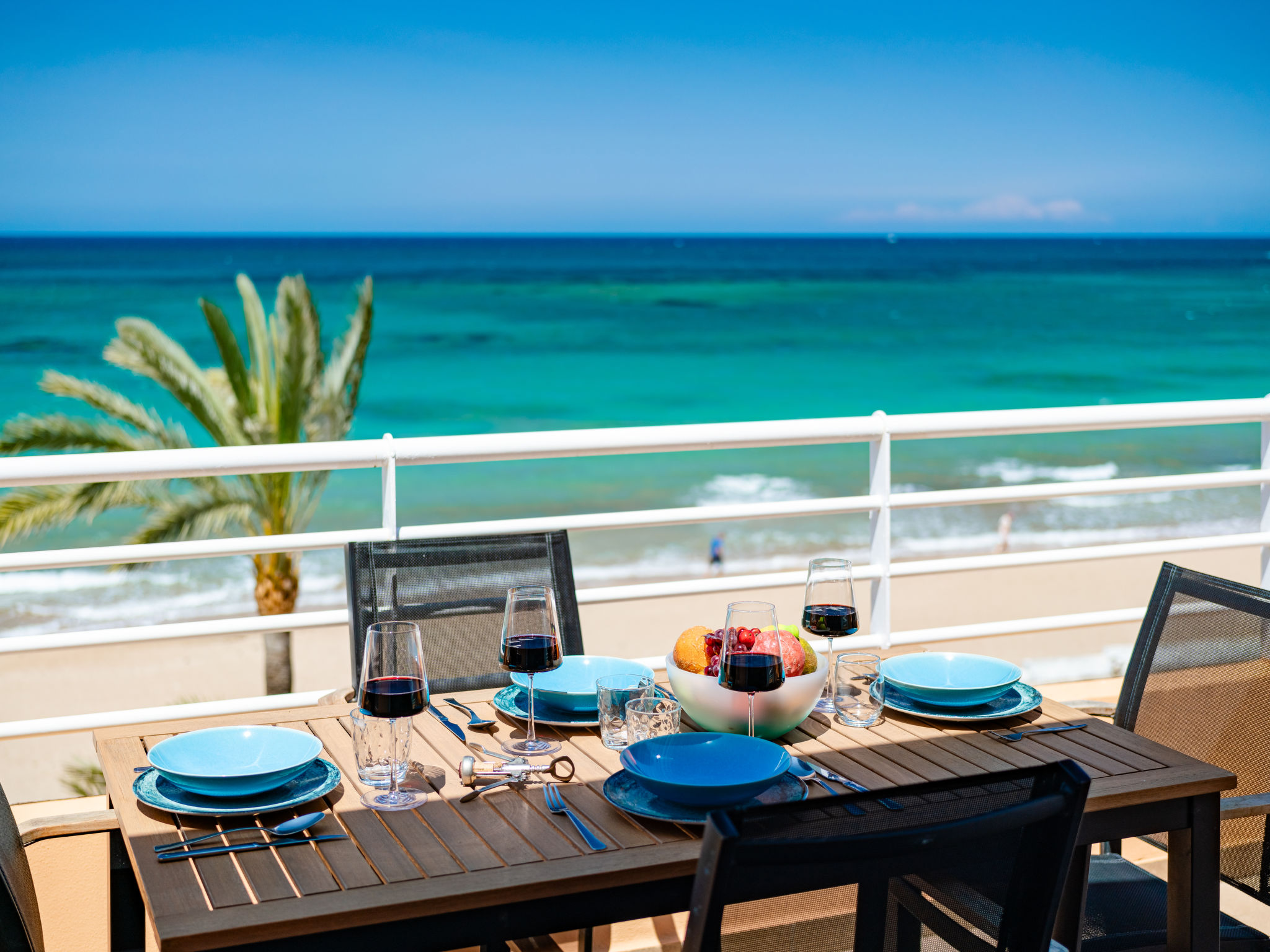 Les Marines 4 km von Dénia: Appartementhaus "Talima". Im Bezirk Les Marines, 50 m vom Meer, 15 m vom Strand, direkter Zugang zum Strand, in einer Sackgasse. Zur Mitbenutzung: Garten (eingezäunt) mit Rasen, Schwimmbad (16 x 8 m, 75 - 250 cm tief, saisonale Verfügbarkeit: 01.Jan.-31.Dez.). Aussendusche. Supermarkt 450 m, Restaurant 200 m, Bar, Café 450 m.