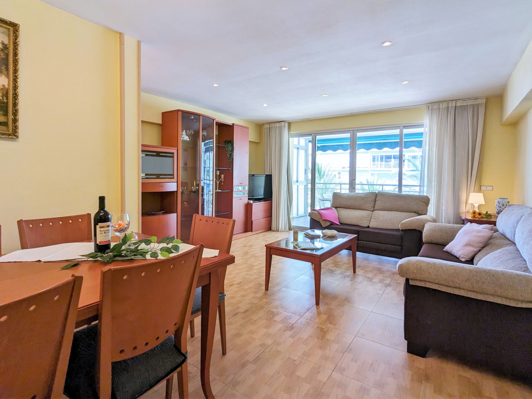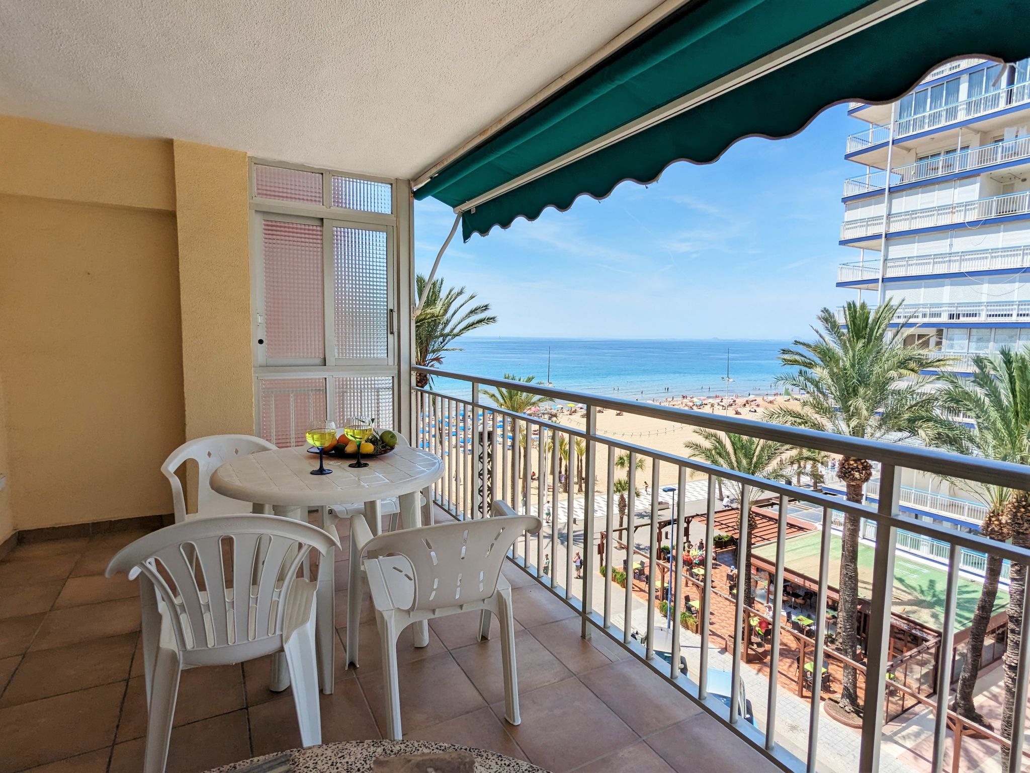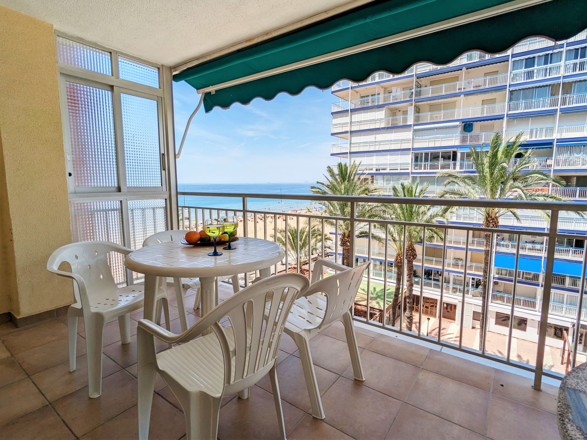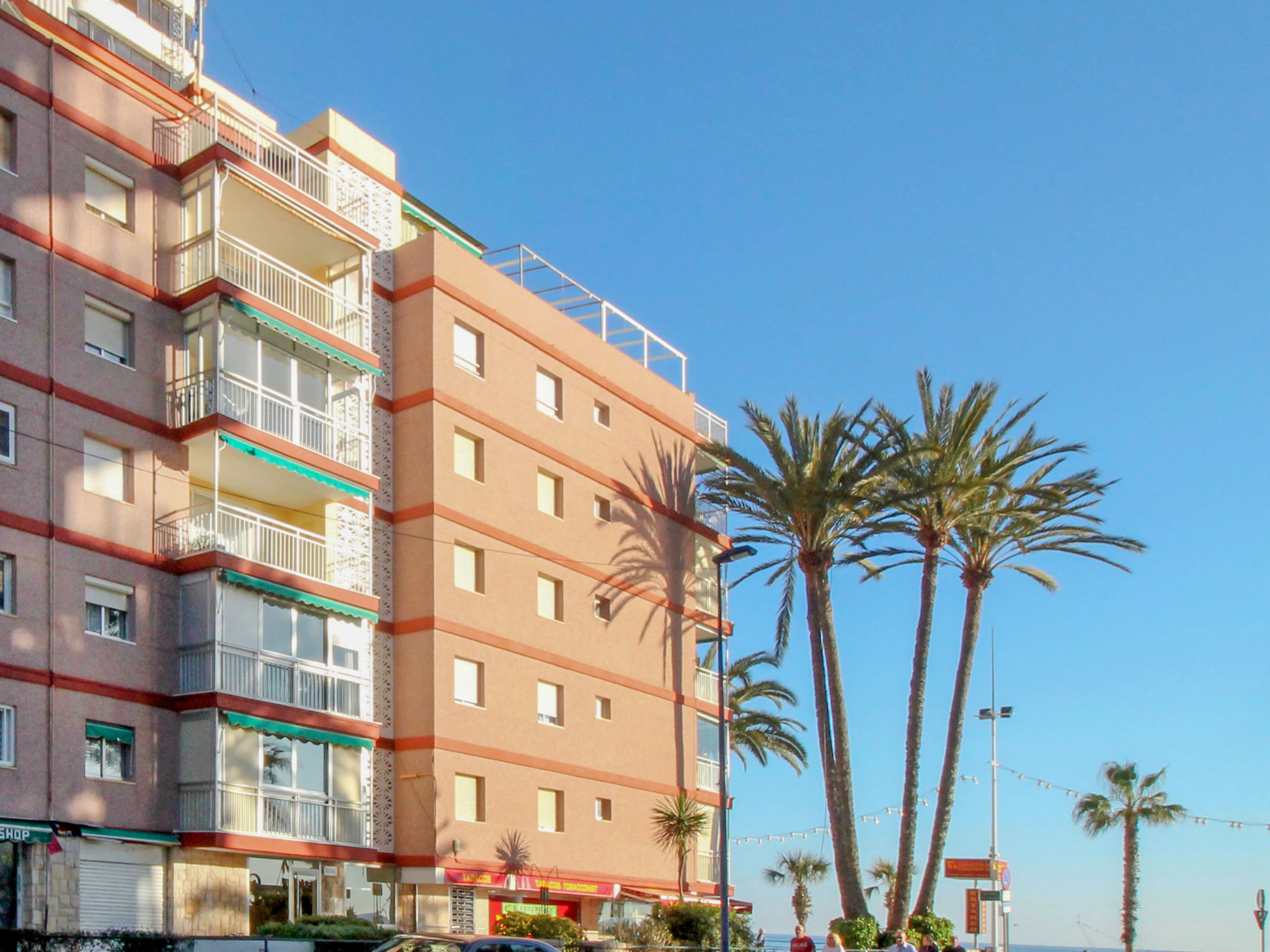 "La Goleta", 4-Zimmer-Wohnung 90 m2 im 5. Stock, Südlage. Objekt geeignet für 6 Erwachsene. Geräumig und hell, zweckmässig und komfortabel eingerichtet: Wohn-/Esszimmer 23 m2 mit Digital-TV und E-Heizung. Ausgang zur Terrasse. 1 Zimmer 21 m2 mit 1 franz. Bett (135 cm, Länge 190 cm), Dusche/WC, E-Heizofen und Ventilator. 1 Zimmer 15 m2 mit 2 Betten (90 cm, Länge 190 cm). 1 Zimmer 15 m2 mit 1 franz. Bett (135 cm, Länge 190 cm), E-Heizofen und Ventilator. Küche 6 m2 (Backofen, 4 Glaskeramikherd Platten, Toaster, Wasserkocher, Mikrowelle, Tiefkühler, elektrische Kaffeemaschine). Dusche/WC. Terrasse 11 m2, Terrasse 6 m2. Terrassenmöbel. Seitliche Sicht auf die Ortschaft und das Meer. Zur Verfügung: Waschmaschine, Bügeleisen, Haartrockner. Parkplatz. 1 kleines Haustier/Hund erlaubt. AT321570BM