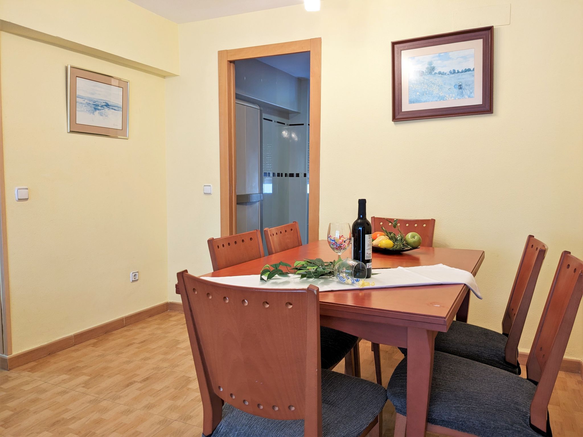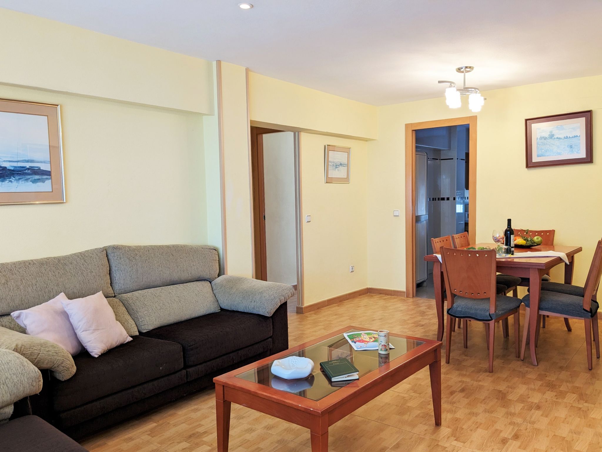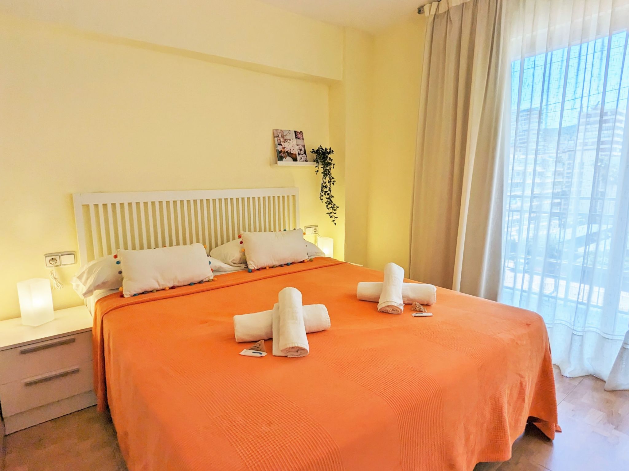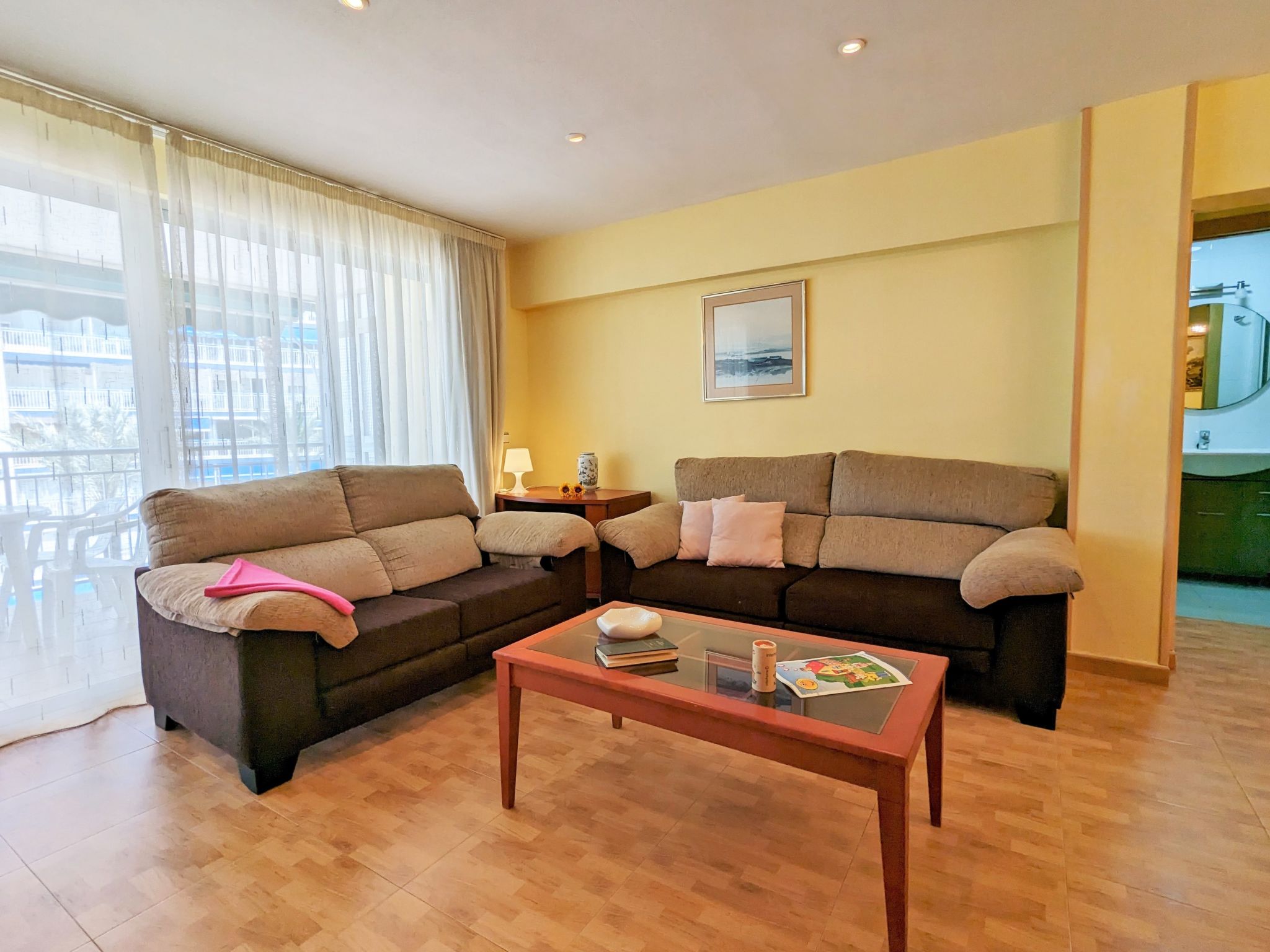 "La Goleta", 4-Zimmer-Wohnung 90 m2 im 5. Stock, Südlage. Objekt geeignet für 6 Erwachsene. Geräumig und hell, zweckmässig und komfortabel eingerichtet: Wohn-/Esszimmer 23 m2 mit Digital-TV und E-Heizung. Ausgang zur Terrasse. 1 Zimmer 21 m2 mit 1 franz. Bett (135 cm, Länge 190 cm), Dusche/WC, E-Heizofen und Ventilator. 1 Zimmer 15 m2 mit 2 Betten (90 cm, Länge 190 cm). 1 Zimmer 15 m2 mit 1 franz. Bett (135 cm, Länge 190 cm), E-Heizofen und Ventilator. Küche 6 m2 (Backofen, 4 Glaskeramikherd Platten, Toaster, Wasserkocher, Mikrowelle, Tiefkühler, elektrische Kaffeemaschine). Dusche/WC. Terrasse 11 m2, Terrasse 6 m2. Terrassenmöbel. Seitliche Sicht auf die Ortschaft und das Meer. Zur Verfügung: Waschmaschine, Bügeleisen, Haartrockner. Parkplatz. 1 kleines Haustier/Hund erlaubt. AT321570BM