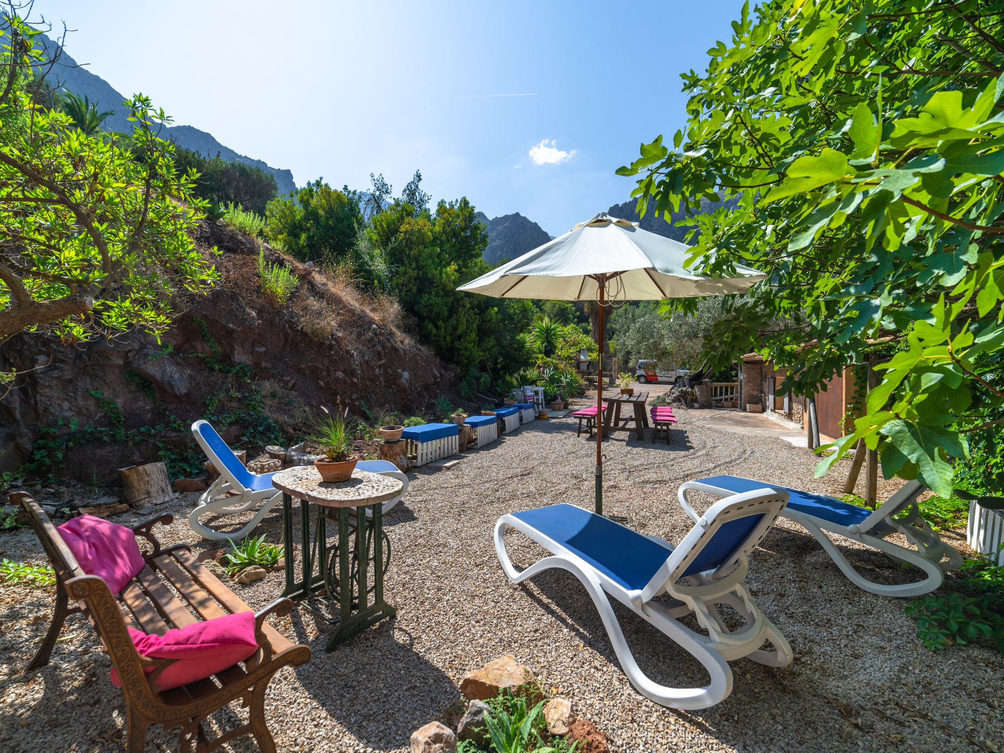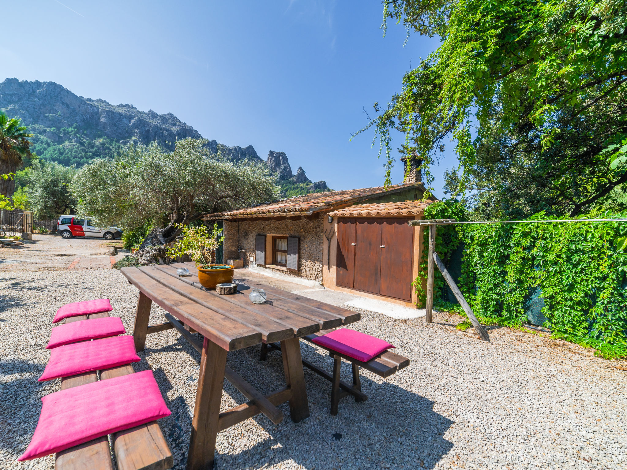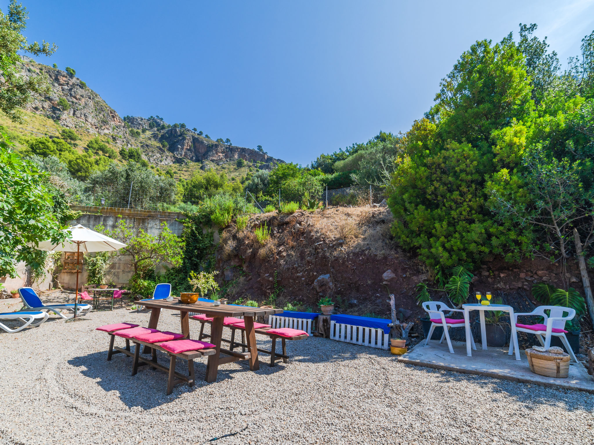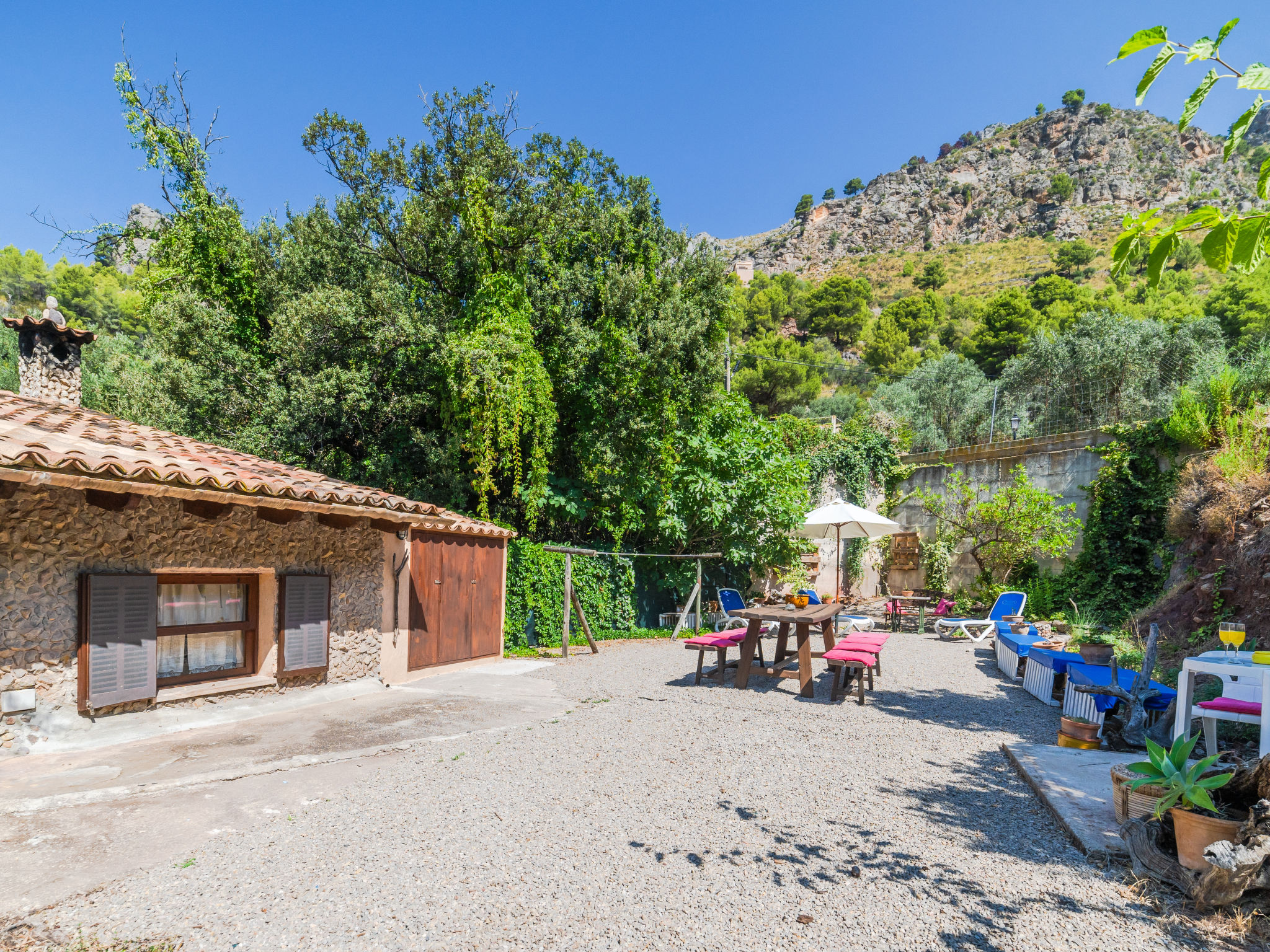 Cala Tuent 27 km von Lluc: Sehr gemütlicher, rustikaler, alleinstehender Finca "Cala Tuent", auf 2 Stockwerken, umgeben von Bäumen und Wiesen. Im Ortsteil Cala Tuent, alleinstehende, ruhige, sonnige Lage auf einem Hügel, 200 m vom Meer, 200 m vom Strand. Zur Alleinbenutzung: naturbelassenes Grundstück (eingezäunt), Naturgarten (eingezäunt). Sitzplatz, Pergola, Gartenmöbel, Grill. Im Hause: Internetzugang, Wireless LAN, Klimaanlage, Wäscherei, Waschmaschine, Wäschetrockner. Steile, schmale Zufahrt. Parkplatz (für 2 Autos) auf dem Grundstück. Einkaufsgeschäft 26.9 km, Lebensmittelgeschäft 26.9 km, Supermarkt 26.9 km, Restaurant, Bar 300 m, Bäckerei 26.9 km, Café, Biergarten 300 m, Steinstrand "Cala Tuent" 200 m. Wanderwege ab Haus, Radweg 100 m. Nahe gelegene Sehenswürdigkeiten: Sa Calobra 6.4 km, Torrent de Pareis 7.6 km, Santuario de Lluc 26.1 km. Bitte beachten: Fahrzeug empfohlen. Geeignet für Familien. Objekt geeignet für 6 Erwachsene Jugendgruppen nur auf Anfrage. Be- und Entladen am Ferienhaus möglich. Tiere in der Umgebung. Hauptstrasse in der Nähe. Flugplatz 75 km vom Haus.