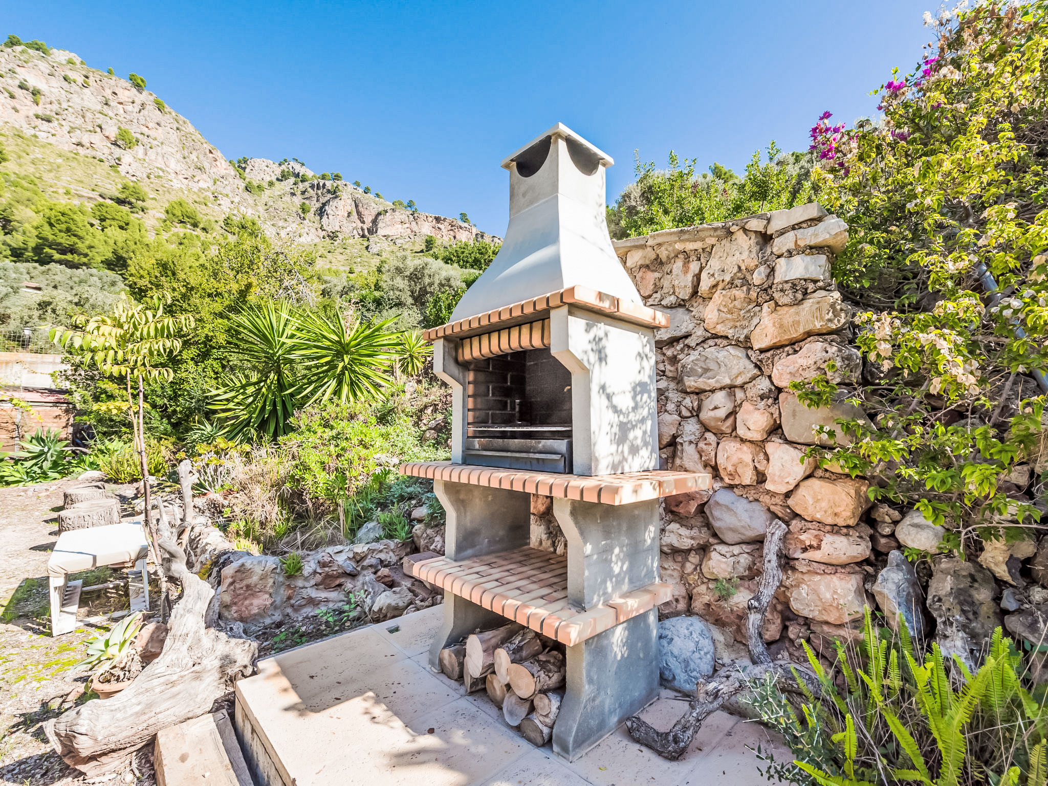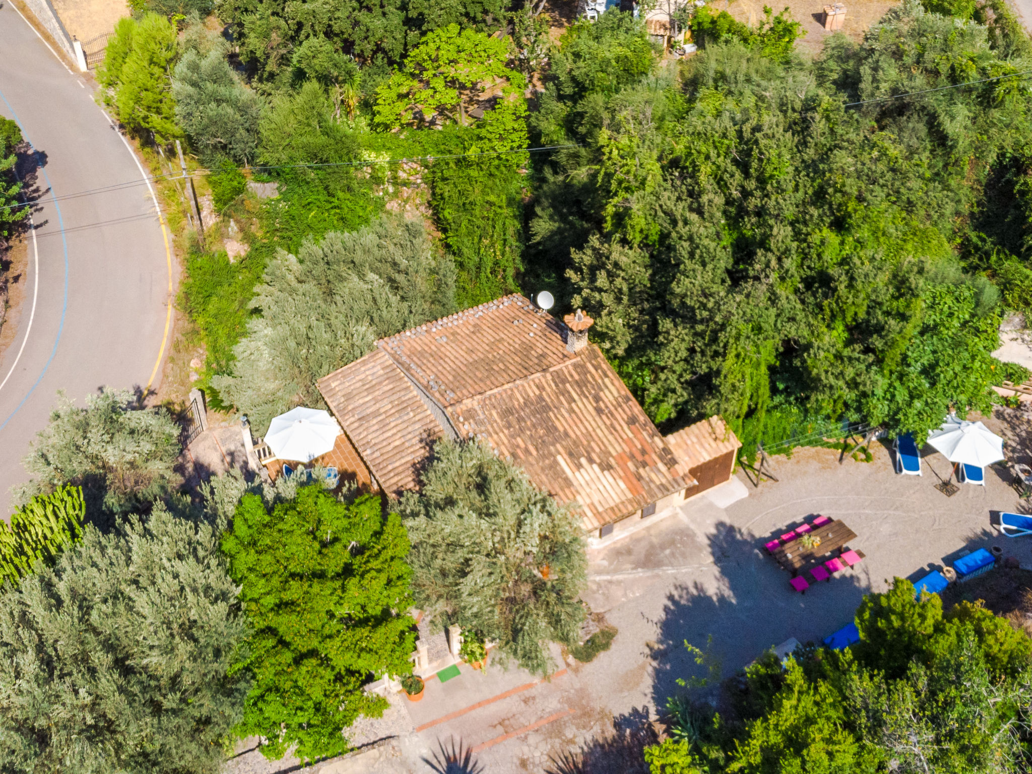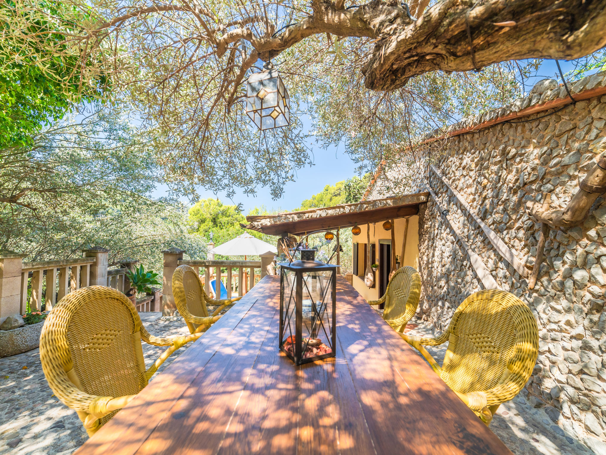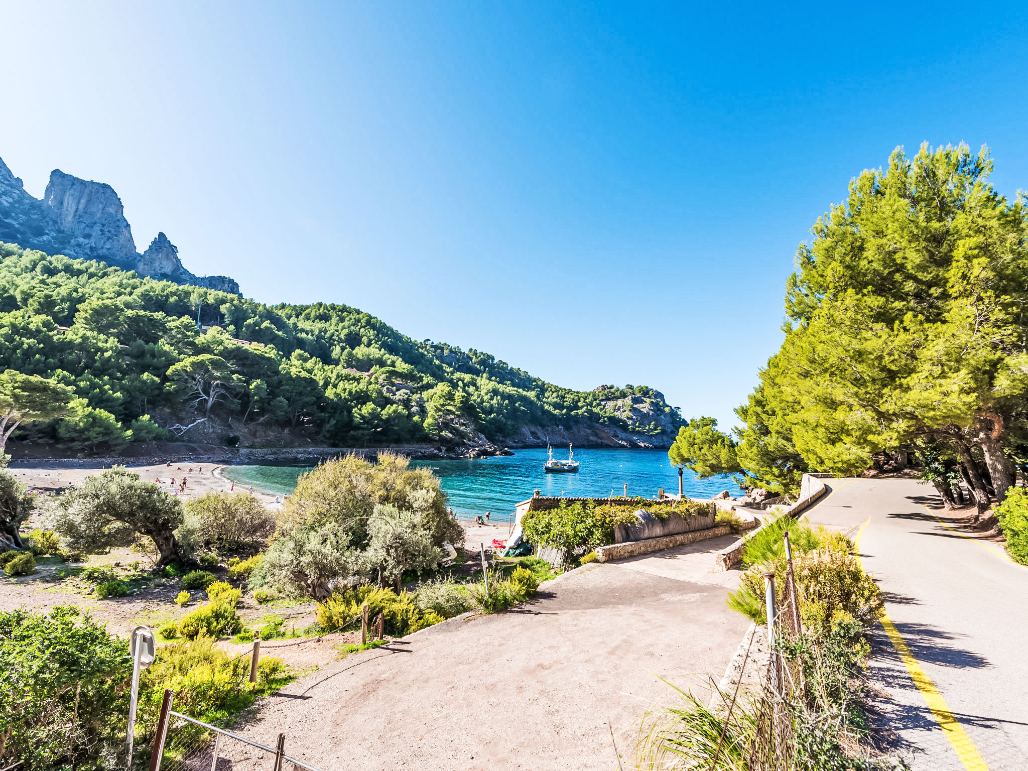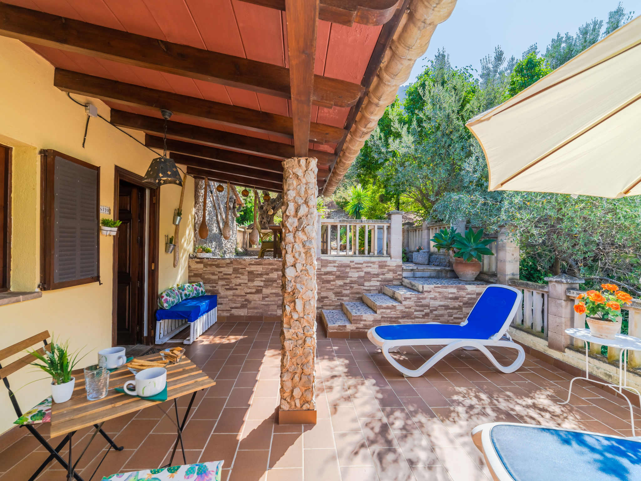 Cala Tuent 27 km von Lluc: Sehr gemütlicher, rustikaler, alleinstehender Finca "Cala Tuent", auf 2 Stockwerken, umgeben von Bäumen und Wiesen. Im Ortsteil Cala Tuent, alleinstehende, ruhige, sonnige Lage auf einem Hügel, 200 m vom Meer, 200 m vom Strand. Zur Alleinbenutzung: naturbelassenes Grundstück (eingezäunt), Naturgarten (eingezäunt). Sitzplatz, Pergola, Gartenmöbel, Grill. Im Hause: Internetzugang, Wireless LAN, Klimaanlage, Wäscherei, Waschmaschine, Wäschetrockner. Steile, schmale Zufahrt. Parkplatz (für 2 Autos) auf dem Grundstück. Einkaufsgeschäft 26.9 km, Lebensmittelgeschäft 26.9 km, Supermarkt 26.9 km, Restaurant, Bar 300 m, Bäckerei 26.9 km, Café, Biergarten 300 m, Steinstrand "Cala Tuent" 200 m. Wanderwege ab Haus, Radweg 100 m. Nahe gelegene Sehenswürdigkeiten: Sa Calobra 6.4 km, Torrent de Pareis 7.6 km, Santuario de Lluc 26.1 km. Bitte beachten: Fahrzeug empfohlen. Geeignet für Familien. Objekt geeignet für 6 Erwachsene Jugendgruppen nur auf Anfrage. Be- und Entladen am Ferienhaus möglich. Tiere in der Umgebung. Hauptstrasse in der Nähe. Flugplatz 75 km vom Haus.