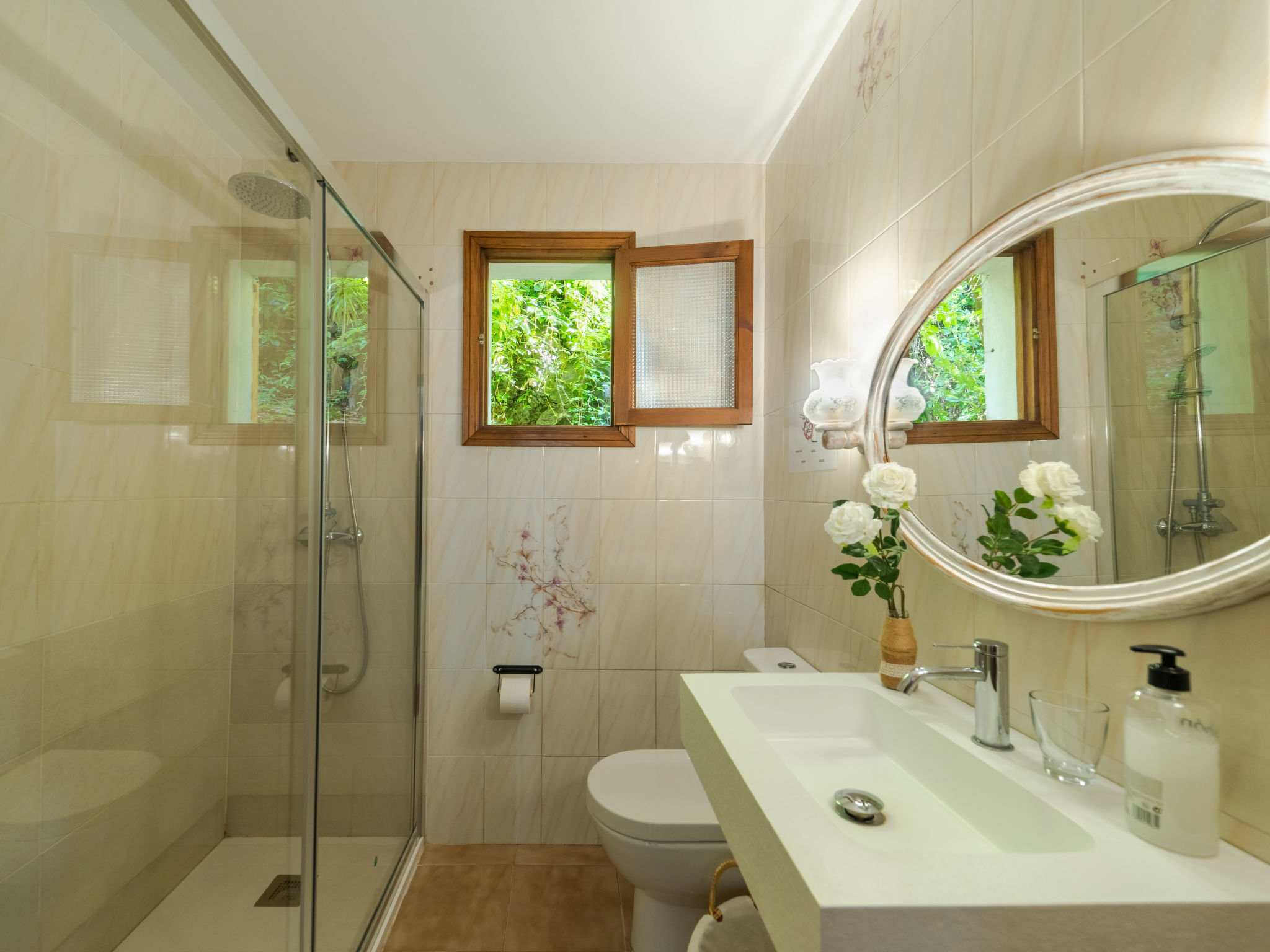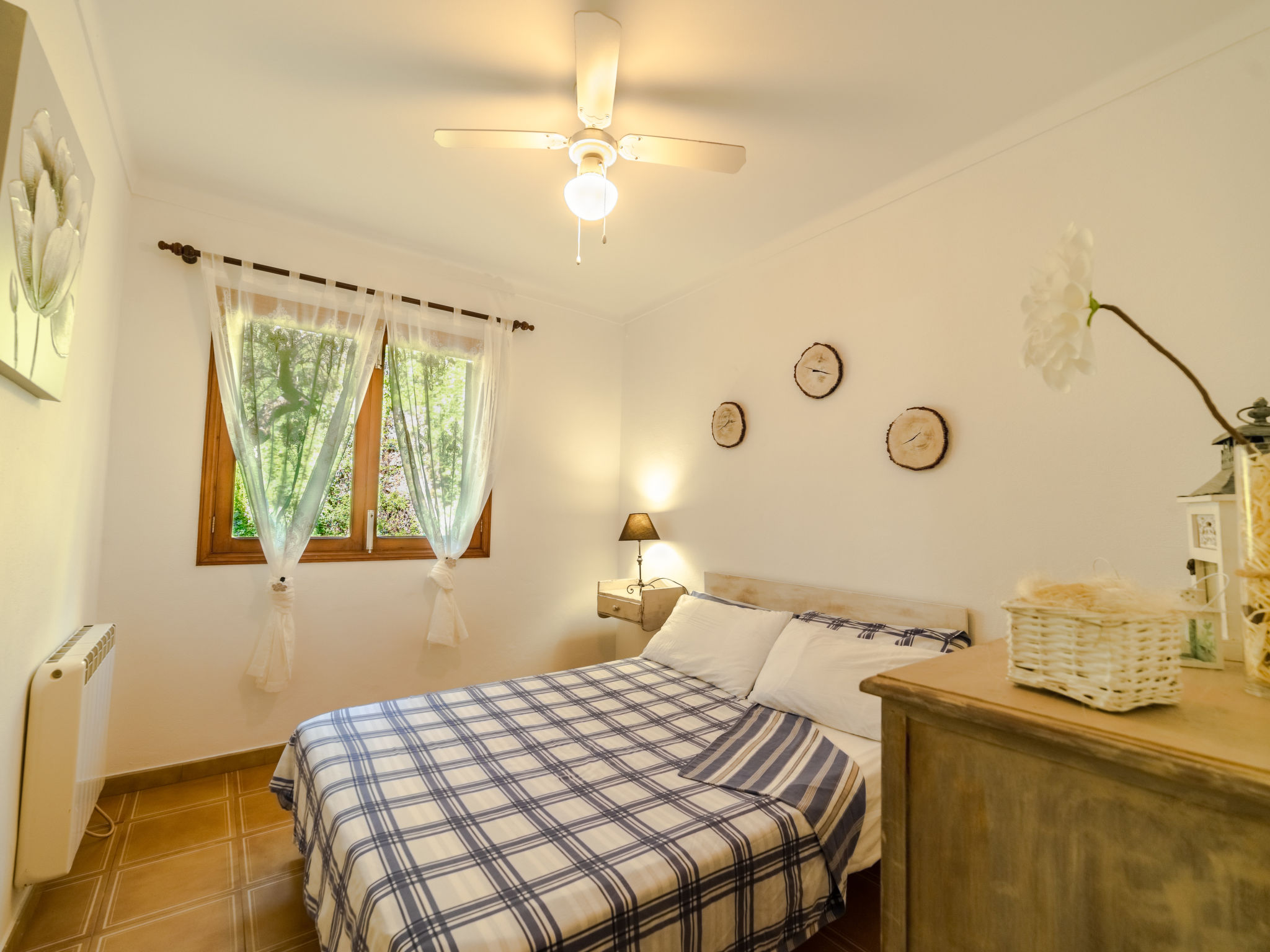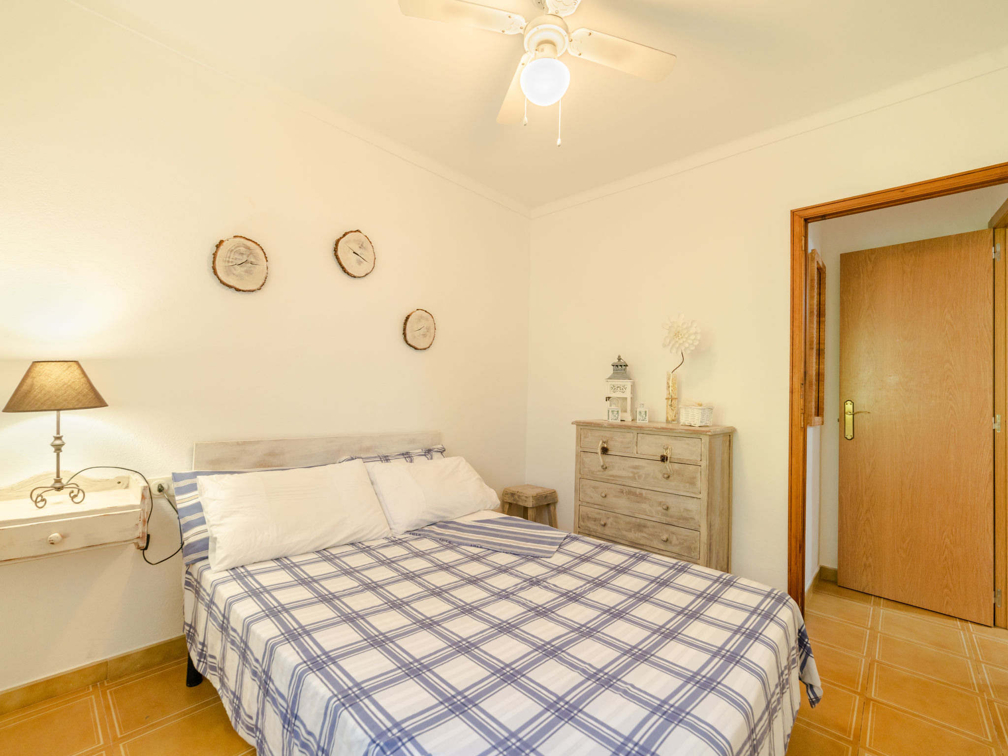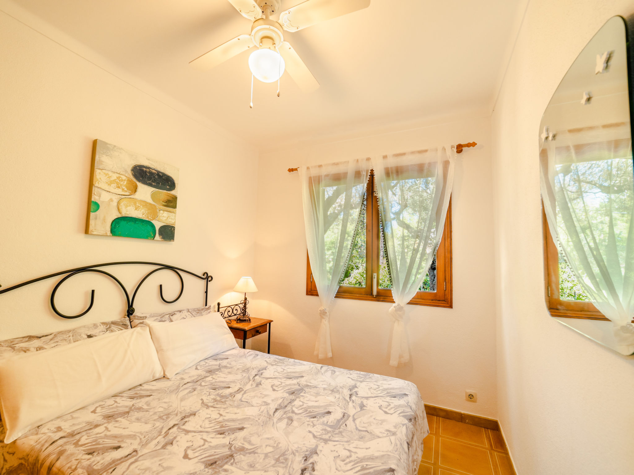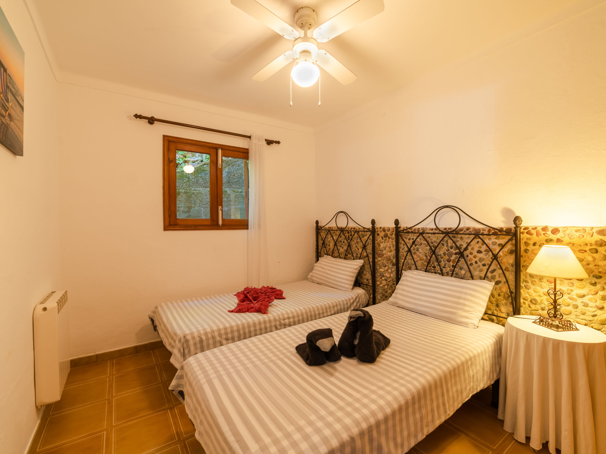 "Cala Tuent", 4-Zimmer-Haus 130 m2. Sehr rustikal und gemütlich eingerichtet: offenes grosses Wohn-/Esszimmer mit Panoramafenster mit offenem Kamin, Esstisch, Kabel-TV, Digital-TV, Flachbildschirm, Klimaanlage und Warmluftheizung. Ausgang zum Gartensitzplatz. Offene Küche (4 Kochplatten, Backofen, Geschirrspüler, Toaster, Wasserkocher, Mikrowelle, Tiefkühler, elektrische Kaffeemaschine) mit Bar. Ausgang zum Gartensitzplatz. Unteres Geschoss: 1 Doppelzimmer mit Panoramafenster mit 2 Betten (90 cm), Ventilator. 1 Doppelzimmer mit Panoramafenster mit 1 franz. Bett (135 cm), Ventilator. 1 Doppelzimmer mit Panoramafenster mit 2 Betten (90 cm), Ventilator. Bad/Dusche/WC. Komfortable Einrichtung im Landhausstil. 1 Haustier/Hund erlaubt. ETV11203