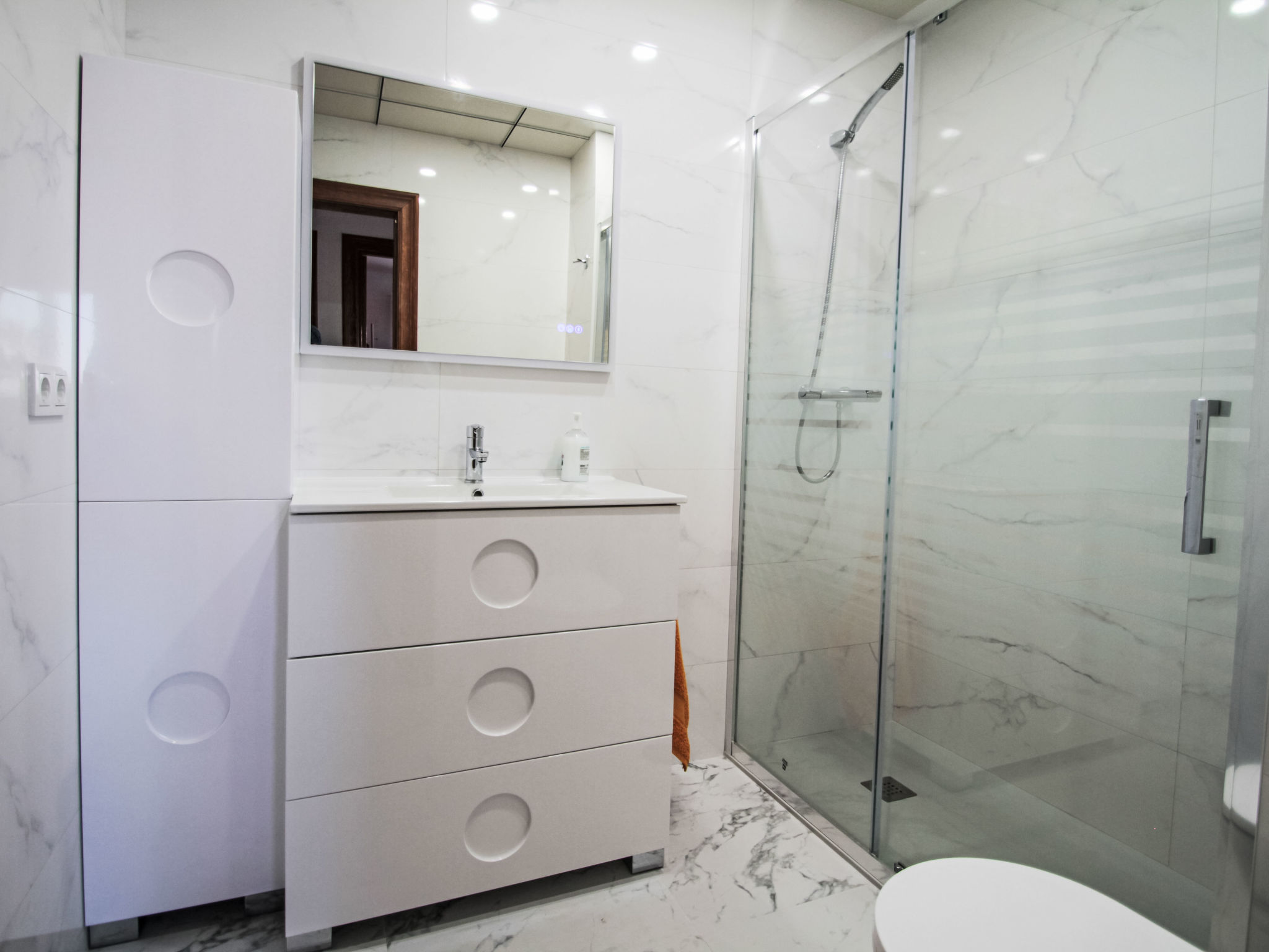 3-Zimmer-Wohnung 67 m2. Hell, komfortabel eingerichtet: Wohn-/Esszimmer mit Esstisch, Internationale TV-Sender, Flachbildschirm, Radio, Stereoanlage, Klimaanlage und Warmluftheizung. Ausgang zur Terrasse. 1 Zimmer mit 1 franz. Bett (150 cm, Länge 190 cm), E-Heizung und Ventilator. 1 Zimmer mit 2 Betten (90 cm, Länge 190 cm), Ventilator. Küche (Backofen, Geschirrspüler, 4 Glaskeramikherd Platten, Toaster, Mikrowelle, Tiefkühler, elektrische Kaffeemaschine). Dusche/Bidet/WC. E-Heizung. Terrasse. Terrassenmöbel. Sehr schöne Sicht auf das Meer. Zur Verfügung: Waschmaschine, Wäschetrockner, Bügeleisen, Haartrockner. Internet (Wireless LAN, gratis). Parkplatz. Bitte beachten: geeignet für Familien. Nichtraucher-Unterkunft. Eigener Eingang, Rauchmelder. R000000001