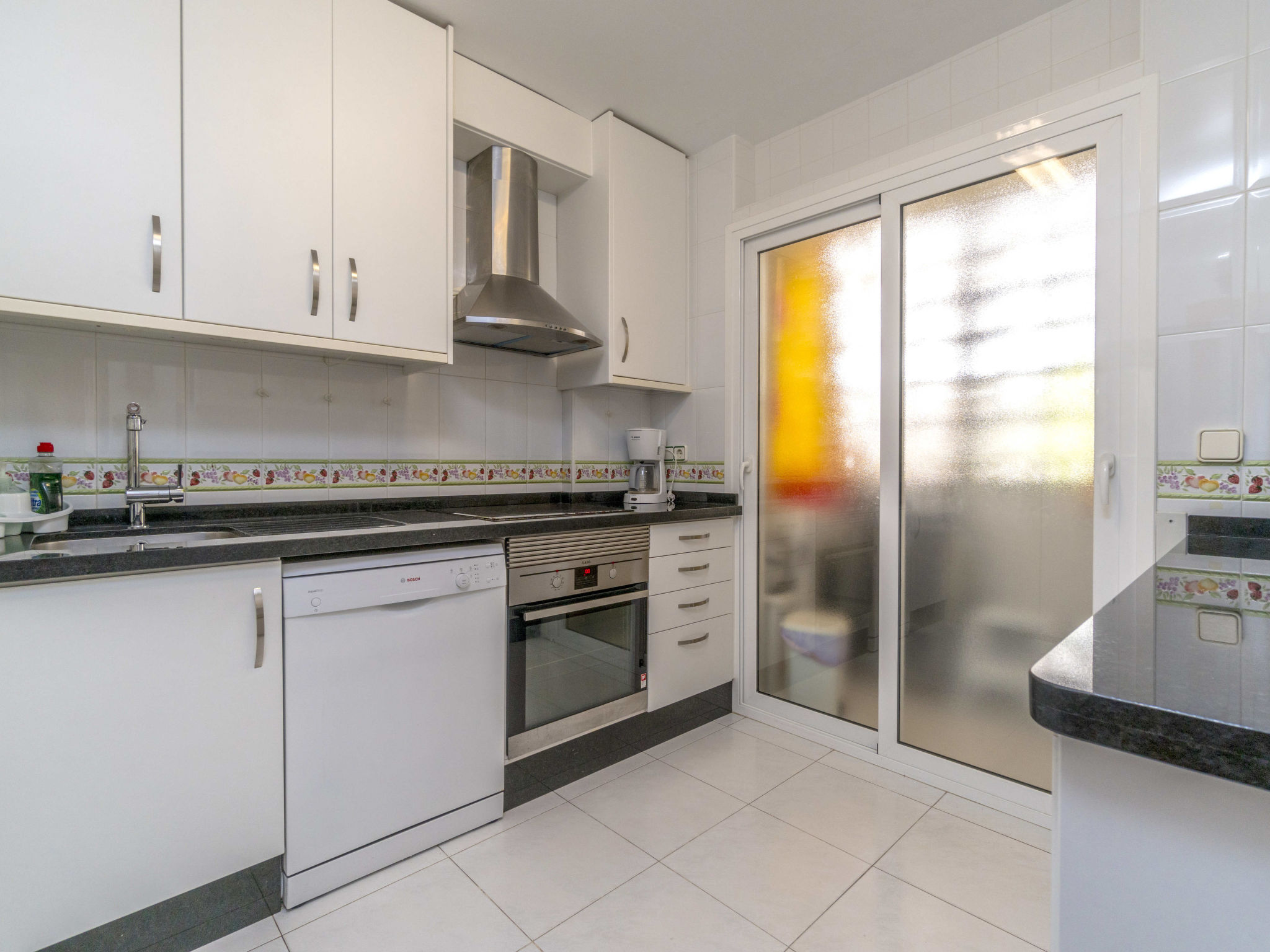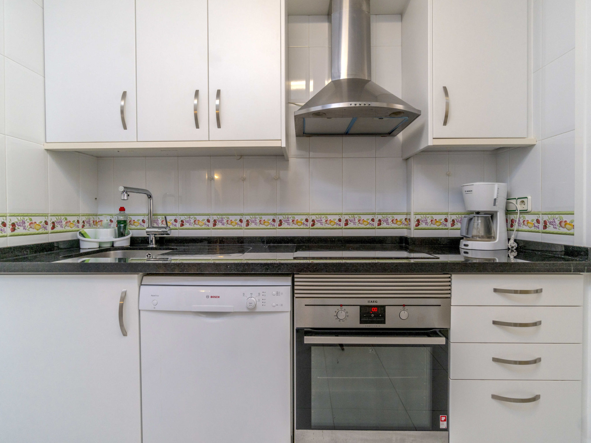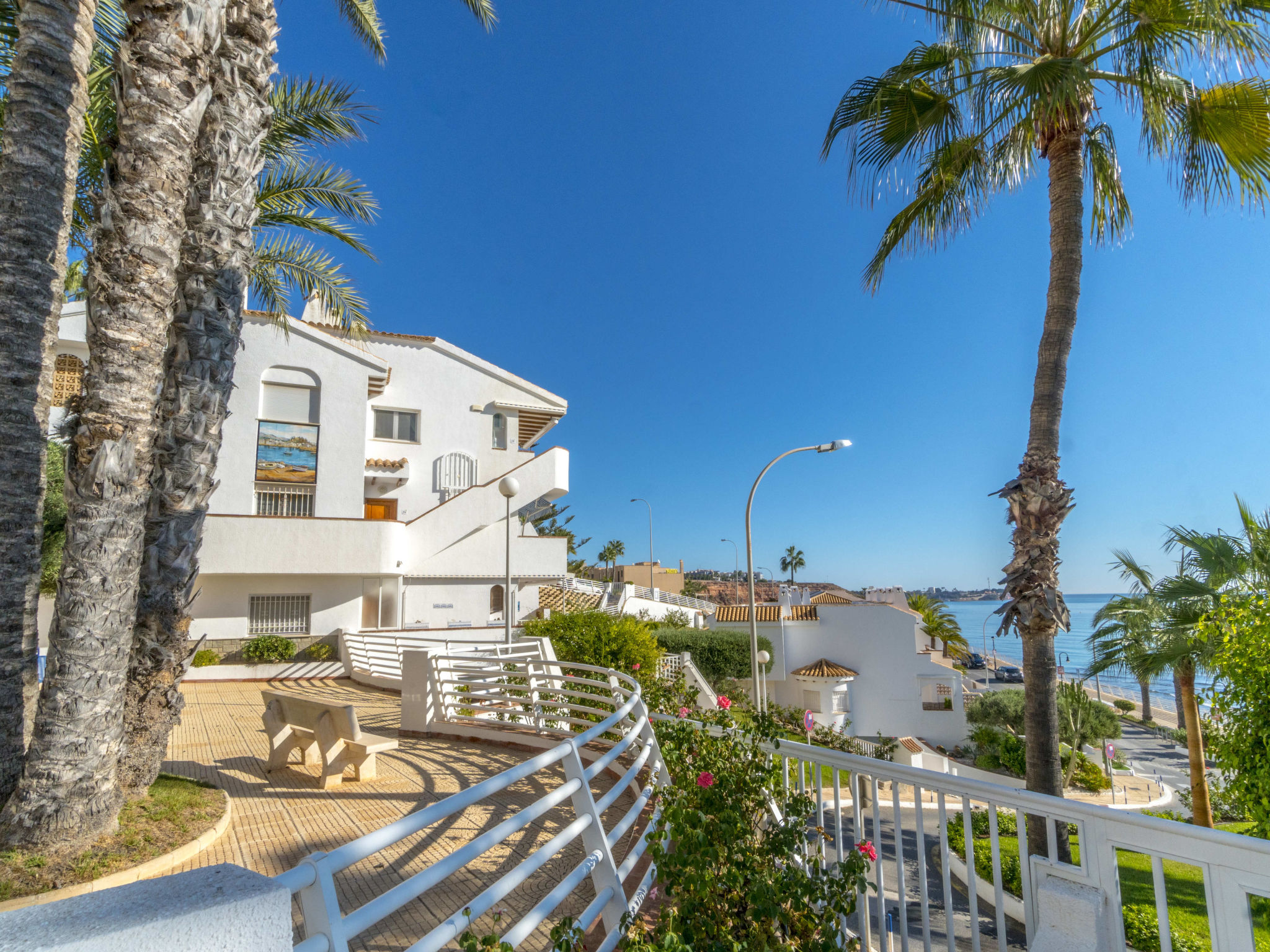 Komfortable Residenz "Aquamarina". Ruhige, sonnige Lage, 40 m vom Meer, 30 m vom Strand. Zur Mitbenutzung: Garten, Schwimmbad (21 x 6 m, 90 - 230 cm tief, saisonale Verfügbarkeit: 01.Jan.-31.Dez. Öffnungszeiten Schwimmbad: 08:00-22:00). Treppenweg (12 Stufen) bis zum Haus. Parkplatz (überdacht). Einkaufsgeschäft, Supermarkt, Restaurant, Bar, Café 400 m, Sandstrand "Aguamarina" 30 m. Sporthafen 1 km, Golfplatz (18 Loch) 5 km, Radweg 30 m. Bitte beachten: kein Fahrstuhl vorhanden. Residenz ist 24 Std. überwacht.