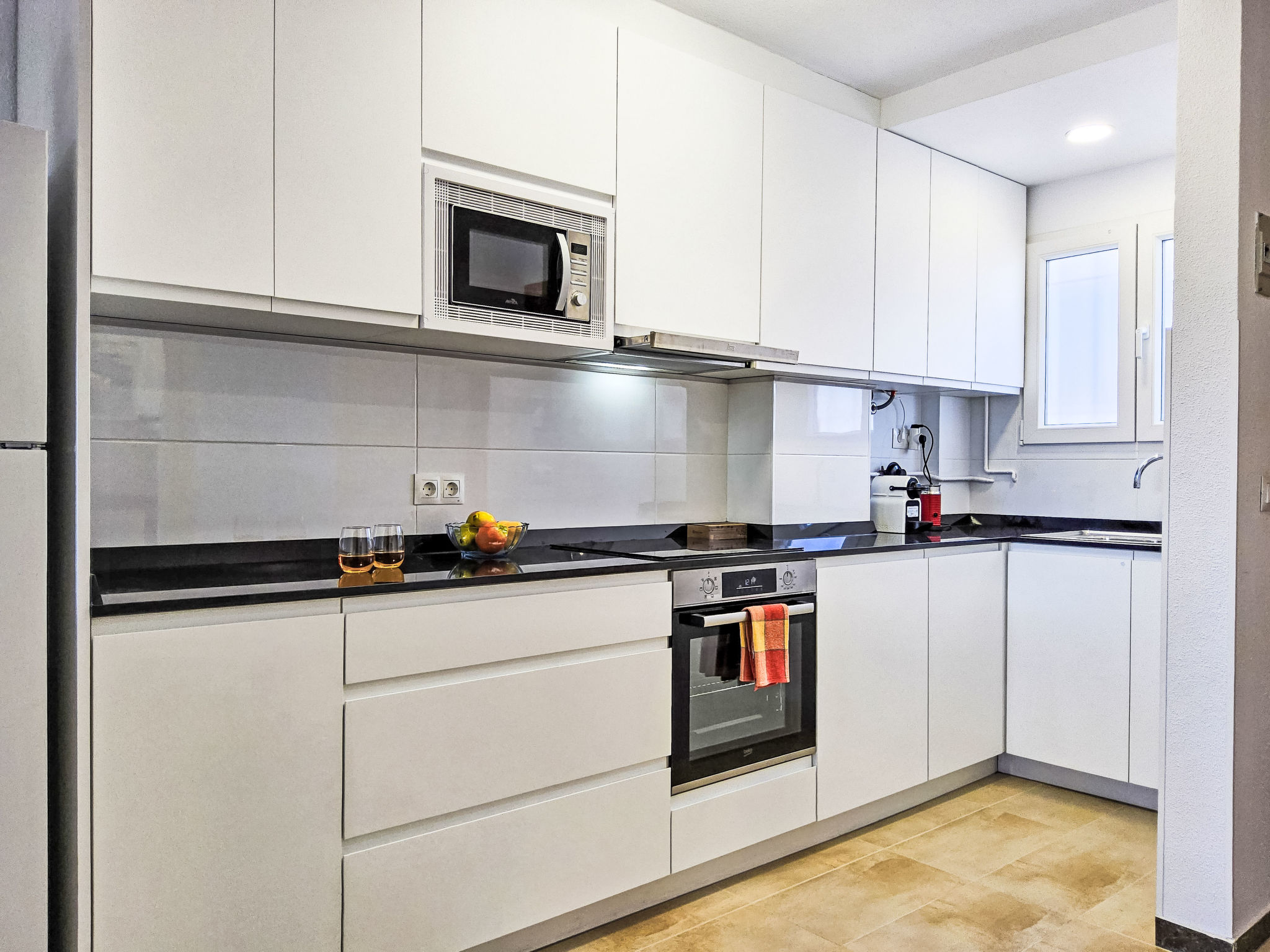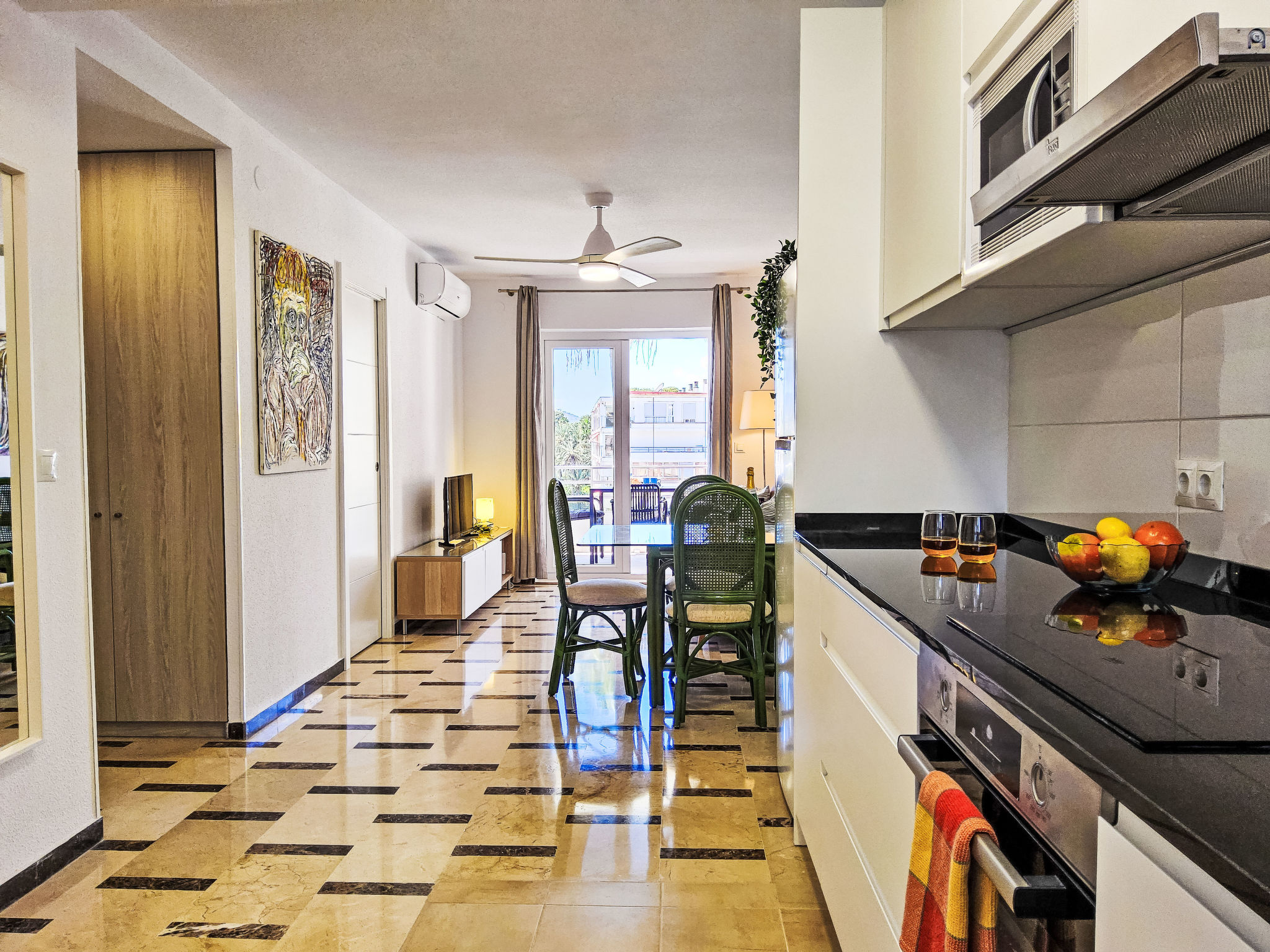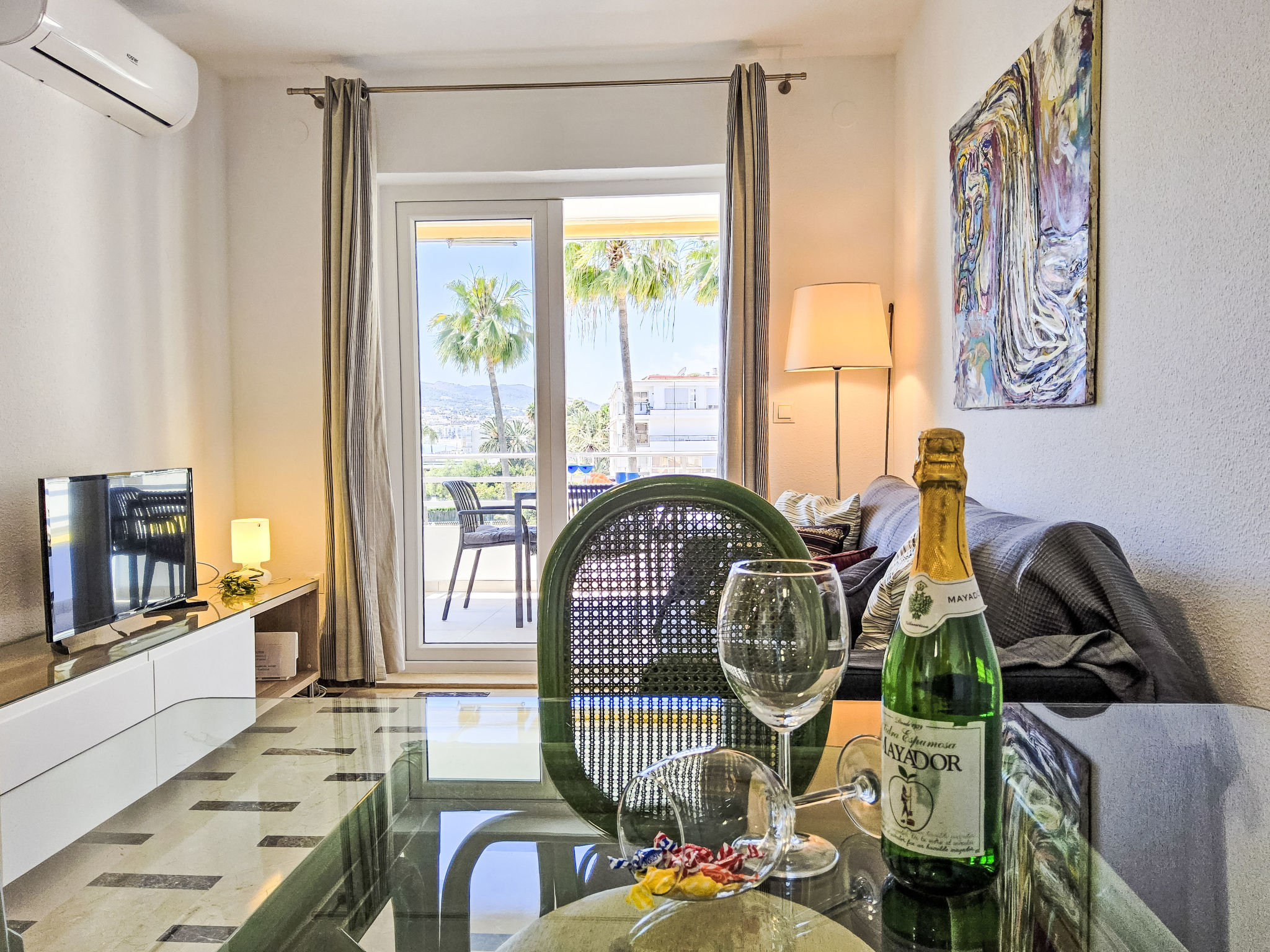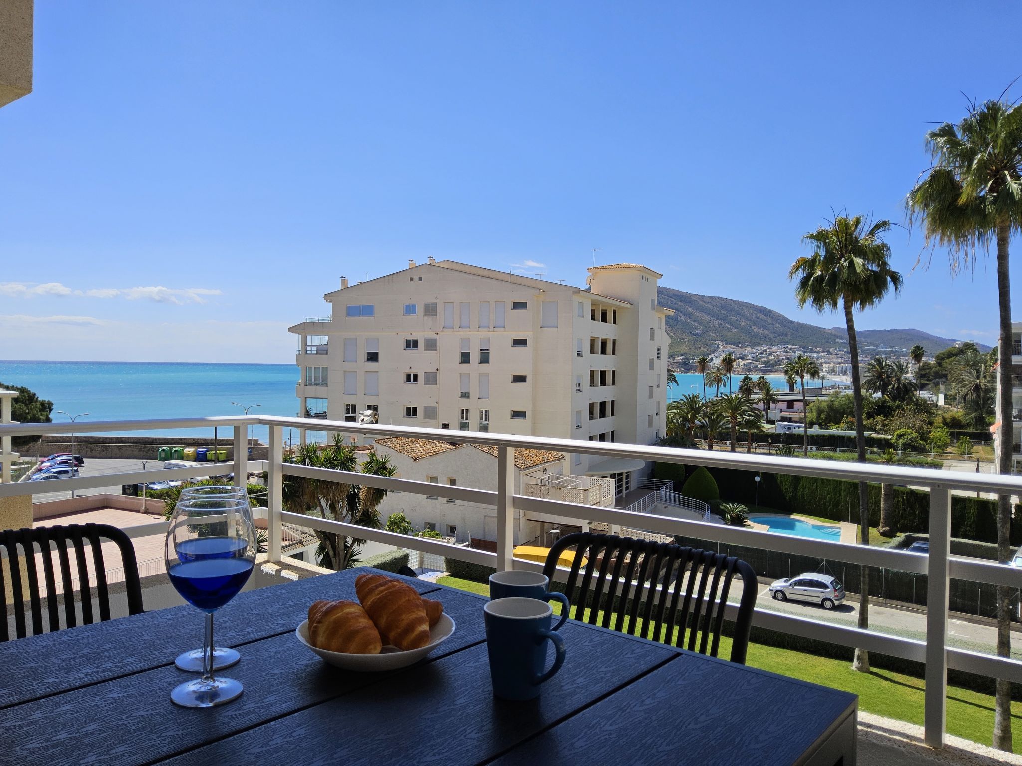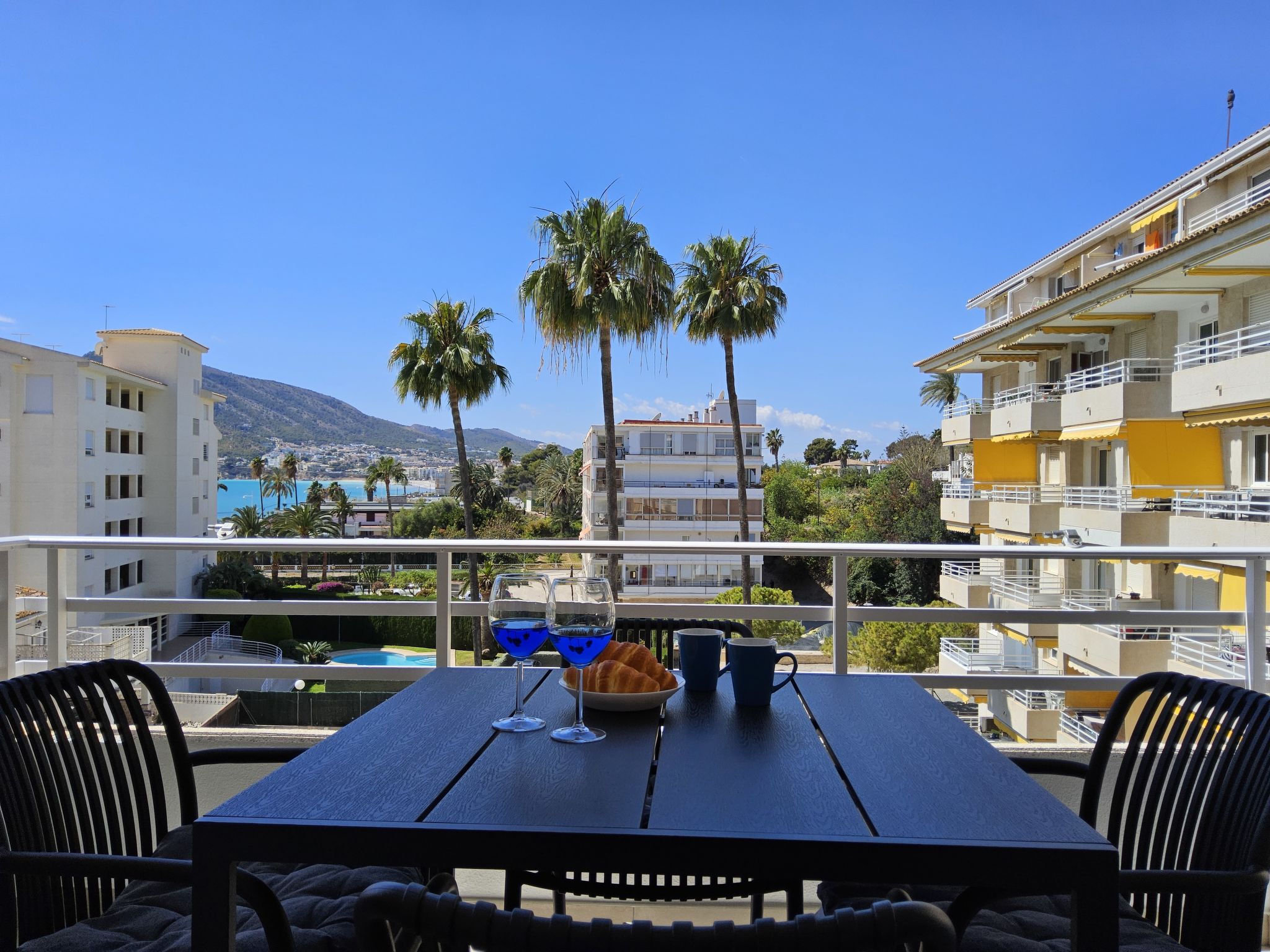 "Sol y Mar", 3-Zimmer-Wohnung 51 m2 im 4. Stock. Zweckmässig und komfortabel eingerichtet: Wohn-/Esszimmer 24 m2 mit Digital-TV. Ausgang zur Terrasse. 1 Zimmer 10 m2 mit 1 franz. Bett (150 cm, Länge 190 cm). 1 Zimmer 4 m2 mit 1 franz. Bett (135 cm, Länge 190 cm). Offene Küche 3 m2 (4 Kochplatten, Toaster, Wasserkocher, Mikrowelle, Tiefkühler, elektrische Kaffeemaschine). Dusche/WC. Terrasse 7 m2. Terrassenmöbel. Sehr schöne Sicht auf das Meer, das Schwimmbad und den Garten. Zur Verfügung: Waschmaschine, Bügeleisen, Haartrockner. Internet (Wireless LAN, gratis). Parkplatz (eingezäunt). AT441492A