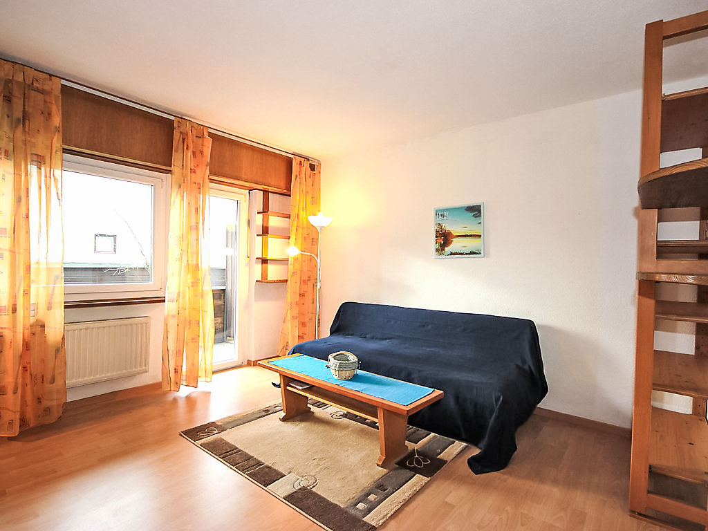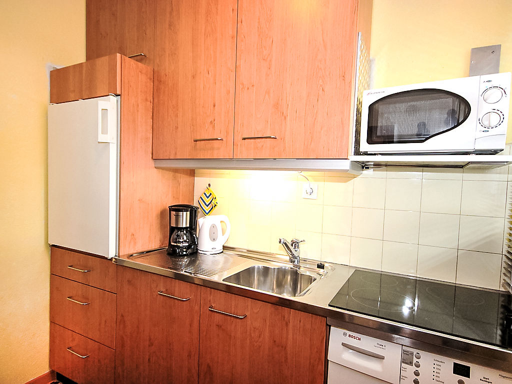 1-Zimmer-Wohnung 33 m2, im erhöhten Erdgeschoss. Wohn-/Esszimmer mit 1 Diwanbett, 1 Doppelwandschrankbett, Essecke und Kabel-TV (Flachbildschirm). Ausgang zum Balkon. Küche (Mini-Backofen, 3 Glaskeramikherd Platten, Mikrowelle). Dusche/WC. Balkon. Balkonmöbel. Zur Verfügung: Waschmaschine, Telefon. Bitte beachten: Nichtraucher-Unterkunft. Rauchmelder.