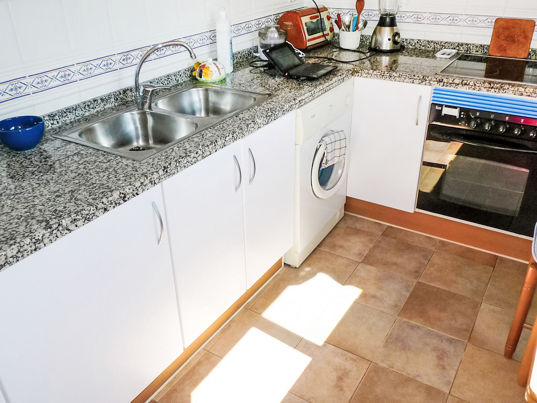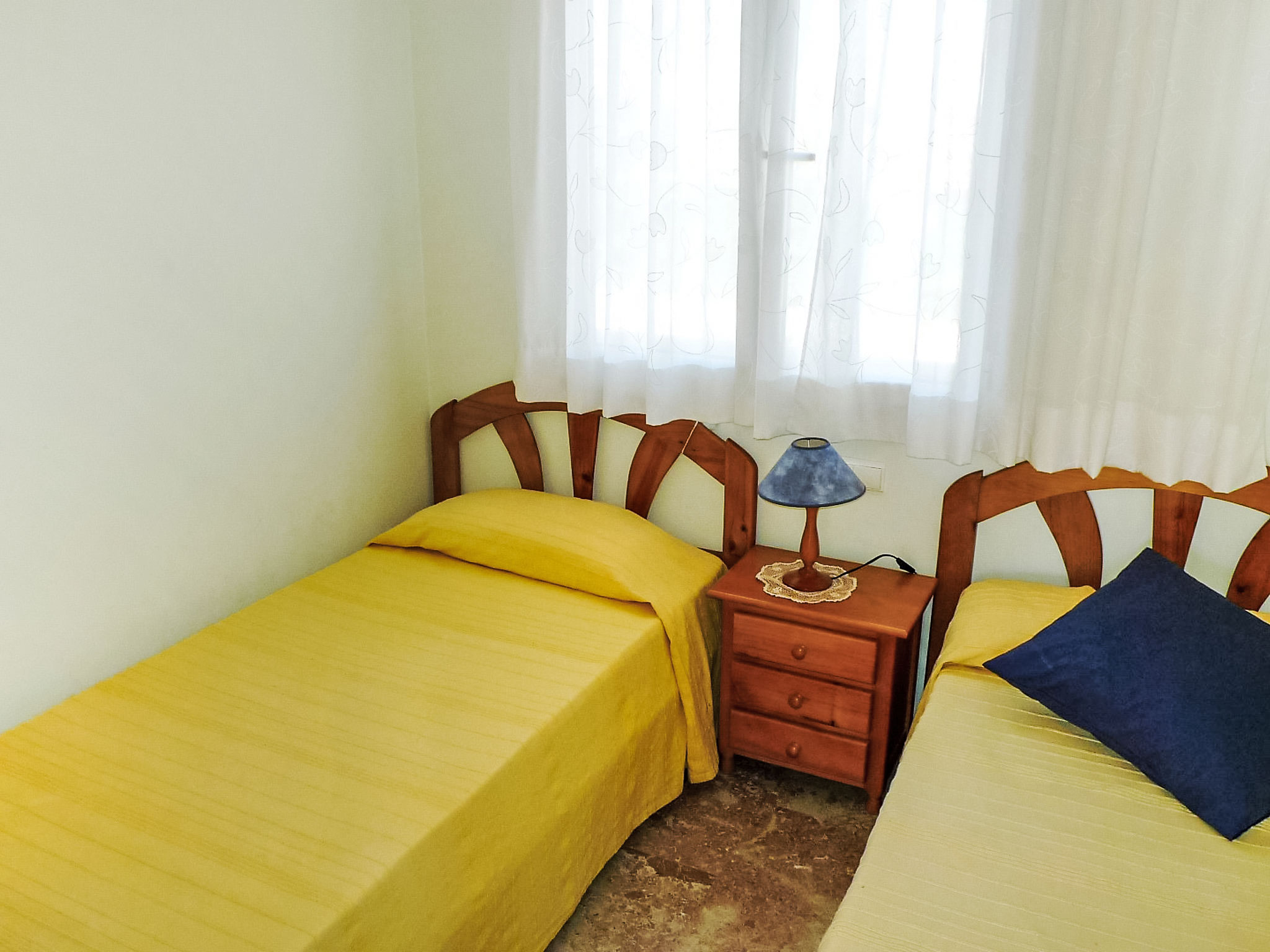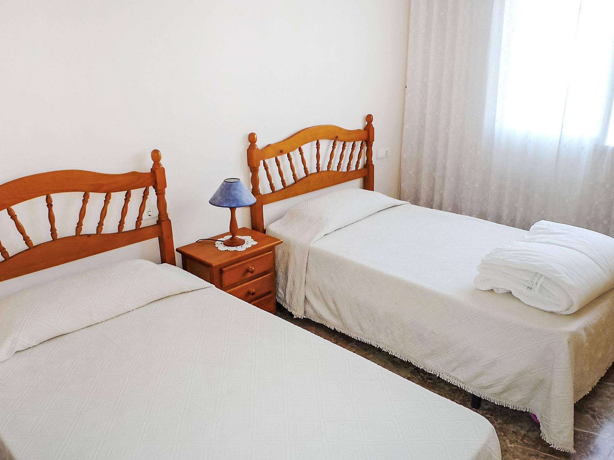 "Luz del Mediterraneo", 3-Zimmer-Dachterrassenwohnung 75 m2. Hell, zweckmässig eingerichtet: Wohn-/Esszimmer mit Digital-TV und Flachbildschirm. Ausgang zur Terrasse. 1 Zimmer mit 2 Betten (105 cm, Länge 180 cm). 1 Doppelzimmer mit 2 Betten (90 cm, Länge 180 cm), Bad/Bidet/WC und Waschbecken. Küche (Backofen, 4 Glaskeramikherd Platten, Toaster, Wasserkocher, Tiefkühler, elektrische Kaffeemaschine). Dusche/WC. Grosse Terrasse. Schöne Sicht auf das Schwimmbad, den Garten und die Landschaft. Zur Verfügung: Waschmaschine, Bügeleisen, Haartrockner. Internet (Wireless LAN, gratis). Parkplatz Nr. 41 (überdacht). AT 440659 A