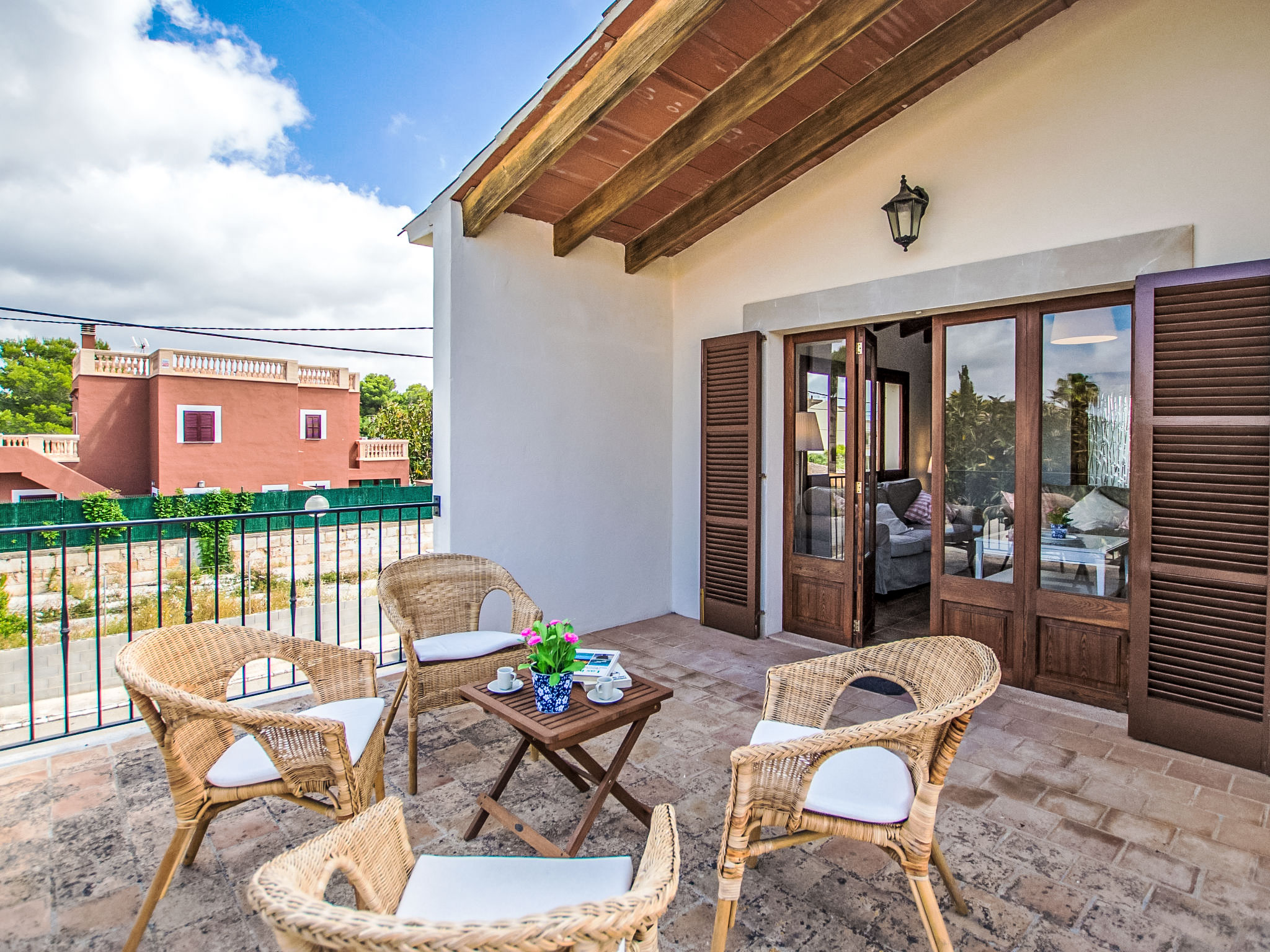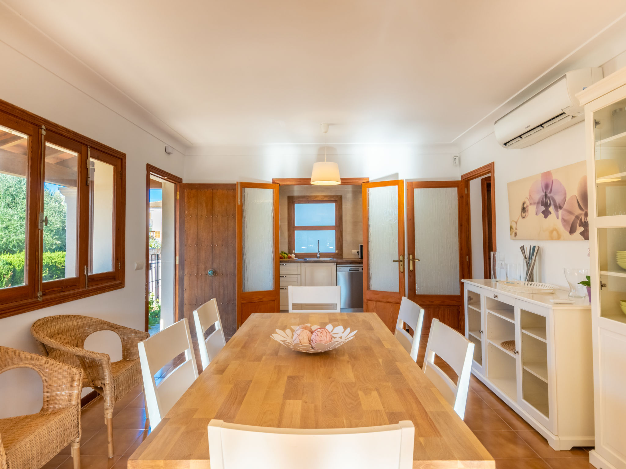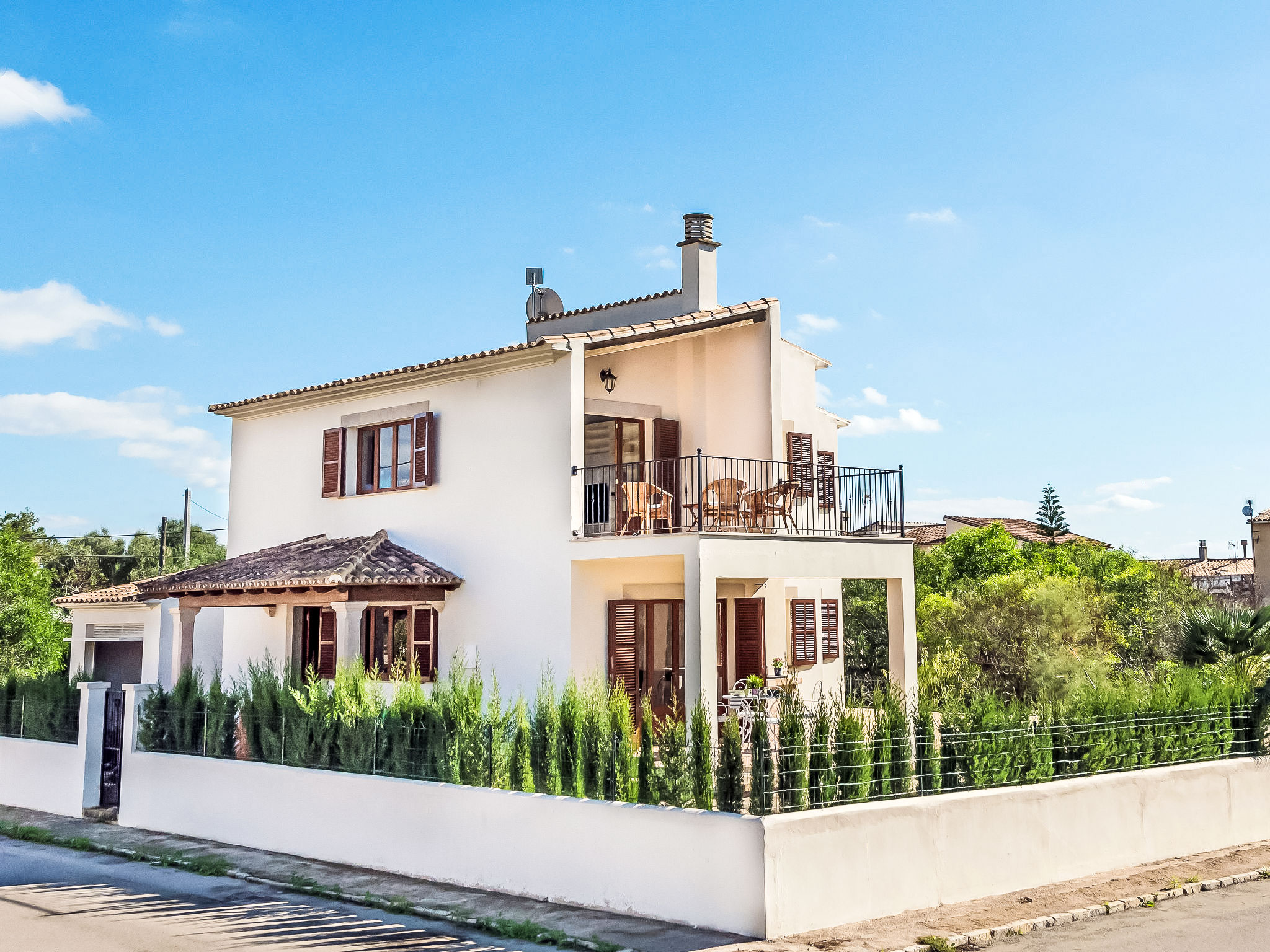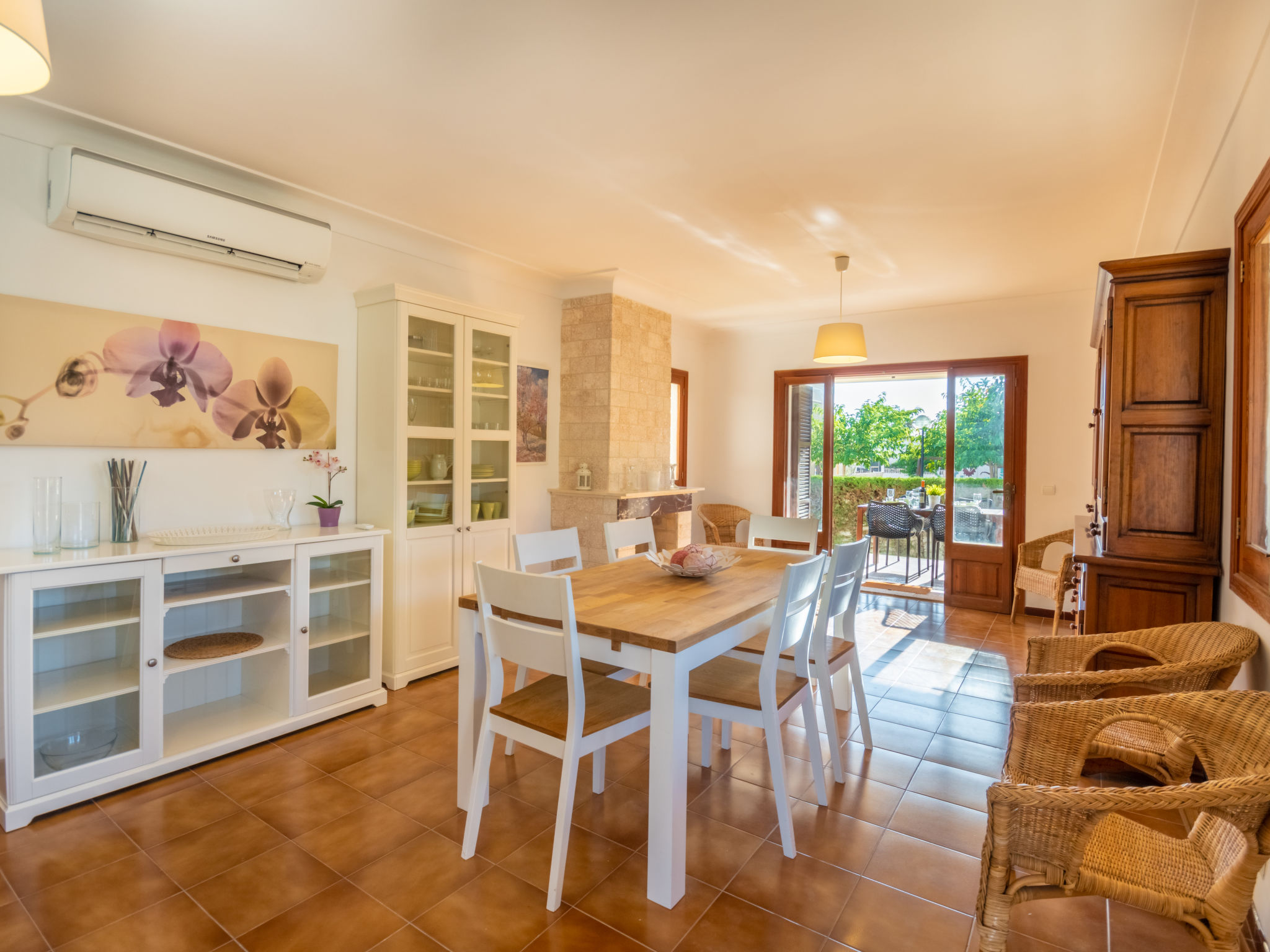 "Es Trenc Beach House", 6-Zimmer-Villa 200 m2 auf 2 Stockwerken. Objekt geeignet für 8 Erwachsene. Geräumig, vollständig renoviert, sehr komfortabel und gemütlich eingerichtet: grosses Wohn-/Esszimmer mit Panoramafenster mit offenem Kamin, Esstisch, Klimaanlage und Warmluftheizung. Ausgang zur Loggia, zum Gartensitzplatz. 1 grosses Doppelzimmer mit Panoramafenster mit 1 franz. Bett, Klimaanlage und Warmluftheizung. 1 grosses Doppelzimmer mit Panoramafenster mit 2 Betten (90 cm), Klimaanlage und Warmluftheizung. Küche (Backofen, 1 Glaskeramikherd Platte, Mikrowelle, Tiefkühler, elektrische Kaffeemaschine). Bad/Dusche/Bidet/WC mit Eckbadewanne. Obergeschoss: grosses Wohnzimmer mit Panoramafenster mit Sat-TV, Digital-TV, Flachbildschirm, Radio, Stereoanlage, Klimaanlage und Warmluftheizung. Ausgang zum Balkon. (Leiter) 1 grosses Doppelzimmer mit Panoramafenster mit 1 franz. Bett, Klimaanlage und Warmluftheizung. (Leiter) 1 grosses Doppelzimmer mit 2 Betten (90 cm), Klimaanlage und Warmluftheizung. Bad/Dusche/Bidet/WC mit Eckbadewanne. Grosser Balkon, grosser Gartensitzplatz, Rasen. Terrassenmöbel, Balkonmöbel, Gartengrill, Liegestühle, Loggia, Abstellkammer. Eingeschränkte Sicht auf die Ortschaft und das Meer. Zur Verfügung: Waschmaschine, Wäschetrockner, Bügeleisen, Kinderhochstuhl, Babybett, Haartrockner. Internet (Wireless LAN, gratis). Geeignet für Familien. L12E7464