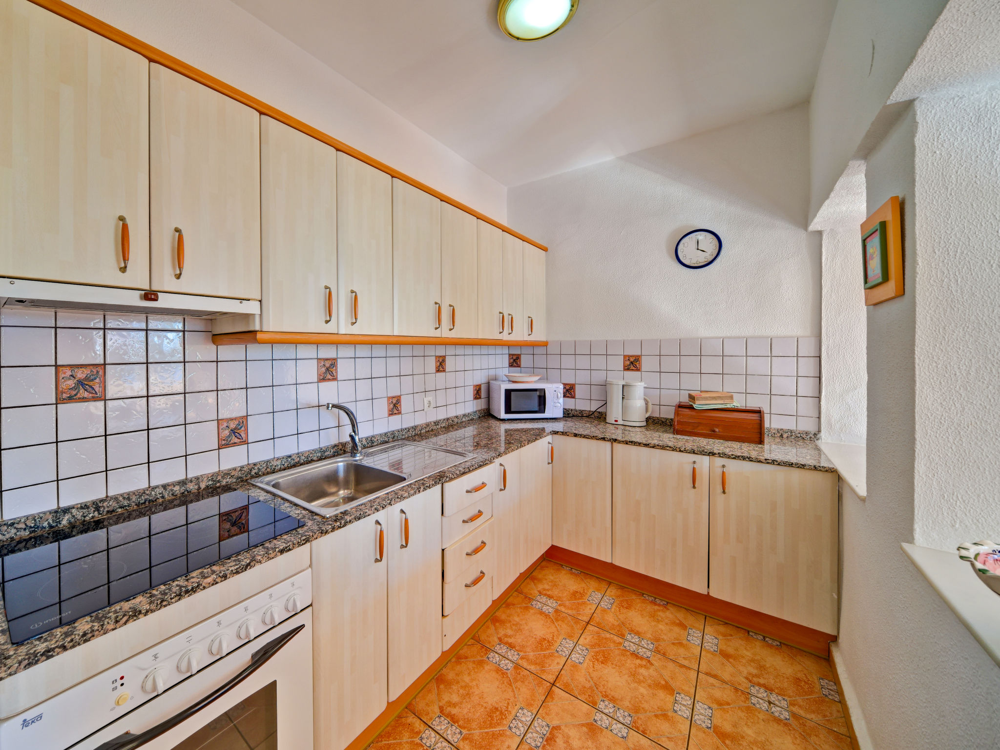 3-Zimmer-Wohnung, ca. 70 m². Wohn-/Schlafraum mit Sitzgruppe/Bettcouch oder Zustellbett, Essplatz und Terrassenausgang. Küche (4 Ceranfelder, Backofen, Mikrowelle, Kühl-/Gefrierkombination, Kaffeemaschine) mit Durchreiche zum Wohnraum. Schlafzimmer mit franz. Bett (ca. 1,35 m breit). Zweibettzimmer. Bad/WC. AT-438376-A