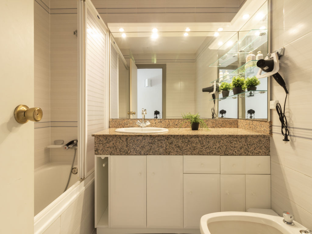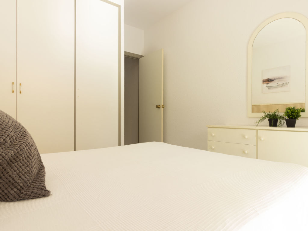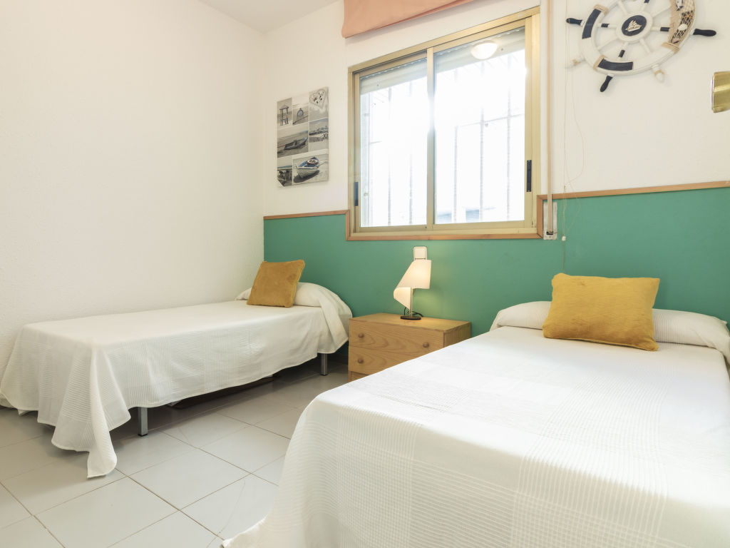 "Golf Sant Jordi", 3-Zimmer-Wohnung 51 m2, im Erdgeschoss. Zweckmässig und gemütlich eingerichtet: Wohn-/Esszimmer mit 1 Diwanbett und Digital-TV. Ausgang zur Terrasse. 1 Zimmer mit 1 franz. Bett (150 cm, Länge 190 cm). 1 Zimmer mit 2 Betten (90 cm, Länge 190 cm). Offene Küche (Backofen, 3 Glaskeramikherd Platten, Toaster, Wasserkocher, Mikrowelle, elektrische Kaffeemaschine). Bad/WC. Terrasse. Terrassenmöbel, Liegestühle. Seitliche Sicht auf das Meer. Zur Verfügung: Waschmaschine, Bügeleisen, Haartrockner. Bitte beachten: Nichtraucher-Unterkunft. HUTT044435