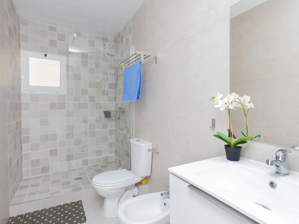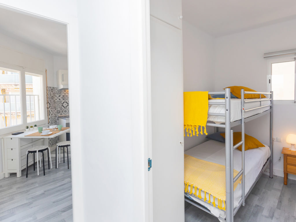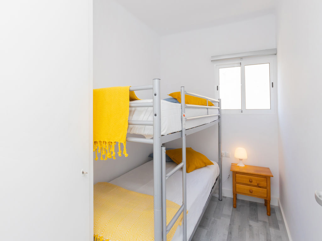 "Calaf II", 2-Zimmer-Wohnung 36 m2. Zweckmässig und komfortabel eingerichtet: Wohn-/Esszimmer mit 1 Doppeldiwanbett (160 cm, Länge 200 cm), Esstisch, Digital-TV, Internationale TV-Sender, E-Heizung und Ventilator. 1 Zimmer mit 1 x 2 Etagenbetten (90 cm, Länge 190 cm), Ventilator. Offene Küche (Backofen, 4 Glaskeramikherd Platten). Dusche/Bidet/WC. Sicht auf das Meer. Zur Verfügung: Bügeleisen. Internet (Wireless LAN, gratis). Parkplatz (eingezäunt, 1 Auto). HUTT051813