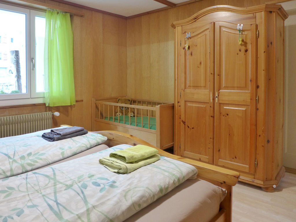 2-Zimmer-Wohnung 45 m2, im Erdgeschoss, Südlage. Zweckmässig und gemütlich eingerichtet: Wohn-/Schlafzimmer 22 m2 mit 2 Betten (90 cm, Länge 200 cm), Esstisch, Radio und CD. Ausgang zur Terrasse. 1 Doppelzimmer mit 1 Doppelbett (2 x 90 cm, Länge 200 cm). Offene Küche (3 Kochplatten, Backofen, Wasserkocher, Mikrowelle, elektrische Kaffeemaschine, Kapseln für die Kaffeemaschine (Delizio) extra, Racletteofen, Fondue Set (Käse)). Dusche/WC. Terrasse, Gartensitzplatz, Südlage. Terrassenmöbel, Gartengrill, Liegestühle. Herrliche Panoramasicht auf die Berge und die Ortschaft. Zur Verfügung: Babybett, Haartrockner. Internet (Wireless LAN, gratis). Parkplatz (2 Autos). Bitte beachten: Nichtraucher-Unterkunft.