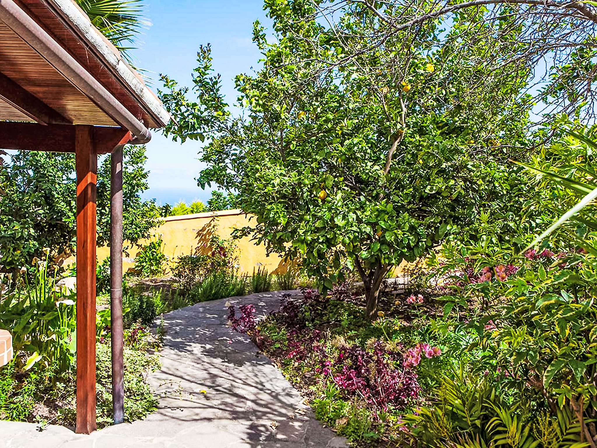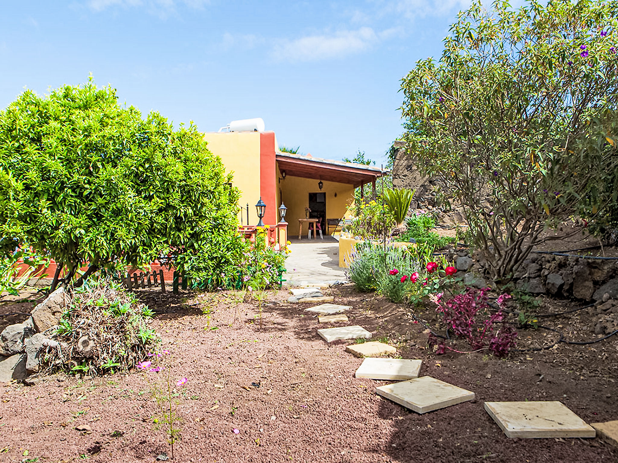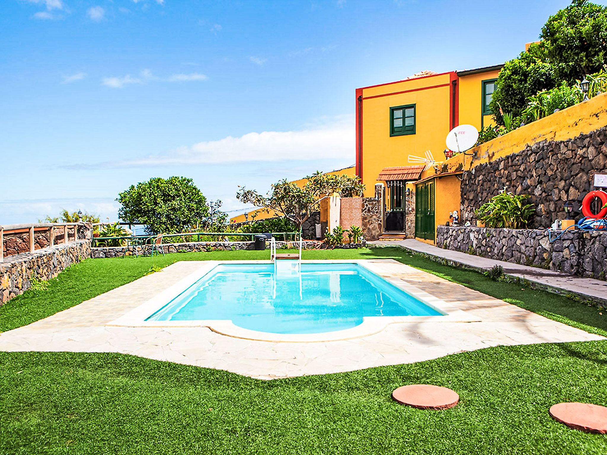 La Orotava: Schönes, rustikales Haus "Camino La Candelaria". Ausserhalb des Ortes, am Hang, 6 km vom Meer. Zur Mitbenutzung: Grundstück 20'000 m2 mit Rasen, Obstgarten, wunderschöner Garten zum Entspannen, Schwimmbad (7 x 4 m, 120 - 150 cm tief, saisonale Verfügbarkeit: 01.Jan.-31.Dez.). WC im Poolbereich, Aussendusche, Poolhaus mit Kühlschrank, Gartenmöbel, Grill. In der Anlage: Wireless LAN. Parkplatz auf dem Grundstück. Lebensmittelgeschäft, Restaurant 300 m, Bushaltestelle 20 m, Sandstrand 6 km. Jugendgruppen nur auf Anfrage. Bitte beachten: Hauptstrasse 50 m vom Haus. In diesem Haus sind weitere Ferienwohnungen mietbar. Sonnenterrasse, ca. 20 m2.