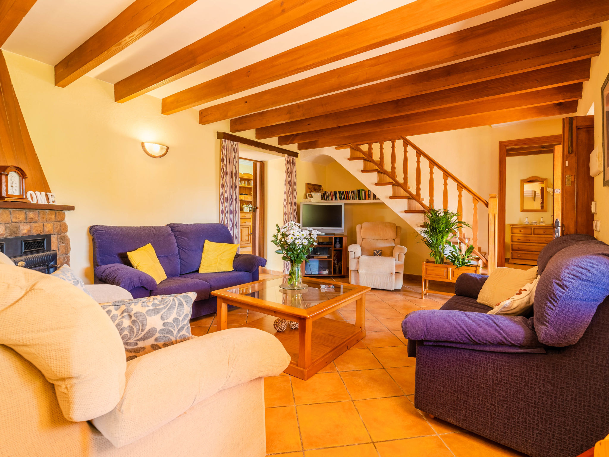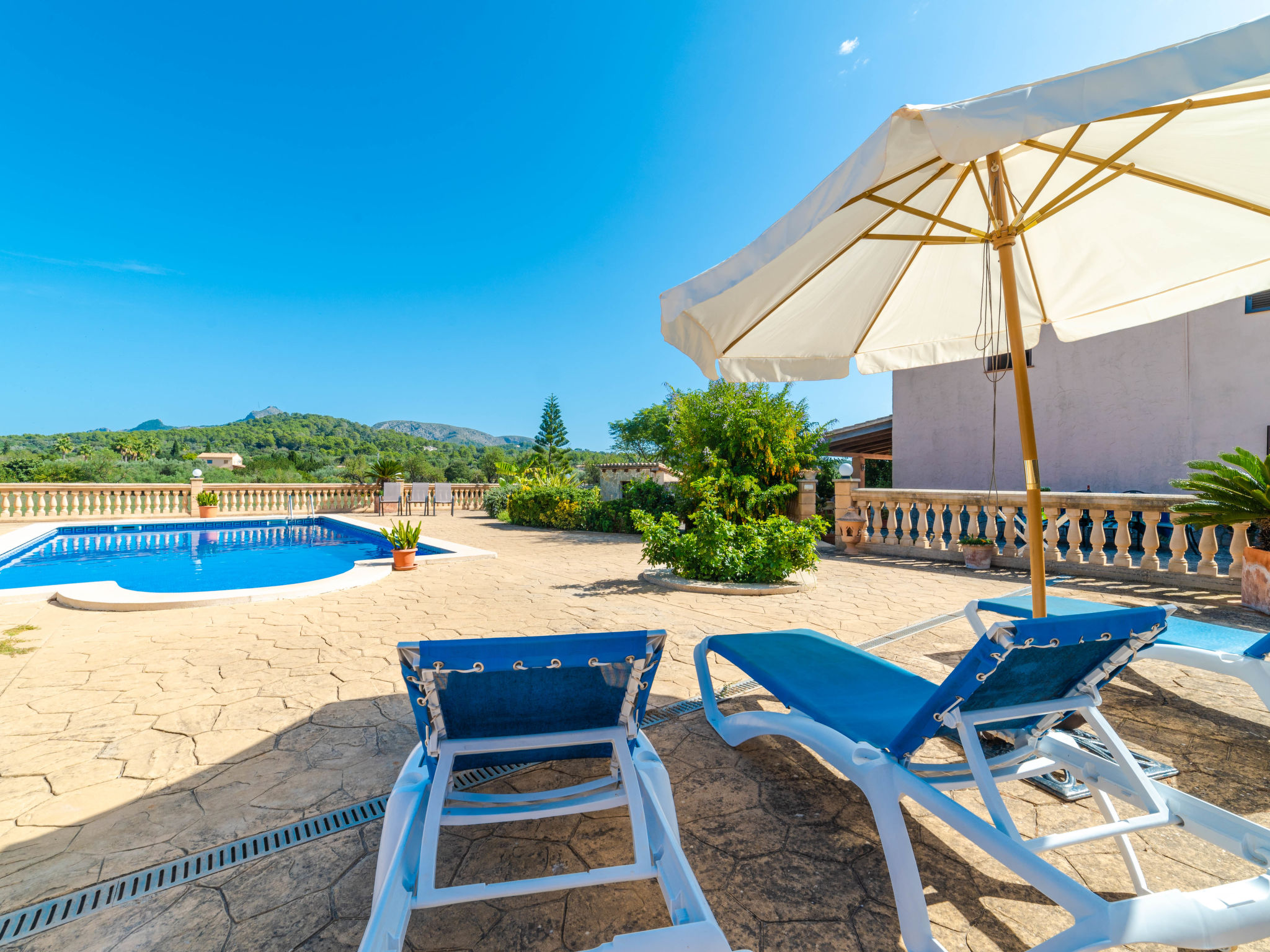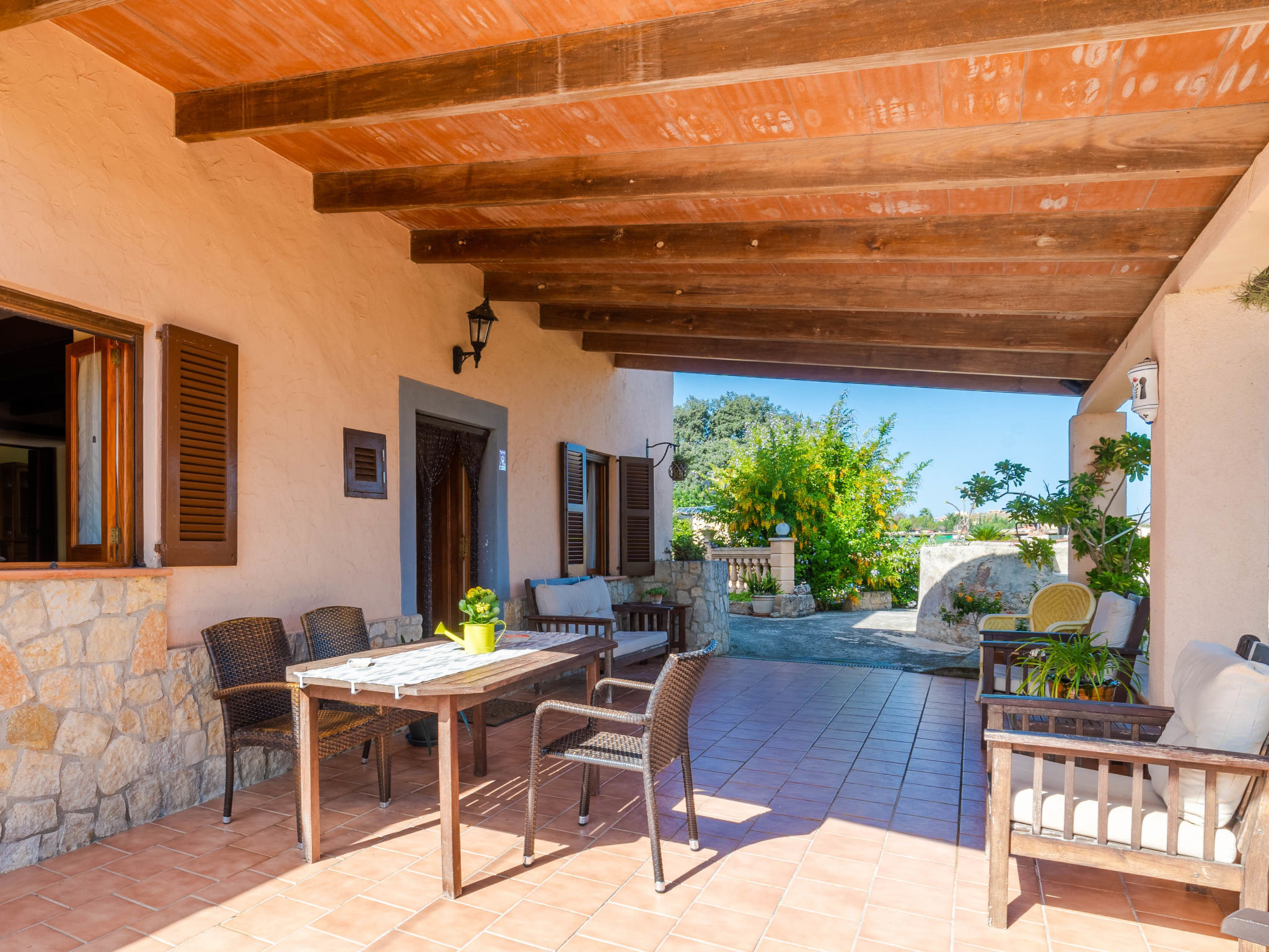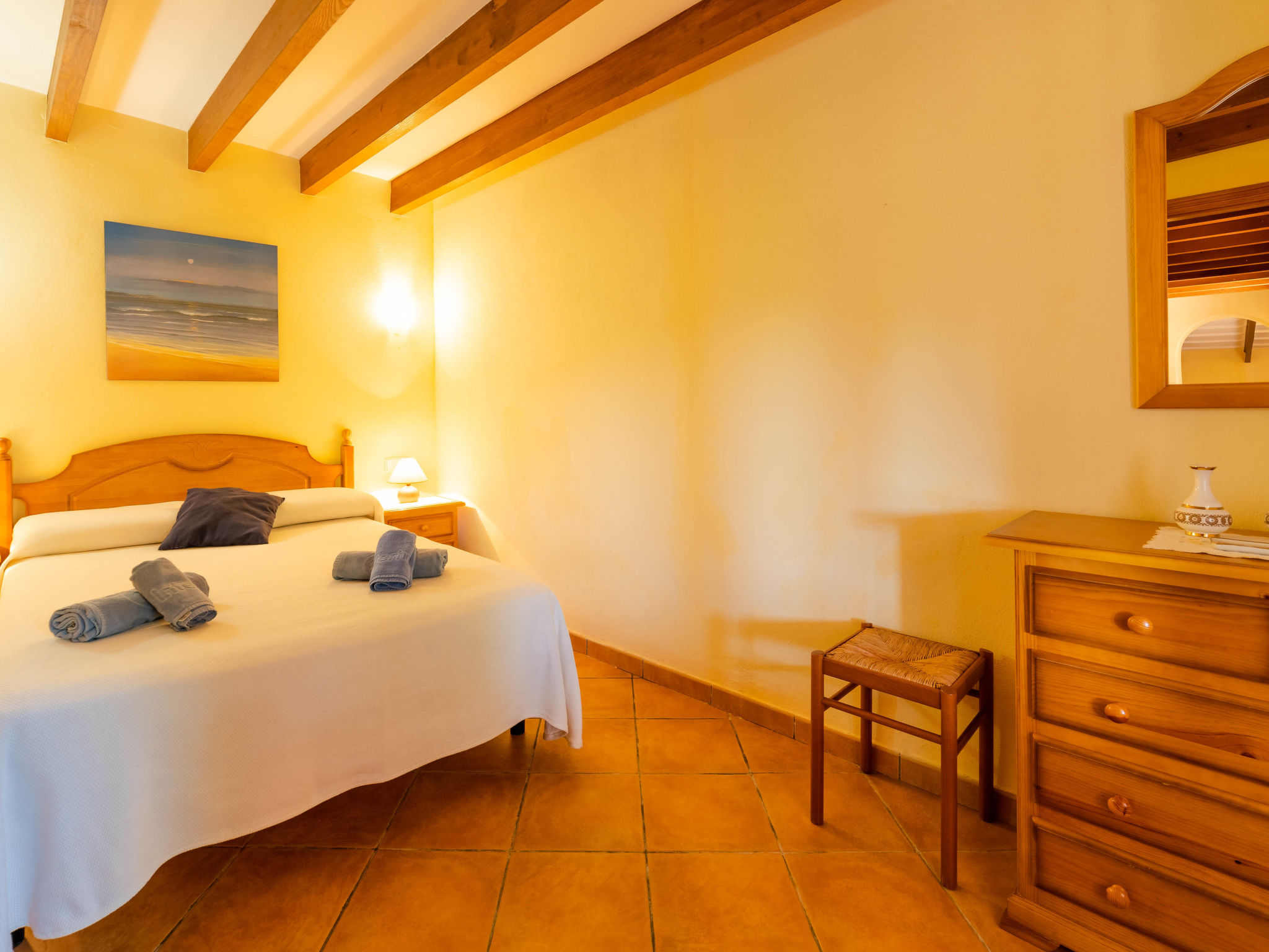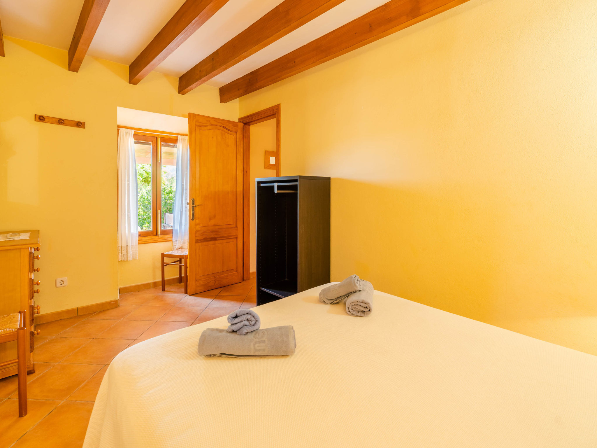 "Can Josepot", 4-Zimmer-Haus 130 m2 auf 2 Stockwerken. Objekt geeignet für 6 Erwachsene. Geräumig, renoviert, sehr zweckmässig und gemütlich eingerichtet: grosses Wohnzimmer mit offenem Kamin, Sat-TV, Digital-TV, Flachbildschirm und Ventilator. Ausgang zum Gartensitzplatz. 1 Doppelzimmer mit Panoramafenster mit 1 franz. Bett (150 cm, Länge 190 cm), Ventilator. Wohnküche (Backofen, 3 Glaskeramikherd Platten, Mikrowelle, Tiefkühler, elektrische Kaffeemaschine) mit Bar, Esstisch. Ausgang zum Gartensitzplatz, zum Schwimmbad. Bad/Bidet/WC. Obergeschoss: 1 Zimmer mit 1 Ausziehbett (2 Pers. 2 x 90 cm, Länge 190 cm), Klimaanlage und Warmluftheizung. 1 grosses Doppelzimmer mit 2 Betten (90 cm, Länge 190 cm), Klimaanlage und Warmluftheizung. Dusche/Bidet/WC. Terrasse 100 m2, kleine Terrasse 9 m2, grosser Garten. Terrassenmöbel, Gartengrill, Liegestühle (3), Loggia. Schöne Sicht auf die Berge und die Landschaft. Zur Verfügung: Waschmaschine, Wäschetrockner, Bügeleisen, Kinderhochstuhl, Babybett bis 2 Jahre, Haartrockner. Internet (Wireless LAN, gratis). Parkplatz (eingezäunt) beim Haus. Geeignet für Familien. 1 Haustier/Hund erlaubt. Das Badezimmer im 1. Stockwerk ist über die Aussenterrasse erreichbar. Zusätzlich: Deckenventilatoren, elektrische Heizungsradiatoren und 100 l Boiler. Klimaanlage ab März 2020 vorhanden. ETV3456