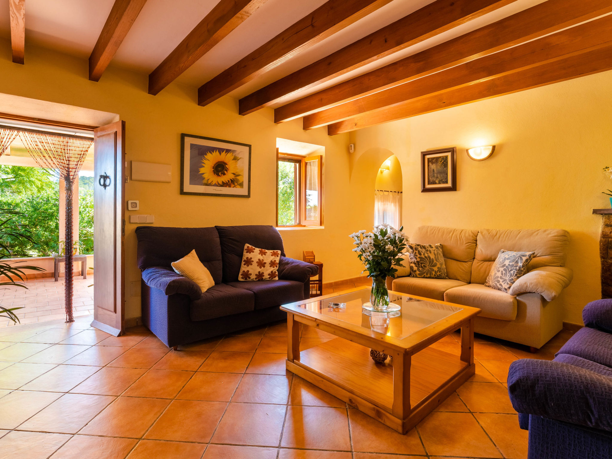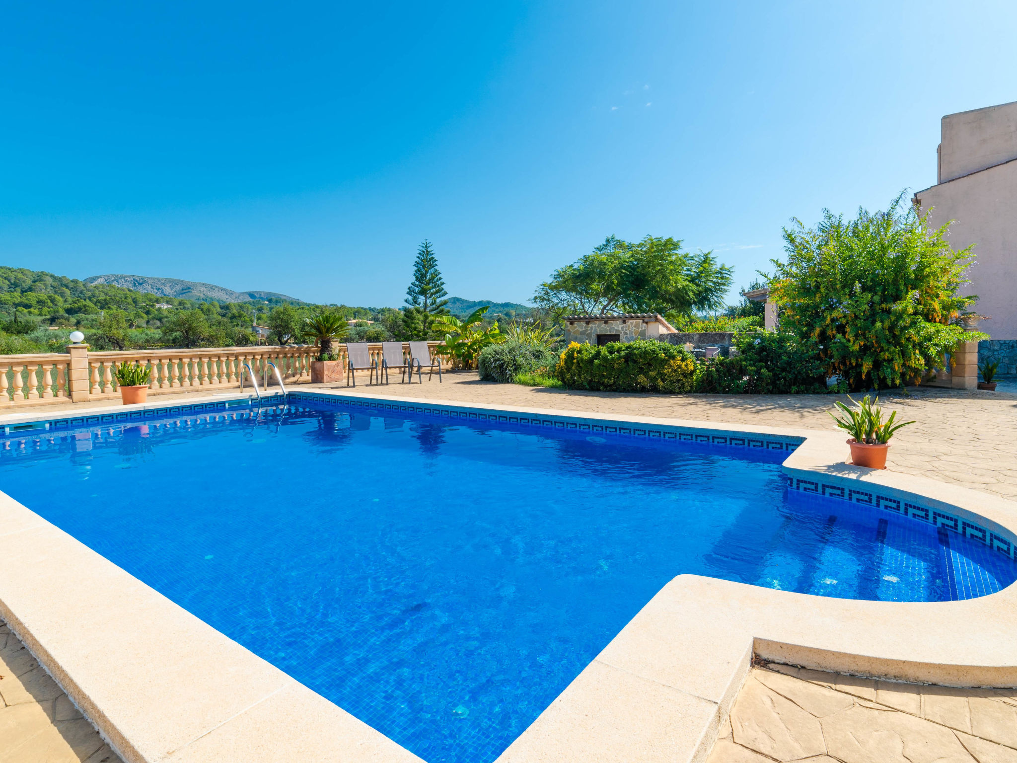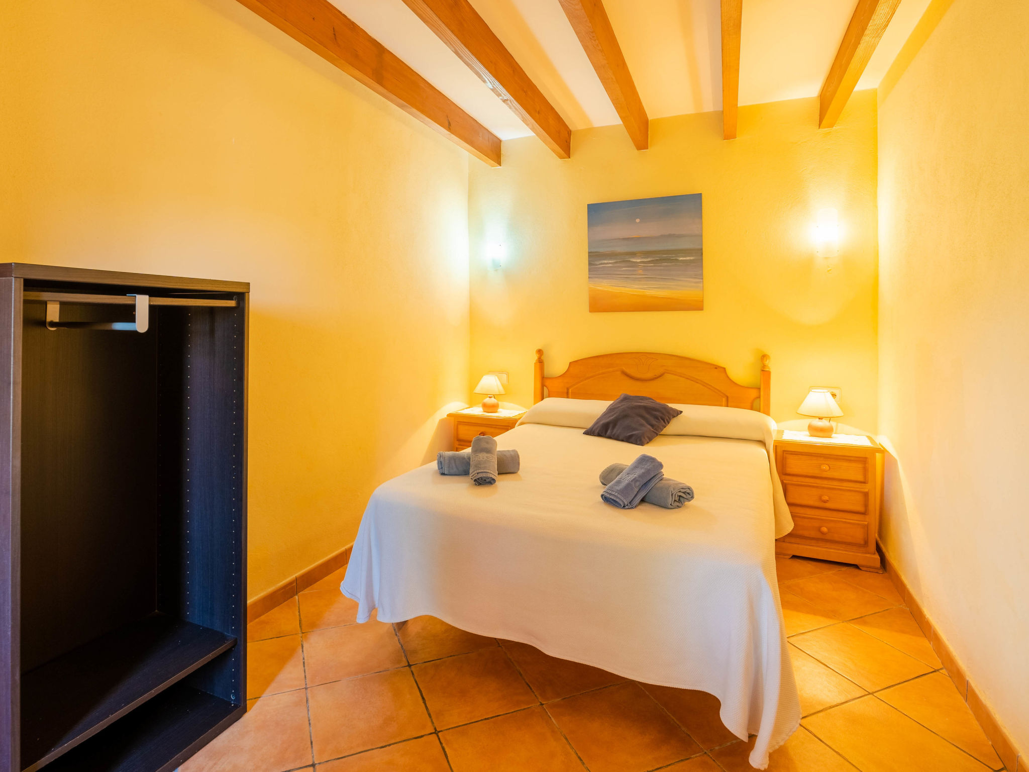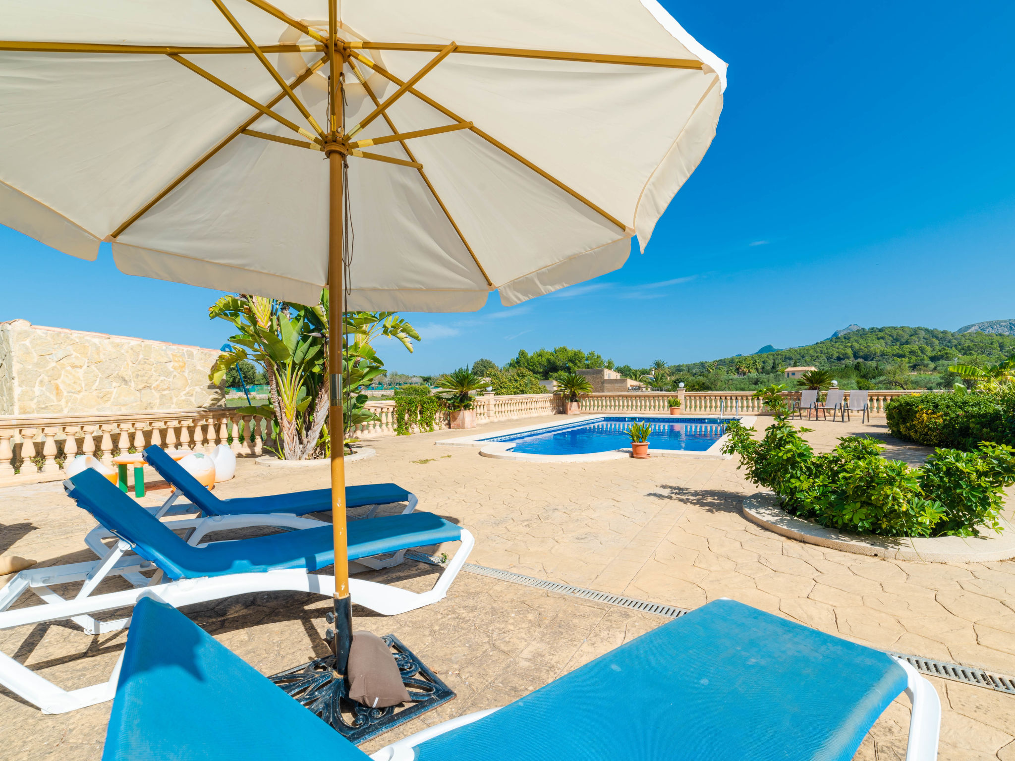"Can Josepot", 4-Zimmer-Haus 130 m2 auf 2 Stockwerken. Objekt geeignet für 6 Erwachsene. Geräumig, renoviert, sehr zweckmässig und gemütlich eingerichtet: grosses Wohnzimmer mit offenem Kamin, Sat-TV, Digital-TV, Flachbildschirm und Ventilator. Ausgang zum Gartensitzplatz. 1 Doppelzimmer mit Panoramafenster mit 1 franz. Bett (150 cm, Länge 190 cm), Ventilator. Wohnküche (Backofen, 3 Glaskeramikherd Platten, Mikrowelle, Tiefkühler, elektrische Kaffeemaschine) mit Bar, Esstisch. Ausgang zum Gartensitzplatz, zum Schwimmbad. Bad/Bidet/WC. Obergeschoss: 1 Zimmer mit 1 Ausziehbett (2 Pers. 2 x 90 cm, Länge 190 cm), Klimaanlage und Warmluftheizung. 1 grosses Doppelzimmer mit 2 Betten (90 cm, Länge 190 cm), Klimaanlage und Warmluftheizung. Dusche/Bidet/WC. Terrasse 100 m2, kleine Terrasse 9 m2, grosser Garten. Terrassenmöbel, Gartengrill, Liegestühle (3), Loggia. Schöne Sicht auf die Berge und die Landschaft. Zur Verfügung: Waschmaschine, Wäschetrockner, Bügeleisen, Kinderhochstuhl, Babybett bis 2 Jahre, Haartrockner. Internet (Wireless LAN, gratis). Parkplatz (eingezäunt) beim Haus. Geeignet für Familien. 1 Haustier/Hund erlaubt. Das Badezimmer im 1. Stockwerk ist über die Aussenterrasse erreichbar. Zusätzlich: Deckenventilatoren, elektrische Heizungsradiatoren und 100 l Boiler. Klimaanlage ab März 2020 vorhanden. ETV3456