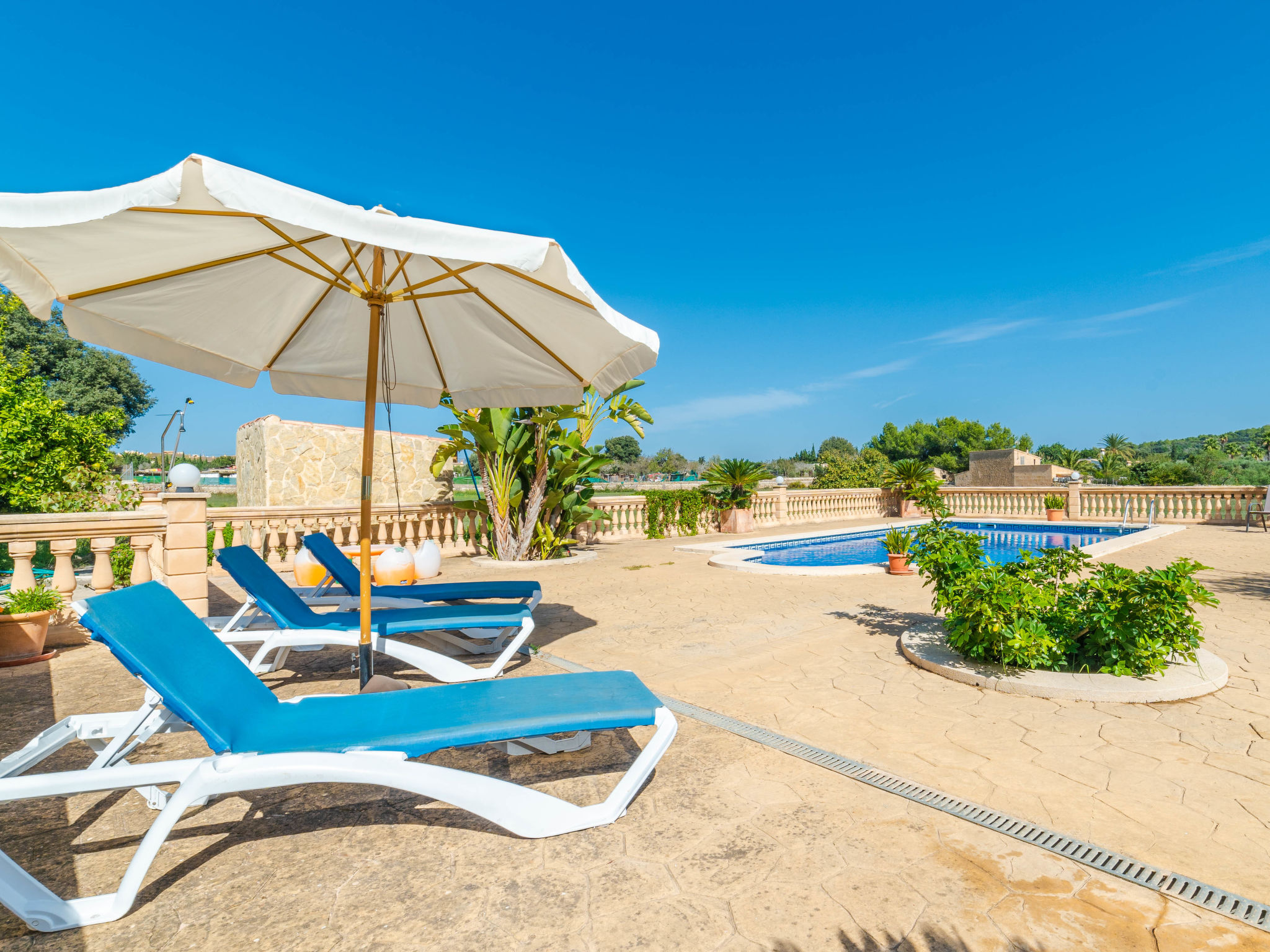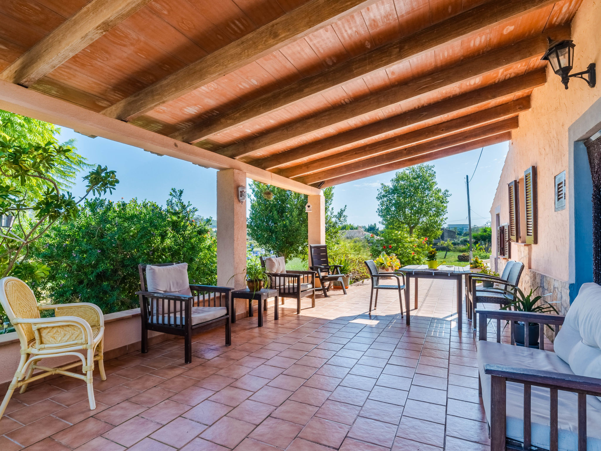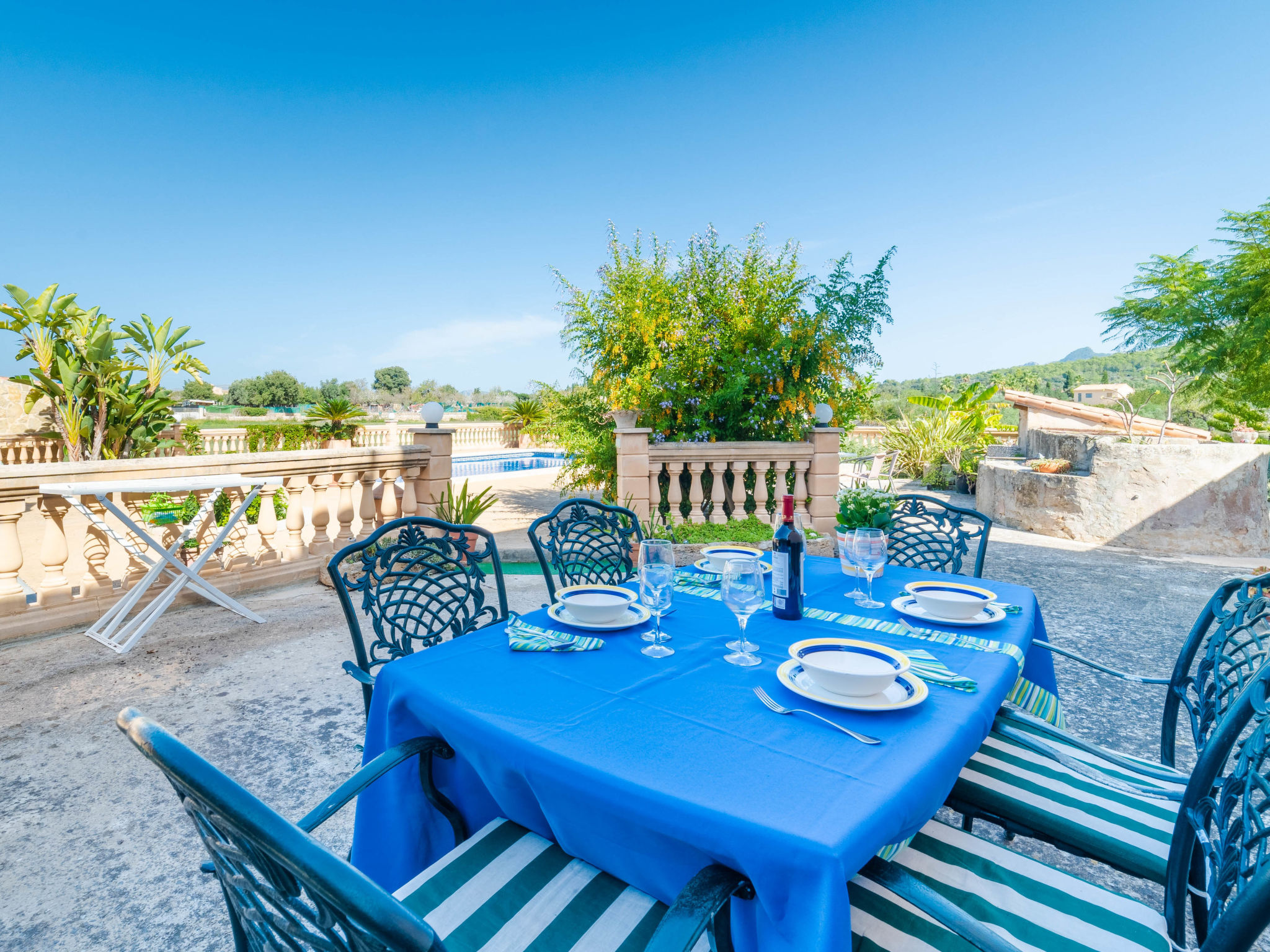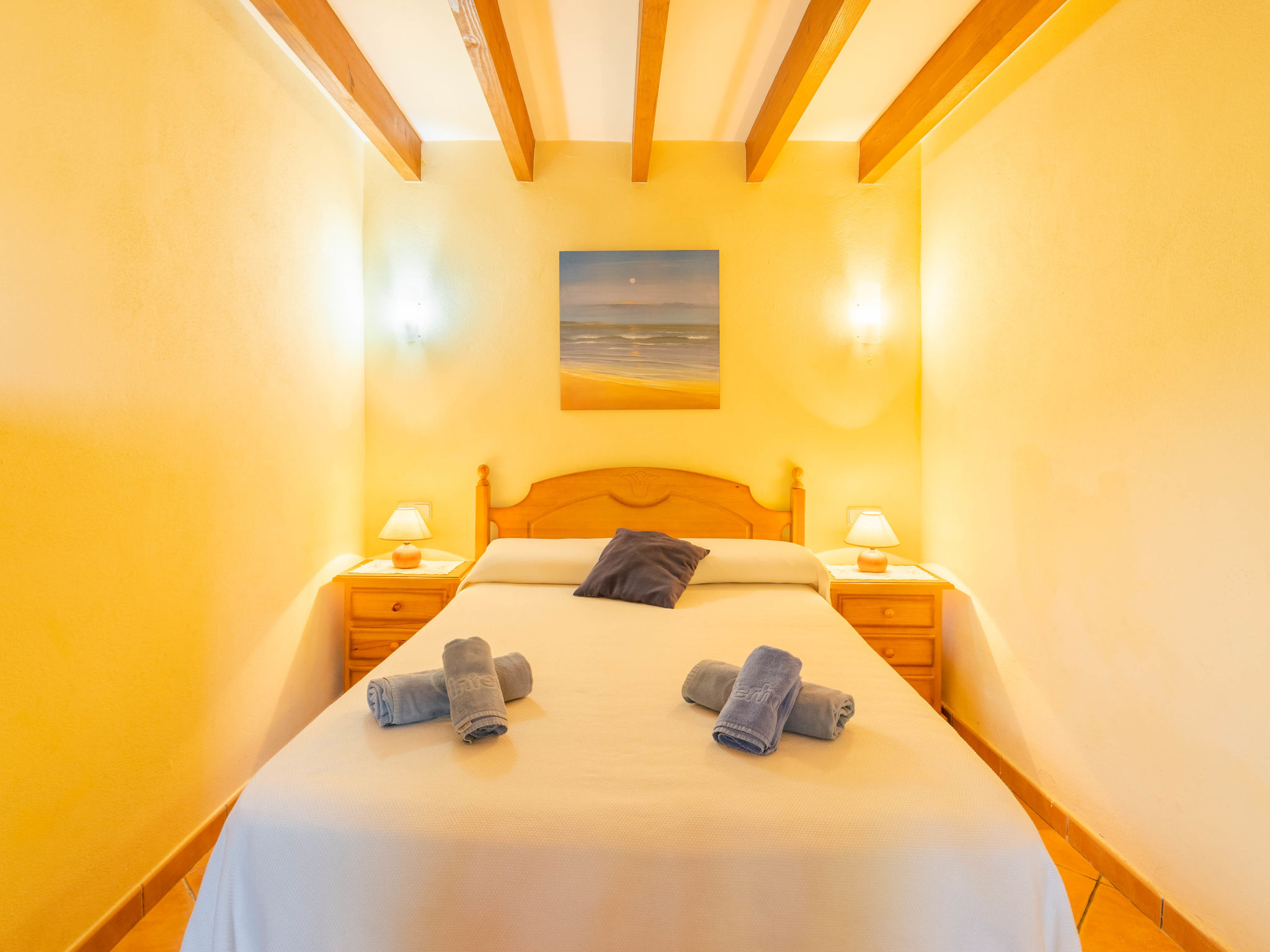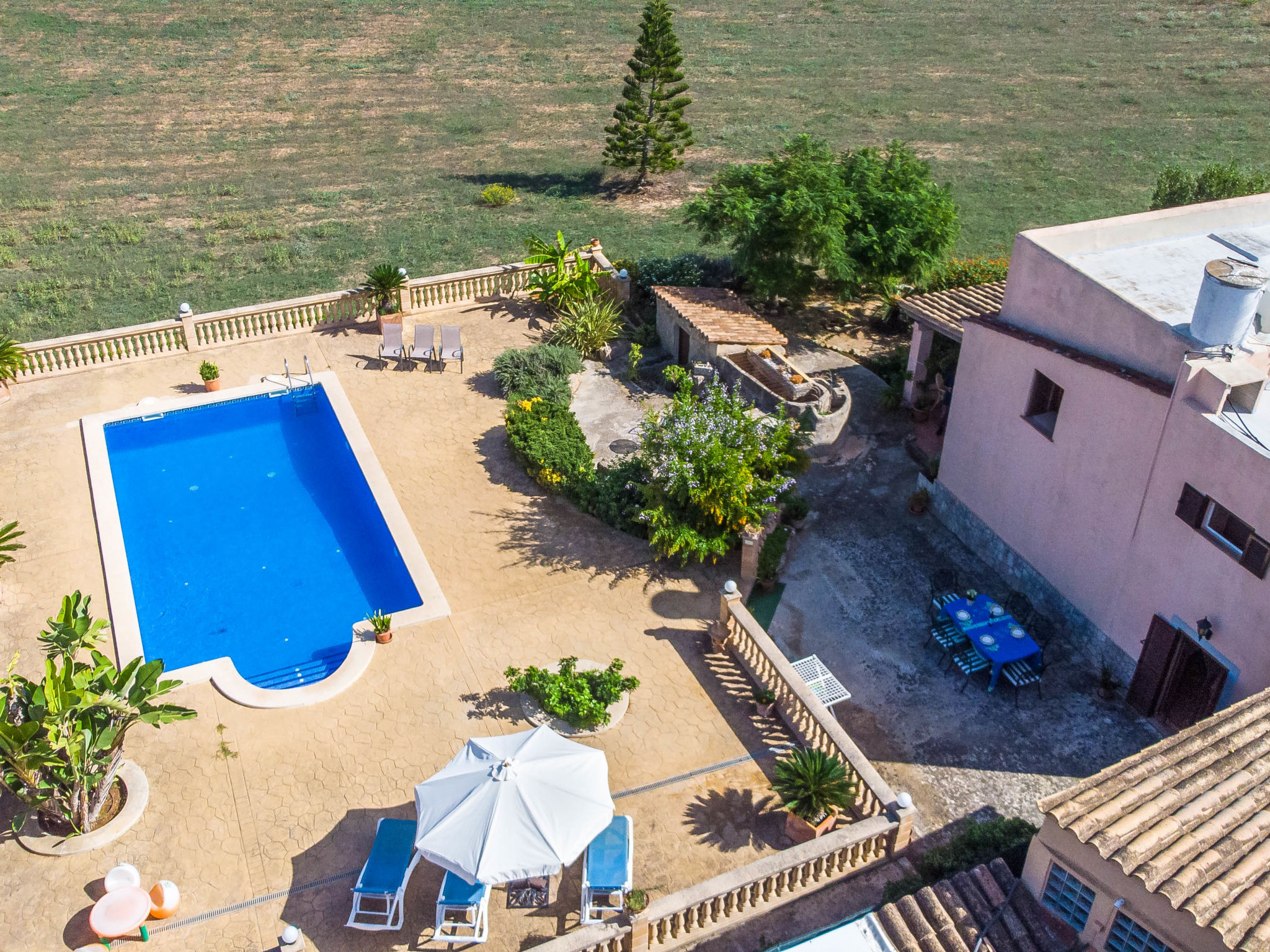 "Can Josepot", 4-Zimmer-Haus 130 m2 auf 2 Stockwerken. Objekt geeignet für 6 Erwachsene. Geräumig, renoviert, sehr zweckmässig und gemütlich eingerichtet: grosses Wohnzimmer mit offenem Kamin, Sat-TV, Digital-TV, Flachbildschirm und Ventilator. Ausgang zum Gartensitzplatz. 1 Doppelzimmer mit Panoramafenster mit 1 franz. Bett (150 cm, Länge 190 cm), Ventilator. Wohnküche (Backofen, 3 Glaskeramikherd Platten, Mikrowelle, Tiefkühler, elektrische Kaffeemaschine) mit Bar, Esstisch. Ausgang zum Gartensitzplatz, zum Schwimmbad. Bad/Bidet/WC. Obergeschoss: 1 Zimmer mit 1 Ausziehbett (2 Pers. 2 x 90 cm, Länge 190 cm), Klimaanlage und Warmluftheizung. 1 grosses Doppelzimmer mit 2 Betten (90 cm, Länge 190 cm), Klimaanlage und Warmluftheizung. Dusche/Bidet/WC. Terrasse 100 m2, kleine Terrasse 9 m2, grosser Garten. Terrassenmöbel, Gartengrill, Liegestühle (3), Loggia. Schöne Sicht auf die Berge und die Landschaft. Zur Verfügung: Waschmaschine, Wäschetrockner, Bügeleisen, Kinderhochstuhl, Babybett bis 2 Jahre, Haartrockner. Internet (Wireless LAN, gratis). Parkplatz (eingezäunt) beim Haus. Geeignet für Familien. 1 Haustier/Hund erlaubt. Das Badezimmer im 1. Stockwerk ist über die Aussenterrasse erreichbar. Zusätzlich: Deckenventilatoren, elektrische Heizungsradiatoren und 100 l Boiler. Klimaanlage ab März 2020 vorhanden. ETV3456