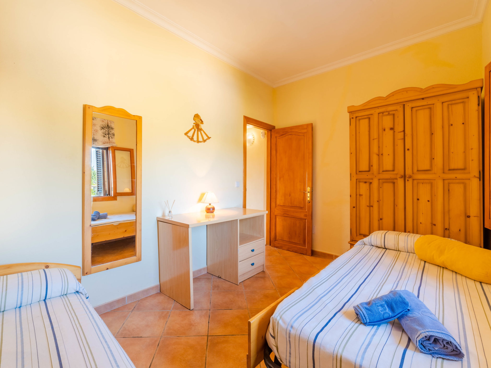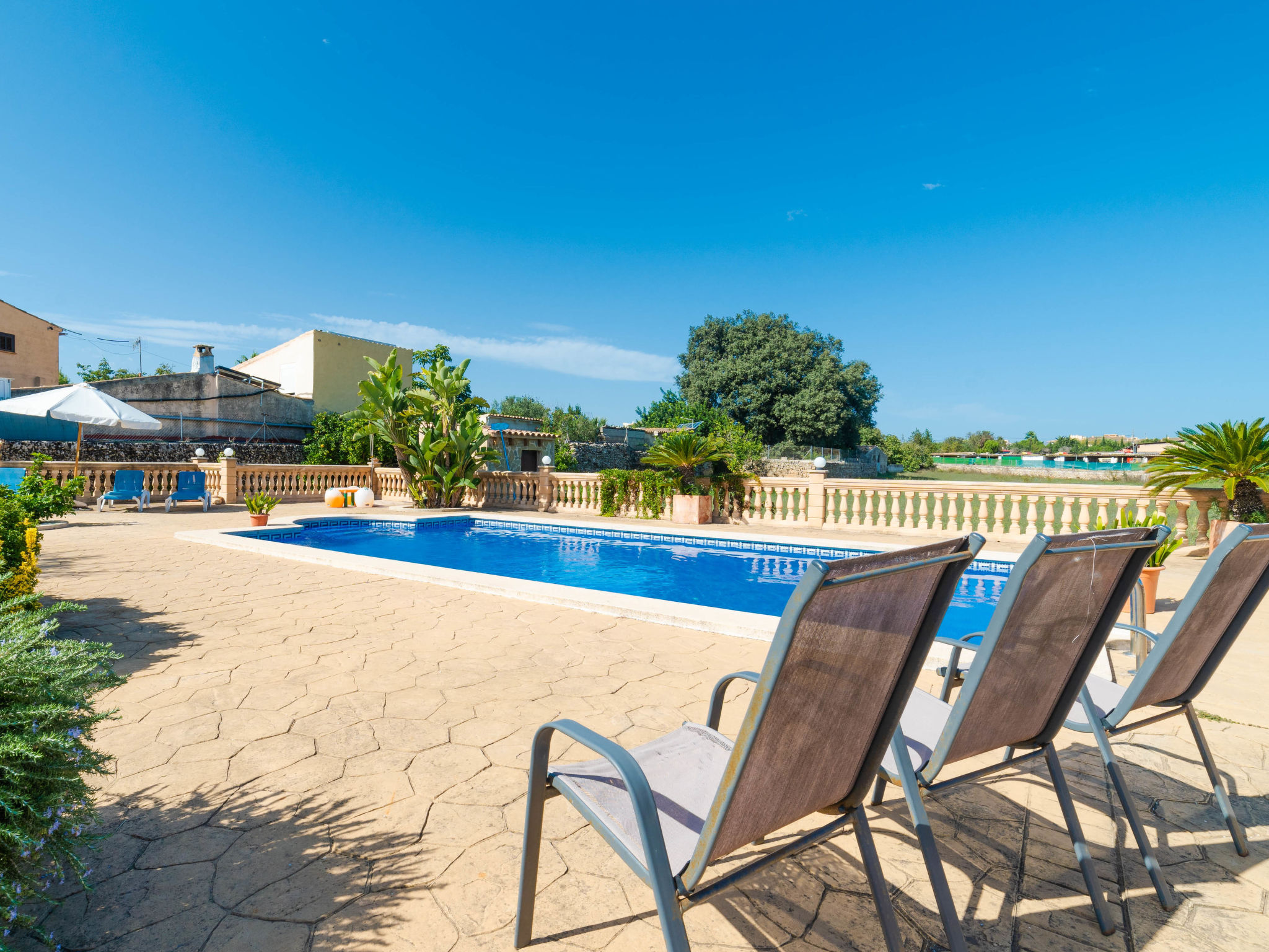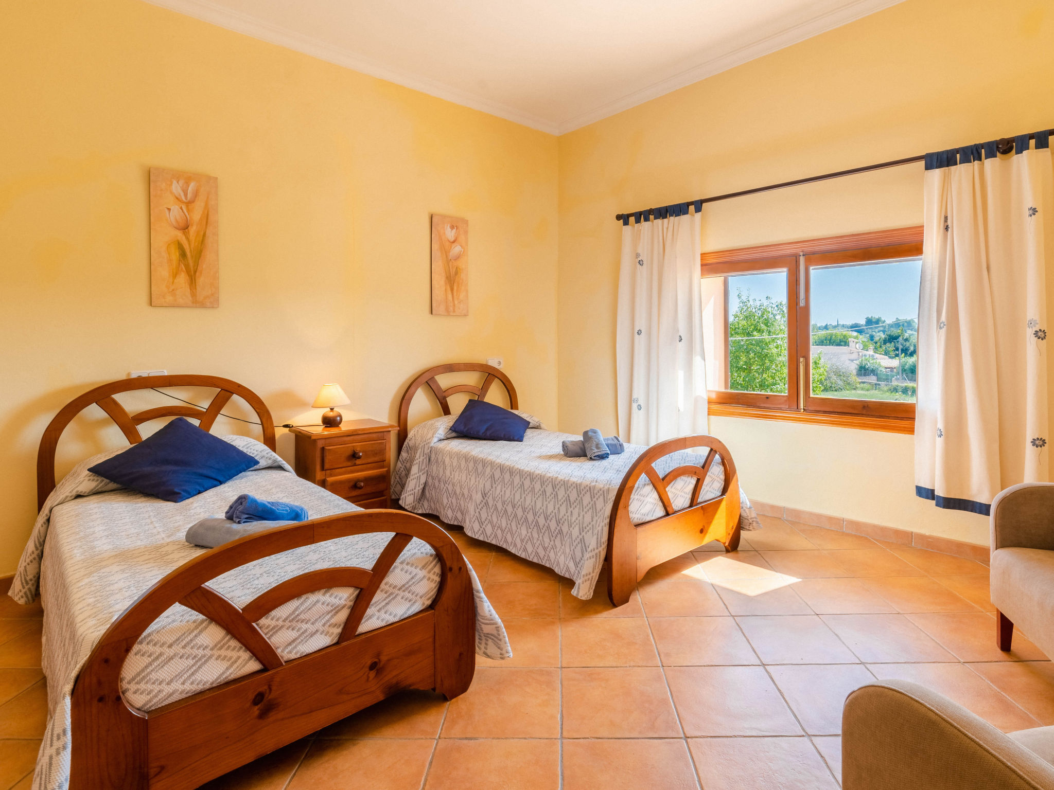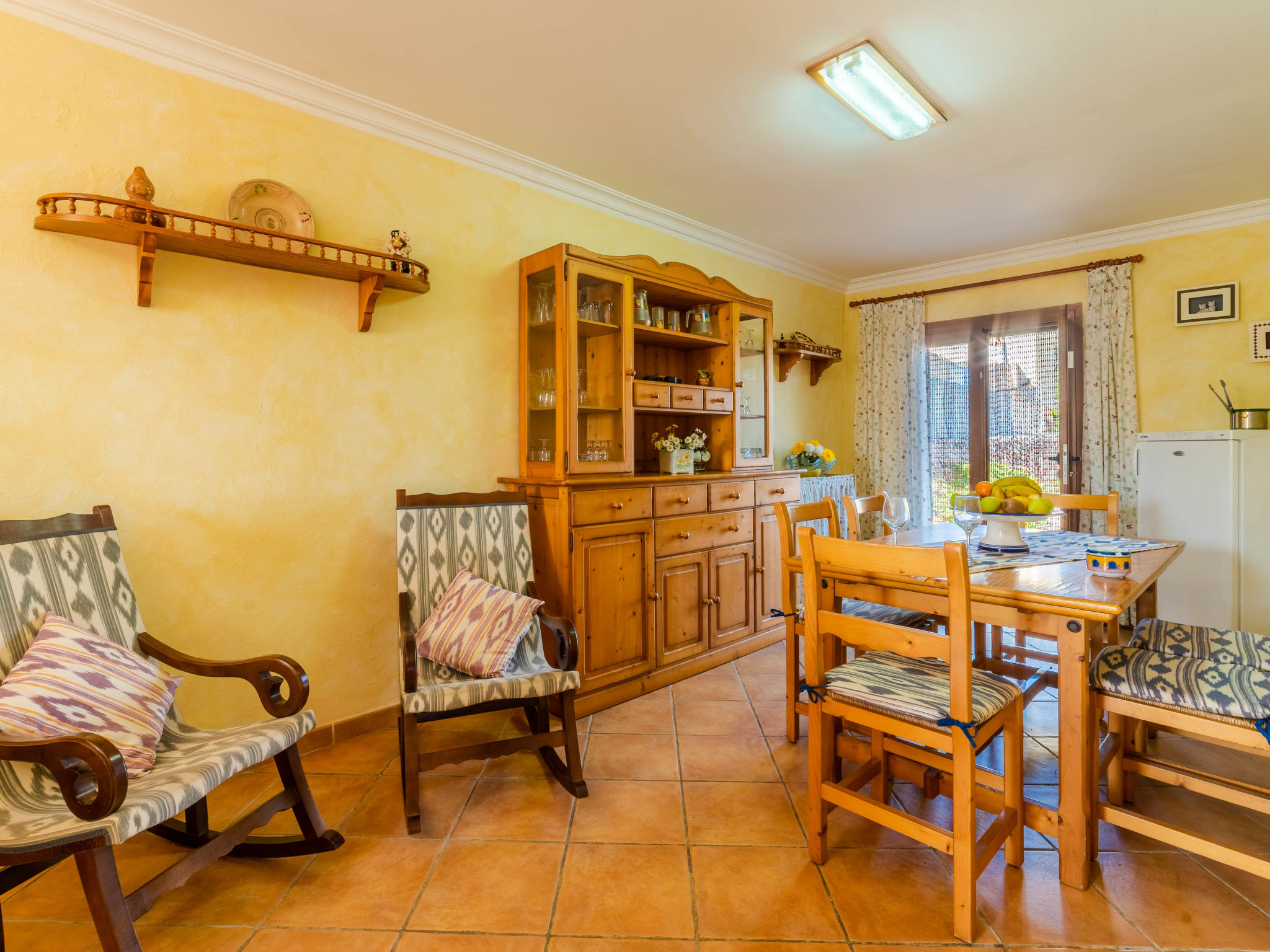 "Can Josepot", 4-Zimmer-Haus 130 m2 auf 2 Stockwerken. Objekt geeignet für 6 Erwachsene. Geräumig, renoviert, sehr zweckmässig und gemütlich eingerichtet: grosses Wohnzimmer mit offenem Kamin, Sat-TV, Digital-TV, Flachbildschirm und Ventilator. Ausgang zum Gartensitzplatz. 1 Doppelzimmer mit Panoramafenster mit 1 franz. Bett (150 cm, Länge 190 cm), Ventilator. Wohnküche (Backofen, 3 Glaskeramikherd Platten, Mikrowelle, Tiefkühler, elektrische Kaffeemaschine) mit Bar, Esstisch. Ausgang zum Gartensitzplatz, zum Schwimmbad. Bad/Bidet/WC. Obergeschoss: 1 Zimmer mit 1 Ausziehbett (2 Pers. 2 x 90 cm, Länge 190 cm), Klimaanlage und Warmluftheizung. 1 grosses Doppelzimmer mit 2 Betten (90 cm, Länge 190 cm), Klimaanlage und Warmluftheizung. Dusche/Bidet/WC. Terrasse 100 m2, kleine Terrasse 9 m2, grosser Garten. Terrassenmöbel, Gartengrill, Liegestühle (3), Loggia. Schöne Sicht auf die Berge und die Landschaft. Zur Verfügung: Waschmaschine, Wäschetrockner, Bügeleisen, Kinderhochstuhl, Babybett bis 2 Jahre, Haartrockner. Internet (Wireless LAN, gratis). Parkplatz (eingezäunt) beim Haus. Geeignet für Familien. 1 Haustier/Hund erlaubt. Das Badezimmer im 1. Stockwerk ist über die Aussenterrasse erreichbar. Zusätzlich: Deckenventilatoren, elektrische Heizungsradiatoren und 100 l Boiler. Klimaanlage ab März 2020 vorhanden. ETV3456