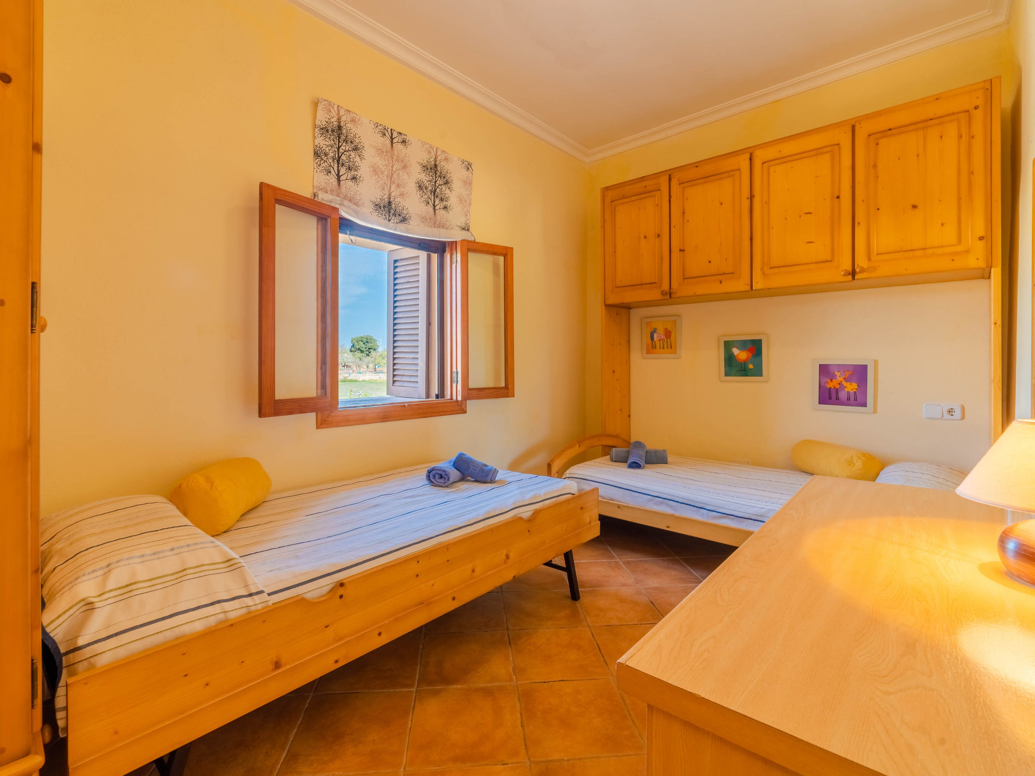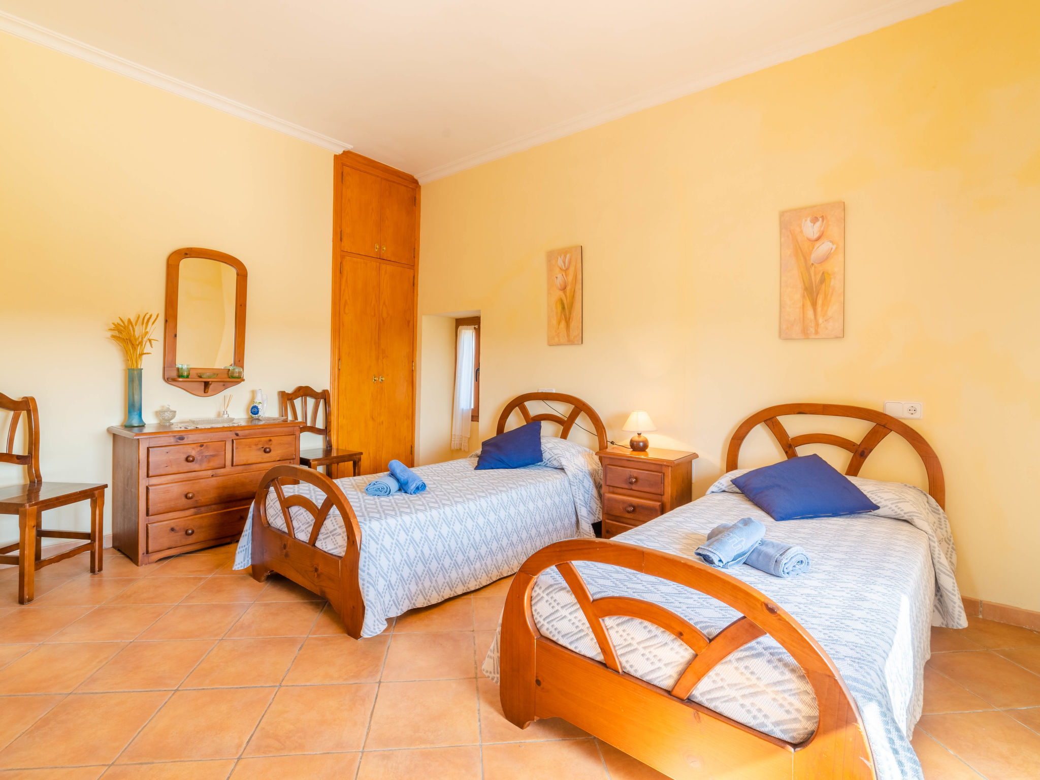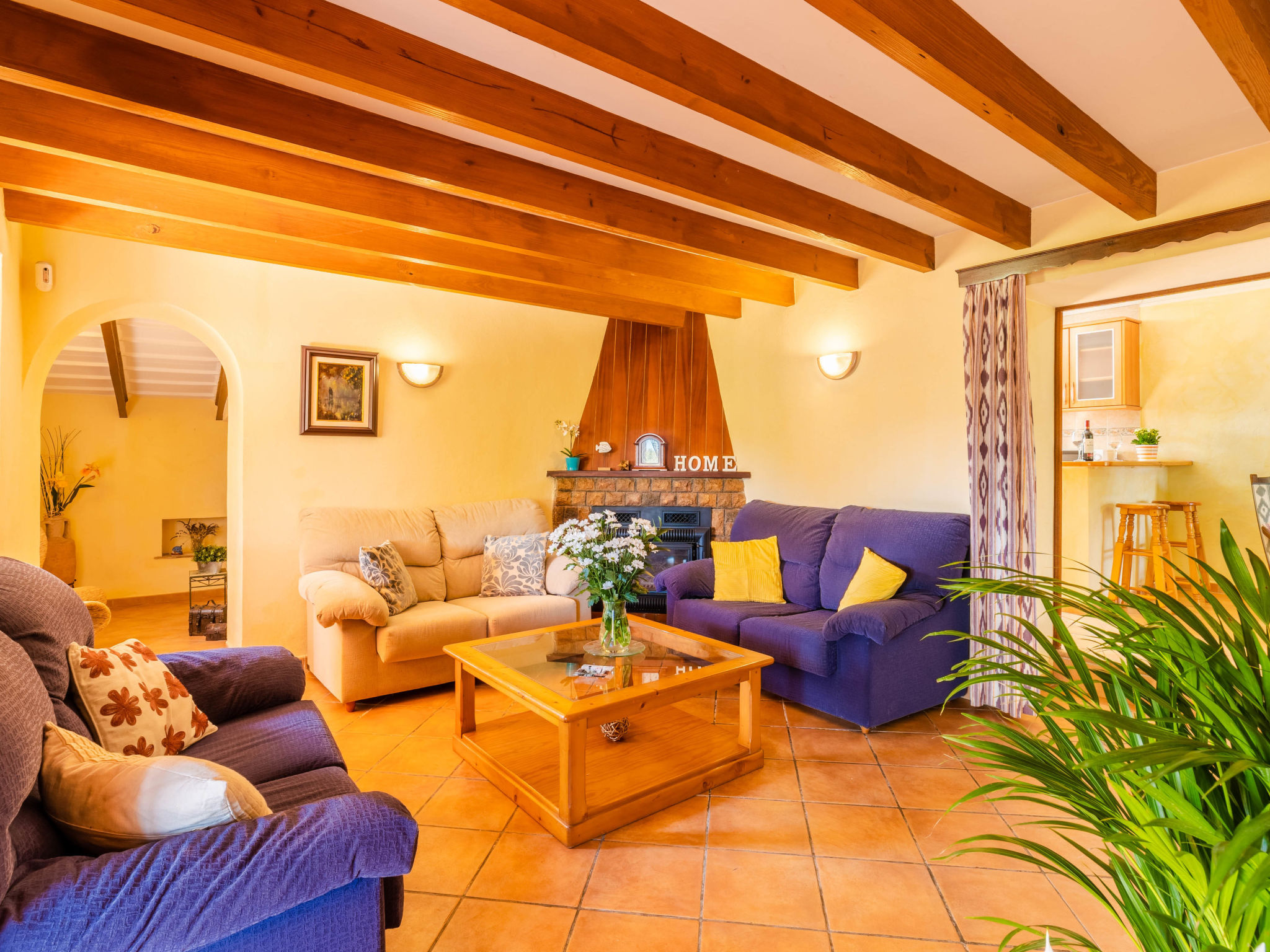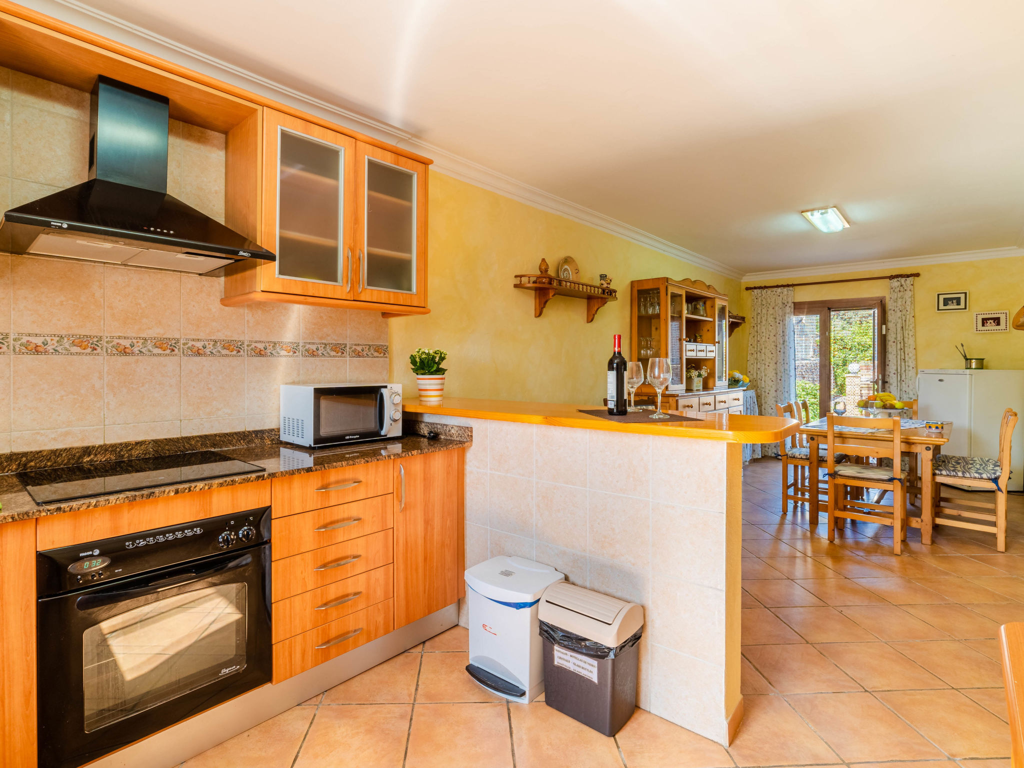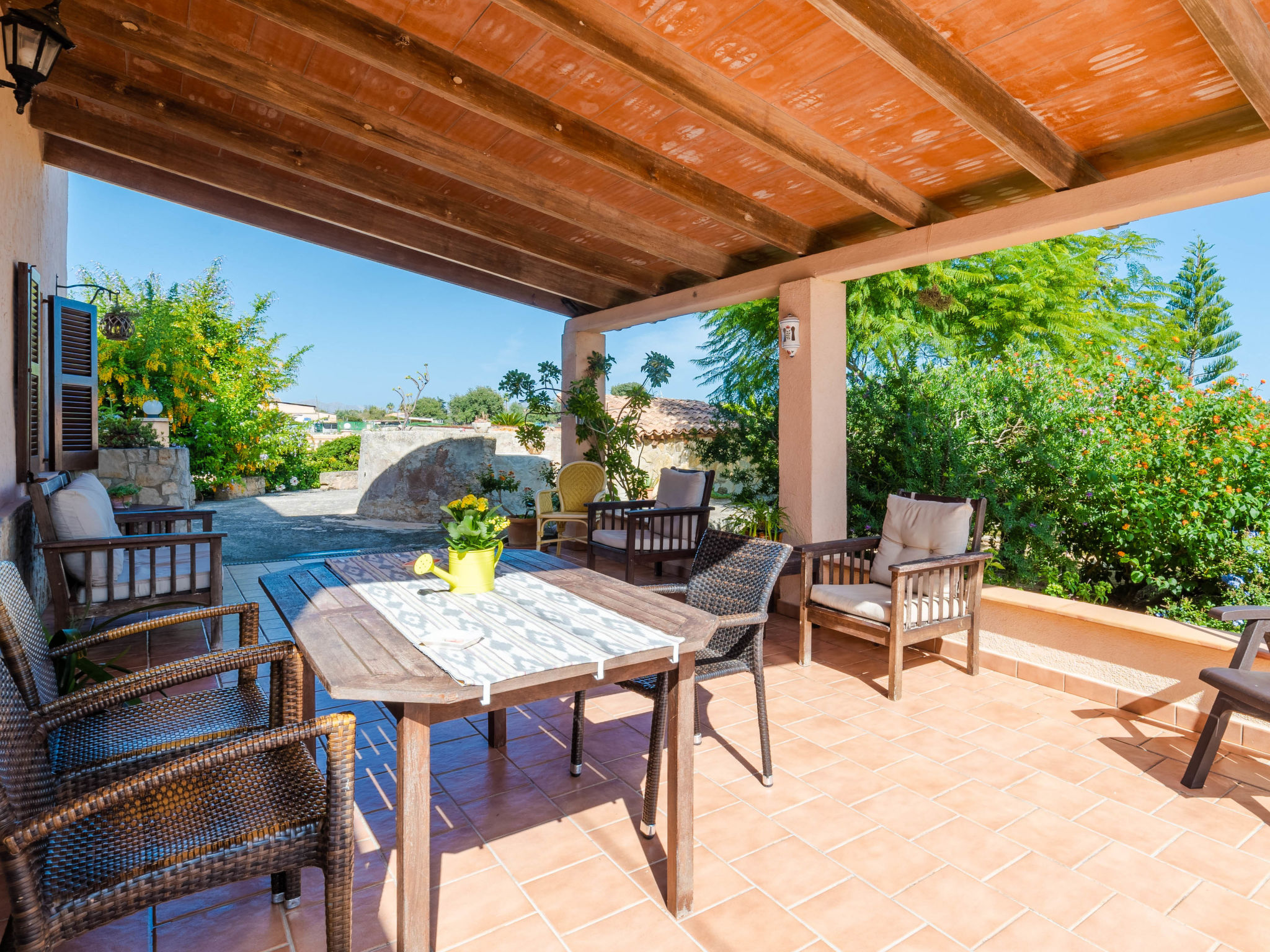"Can Josepot", 4-Zimmer-Haus 130 m2 auf 2 Stockwerken. Objekt geeignet für 6 Erwachsene. Geräumig, renoviert, sehr zweckmässig und gemütlich eingerichtet: grosses Wohnzimmer mit offenem Kamin, Sat-TV, Digital-TV, Flachbildschirm und Ventilator. Ausgang zum Gartensitzplatz. 1 Doppelzimmer mit Panoramafenster mit 1 franz. Bett (150 cm, Länge 190 cm), Ventilator. Wohnküche (Backofen, 3 Glaskeramikherd Platten, Mikrowelle, Tiefkühler, elektrische Kaffeemaschine) mit Bar, Esstisch. Ausgang zum Gartensitzplatz, zum Schwimmbad. Bad/Bidet/WC. Obergeschoss: 1 Zimmer mit 1 Ausziehbett (2 Pers. 2 x 90 cm, Länge 190 cm), Klimaanlage und Warmluftheizung. 1 grosses Doppelzimmer mit 2 Betten (90 cm, Länge 190 cm), Klimaanlage und Warmluftheizung. Dusche/Bidet/WC. Terrasse 100 m2, kleine Terrasse 9 m2, grosser Garten. Terrassenmöbel, Gartengrill, Liegestühle (3), Loggia. Schöne Sicht auf die Berge und die Landschaft. Zur Verfügung: Waschmaschine, Wäschetrockner, Bügeleisen, Kinderhochstuhl, Babybett bis 2 Jahre, Haartrockner. Internet (Wireless LAN, gratis). Parkplatz (eingezäunt) beim Haus. Geeignet für Familien. 1 Haustier/Hund erlaubt. Das Badezimmer im 1. Stockwerk ist über die Aussenterrasse erreichbar. Zusätzlich: Deckenventilatoren, elektrische Heizungsradiatoren und 100 l Boiler. Klimaanlage ab März 2020 vorhanden. ETV3456