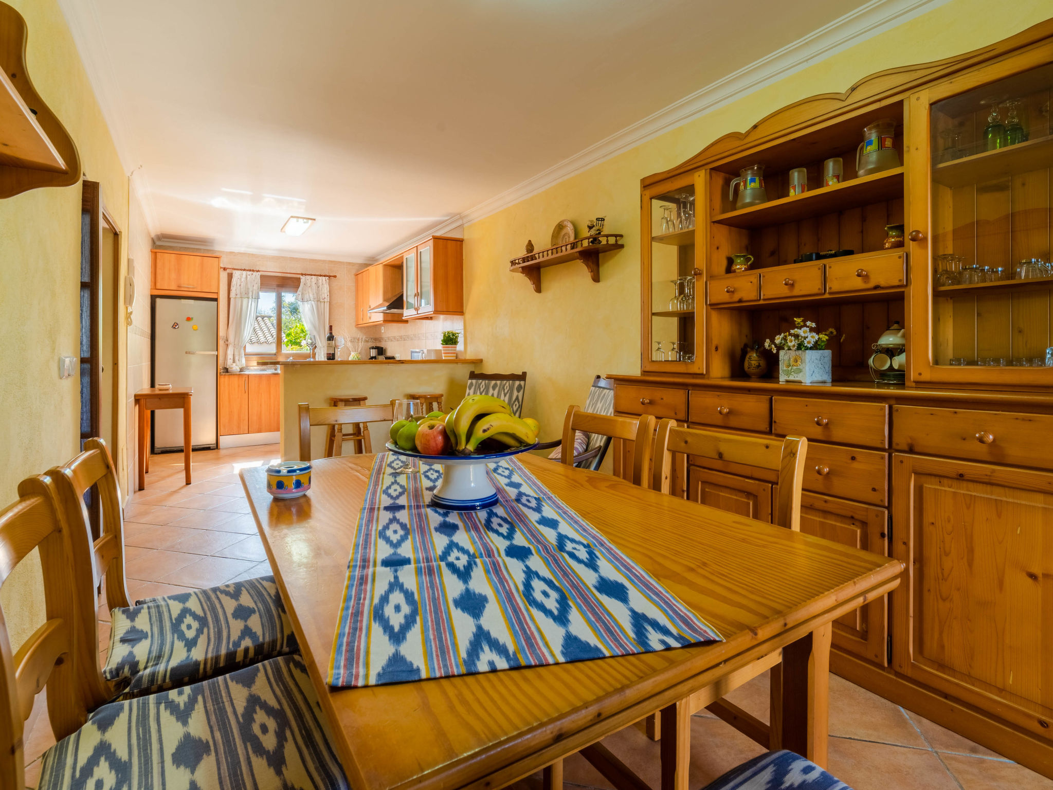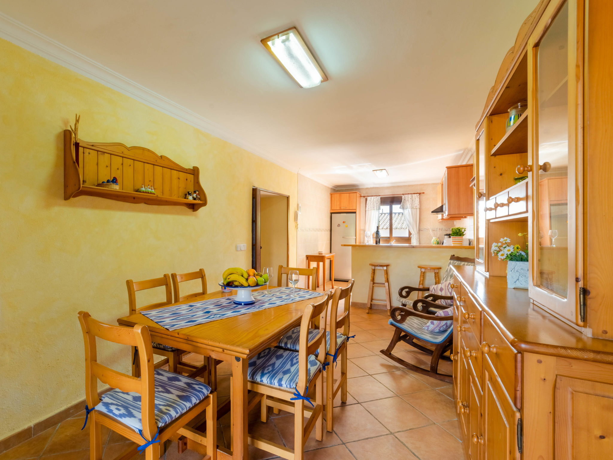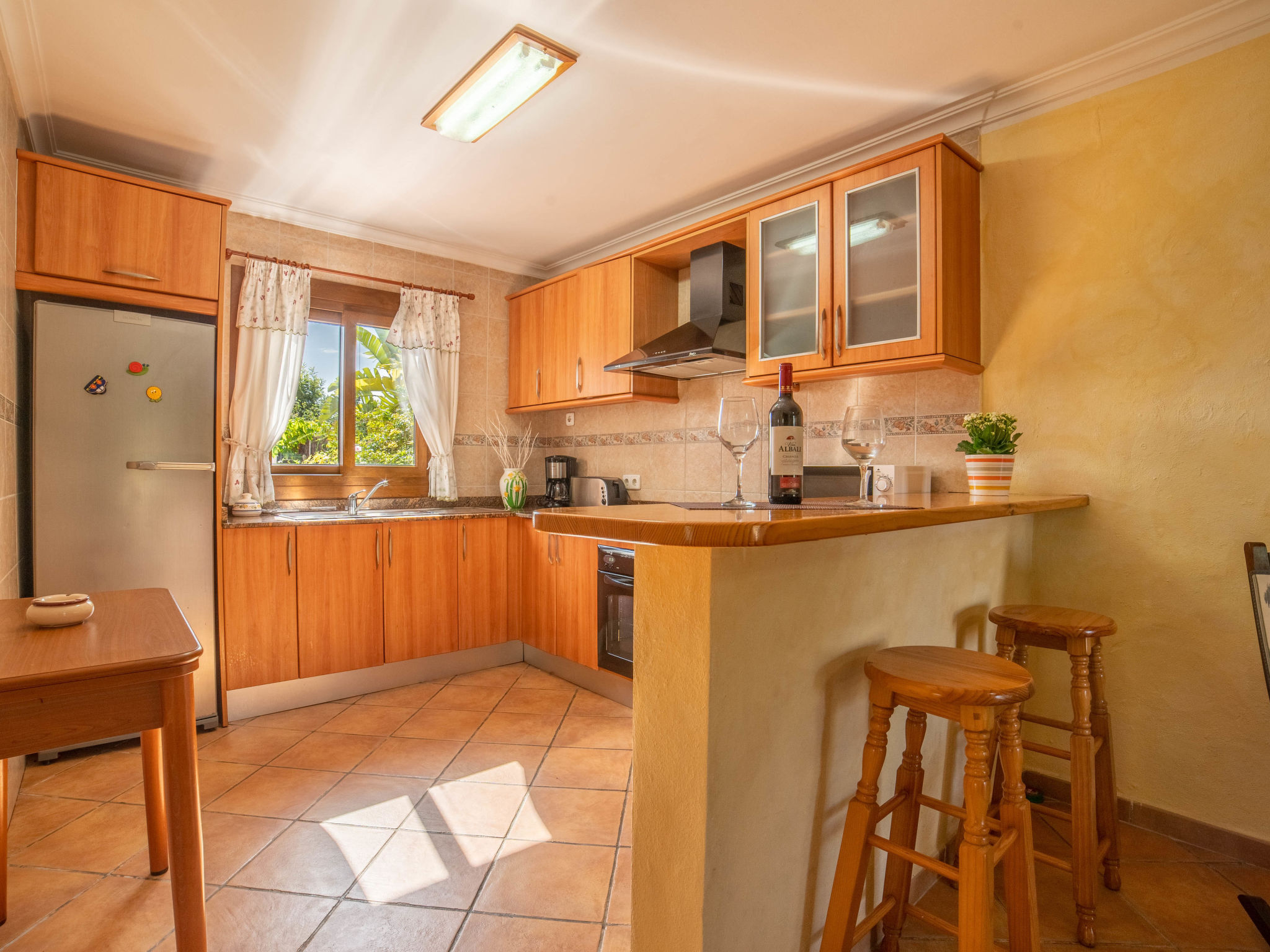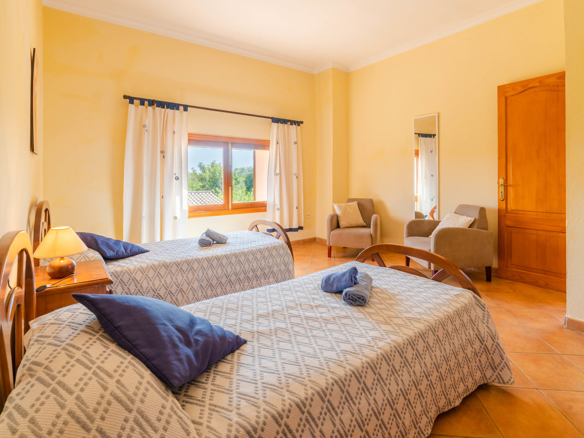 "Can Josepot", 4-Zimmer-Haus 130 m2 auf 2 Stockwerken. Objekt geeignet für 6 Erwachsene. Geräumig, renoviert, sehr zweckmässig und gemütlich eingerichtet: grosses Wohnzimmer mit offenem Kamin, Sat-TV, Digital-TV, Flachbildschirm und Ventilator. Ausgang zum Gartensitzplatz. 1 Doppelzimmer mit Panoramafenster mit 1 franz. Bett (150 cm, Länge 190 cm), Ventilator. Wohnküche (Backofen, 3 Glaskeramikherd Platten, Mikrowelle, Tiefkühler, elektrische Kaffeemaschine) mit Bar, Esstisch. Ausgang zum Gartensitzplatz, zum Schwimmbad. Bad/Bidet/WC. Obergeschoss: 1 Zimmer mit 1 Ausziehbett (2 Pers. 2 x 90 cm, Länge 190 cm), Klimaanlage und Warmluftheizung. 1 grosses Doppelzimmer mit 2 Betten (90 cm, Länge 190 cm), Klimaanlage und Warmluftheizung. Dusche/Bidet/WC. Terrasse 100 m2, kleine Terrasse 9 m2, grosser Garten. Terrassenmöbel, Gartengrill, Liegestühle (3), Loggia. Schöne Sicht auf die Berge und die Landschaft. Zur Verfügung: Waschmaschine, Wäschetrockner, Bügeleisen, Kinderhochstuhl, Babybett bis 2 Jahre, Haartrockner. Internet (Wireless LAN, gratis). Parkplatz (eingezäunt) beim Haus. Geeignet für Familien. 1 Haustier/Hund erlaubt. Das Badezimmer im 1. Stockwerk ist über die Aussenterrasse erreichbar. Zusätzlich: Deckenventilatoren, elektrische Heizungsradiatoren und 100 l Boiler. Klimaanlage ab März 2020 vorhanden. ETV3456