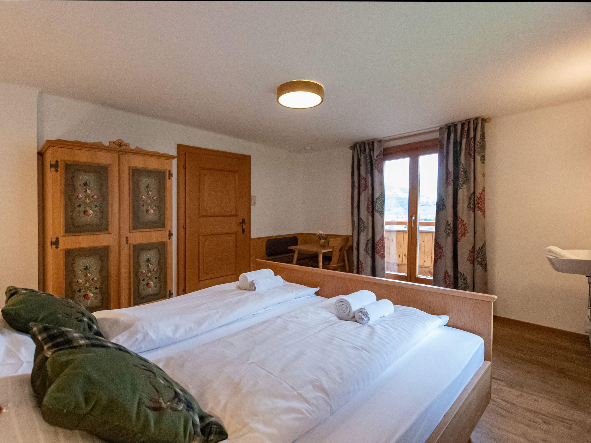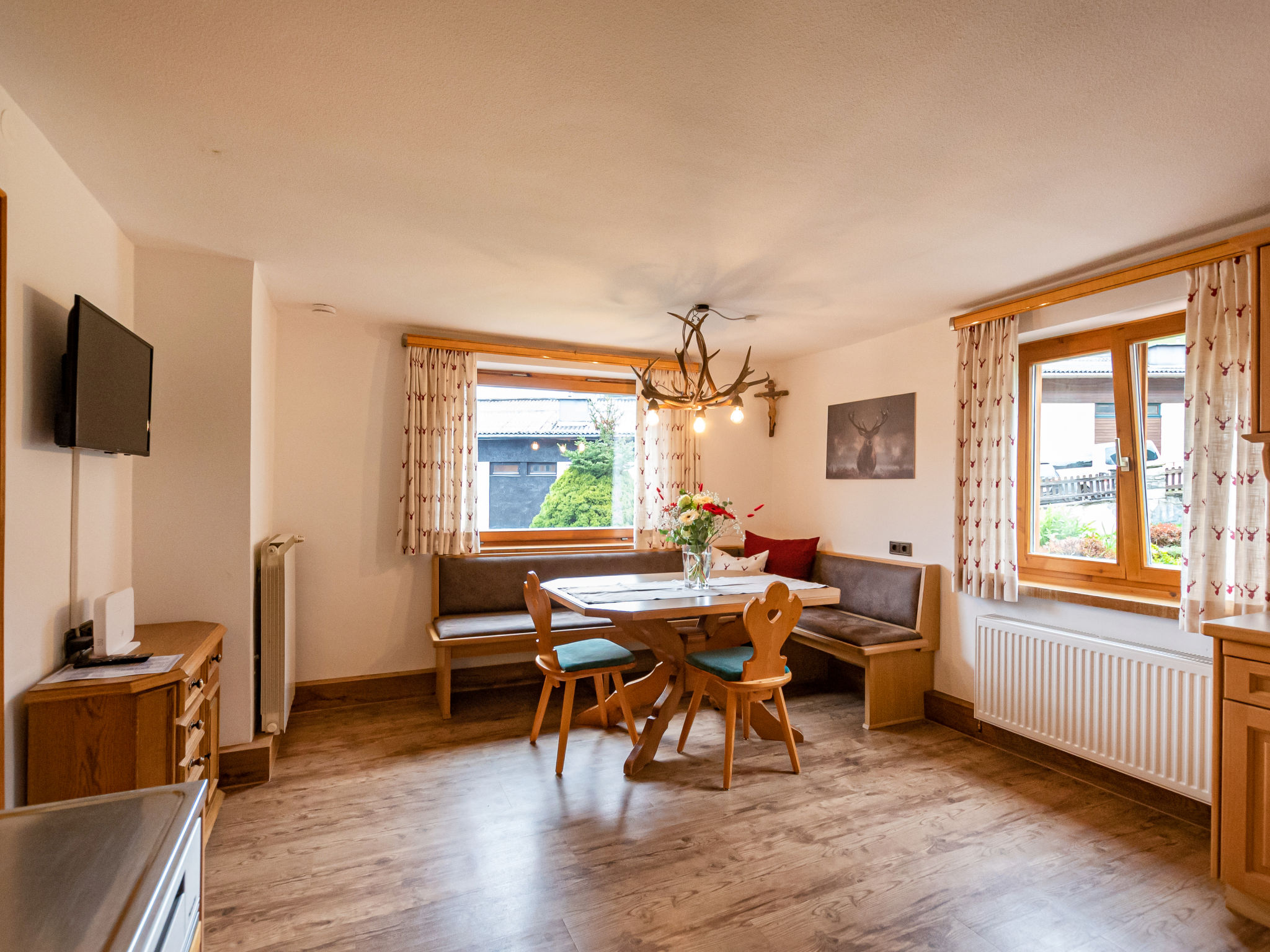 "Haus Weickl", 5-Zimmer-Haus auf 2 Stockwerken. Geräumig, vollständig renoviert im Jahre 2021, gemütlich und mit viel Holz eingerichtet: Eingang. Wohnzimmer mit Sat-TV. Küche (Backofen, 4 Glaskeramikherd Platten, Tiefkühler, elektrische Kaffeemaschine) mit Essecke und Sat-TV. Dusche, sep. WC. Obergeschoss: 2 Doppelzimmer. Ausgang zum Balkon. 1 Zimmer mit 1 Bett. Ausgang zum Balkon. Sep. WC. Balkon. Balkonmöbel. Schöne Sicht auf die Berge. Zur Verfügung: Internet (Wireless LAN, gratis). Bitte beachten: Nichtraucher-Haus. 1 Haustier/Hund erlaubt. 50606-006992-2020
