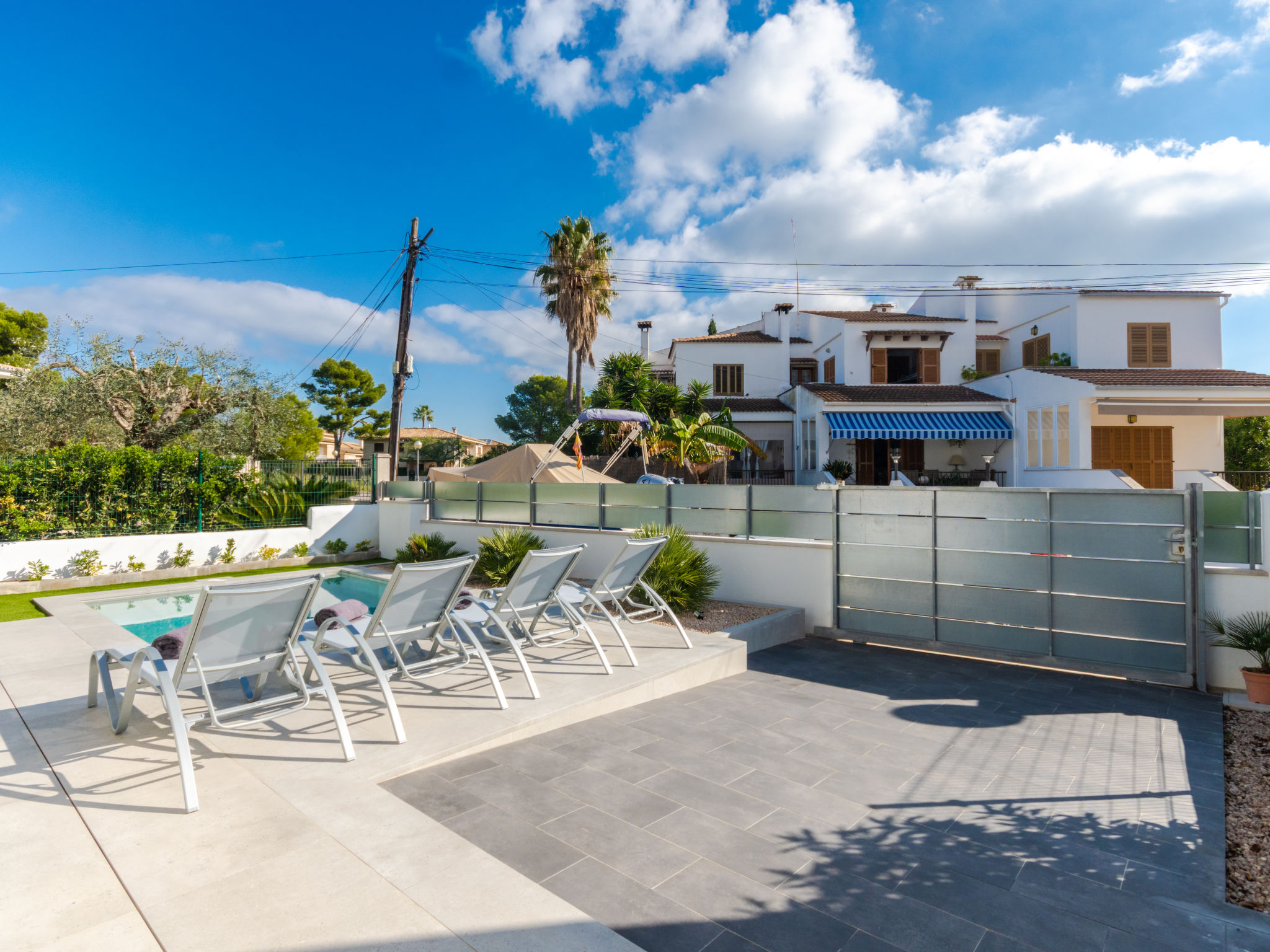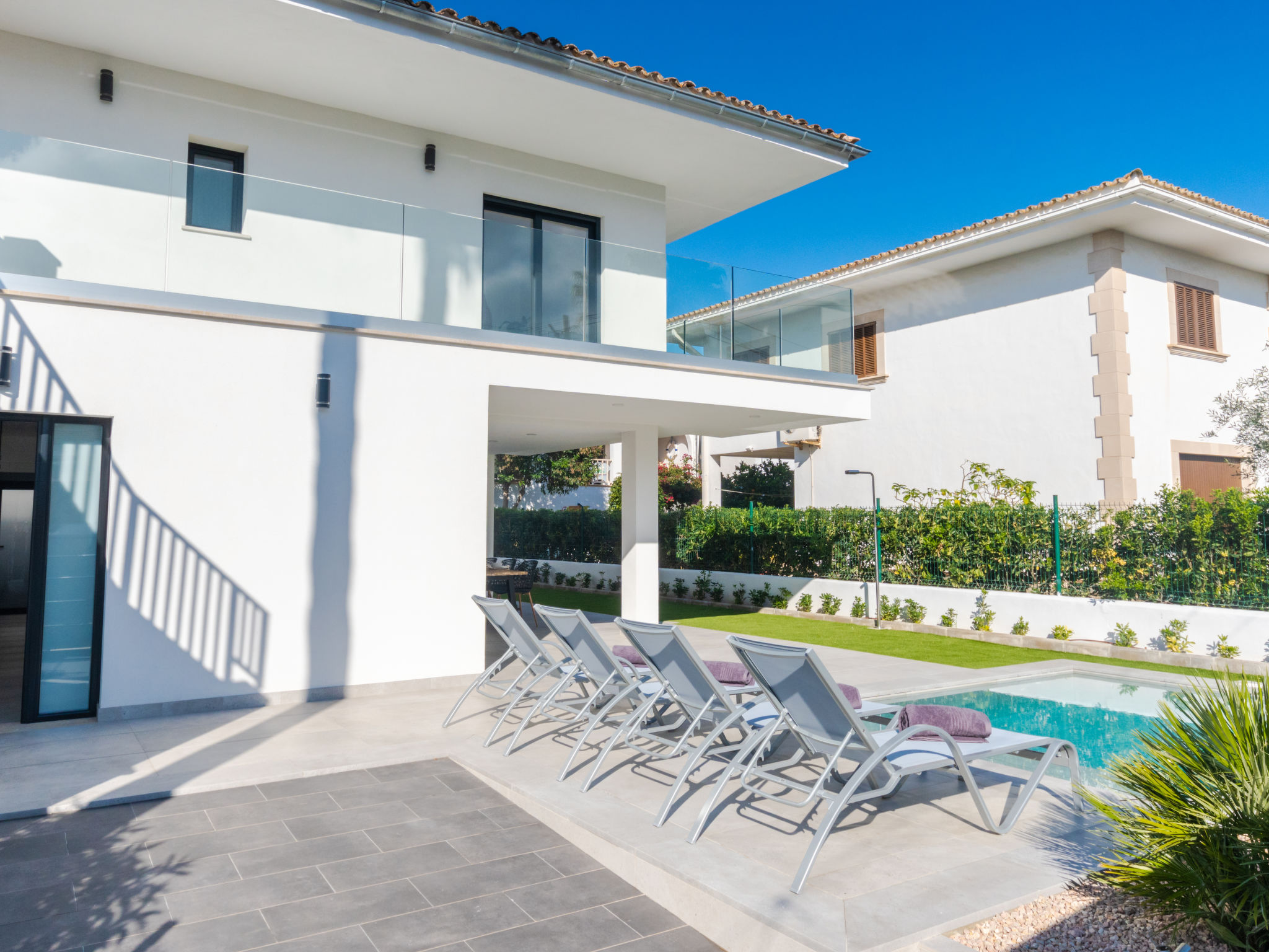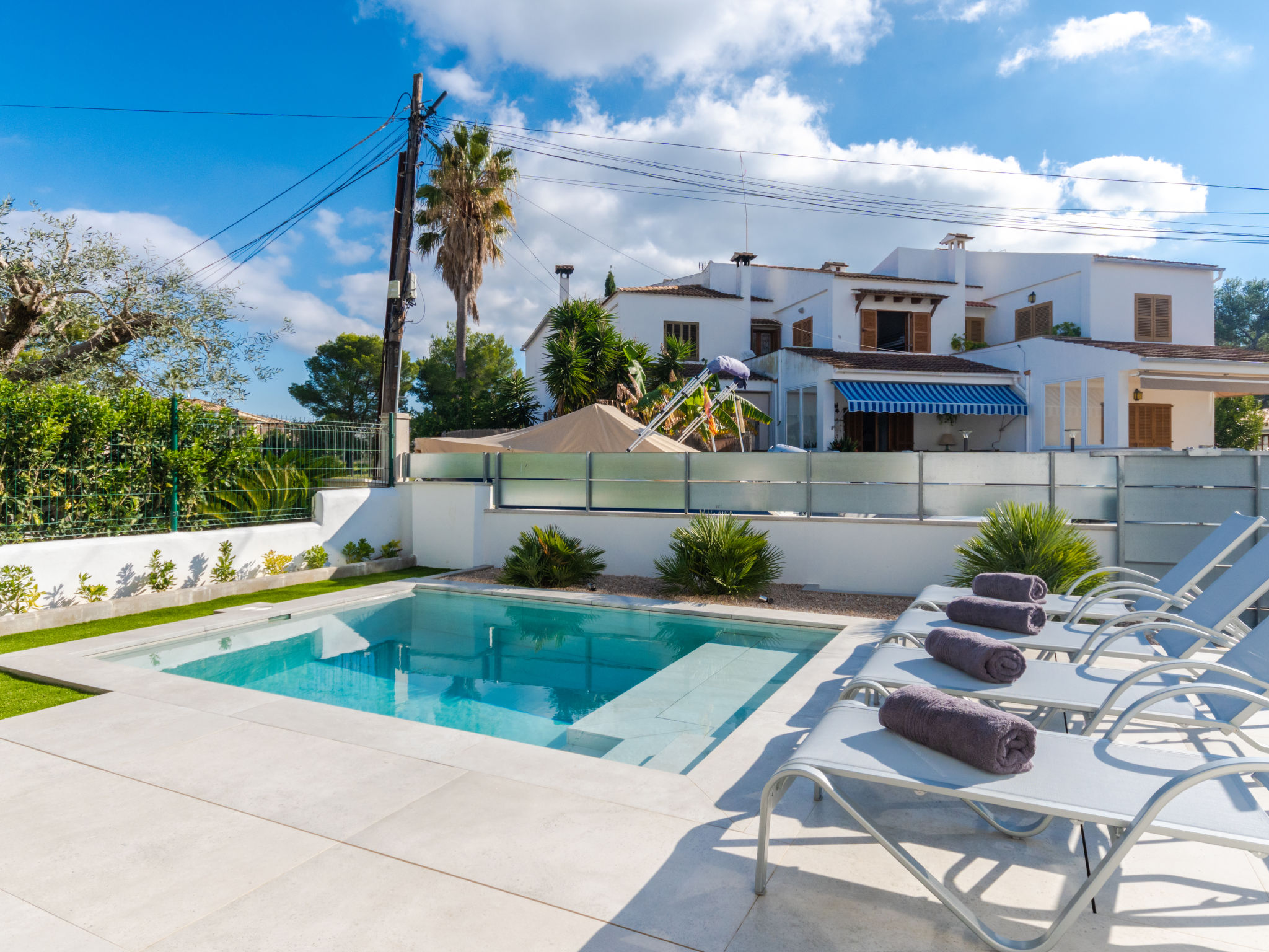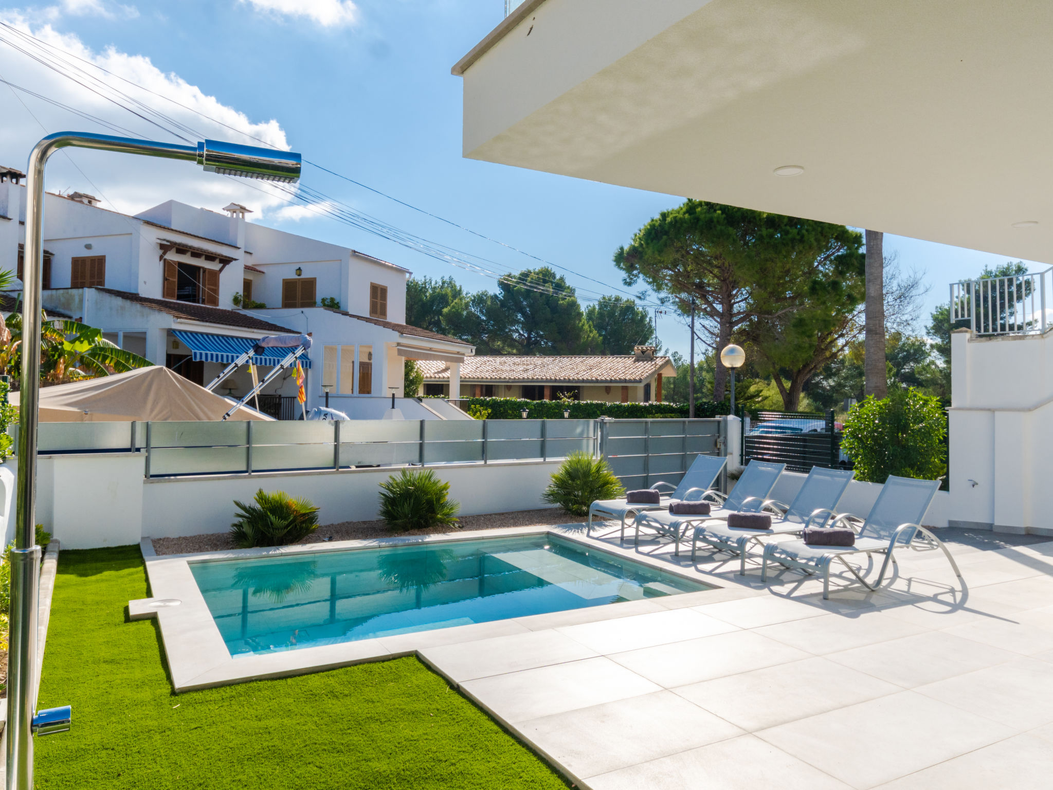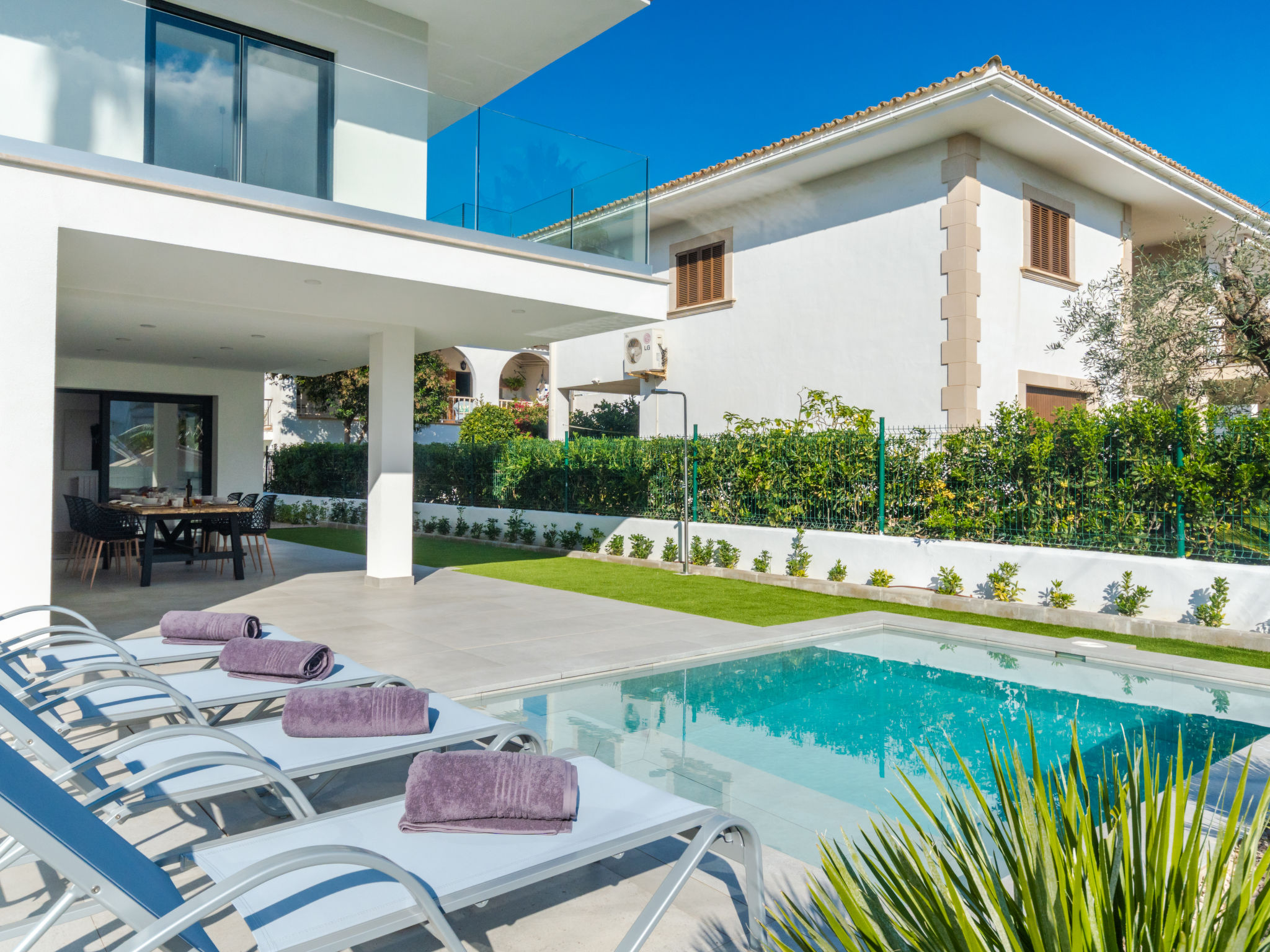 Barcares 1 km von Alcúdia: Modernes, sehr komfortables Doppelhaus "Ca na Cati", auf 2 Stockwerken, einseitig angebaut, Baujahr 2020. Im Ortsteil Barcarés, ruhige Lage im Villenviertel, 2 km vom Waldrand, 200 m vom Meer, 350 m vom Strand. Zur Alleinbenutzung: Garten mit Pflanzen, Hof, Schwimmbad eckig (4 x 3 m, 50 - 160 cm tief, 01.01.-31.12.) mit Salzelektrolyse-Reinigungssystem. Aussendusche, Sitzplatz, Laube, Pergola, Gartenmöbel, Grill, Poolpflege durch den Besitzer/Gärtner. Im Hause: Internetzugang, Wireless LAN, Einstellraum für Fahrräder, Zentralheizung, Klimaanlage, Waschmaschine, Wäschetrockner. Parkplatz beim Haus auf dem Grundstück. Einkaufsgeschäft 1 km, Lebensmittelgeschäft 1 km, Supermarkt 1.2 km, Restaurant, Bar 950 m, Bäckerei 1.2 km, Fußgängerzone 500 m, Fahrradverleih 1 km, Biergarten 950 m, Zentrum zu Fuss in 15 Minuten erreichbar, Bushaltestelle 1 km, Sandstrand "Es Morer Vermell" 1 km, Kieselstrand "Sa Marina" 350 m, Steinstrand "Barcares" 350 m, Badebucht 250 m. Sporthafen 3 km, Jacht-Hafen 3 km, Golfplatz (18 Loch) 5 km, Surfschule 1 km, Tennis 2 km, Reitstall 2.5 km, Sportzentrum 200 m, Wanderwege ab Haus, Radweg 500 m. Nahe gelegene Sehenswürdigkeiten: Ciudad Romana de Alcúdia. 1 km, Port de Pollença - Pollença 4 km, Puerto de Alcúdia 3 km, Serra de Tramuntana, Playa / Faro de Formentor. Wandergebiete: S'Albufera d'Alcúdia, Ermita de la Victoria - s'Atalaia d'Alcú, Puig de Sant Martí. Bitte beachten: geeignet für Familien, geeignet für Senioren. Objekt geeignet für 6 Erwachsene. Der Besitzer akzeptiert keine Jugendgruppen. Flugplatz 50 km vom Haus. Die Nachbarschaft ist sehr lärmempfindlich. Ruhe und gutes Benehmen wird erwartet.