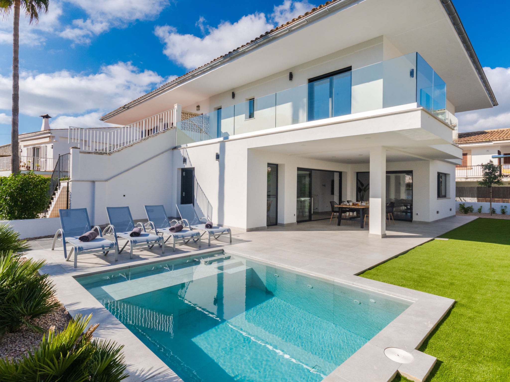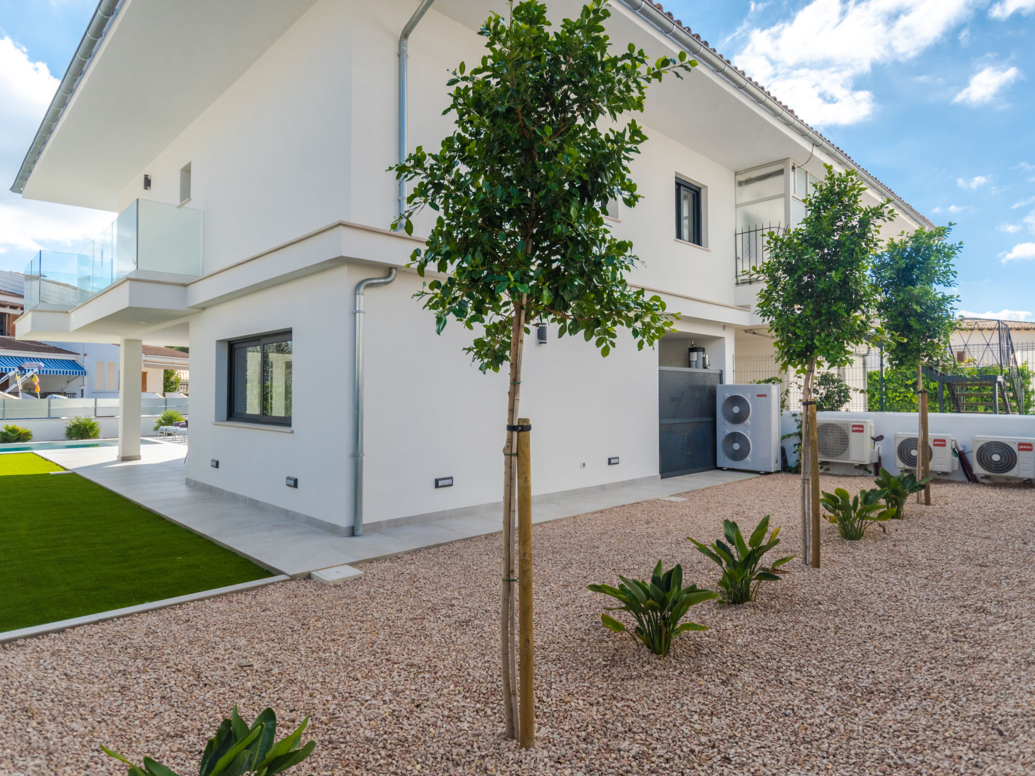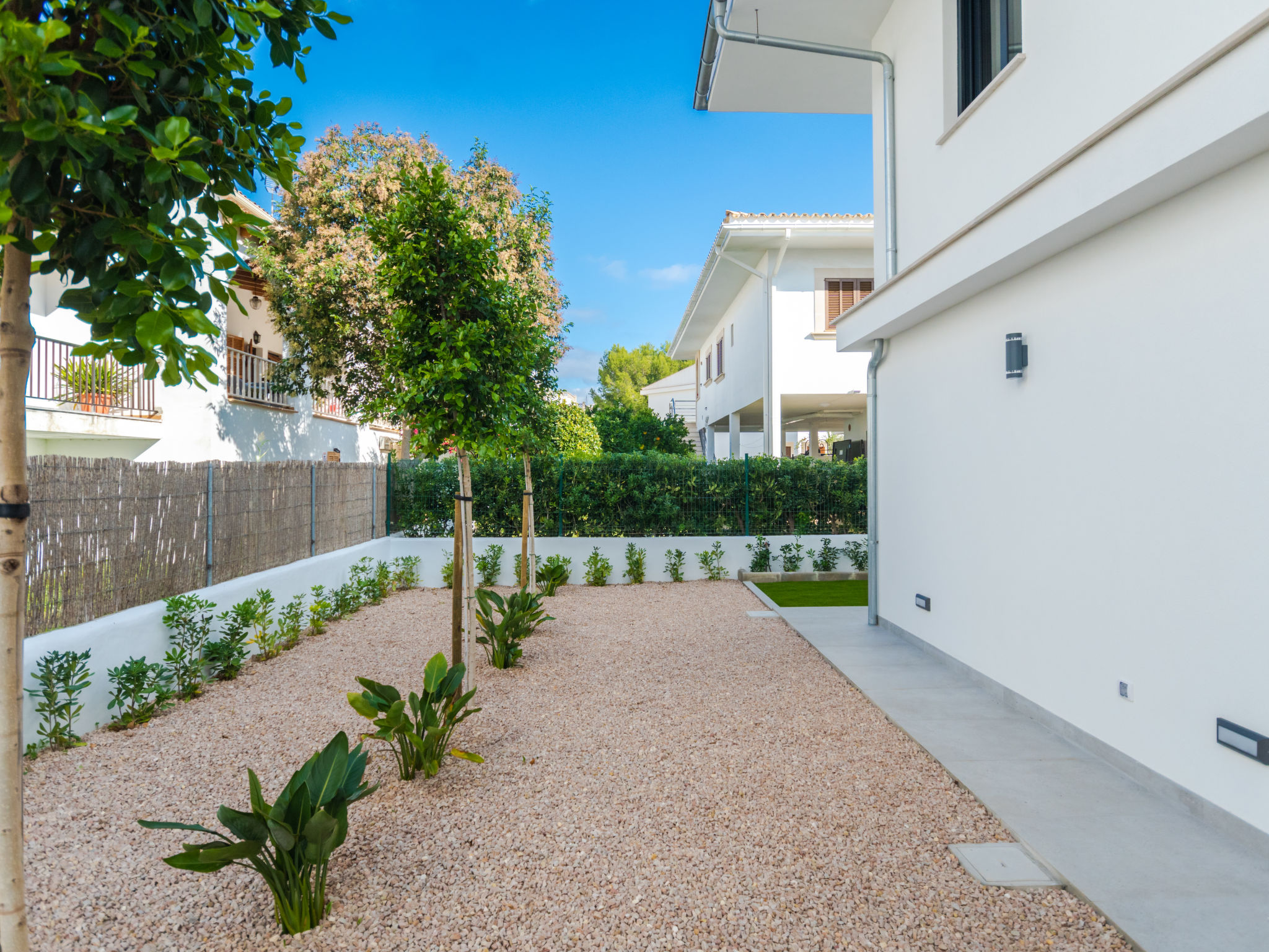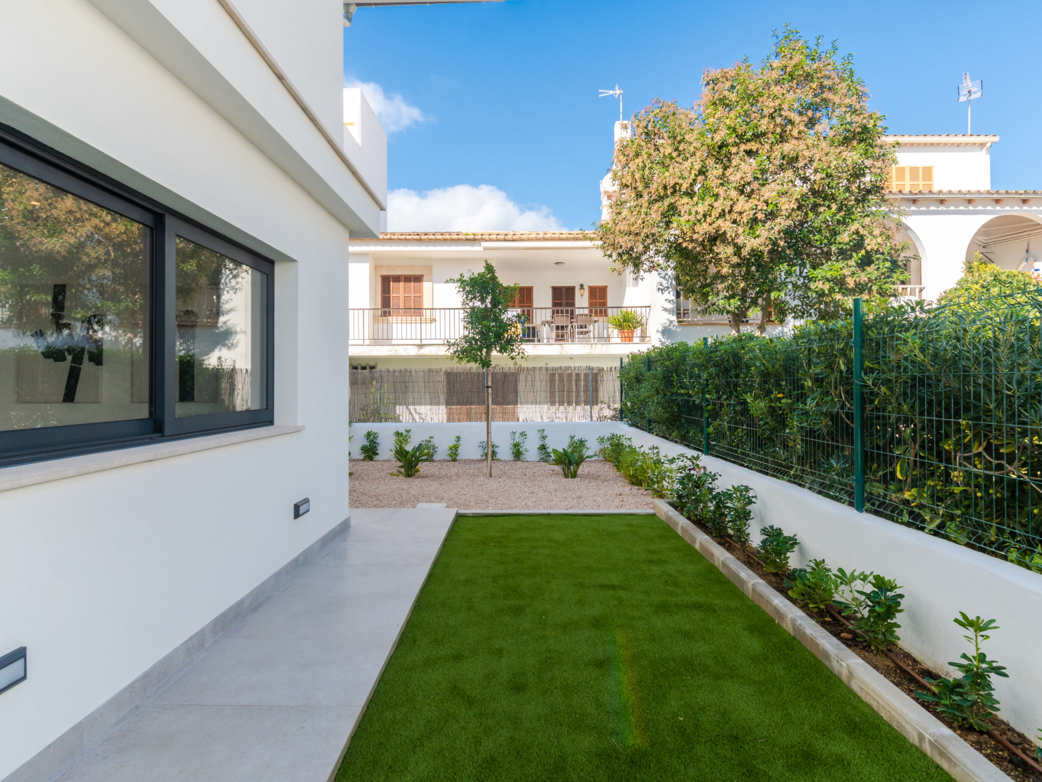 Barcares 1 km von Alcúdia: Modernes, sehr komfortables Doppelhaus "Ca na Cati", auf 2 Stockwerken, einseitig angebaut, Baujahr 2020. Im Ortsteil Barcarés, ruhige Lage im Villenviertel, 2 km vom Waldrand, 200 m vom Meer, 350 m vom Strand. Zur Alleinbenutzung: Garten mit Pflanzen, Hof, Schwimmbad eckig (4 x 3 m, 50 - 160 cm tief, 01.01.-31.12.) mit Salzelektrolyse-Reinigungssystem. Aussendusche, Sitzplatz, Laube, Pergola, Gartenmöbel, Grill, Poolpflege durch den Besitzer/Gärtner. Im Hause: Internetzugang, Wireless LAN, Einstellraum für Fahrräder, Zentralheizung, Klimaanlage, Waschmaschine, Wäschetrockner. Parkplatz beim Haus auf dem Grundstück. Einkaufsgeschäft 1 km, Lebensmittelgeschäft 1 km, Supermarkt 1.2 km, Restaurant, Bar 950 m, Bäckerei 1.2 km, Fußgängerzone 500 m, Fahrradverleih 1 km, Biergarten 950 m, Zentrum zu Fuss in 15 Minuten erreichbar, Bushaltestelle 1 km, Sandstrand "Es Morer Vermell" 1 km, Kieselstrand "Sa Marina" 350 m, Steinstrand "Barcares" 350 m, Badebucht 250 m. Sporthafen 3 km, Jacht-Hafen 3 km, Golfplatz (18 Loch) 5 km, Surfschule 1 km, Tennis 2 km, Reitstall 2.5 km, Sportzentrum 200 m, Wanderwege ab Haus, Radweg 500 m. Nahe gelegene Sehenswürdigkeiten: Ciudad Romana de Alcúdia. 1 km, Port de Pollença - Pollença 4 km, Puerto de Alcúdia 3 km, Serra de Tramuntana, Playa / Faro de Formentor. Wandergebiete: S'Albufera d'Alcúdia, Ermita de la Victoria - s'Atalaia d'Alcú, Puig de Sant Martí. Bitte beachten: geeignet für Familien, geeignet für Senioren. Objekt geeignet für 6 Erwachsene. Der Besitzer akzeptiert keine Jugendgruppen. Flugplatz 50 km vom Haus. Die Nachbarschaft ist sehr lärmempfindlich. Ruhe und gutes Benehmen wird erwartet.