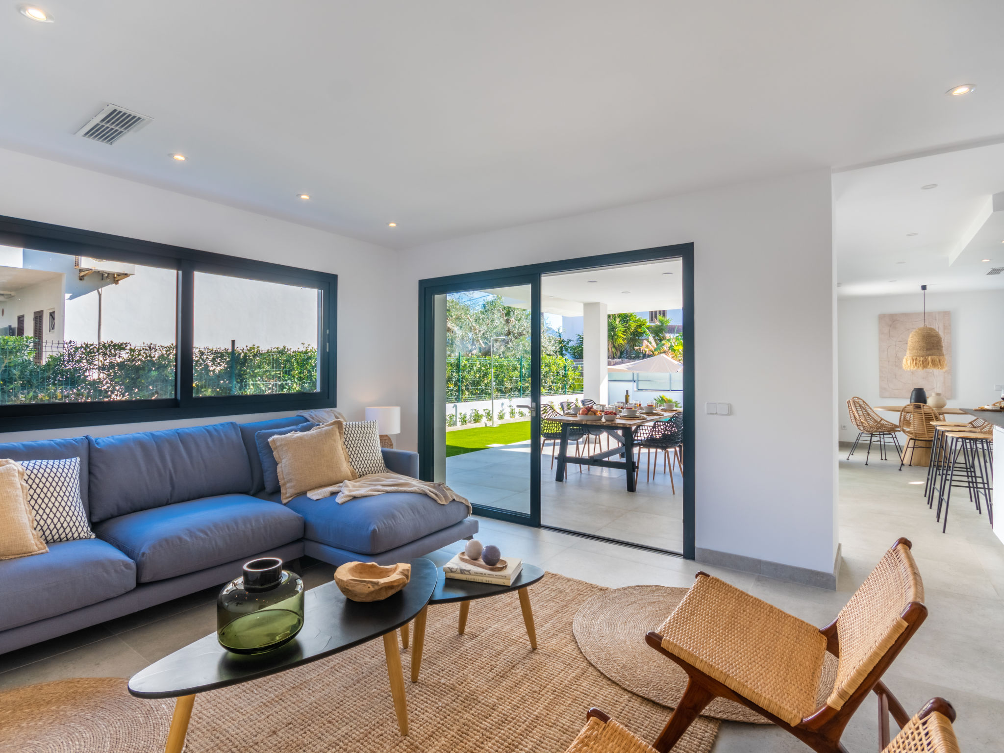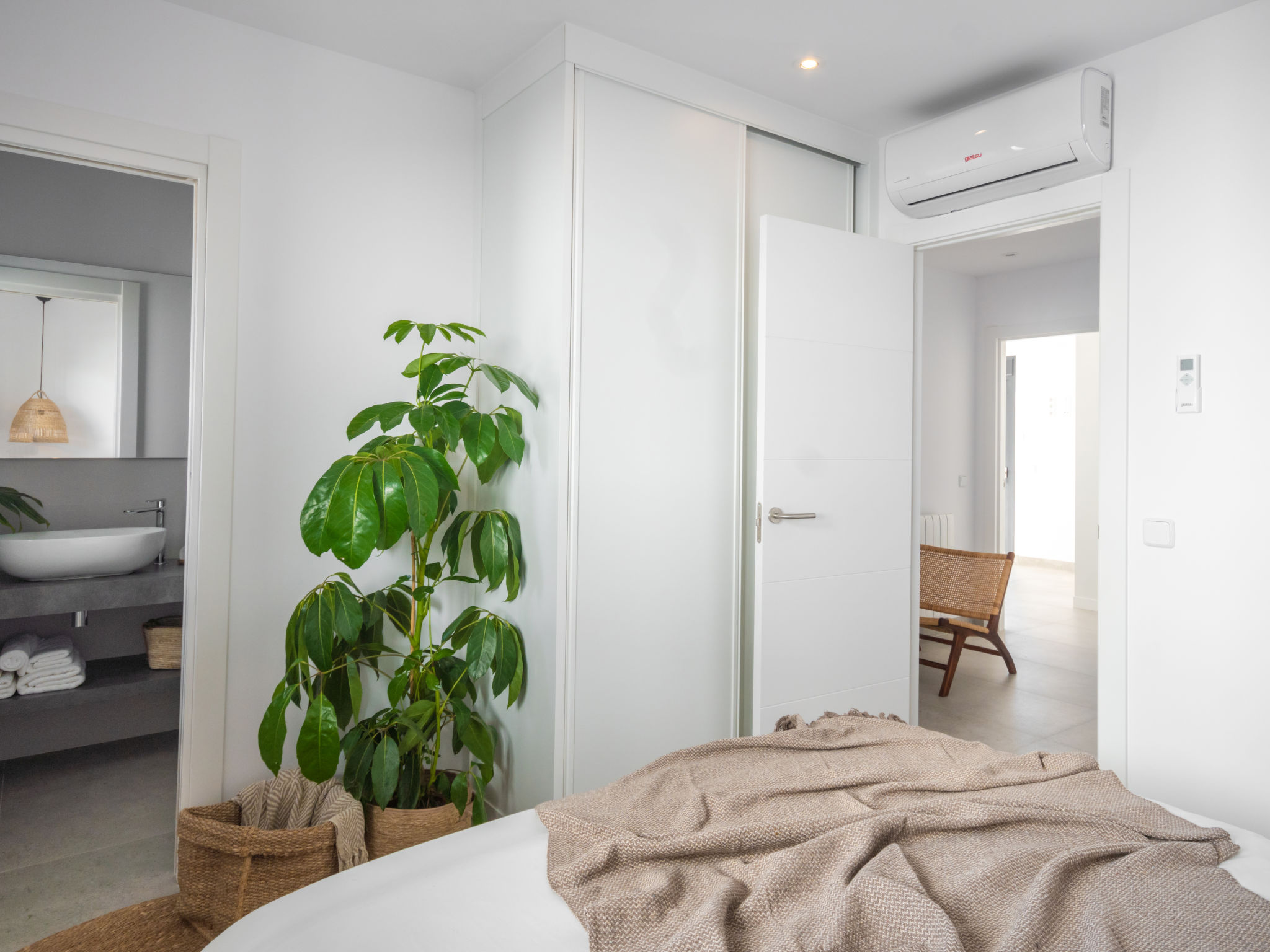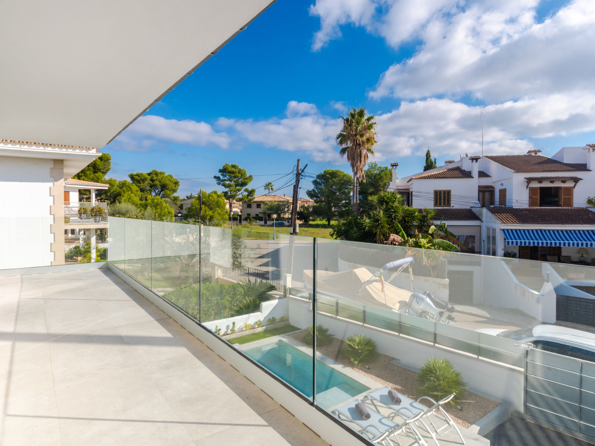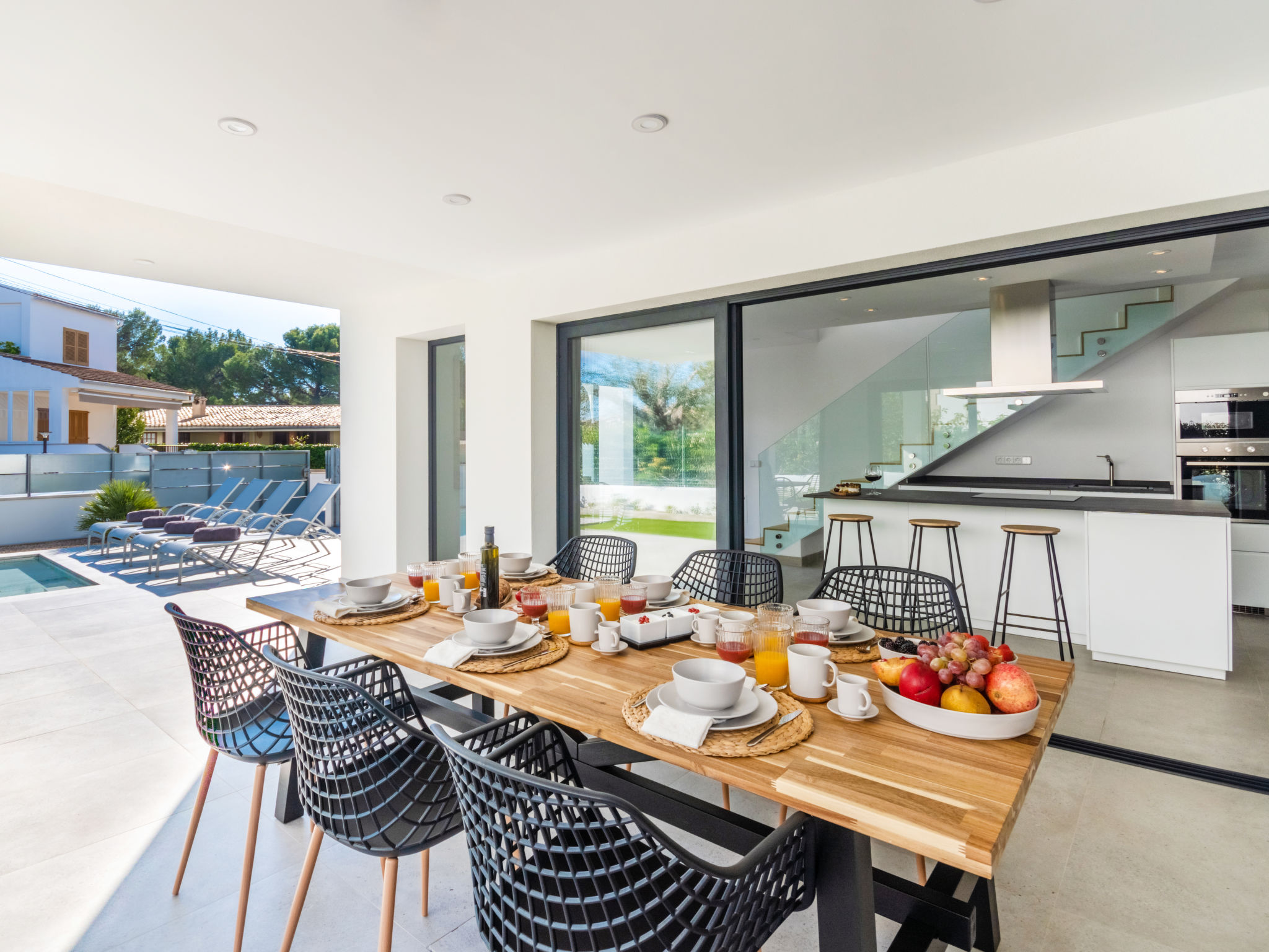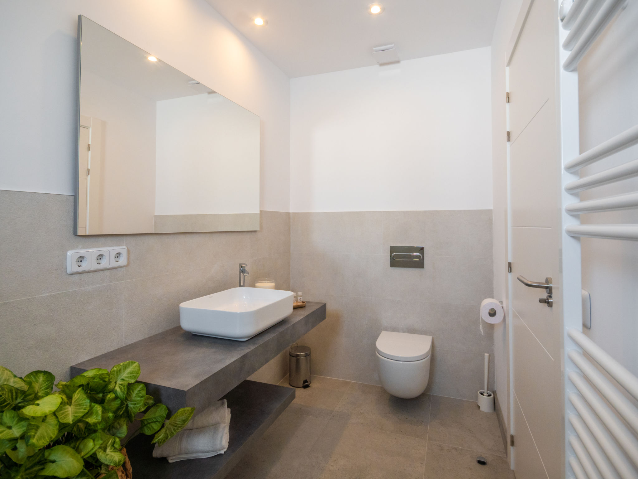Barcares 1 km von Alcúdia: Modernes, sehr komfortables Doppelhaus "Ca na Cati", auf 2 Stockwerken, einseitig angebaut, Baujahr 2020. Im Ortsteil Barcarés, ruhige Lage im Villenviertel, 2 km vom Waldrand, 200 m vom Meer, 350 m vom Strand. Zur Alleinbenutzung: Garten mit Pflanzen, Hof, Schwimmbad eckig (4 x 3 m, 50 - 160 cm tief, 01.01.-31.12.) mit Salzelektrolyse-Reinigungssystem. Aussendusche, Sitzplatz, Laube, Pergola, Gartenmöbel, Grill, Poolpflege durch den Besitzer/Gärtner. Im Hause: Internetzugang, Wireless LAN, Einstellraum für Fahrräder, Zentralheizung, Klimaanlage, Waschmaschine, Wäschetrockner. Parkplatz beim Haus auf dem Grundstück. Einkaufsgeschäft 1 km, Lebensmittelgeschäft 1 km, Supermarkt 1.2 km, Restaurant, Bar 950 m, Bäckerei 1.2 km, Fußgängerzone 500 m, Fahrradverleih 1 km, Biergarten 950 m, Zentrum zu Fuss in 15 Minuten erreichbar, Bushaltestelle 1 km, Sandstrand "Es Morer Vermell" 1 km, Kieselstrand "Sa Marina" 350 m, Steinstrand "Barcares" 350 m, Badebucht 250 m. Sporthafen 3 km, Jacht-Hafen 3 km, Golfplatz (18 Loch) 5 km, Surfschule 1 km, Tennis 2 km, Reitstall 2.5 km, Sportzentrum 200 m, Wanderwege ab Haus, Radweg 500 m. Nahe gelegene Sehenswürdigkeiten: Ciudad Romana de Alcúdia. 1 km, Port de Pollença - Pollença 4 km, Puerto de Alcúdia 3 km, Serra de Tramuntana, Playa / Faro de Formentor. Wandergebiete: S'Albufera d'Alcúdia, Ermita de la Victoria - s'Atalaia d'Alcú, Puig de Sant Martí. Bitte beachten: geeignet für Familien, geeignet für Senioren. Objekt geeignet für 6 Erwachsene. Der Besitzer akzeptiert keine Jugendgruppen. Flugplatz 50 km vom Haus. Die Nachbarschaft ist sehr lärmempfindlich. Ruhe und gutes Benehmen wird erwartet.
