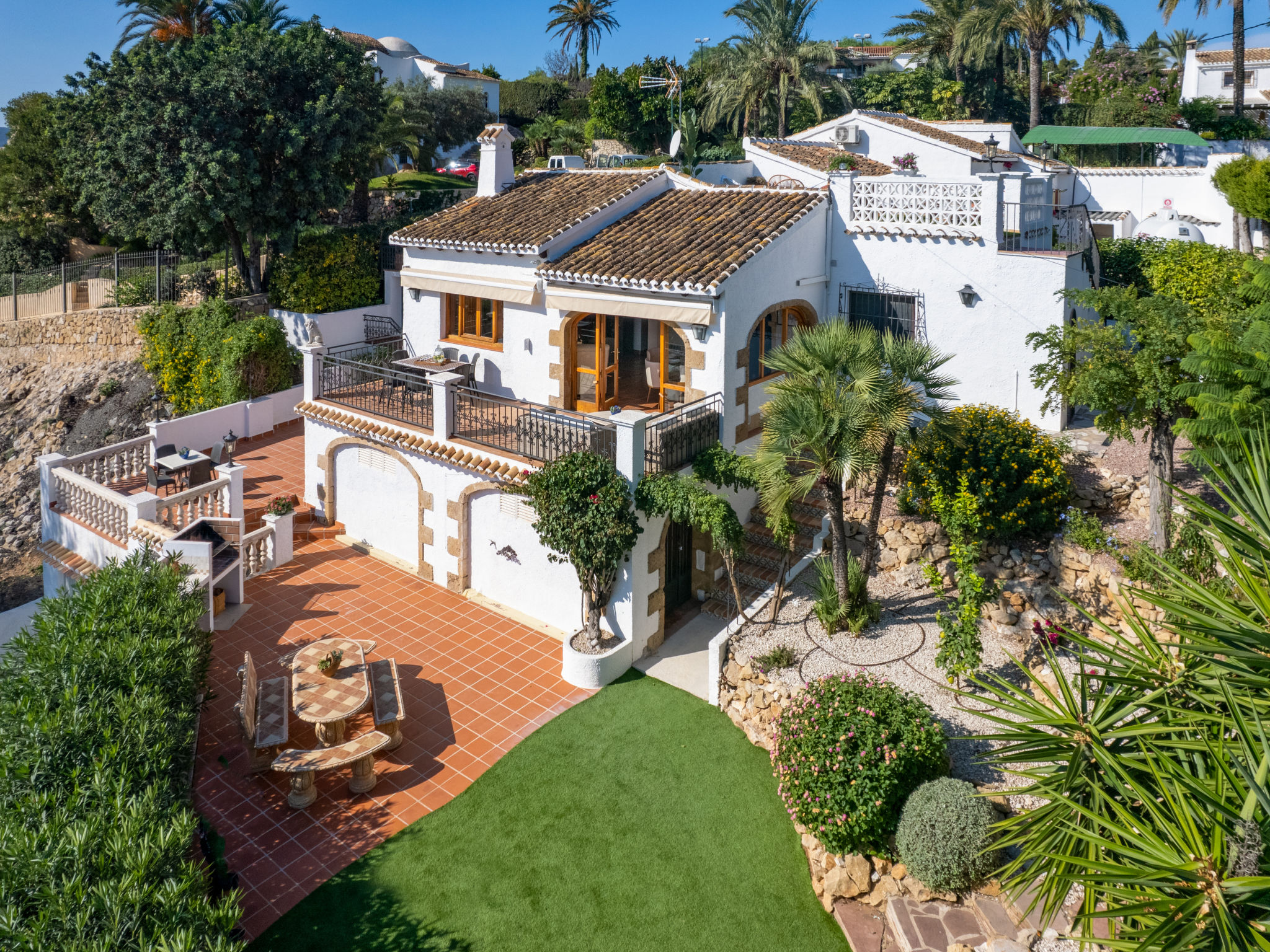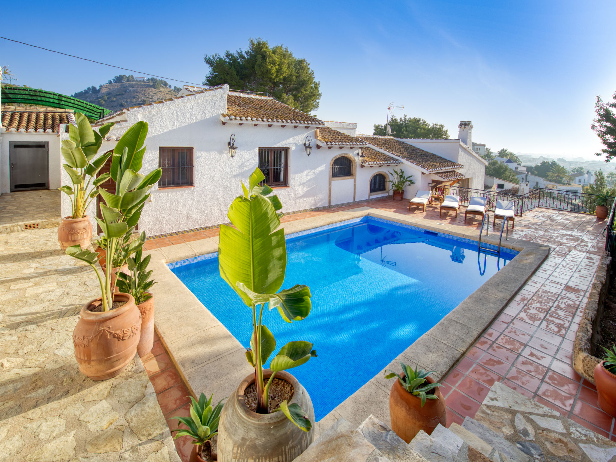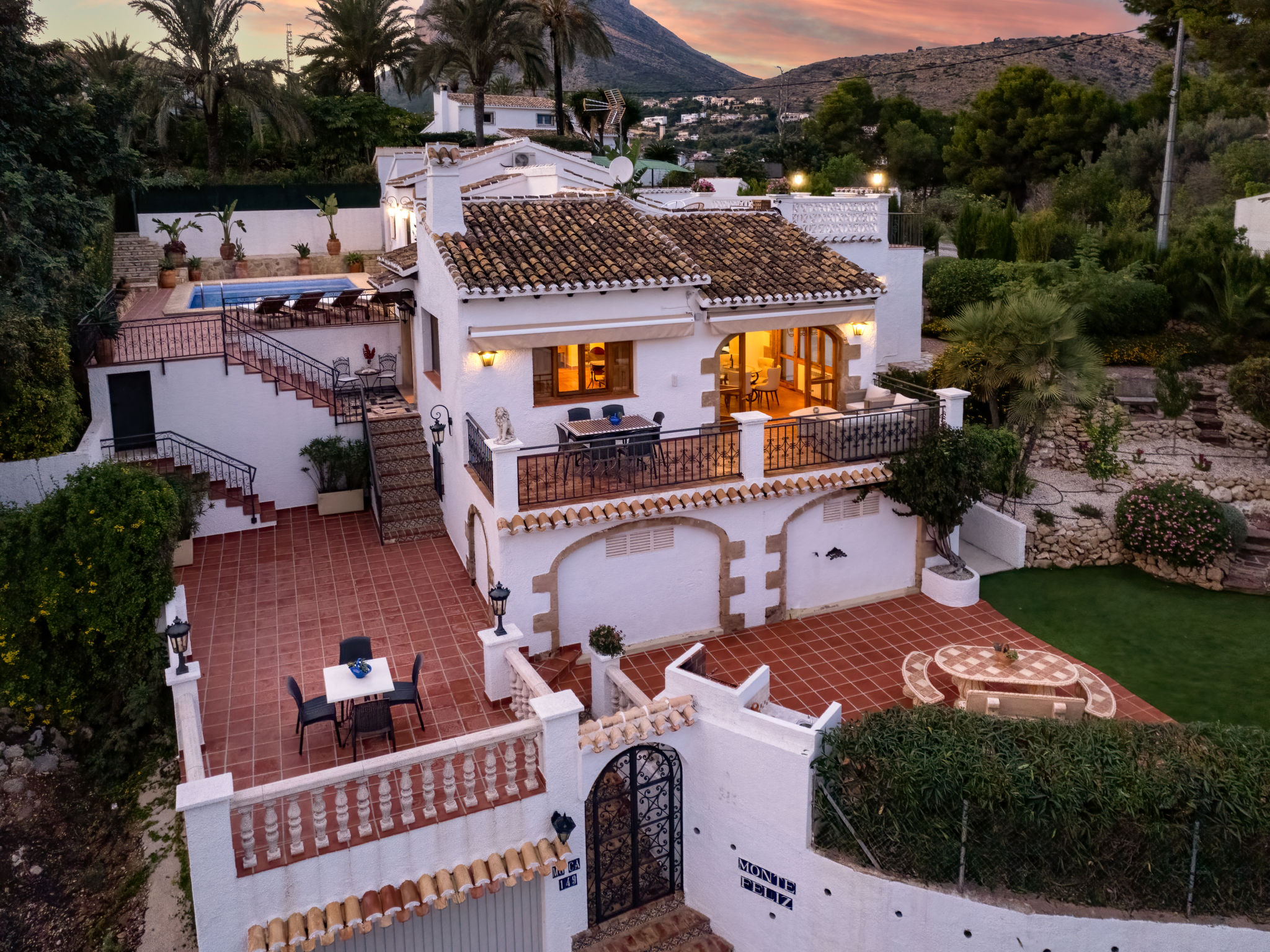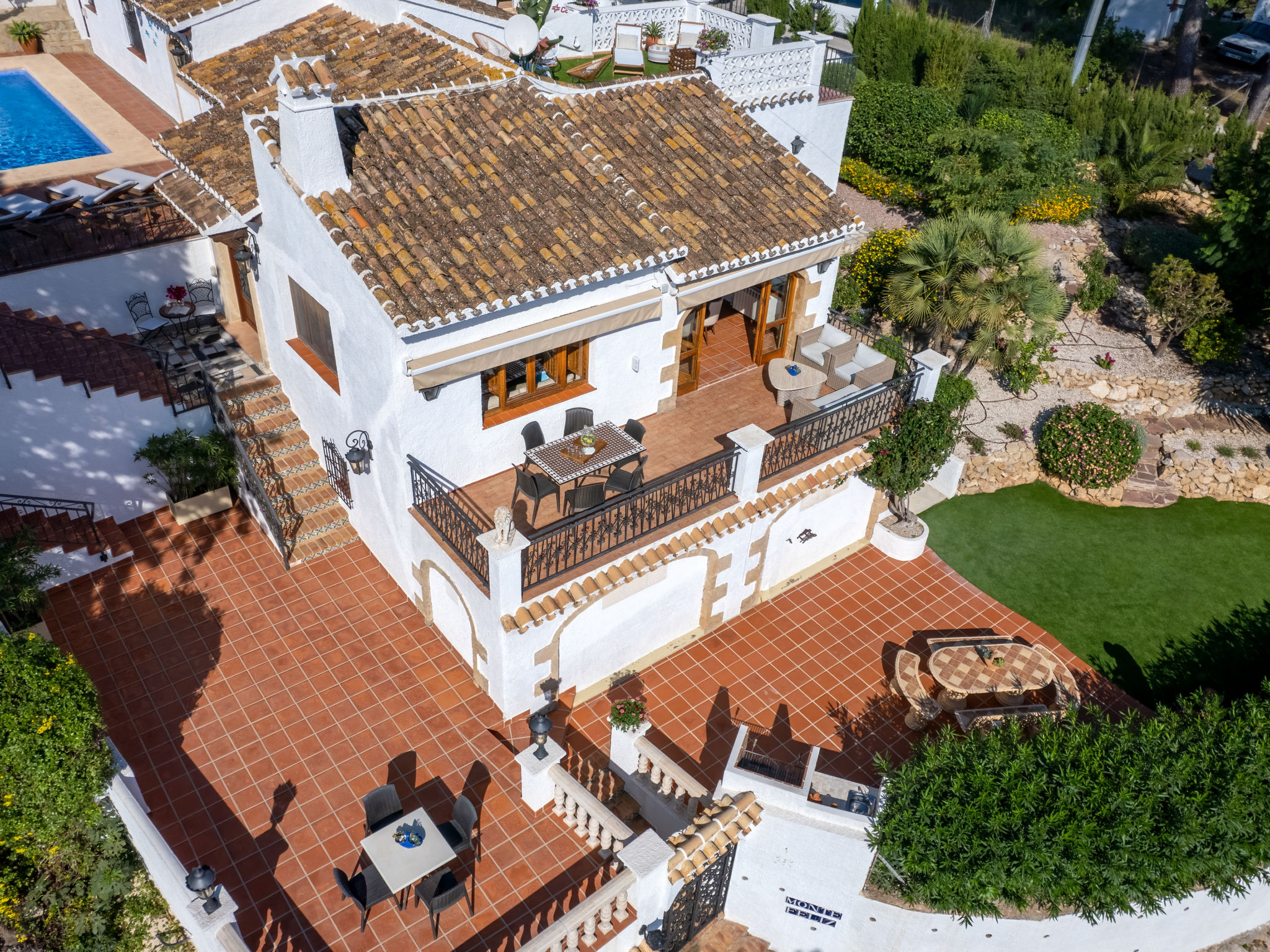 "Villa Monte Feliz", 4-Zimmer-Villa 280 m2. Geräumig, sehr schön und stilvoll eingerichtet: Wohn-/Esszimmer mit Sat-TV, Digital-TV, Klimaanlage, Ventilator und Warmluftheizung. Ausgang zur Terrasse. Grosse Küche (Backofen, Geschirrspüler, 4 Induktionskochplatten, Toaster, Wasserkocher, Mikrowelle, Tiefkühler, elektrische Kaffeemaschine). Obergeschoss: 1 Zimmer mit 1 franz. Bett (160 cm, Länge 200 cm). 1 Zimmer mit 1 Bett (90 cm, Länge 200 cm). Dusche/WC. 2. Obergeschoss: 1 Zimmer mit begehbarer Kleiderschrank mit 1 franz. Bett (160 cm, Länge 200 cm), Dusche/WC, Doppelwaschbecken, Klimaanlage und Warmluftheizung. 1 Zimmer mit 1 franz. Bett (160 cm, Länge 200 cm), Dusche/WC. Terrassenmöbel, Gartengrill, Liegestühle. Sicht auf das Meer und das Tal. Zur Verfügung: Waschmaschine, Wäschetrockner, Bügeleisen, Kinderhochstuhl, Babybett. Internet (Wireless LAN, gratis). Parkplatz, Garage. Geeignet für Familien. VT487021A