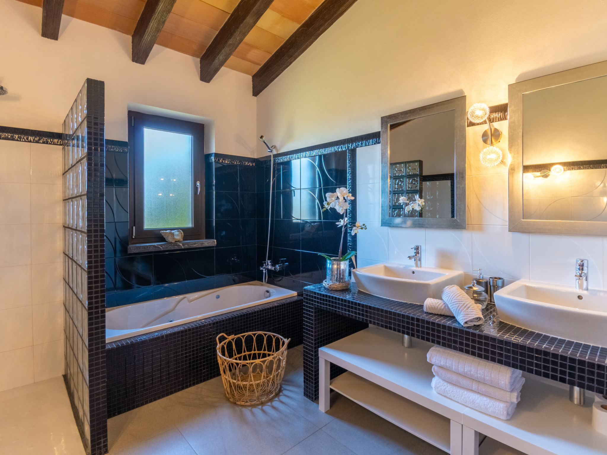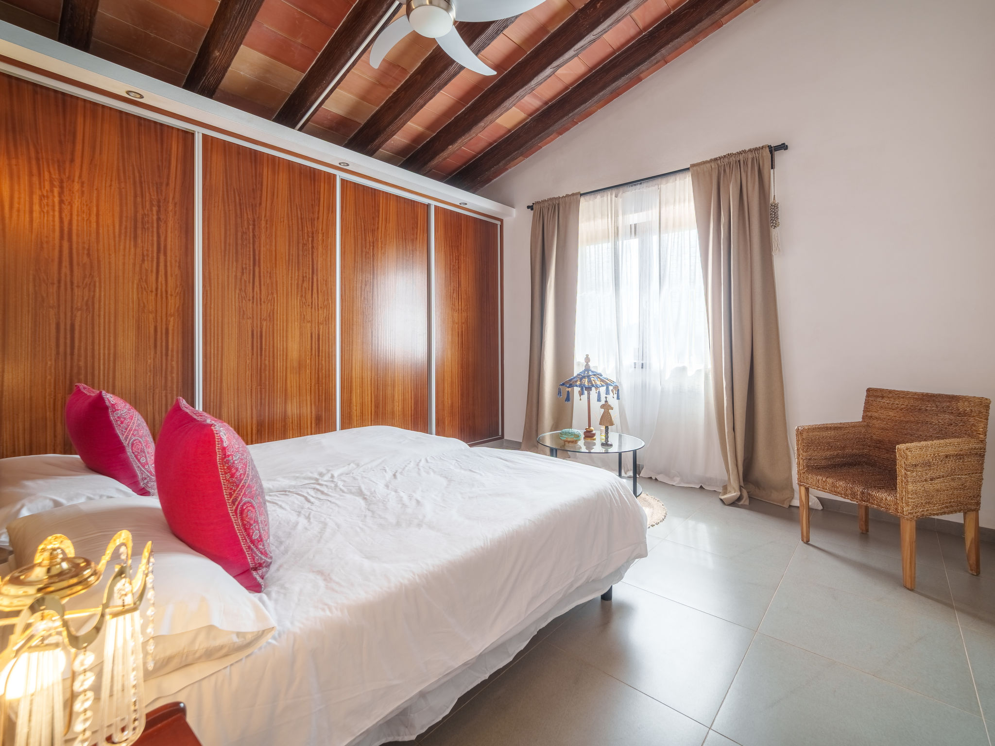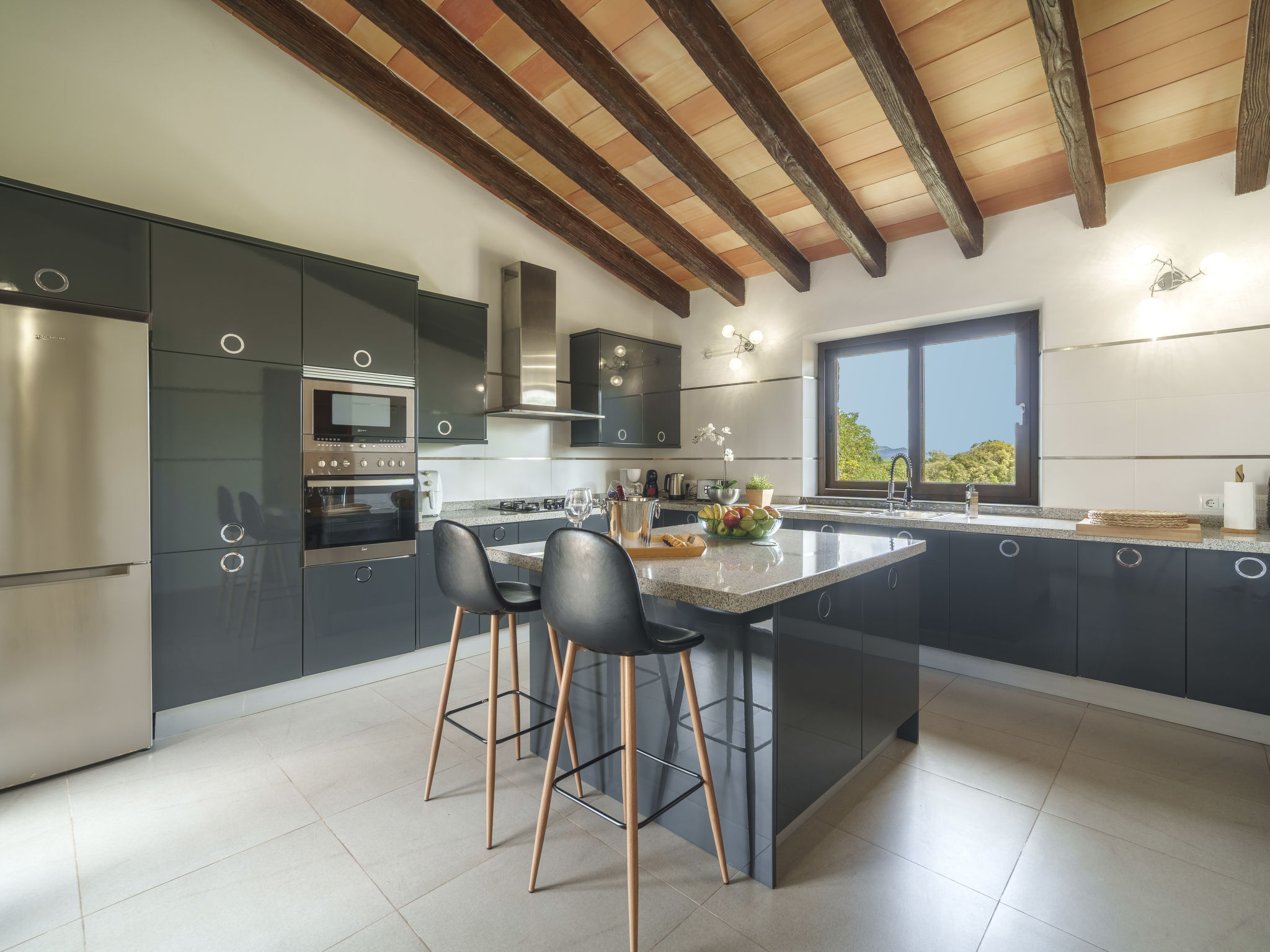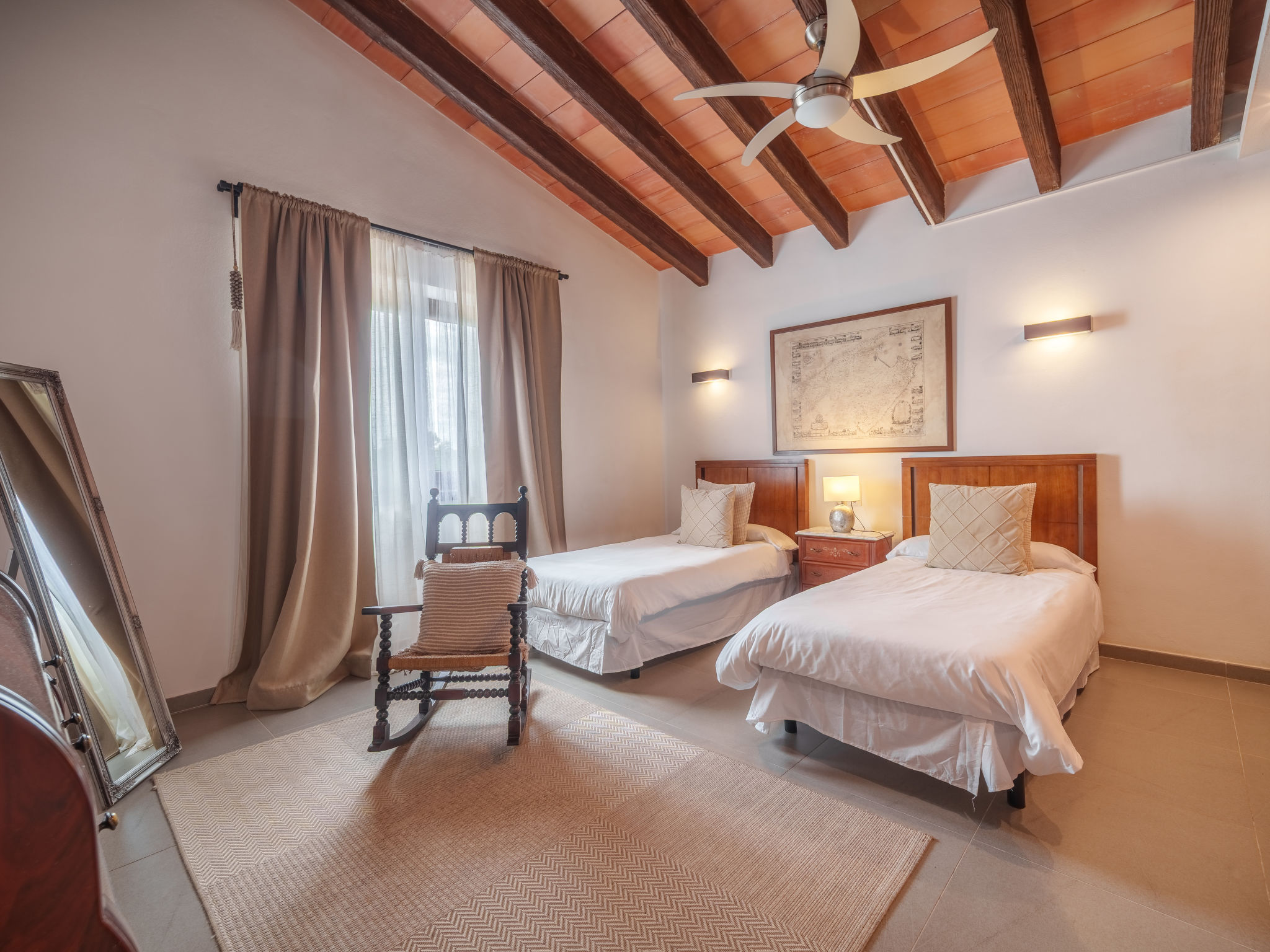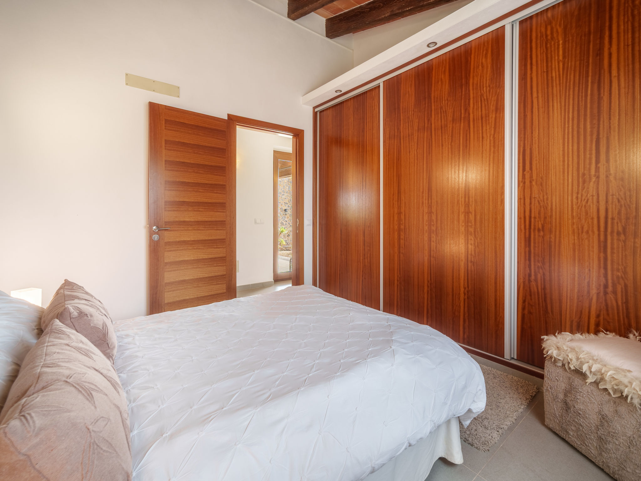 "Can Benet", 5-Zimmer-Haus 300 m2, im erhöhten Erdgeschoss. Objekt geeignet für 8 Erwachsene. Geräumig und hell, vollständig renoviert, sehr komfortabel und gemütlich eingerichtet: offenes grosses Wohn-/Esszimmer mit Schiebetür, Panoramafenster mit offenem Kamin, Esstisch, Sat-TV, Digital-TV, Flachbildschirm, Radio und Stereoanlage. Ausgang zum Gartensitzplatz, zum Schwimmbad. 2 grosse Doppelzimmer mit Panoramafenster, jedes Zimmer mit 1 franz. Bett (135 cm, Länge 190 cm). 2 grosse Doppelzimmer mit Panoramafenster, jedes Zimmer mit 2 Betten (90 cm, Länge 190 cm). Grosse Küche (Backofen, Geschirrspüler, 3 Glaskeramikherd Platten, Mikrowelle, Tiefkühler, elektrische Kaffeemaschine, Kochinsel). Dusche/WC, Bad/Dusche/WC, Doppelwaschbecken. Grosser Gartensitzplatz, Laube. Terrassenmöbel, Gartengrill, Liegestühle (8), Loggia. Sehr schöne Sicht auf das Tal, die Landschaft und die Ortschaft. Zur Verfügung: Waschmaschine, Bügeleisen, Kinderhochstuhl, Babybett, Haartrockner. Internet (Wireless LAN, gratis). Parkplatz (eingezäunt). Geeignet für Familien. ETV12090