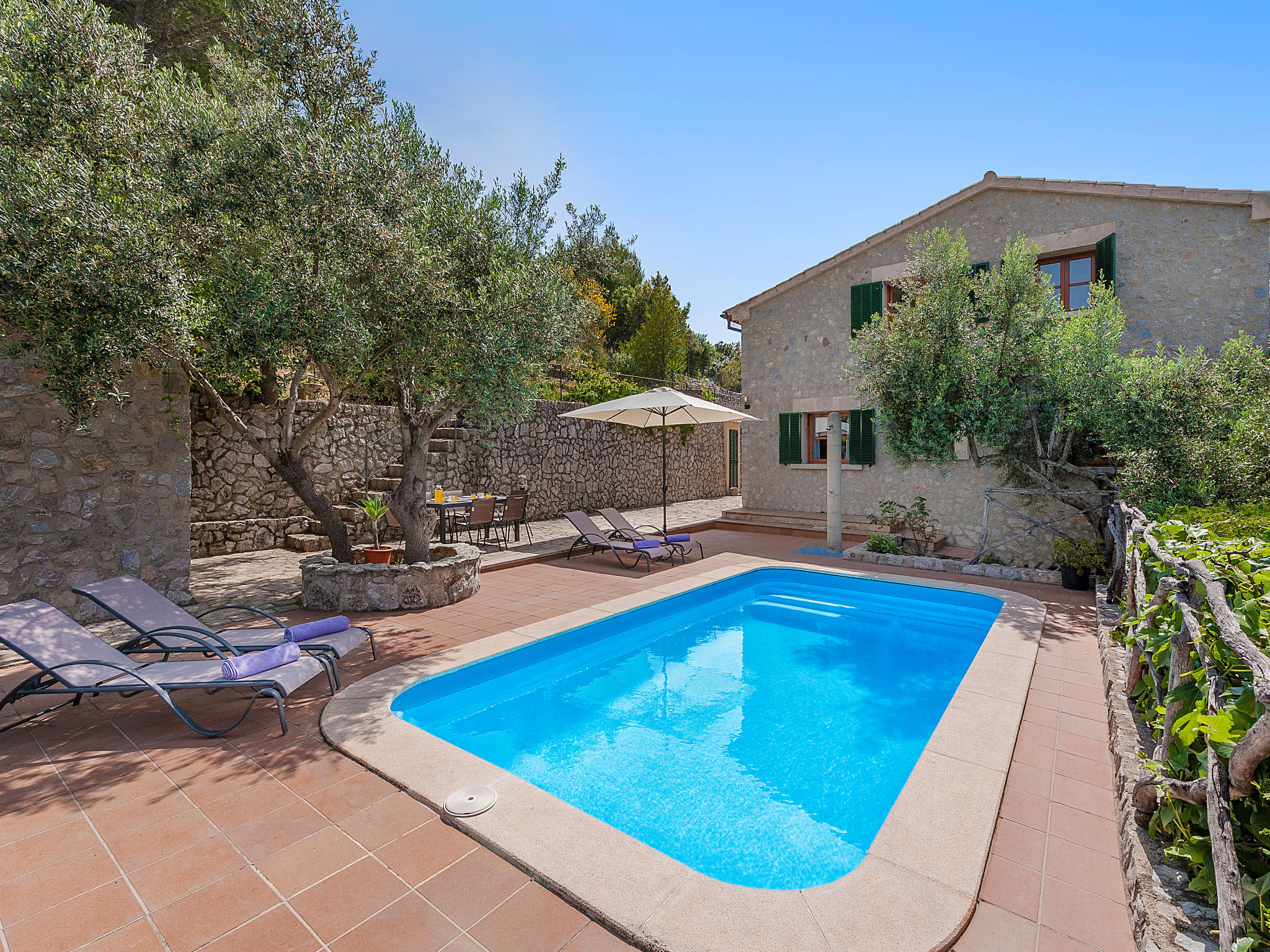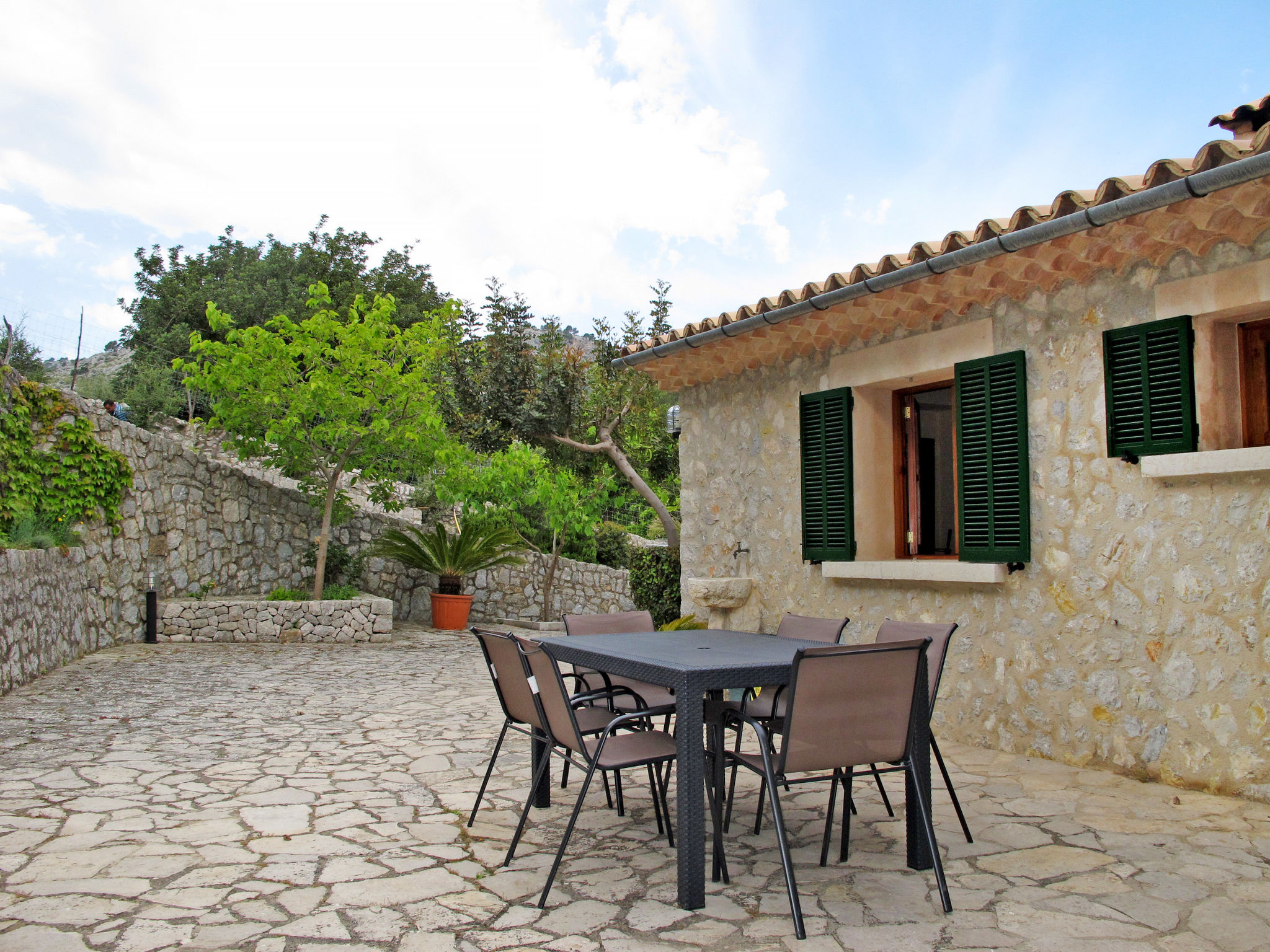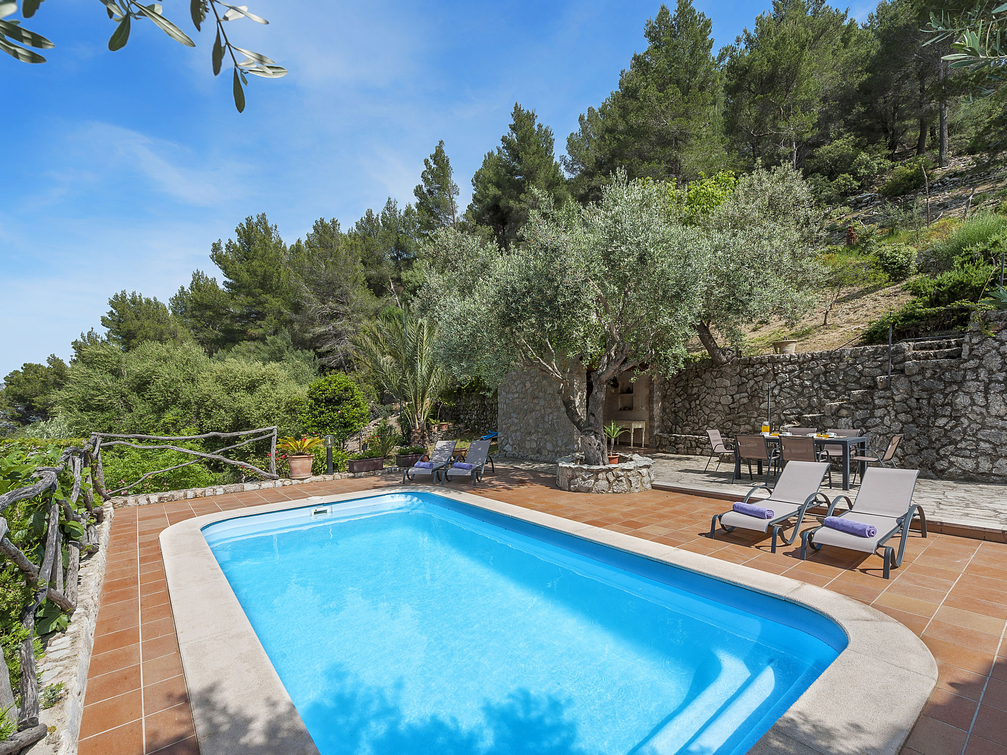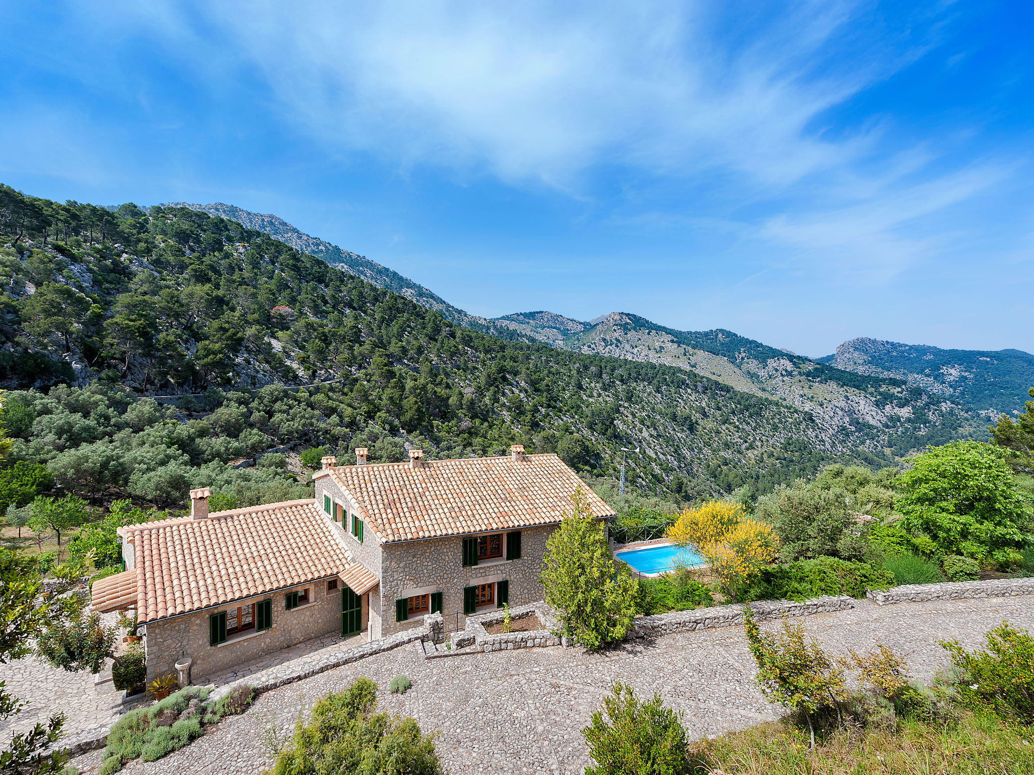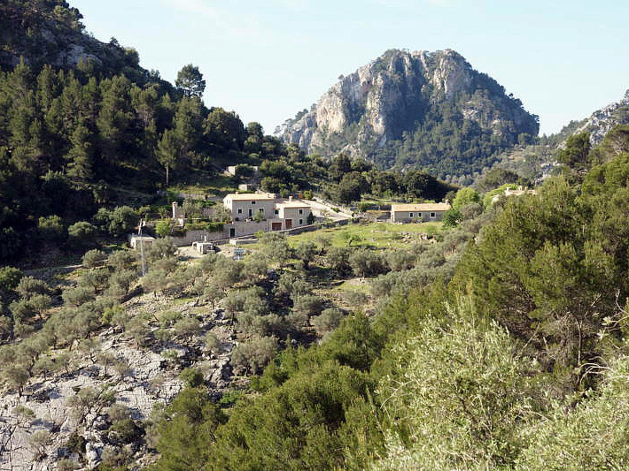 Die traditionsreiche Naturstein-Finca steht in herrlicher Panoramalage, auf ca. 350 m Höhe, zwischen Caimari (4 km) und Lluc (7 km). Restaurant in Caimari, Supermarkt in Inca (12 km). Zum Wanderweg "Camí Vell de Lluc" ca. 250m. Umgeben vom prächtigen Bergmassiv der Tramuntana genießt man von den Terrassen des Hauses die weite Sicht auf die umliegenden Täler und Berggipfel. Das 70 ha große Hanggrundstück bietet 2 private Spazierwege durch die hügelige Landschaft mit ca. 1500 Olivenbäumen (der Besitzer produziert Olivenöl) und einer kleinen Schafherde. Parkmöglichkeiten auf dem Grundstück. Am Haus ca. 400 m² mit Naturstein geflieste, zur Hangseite abgeschlossene Terrassenflächen, geschmückt mit Blumentöpfen, Bougainvillea und Ziersträuchern. Neben dem Pool (6 x 3 m, gesamte Saison geöffnet, 3x wöchentlich Poolpflege durch einen Gärtner) mit Außendusche, Sonnenterrasse, Sonnenliegen und Sonnenschirm, die gemauerte, überdachte Grillstelle mit Kaltwasseranschluss und Terrassenmobiliar. Gute und geschmackvolle Einrichtung mit einigen mallorquinischen Details. Fliesenböden. Sat-TV (deutsche Programme). Internetzugang (WLAN, inklusive). Waschmaschine, Bügeleisen/-brett, Fön. Öl-Zentralheizung. 2x mobiler Ventilator. Hinweise: Stromversorgung mit Solaranlage und Generator. Rauchen ist im Haus nicht gestattet.