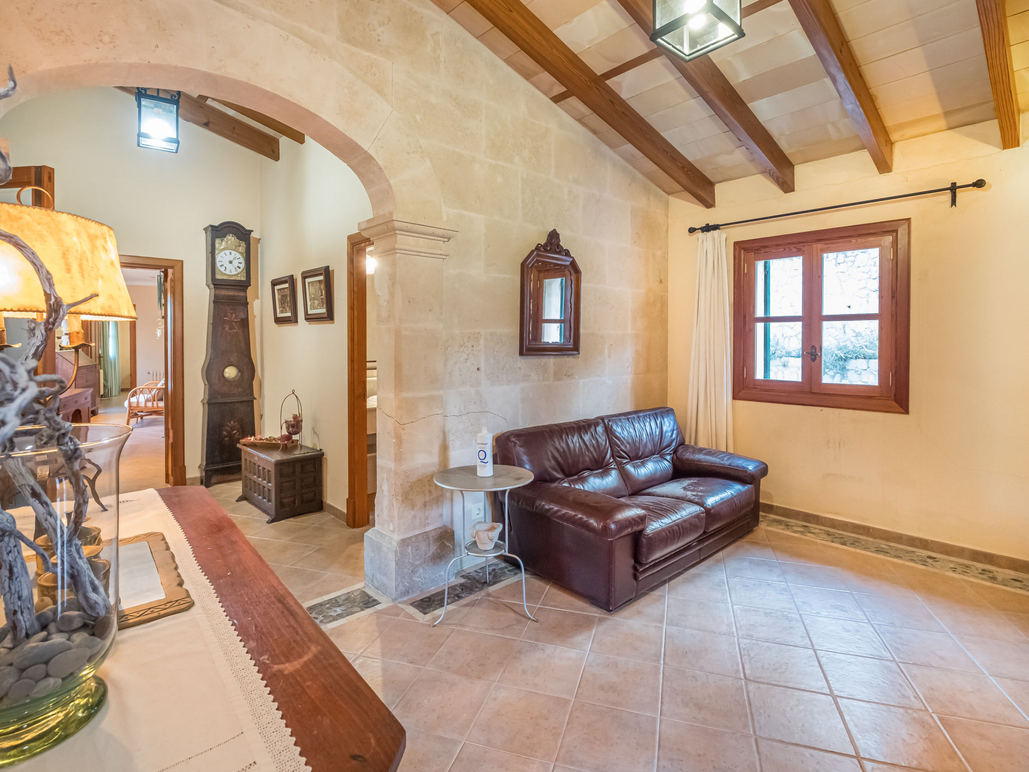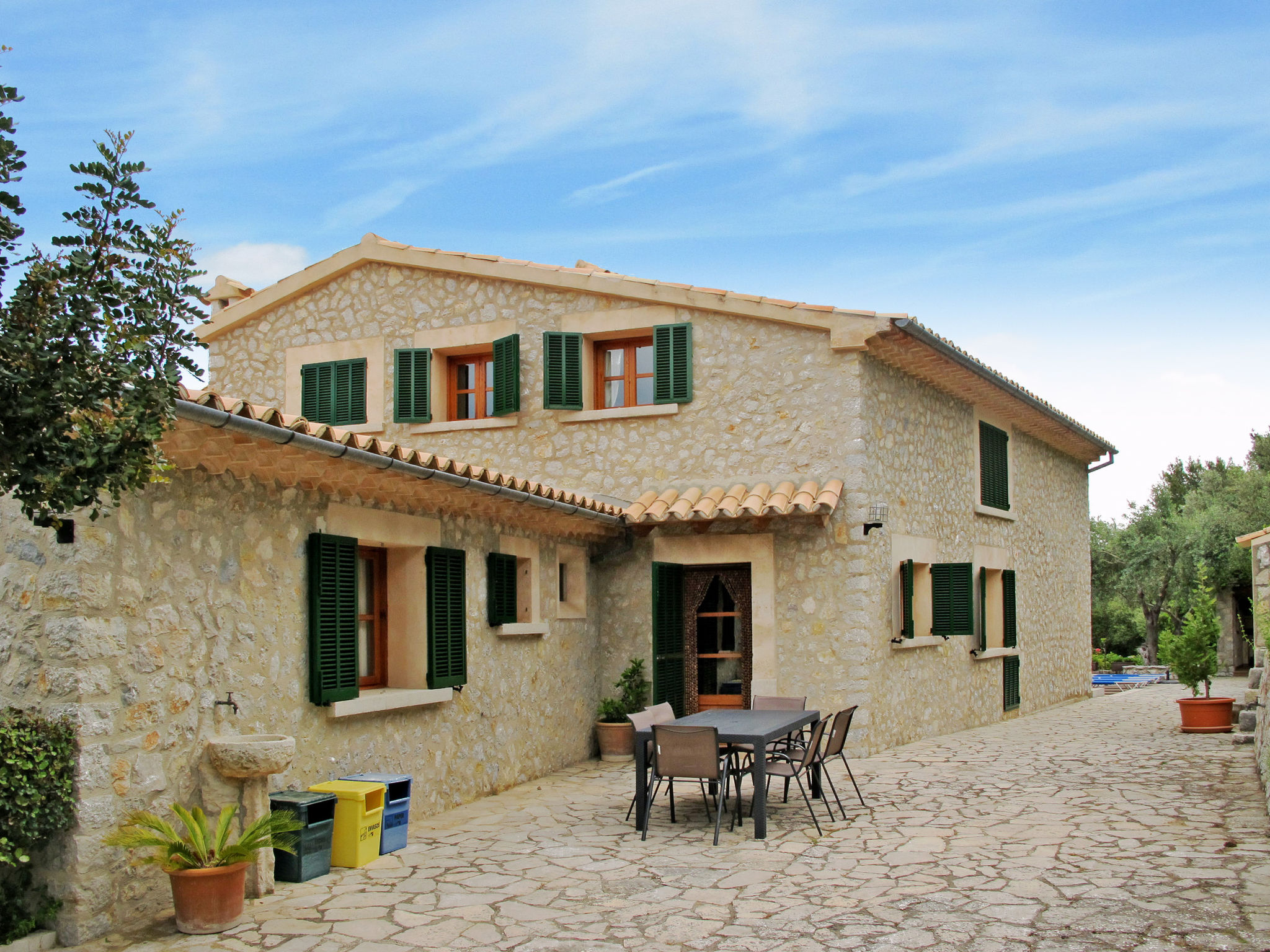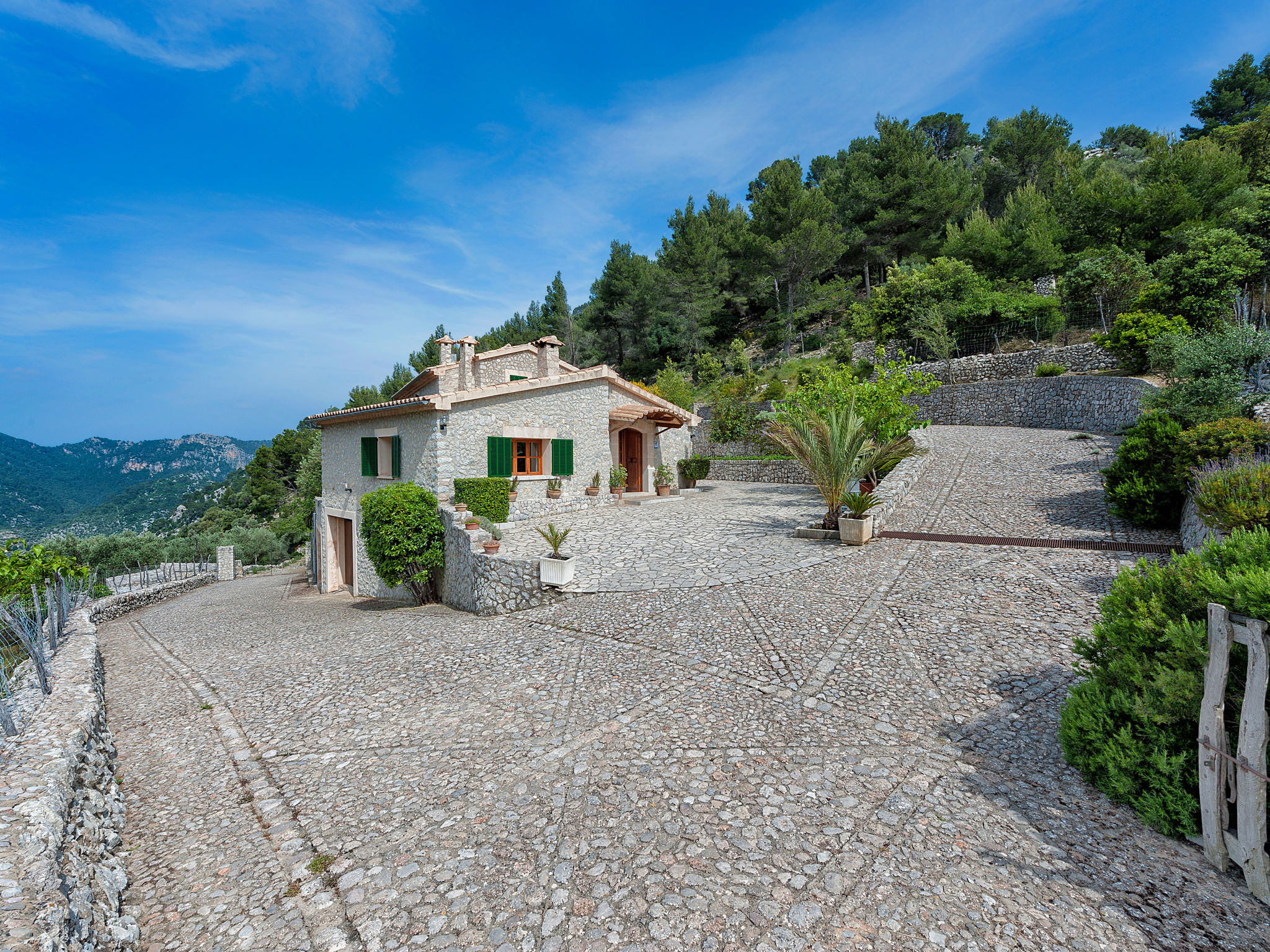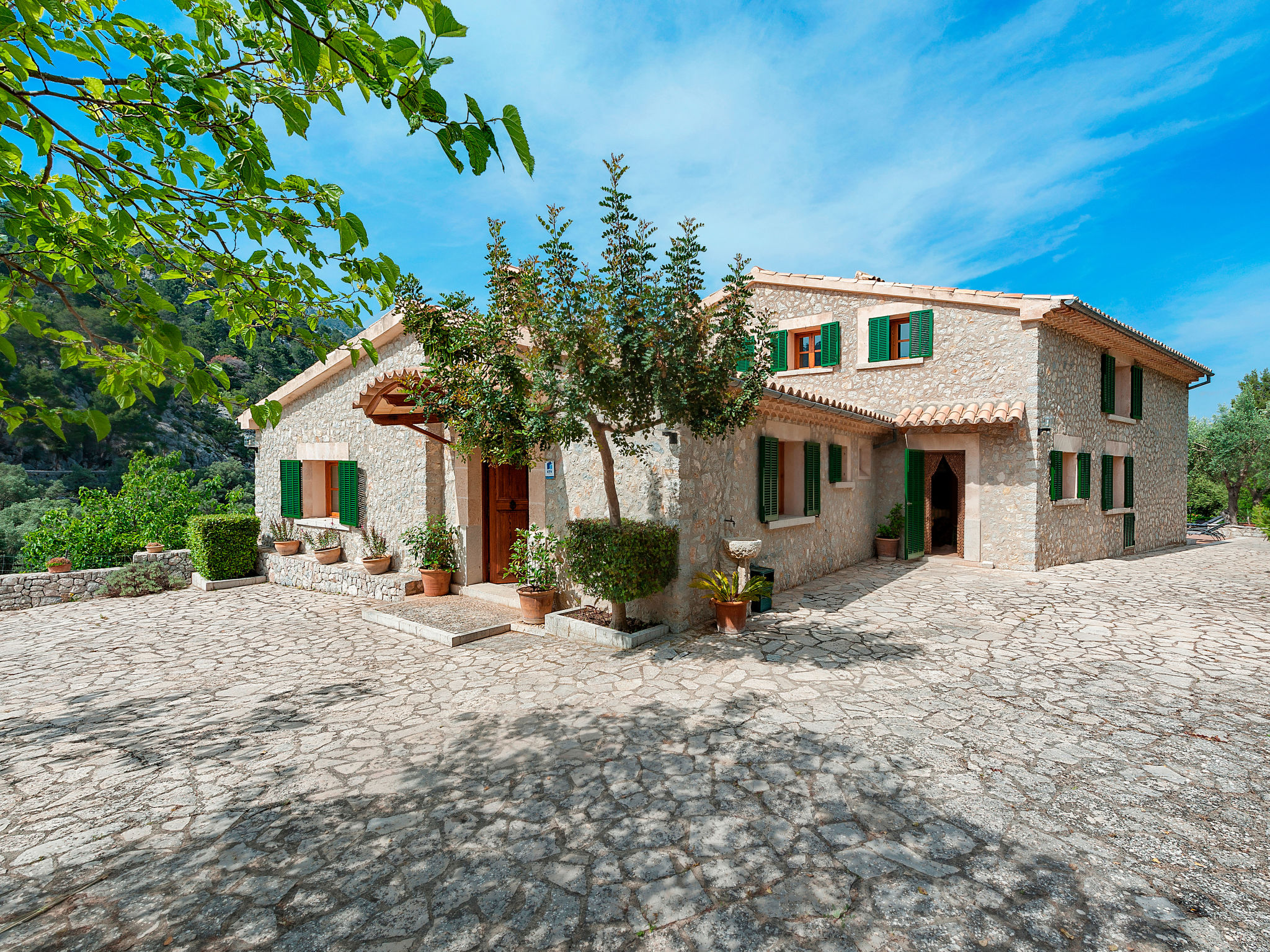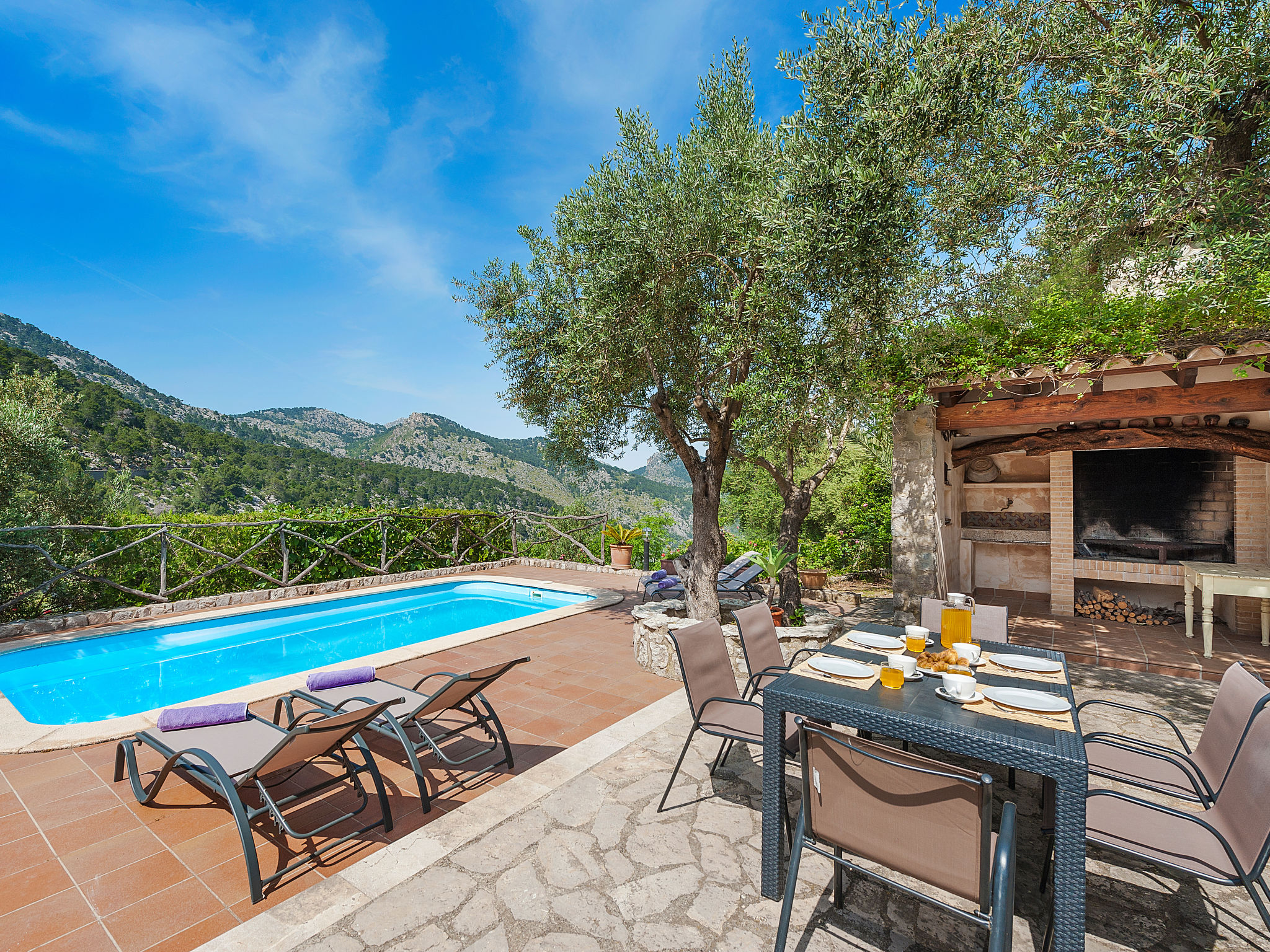 Die traditionsreiche Naturstein-Finca steht in herrlicher Panoramalage, auf ca. 350 m Höhe, zwischen Caimari (4 km) und Lluc (7 km). Restaurant in Caimari, Supermarkt in Inca (12 km). Zum Wanderweg "Camí Vell de Lluc" ca. 250m. Umgeben vom prächtigen Bergmassiv der Tramuntana genießt man von den Terrassen des Hauses die weite Sicht auf die umliegenden Täler und Berggipfel. Das 70 ha große Hanggrundstück bietet 2 private Spazierwege durch die hügelige Landschaft mit ca. 1500 Olivenbäumen (der Besitzer produziert Olivenöl) und einer kleinen Schafherde. Parkmöglichkeiten auf dem Grundstück. Am Haus ca. 400 m² mit Naturstein geflieste, zur Hangseite abgeschlossene Terrassenflächen, geschmückt mit Blumentöpfen, Bougainvillea und Ziersträuchern. Neben dem Pool (6 x 3 m, gesamte Saison geöffnet, 3x wöchentlich Poolpflege durch einen Gärtner) mit Außendusche, Sonnenterrasse, Sonnenliegen und Sonnenschirm, die gemauerte, überdachte Grillstelle mit Kaltwasseranschluss und Terrassenmobiliar. Gute und geschmackvolle Einrichtung mit einigen mallorquinischen Details. Fliesenböden. Sat-TV (deutsche Programme). Internetzugang (WLAN, inklusive). Waschmaschine, Bügeleisen/-brett, Fön. Öl-Zentralheizung. 2x mobiler Ventilator. Hinweise: Stromversorgung mit Solaranlage und Generator. Rauchen ist im Haus nicht gestattet.