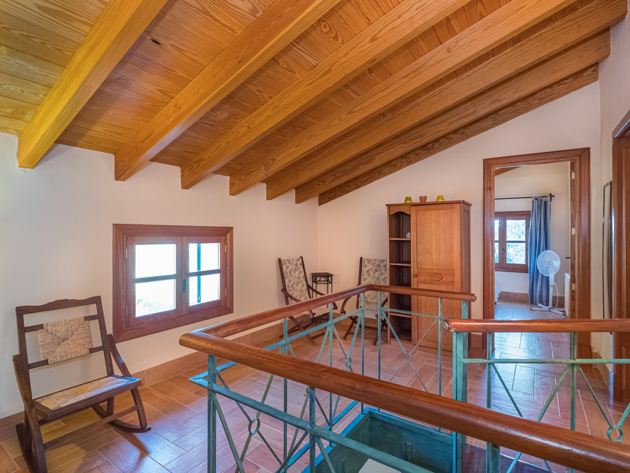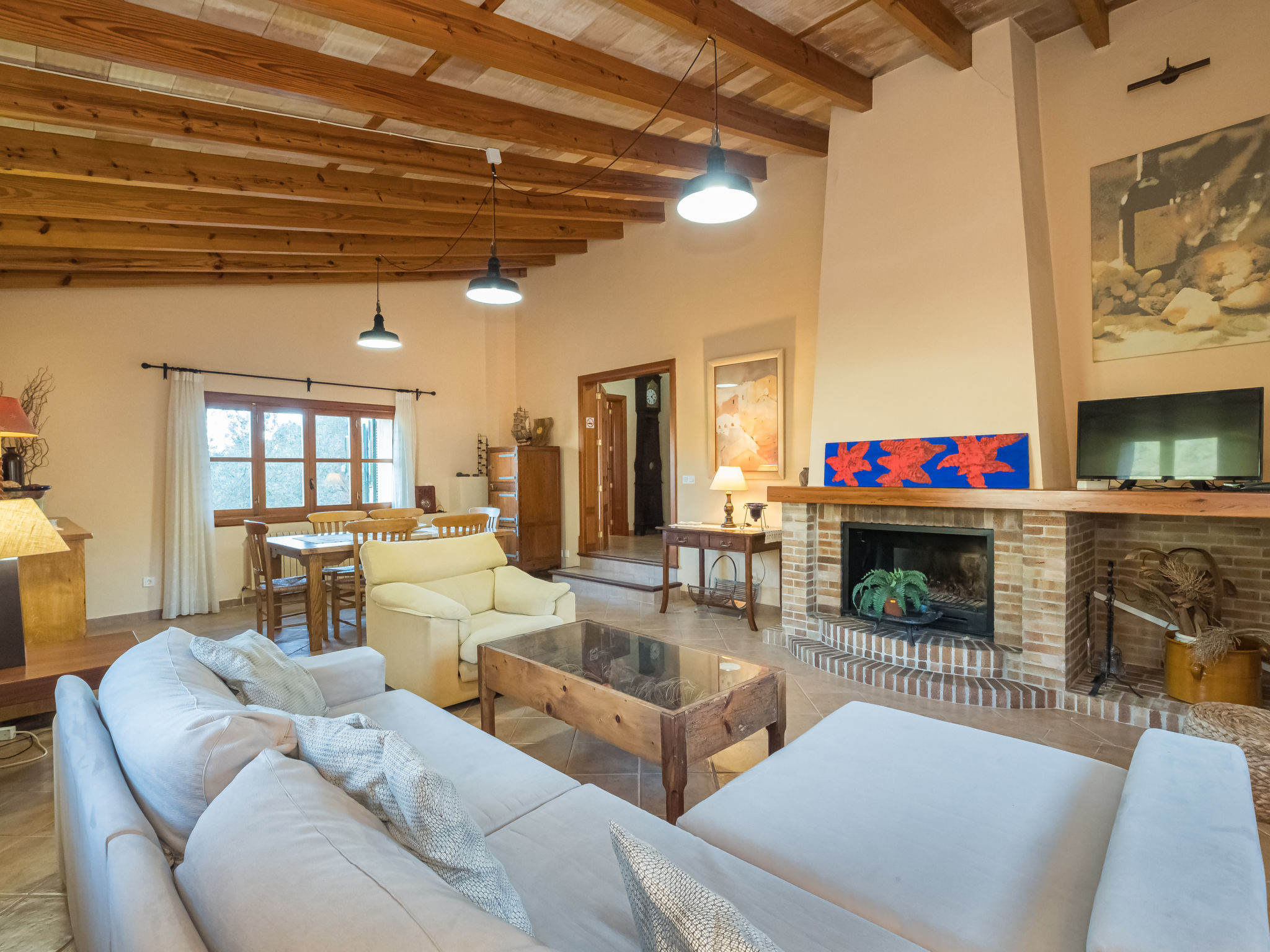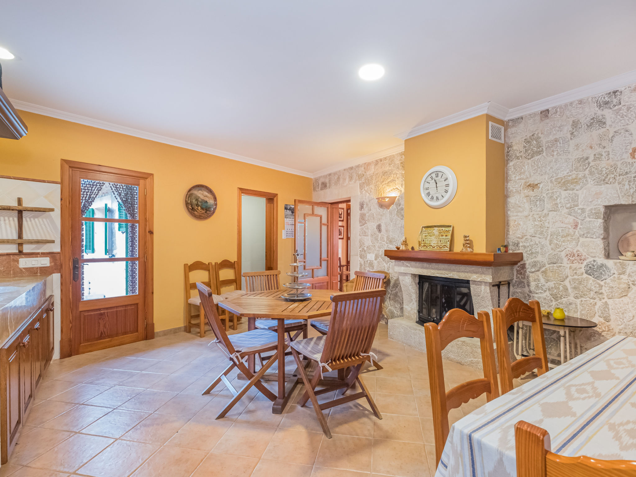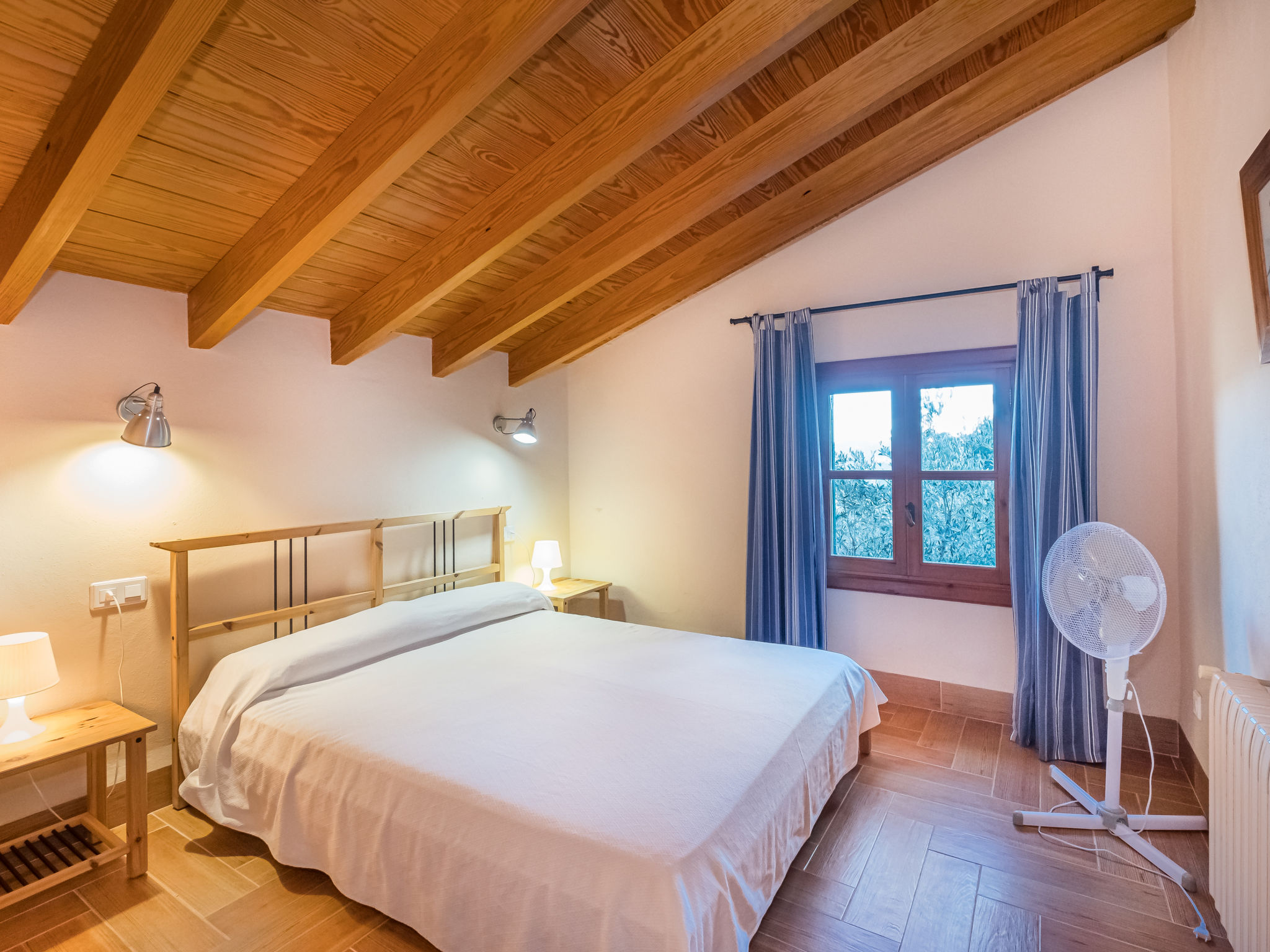 Die traditionsreiche Naturstein-Finca steht in herrlicher Panoramalage, auf ca. 350 m Höhe, zwischen Caimari (4 km) und Lluc (7 km). Restaurant in Caimari, Supermarkt in Inca (12 km). Zum Wanderweg "Camí Vell de Lluc" ca. 250m. Umgeben vom prächtigen Bergmassiv der Tramuntana genießt man von den Terrassen des Hauses die weite Sicht auf die umliegenden Täler und Berggipfel. Das 70 ha große Hanggrundstück bietet 2 private Spazierwege durch die hügelige Landschaft mit ca. 1500 Olivenbäumen (der Besitzer produziert Olivenöl) und einer kleinen Schafherde. Parkmöglichkeiten auf dem Grundstück. Am Haus ca. 400 m² mit Naturstein geflieste, zur Hangseite abgeschlossene Terrassenflächen, geschmückt mit Blumentöpfen, Bougainvillea und Ziersträuchern. Neben dem Pool (6 x 3 m, gesamte Saison geöffnet, 3x wöchentlich Poolpflege durch einen Gärtner) mit Außendusche, Sonnenterrasse, Sonnenliegen und Sonnenschirm, die gemauerte, überdachte Grillstelle mit Kaltwasseranschluss und Terrassenmobiliar. Gute und geschmackvolle Einrichtung mit einigen mallorquinischen Details. Fliesenböden. Sat-TV (deutsche Programme). Internetzugang (WLAN, inklusive). Waschmaschine, Bügeleisen/-brett, Fön. Öl-Zentralheizung. 2x mobiler Ventilator. Hinweise: Stromversorgung mit Solaranlage und Generator. Rauchen ist im Haus nicht gestattet.