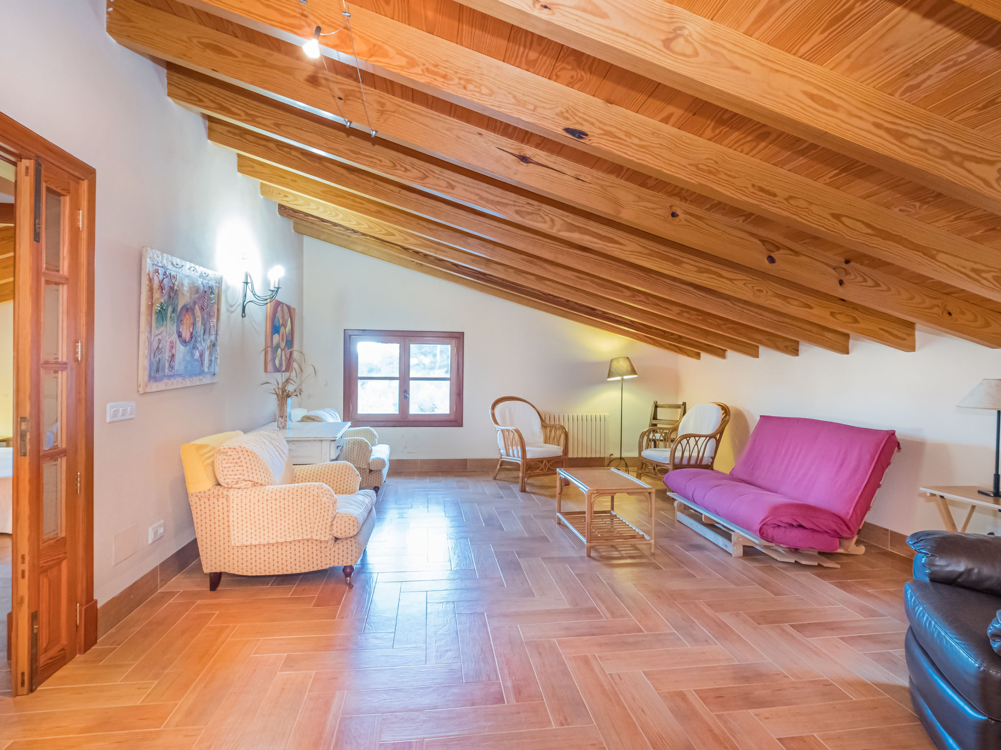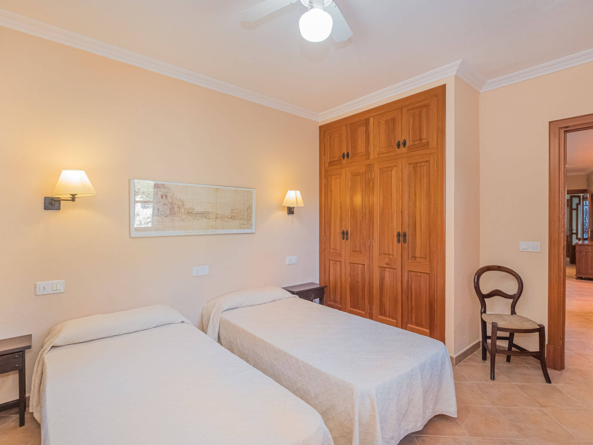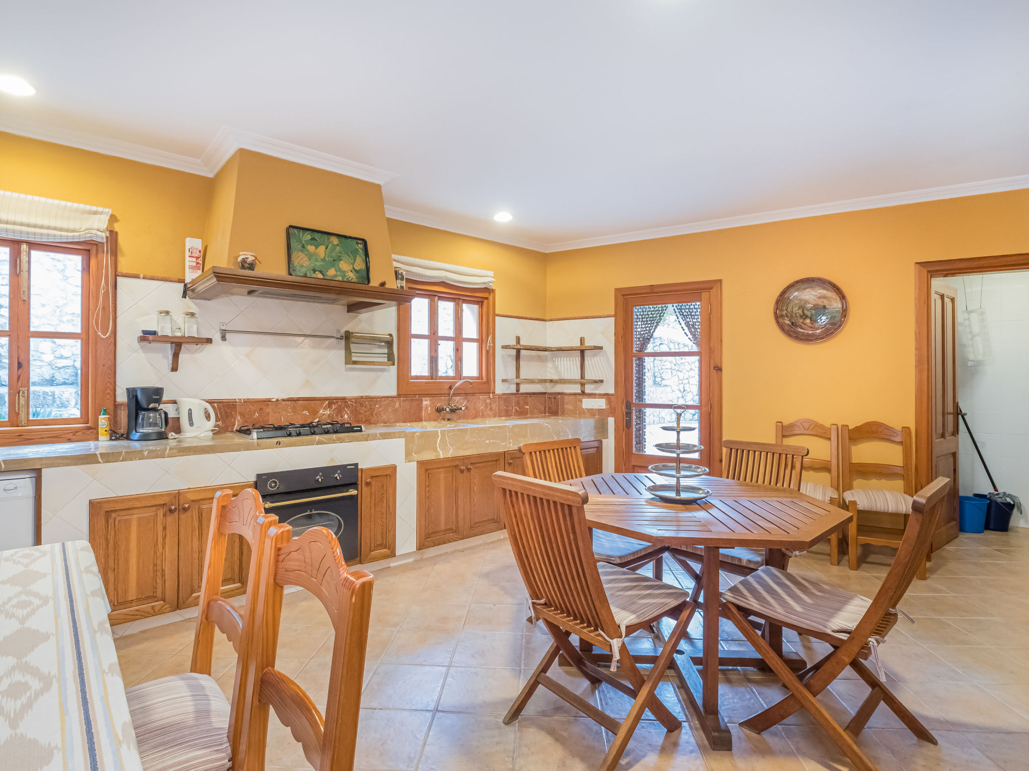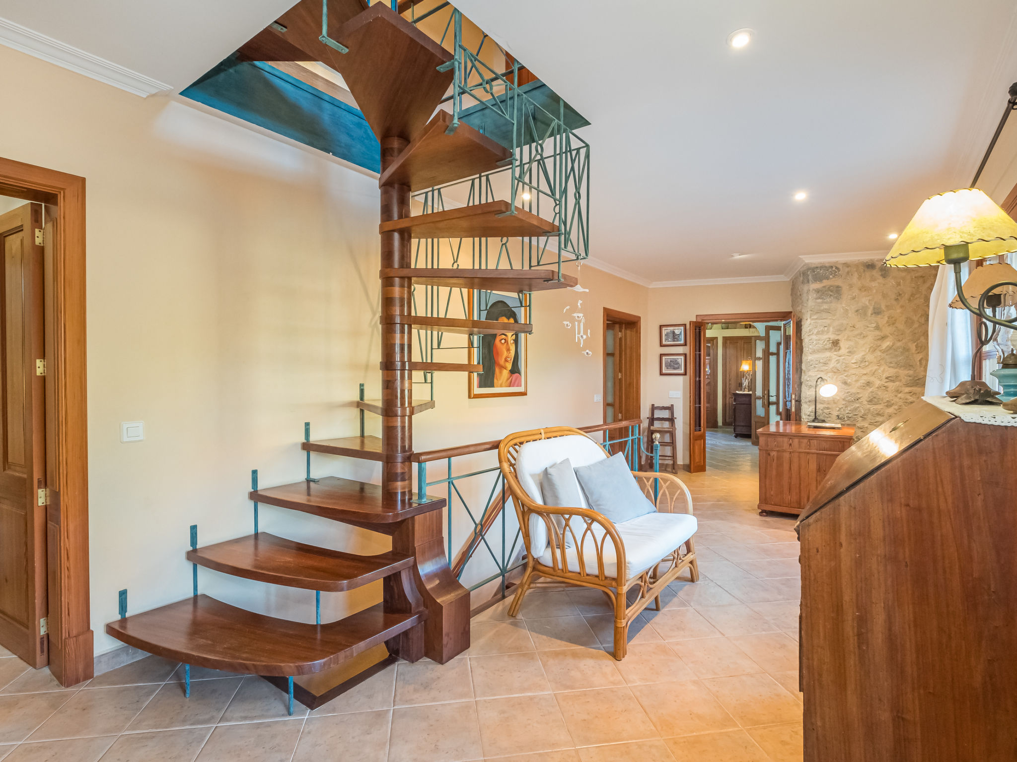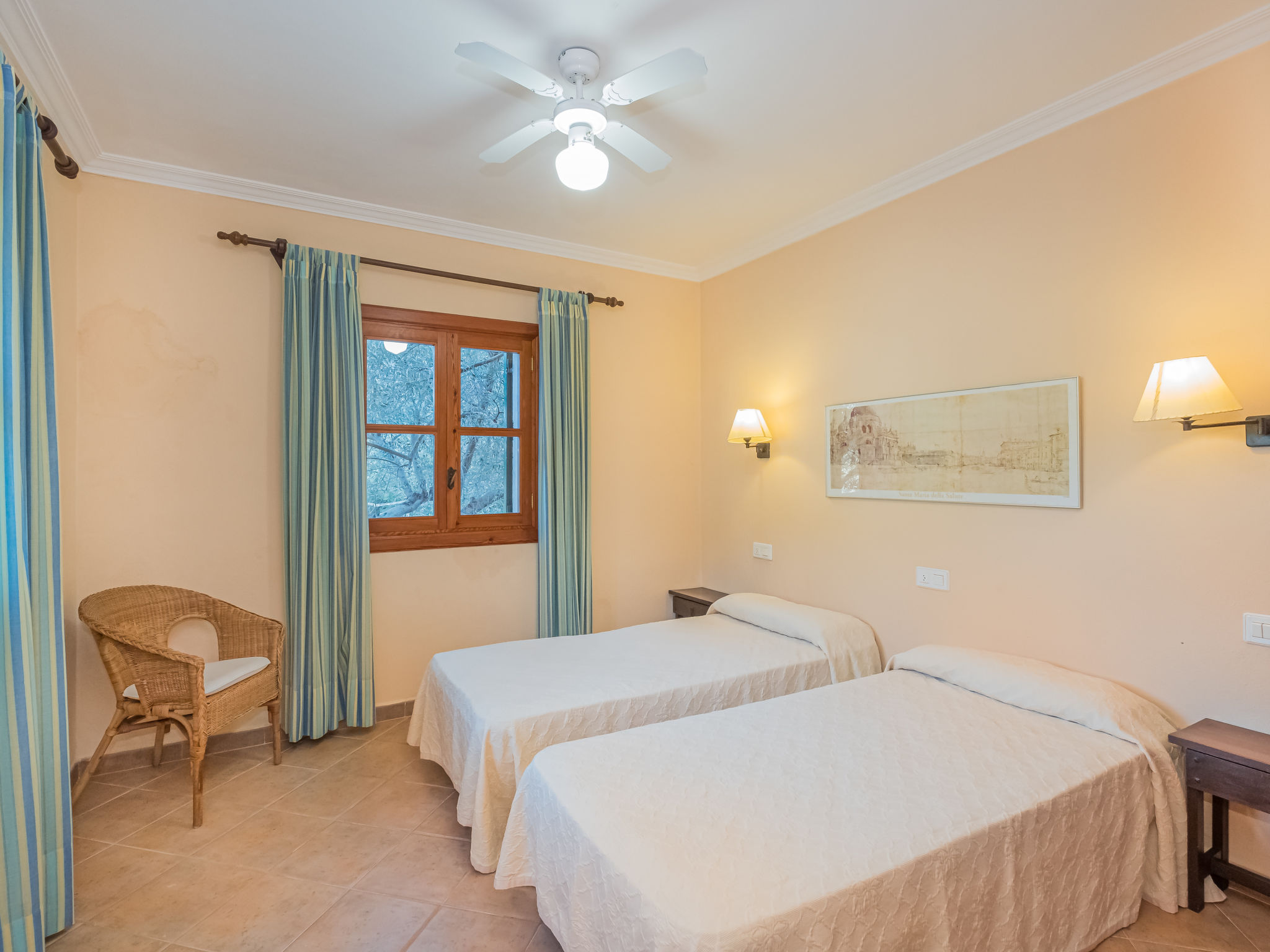 Die traditionsreiche Naturstein-Finca steht in herrlicher Panoramalage, auf ca. 350 m Höhe, zwischen Caimari (4 km) und Lluc (7 km). Restaurant in Caimari, Supermarkt in Inca (12 km). Zum Wanderweg "Camí Vell de Lluc" ca. 250m. Umgeben vom prächtigen Bergmassiv der Tramuntana genießt man von den Terrassen des Hauses die weite Sicht auf die umliegenden Täler und Berggipfel. Das 70 ha große Hanggrundstück bietet 2 private Spazierwege durch die hügelige Landschaft mit ca. 1500 Olivenbäumen (der Besitzer produziert Olivenöl) und einer kleinen Schafherde. Parkmöglichkeiten auf dem Grundstück. Am Haus ca. 400 m² mit Naturstein geflieste, zur Hangseite abgeschlossene Terrassenflächen, geschmückt mit Blumentöpfen, Bougainvillea und Ziersträuchern. Neben dem Pool (6 x 3 m, gesamte Saison geöffnet, 3x wöchentlich Poolpflege durch einen Gärtner) mit Außendusche, Sonnenterrasse, Sonnenliegen und Sonnenschirm, die gemauerte, überdachte Grillstelle mit Kaltwasseranschluss und Terrassenmobiliar. Gute und geschmackvolle Einrichtung mit einigen mallorquinischen Details. Fliesenböden. Sat-TV (deutsche Programme). Internetzugang (WLAN, inklusive). Waschmaschine, Bügeleisen/-brett, Fön. Öl-Zentralheizung. 2x mobiler Ventilator. Hinweise: Stromversorgung mit Solaranlage und Generator. Rauchen ist im Haus nicht gestattet.