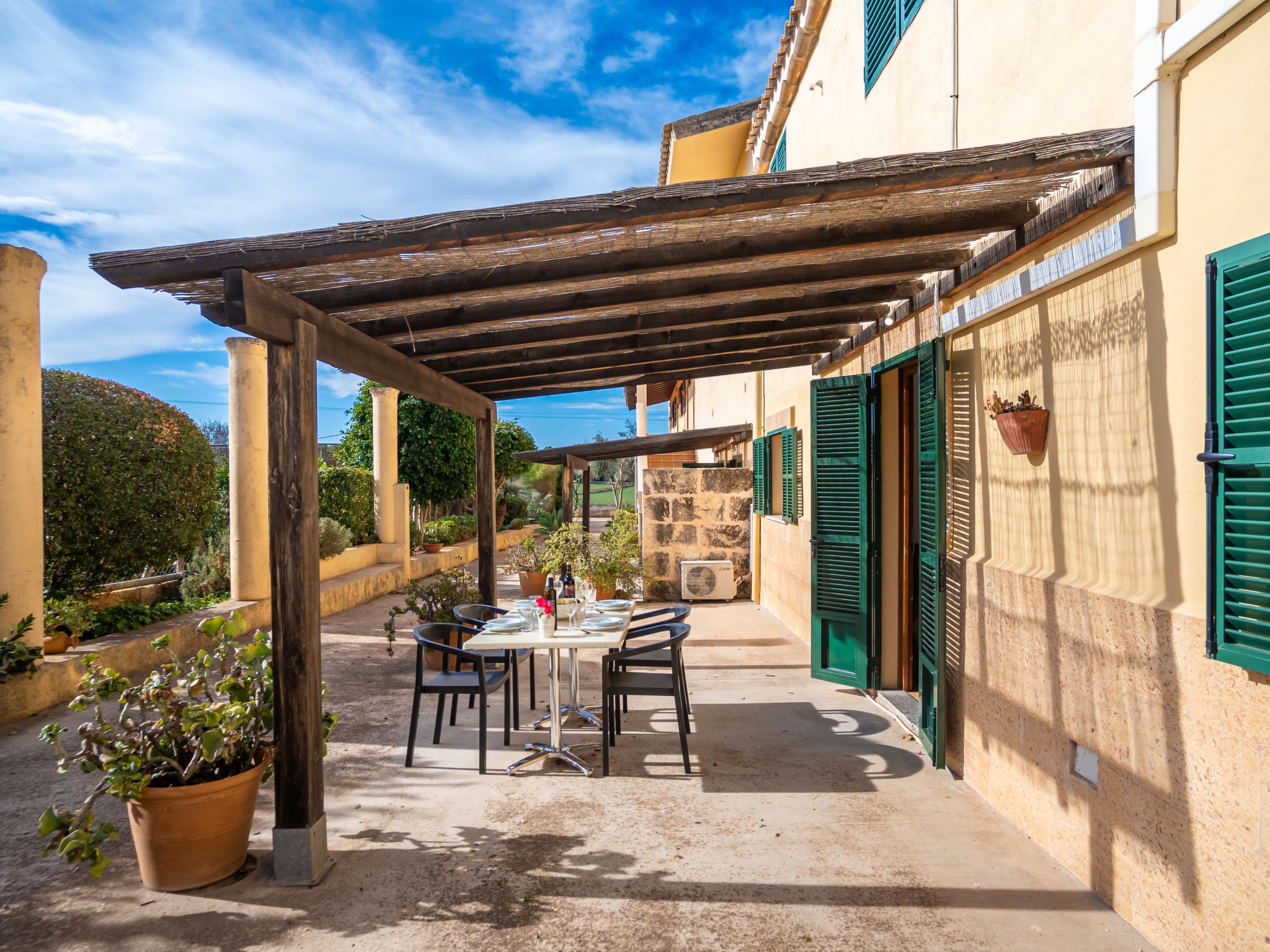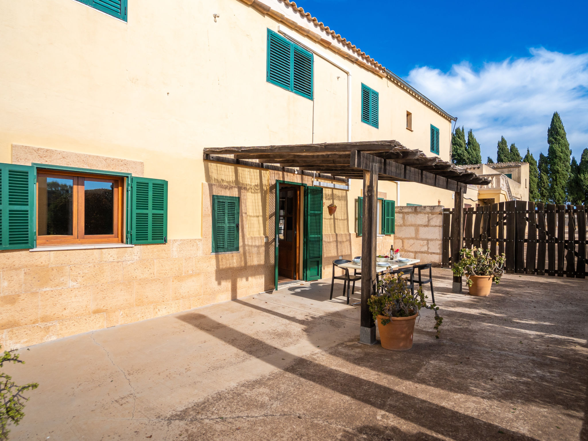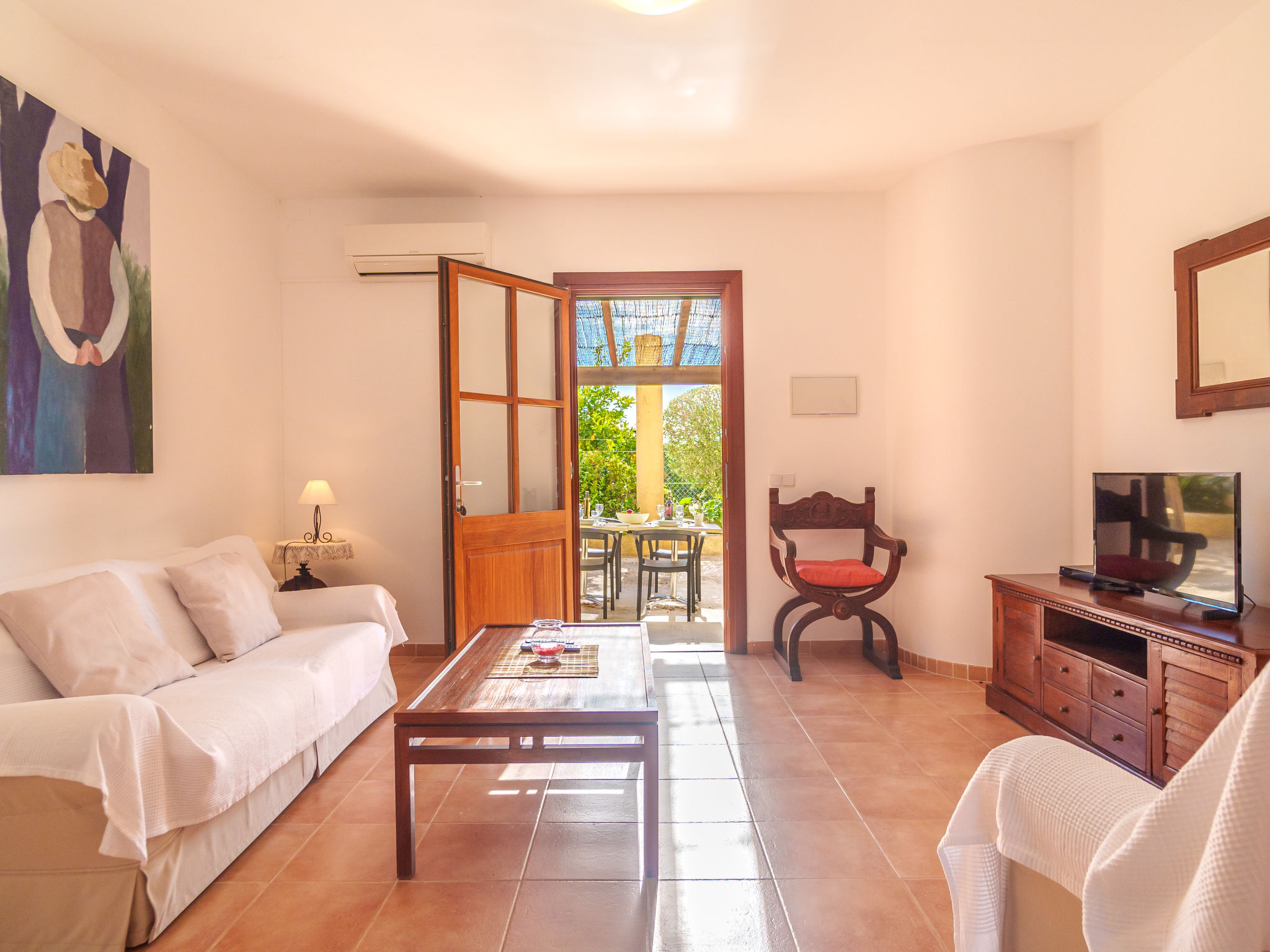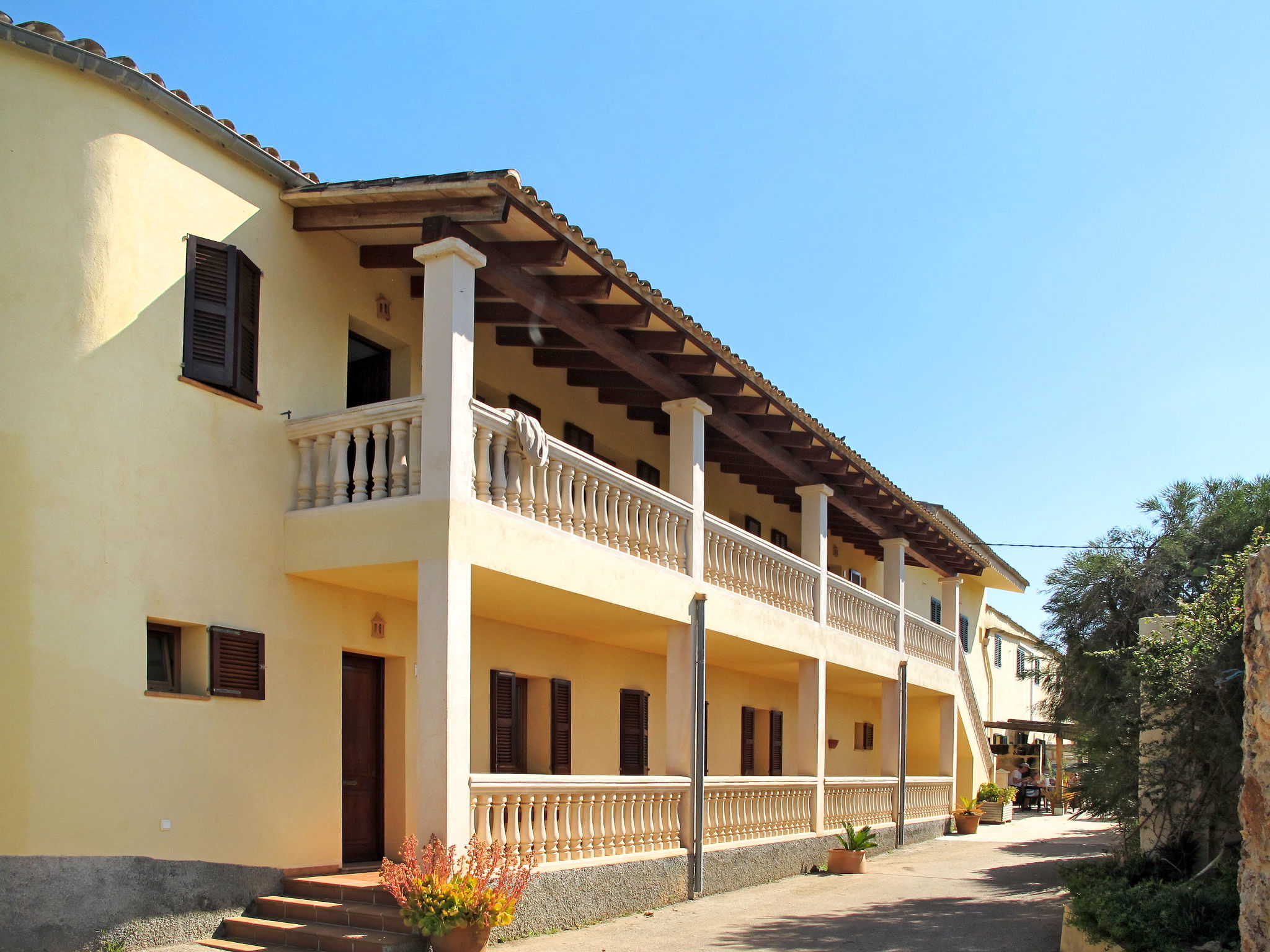 Das Landgut steht im Hinterland der Bucht von Alcúdia, nur 4 km von den langen Sandstränden in Ca'n Picafort entfernt. Nach Muro 7 km. Restaurant 1,5 km. Das ca. 100.000 m² große Grundstück wird größtenteils als Weideland genutzt. Der Besitzer hält Schafe, einen Esel, ein Pony und Hühner. Ein Teil des Grundstückes ist mit Orangen bepflanzt (es darf geerntet werden). Schräg gegenüber vom Gebäude, durch Hecken und Palmen geschützt, liegt der Freizeitbereich des Anwesens: großer, während der gesamten Saison geöffneter Pool (20 x 12 m, davon 5 x 12 m als Kinderbecken abgetrennt), Außendusche, Rasenflächen, Sonnenliegen, Sonnenterrasse, überdachte Terrasse sowie beschatteter Pavillon mit bequemer Sitzgruppe. Tennishartplatz (Schläger und Bälle gratis). Carport. Abschließbarer Fahrradraum. Die Wohnungen MUO 125/126 liegen im rechten Teil des Landgutes. Die beiden großen Wohnungen (MUO 126) liegen nebeneinander im Erdgeschoss. Jeweils große überdachte Terrasse (ca. 25 m²). Die drei kleineren Wohnungen (MUO 125) im Obergeschoss erreicht man über eine Außentreppe, jeweils Terrasse (ca. 15 m²). Vor dem rechten Hausteil des Landgutes ein ca. 300 m² großes Rasengrundstück, das von den Gästen der Ferienwohnungen genutzt werden kann. In dem linken Hausteil des Gebäudes im Erdgeschoss befinden sich die Wohnungen MUO 127/128, jeweils mit großer überdachter Terrasse (30 m²) sowie weiterer Terrasse (10 m²). Das Obergeschoss wird vom Besitzer bewohnt. Auf jeder Terrasse Mobiliar und Grill. Gute Einrichtung. Fliesenböden. Sat-TV (deutsche Programme). Internetzugang (WLAN, inklusive). Waschmaschine, Bügeleisen/-brett, Fön. Klimaanlage mit Kühl-/Heizfunktion. Hinweis: Das Rauchen ist in den Wohnungen nicht gestattet.