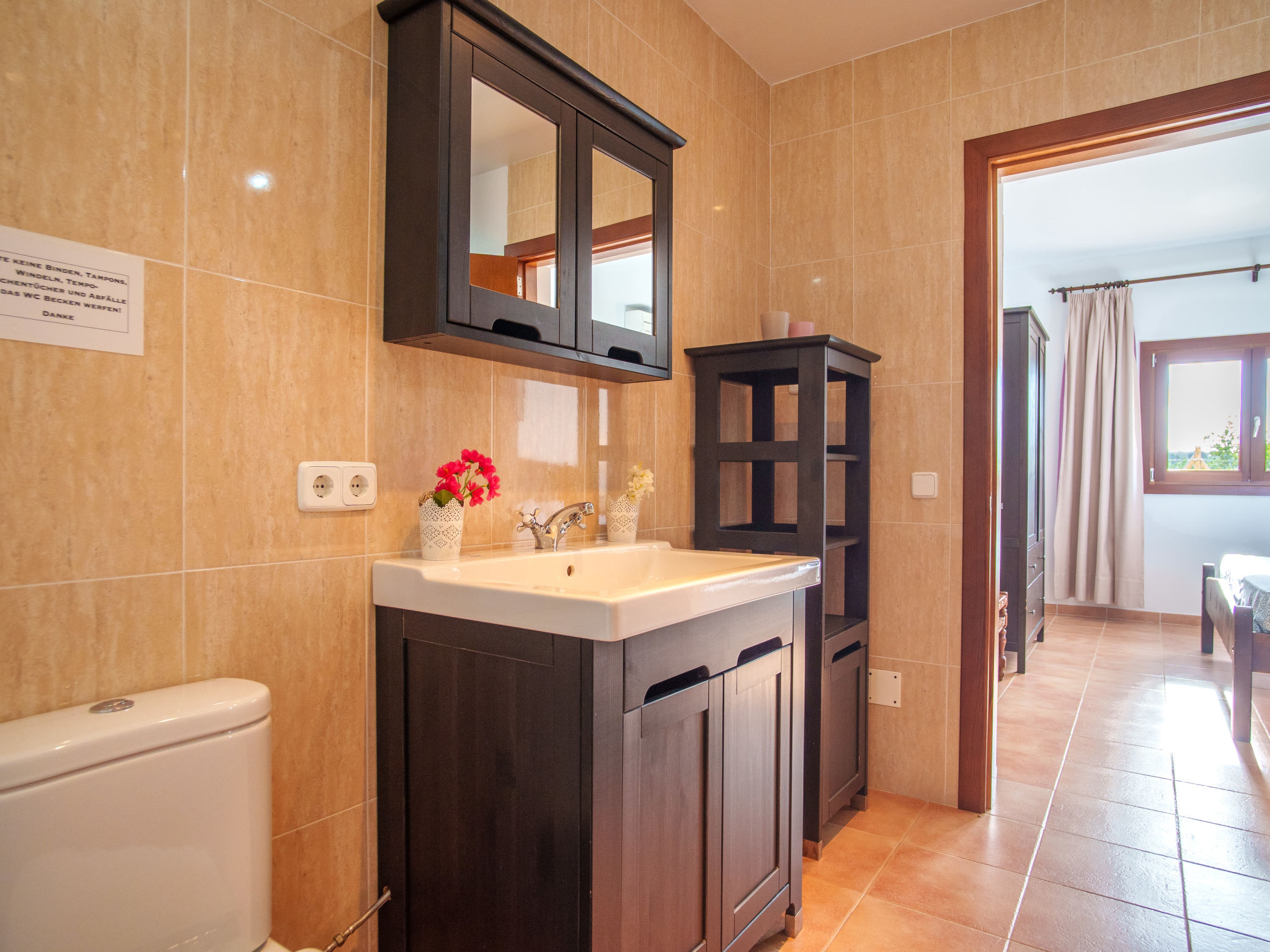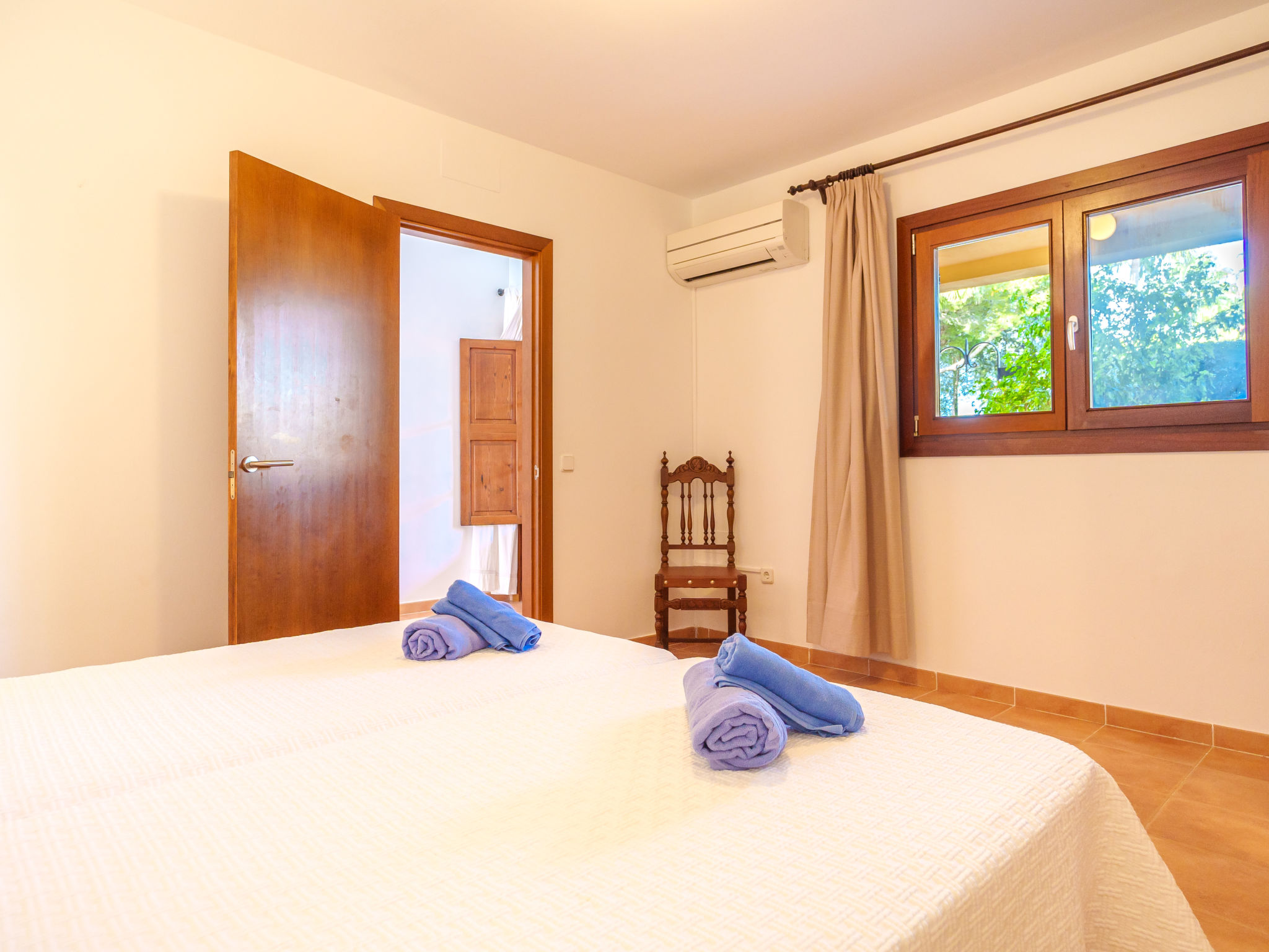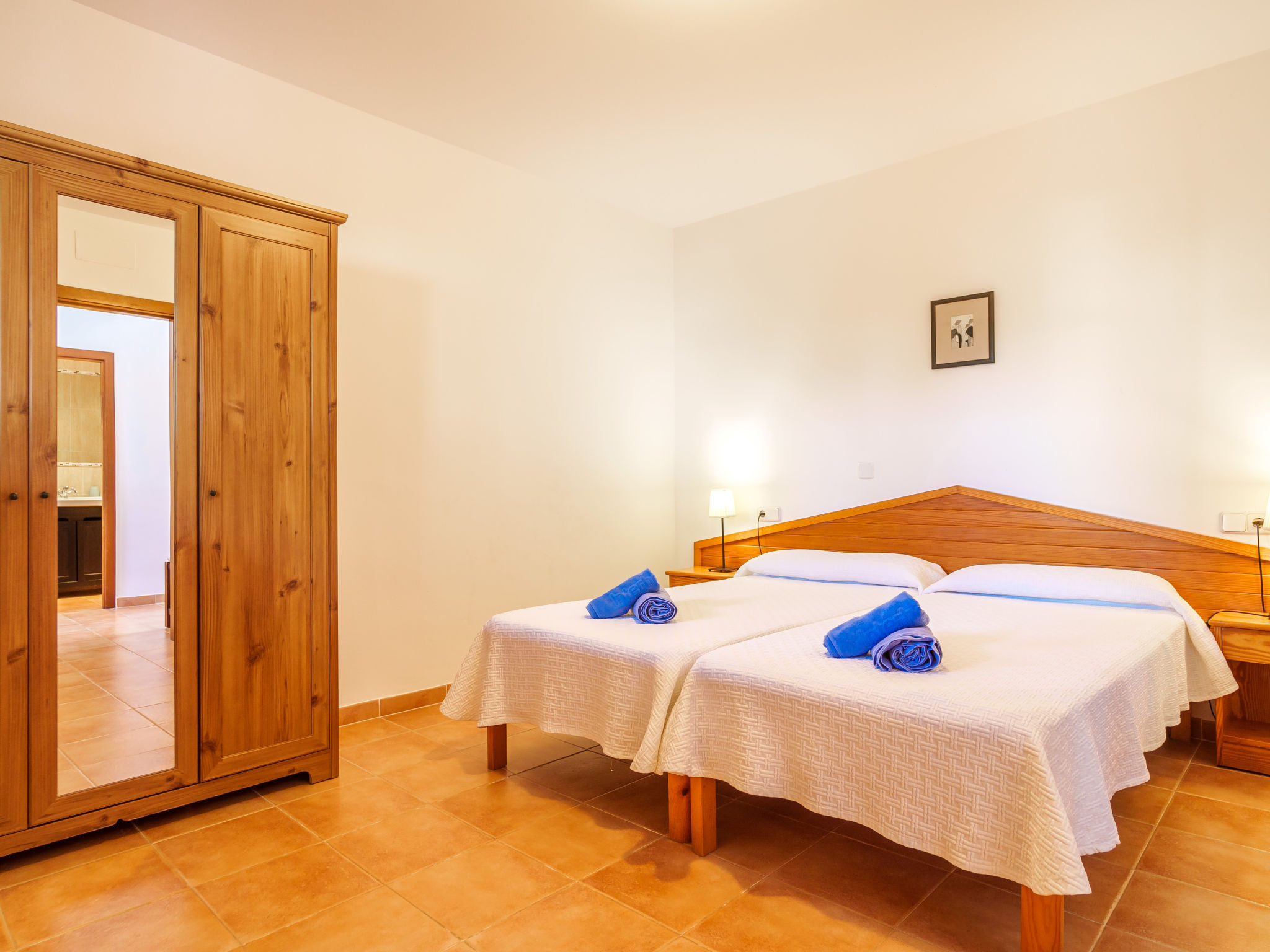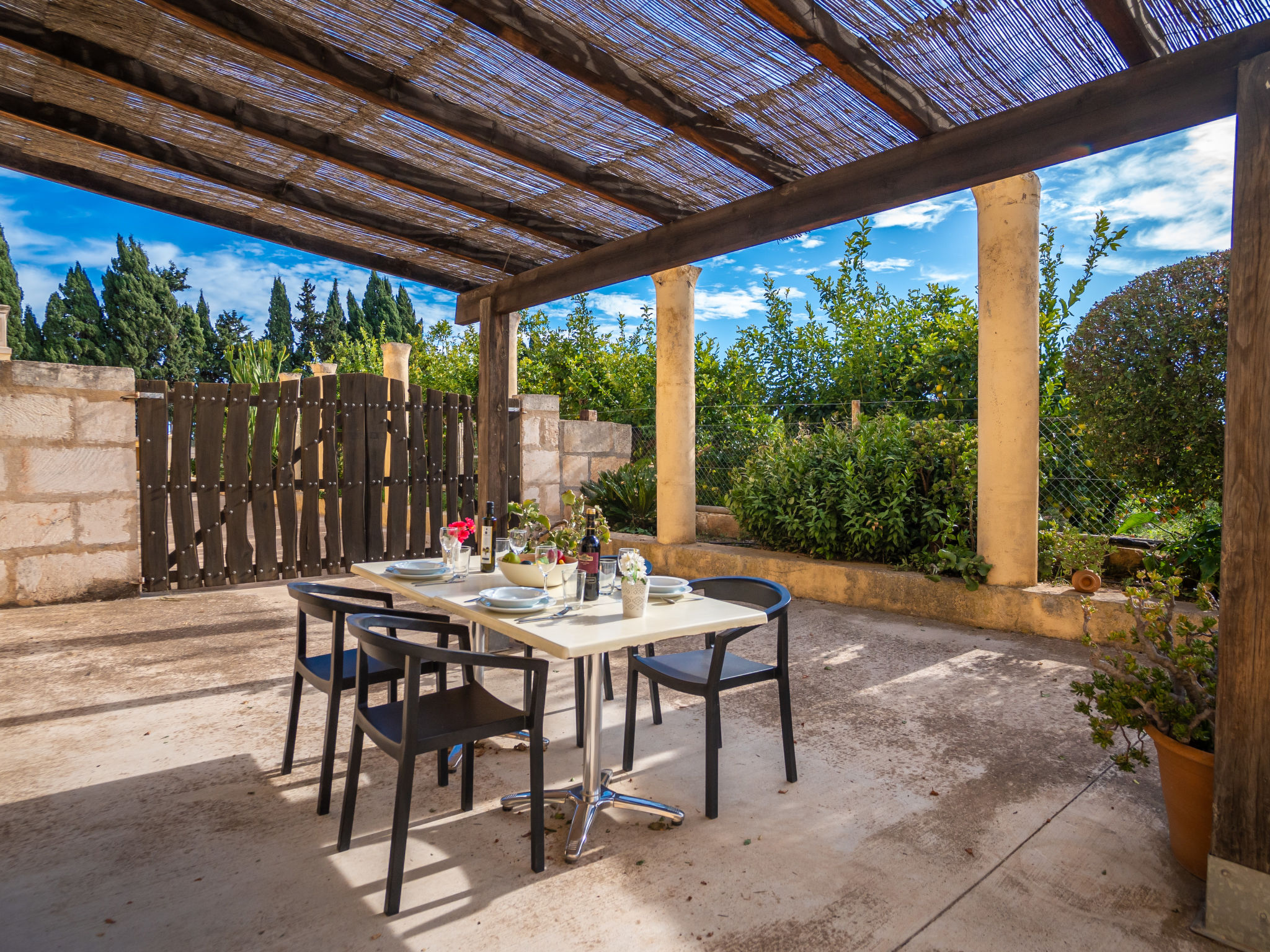 Das Landgut steht im Hinterland der Bucht von Alcúdia, nur 4 km von den langen Sandstränden in Ca'n Picafort entfernt. Nach Muro 7 km. Restaurant 1,5 km. Das ca. 100.000 m² große Grundstück wird größtenteils als Weideland genutzt. Der Besitzer hält Schafe, einen Esel, ein Pony und Hühner. Ein Teil des Grundstückes ist mit Orangen bepflanzt (es darf geerntet werden). Schräg gegenüber vom Gebäude, durch Hecken und Palmen geschützt, liegt der Freizeitbereich des Anwesens: großer, während der gesamten Saison geöffneter Pool (20 x 12 m, davon 5 x 12 m als Kinderbecken abgetrennt), Außendusche, Rasenflächen, Sonnenliegen, Sonnenterrasse, überdachte Terrasse sowie beschatteter Pavillon mit bequemer Sitzgruppe. Tennishartplatz (Schläger und Bälle gratis). Carport. Abschließbarer Fahrradraum. Die Wohnungen MUO 125/126 liegen im rechten Teil des Landgutes. Die beiden großen Wohnungen (MUO 126) liegen nebeneinander im Erdgeschoss. Jeweils große überdachte Terrasse (ca. 25 m²). Die drei kleineren Wohnungen (MUO 125) im Obergeschoss erreicht man über eine Außentreppe, jeweils Terrasse (ca. 15 m²). Vor dem rechten Hausteil des Landgutes ein ca. 300 m² großes Rasengrundstück, das von den Gästen der Ferienwohnungen genutzt werden kann. In dem linken Hausteil des Gebäudes im Erdgeschoss befinden sich die Wohnungen MUO 127/128, jeweils mit großer überdachter Terrasse (30 m²) sowie weiterer Terrasse (10 m²). Das Obergeschoss wird vom Besitzer bewohnt. Auf jeder Terrasse Mobiliar und Grill. Gute Einrichtung. Fliesenböden. Sat-TV (deutsche Programme). Internetzugang (WLAN, inklusive). Waschmaschine, Bügeleisen/-brett, Fön. Klimaanlage mit Kühl-/Heizfunktion. Hinweis: Das Rauchen ist in den Wohnungen nicht gestattet.