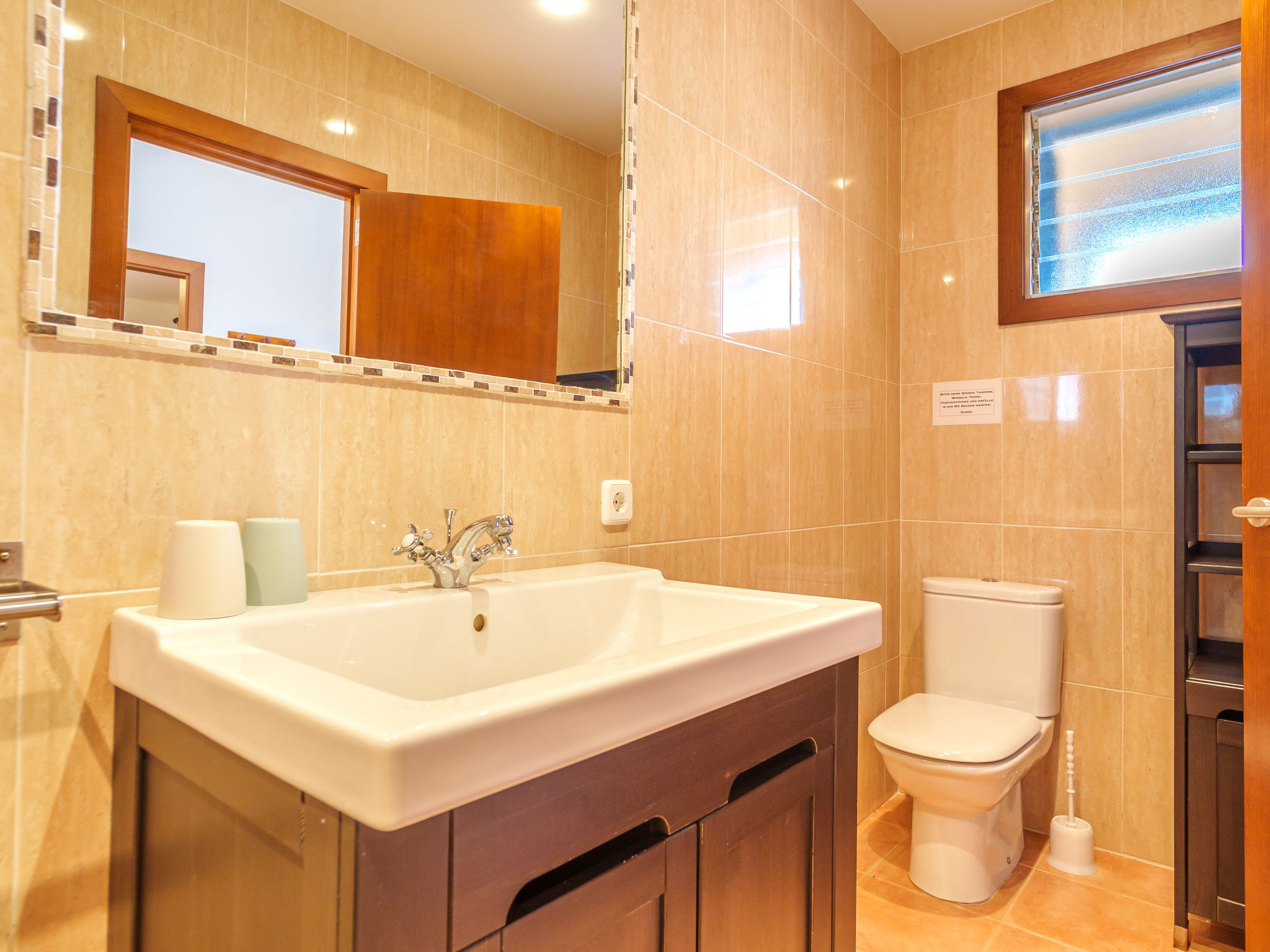 3-Zimmer-Wohnung, Erdgeschoss, ca. 85 m². Wohnraum mit Sitzgruppe, Terrassenausgang. Küche (3 Ceranfelder, Backofen, Mikrowelle, Geschirrspüler, Kühl-/Gefrierkombination, Kaffeemaschine, Wasserkocher, Toaster) mit Essplatz. Doppelzimmer, Dusche/WC. Zweibettzimmer. Dusche/WC. AG 344