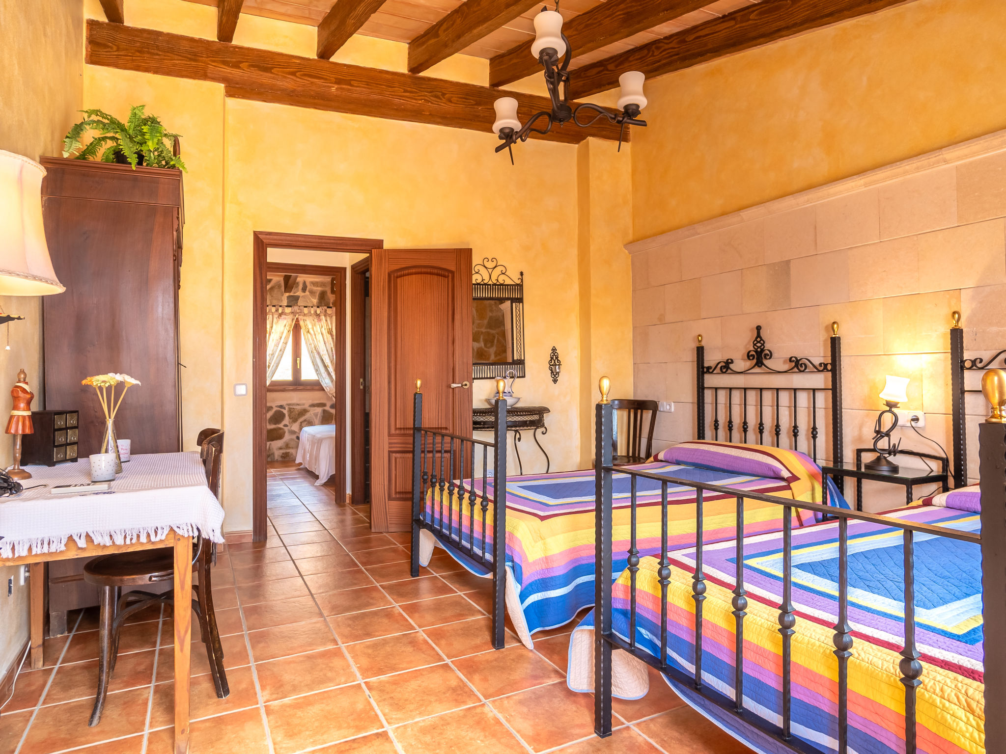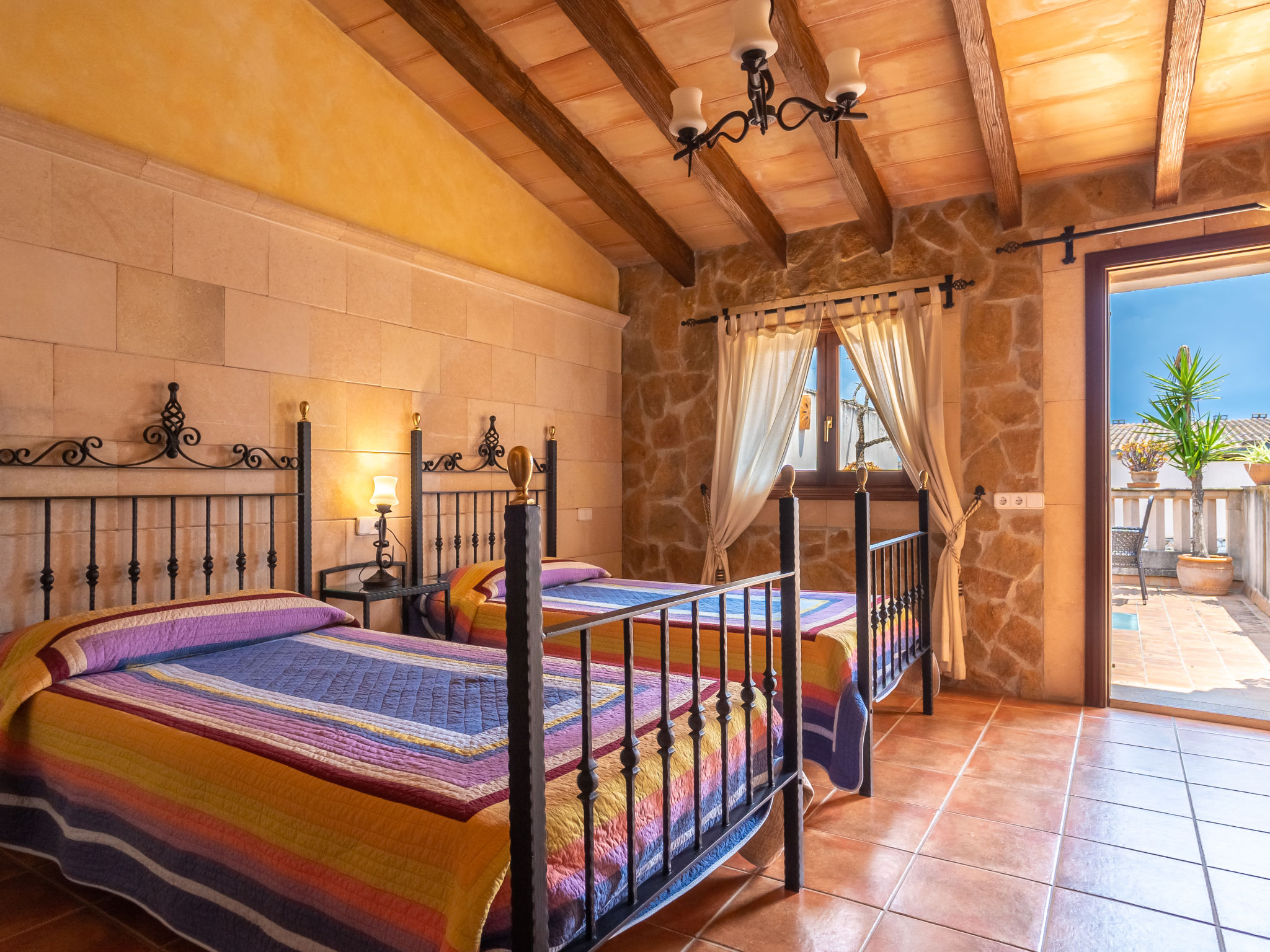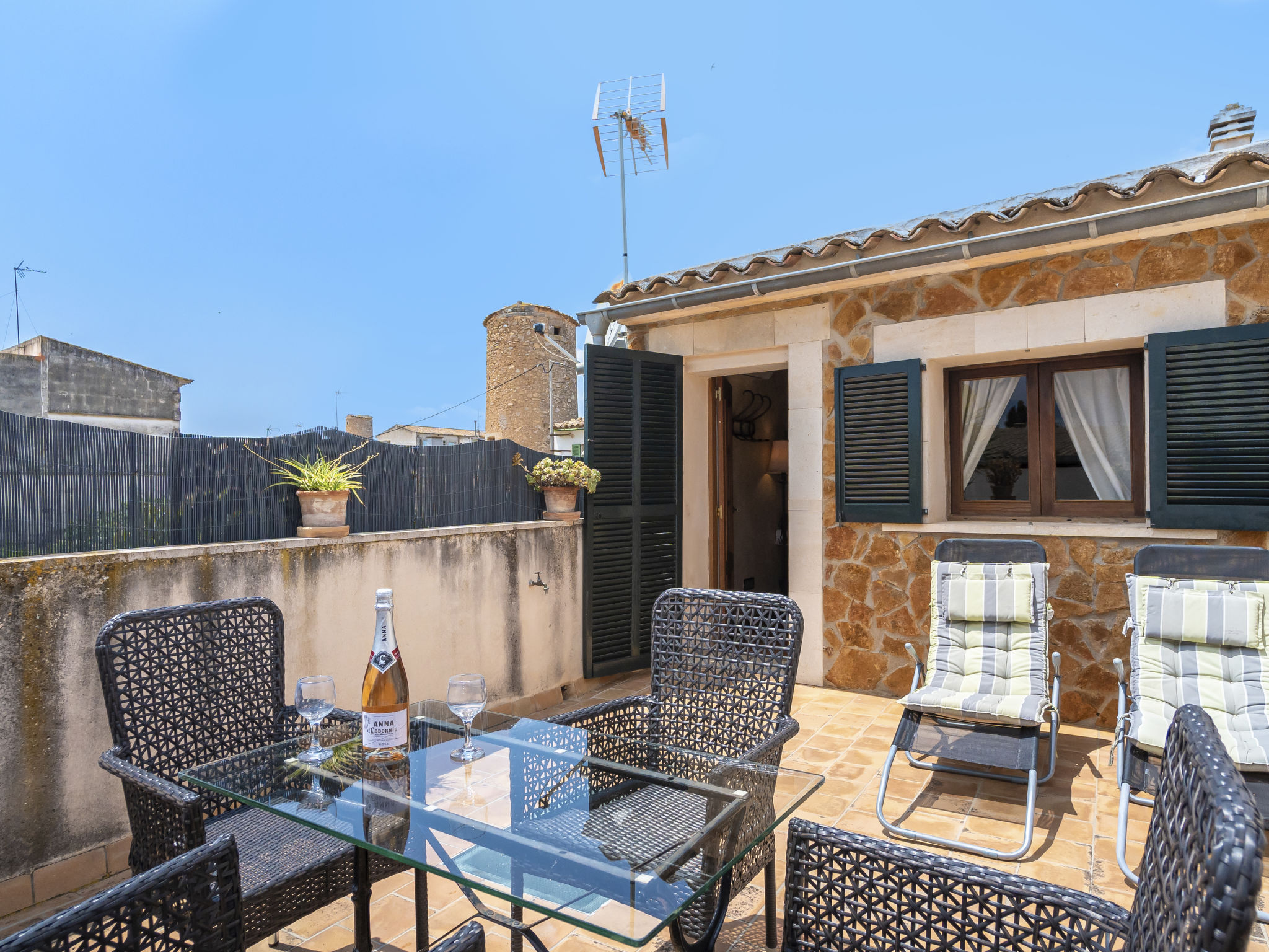 "Pueblo (PSR175)", 3-Zimmer-Haus 100 m2 auf 2 Stockwerken. Geschmackvoll eingerichtet: Wohn-/Schlafzimmer mit 1 Diwanbett, Esstisch, Sat-TV, Digital-TV, Radio und CD. Offene Küche (Backofen, Geschirrspüler, 3 Glaskeramikherd Platten, Toaster, Wasserkocher, Mikrowelle, Tiefkühler, elektrische Kaffeemaschine) mit kleinem Esstisch. Ausgang zur Terrasse. Dusche/WC. Obergeschoss: (steile Treppe) 1 Zimmer mit 1 franz. Bett (145 cm). 1 Zimmer mit 2 Betten. Ausgang zur Terrasse. Sep. WC. Heizung, Klimaanlage. Terrasse 10 m2, Terrasse 15 m2. Terrassenmöbel, Gartengrill, Liegestühle (3). Zur Verfügung: Waschmaschine, Wäschetrockner, Bügeleisen, Kinderhochstuhl, Babybett, Haartrockner. Internet (Wireless LAN, gratis). Bitte beachten: Nichtraucher-Haus. ETV5291