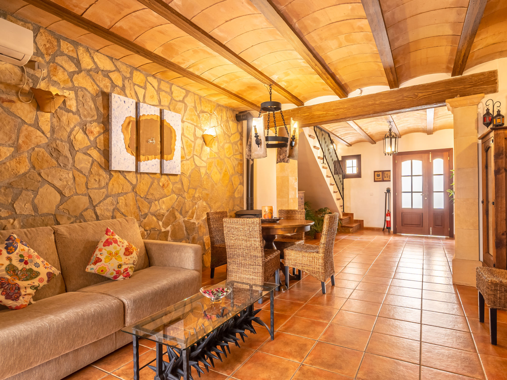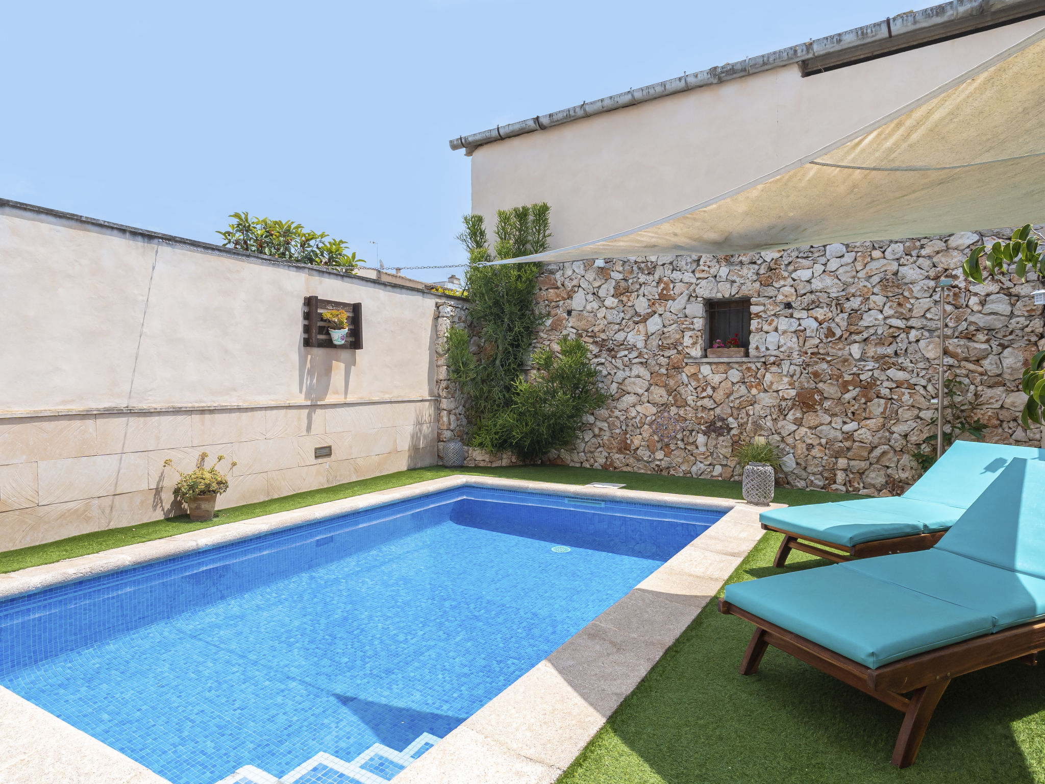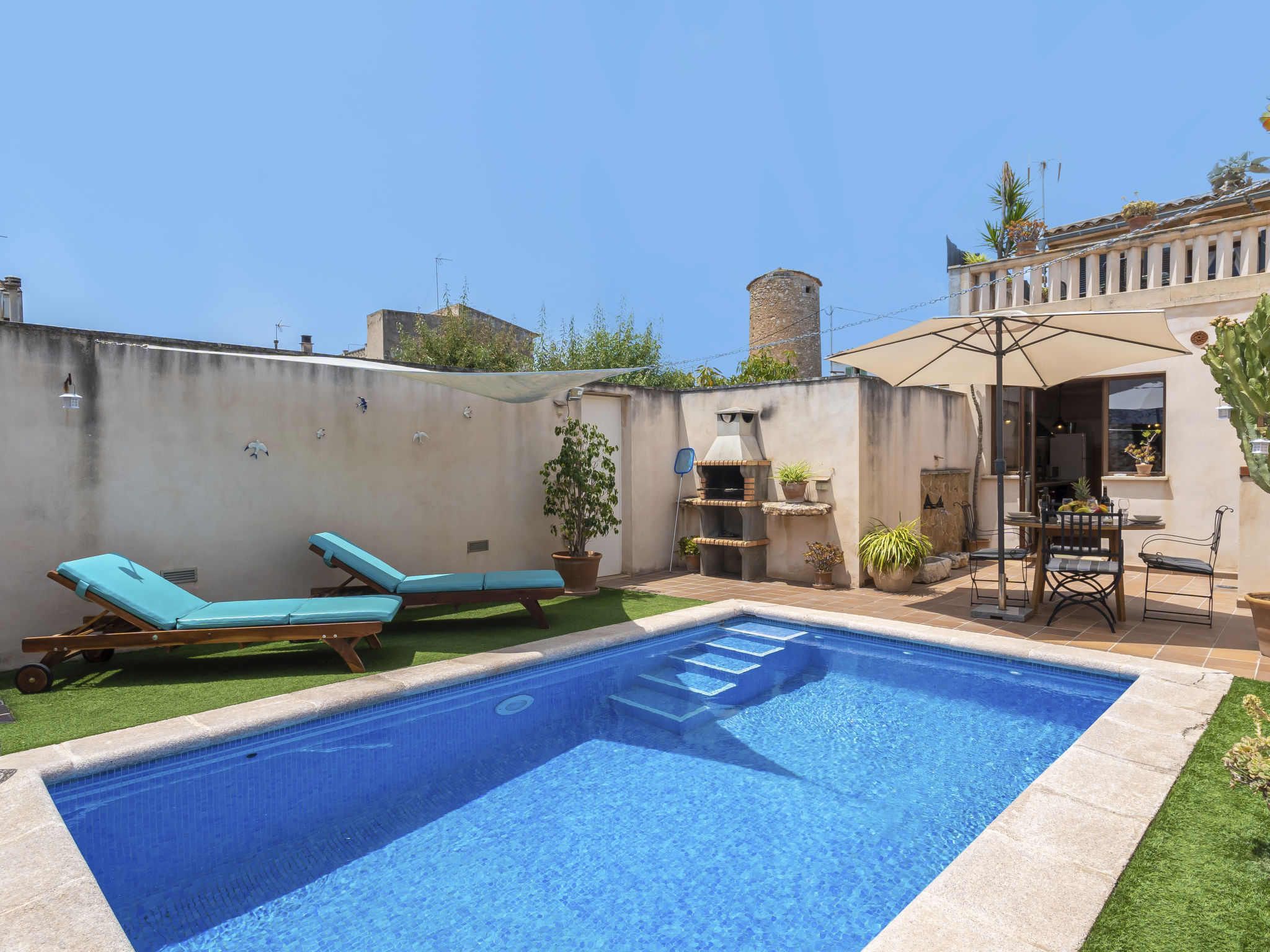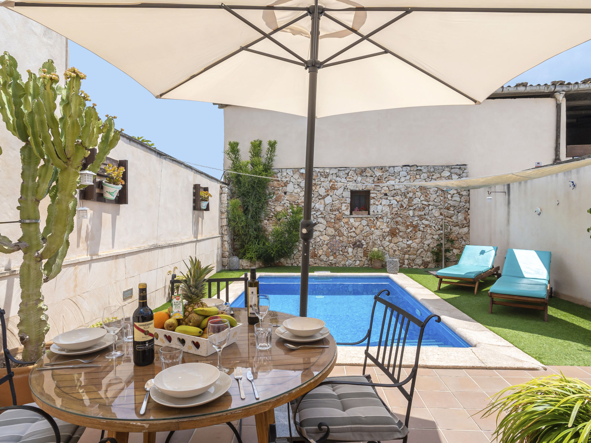 Haus "Pueblo", einseitig angebaut. Im Ort, 400 m vom Zentrum von Porreres, 9.5 km vom Zentrum von Campos, 20 km vom Zentrum von Manacor, 19 km vom Meer. Zur Alleinbenutzung: Grundstück 140 m2 (eingezäunt), Schwimmbad (5 x 3 m, 01.01.-31.12.). Aussendusche, Terrasse. Im Hause: Einstellraum für Fahrräder. Parkplatz auf dem Grundstück. Supermarkt 300 m, Sandstrand "Es Trenc" 19 km. Bitte beachten: Fahrzeug empfohlen.