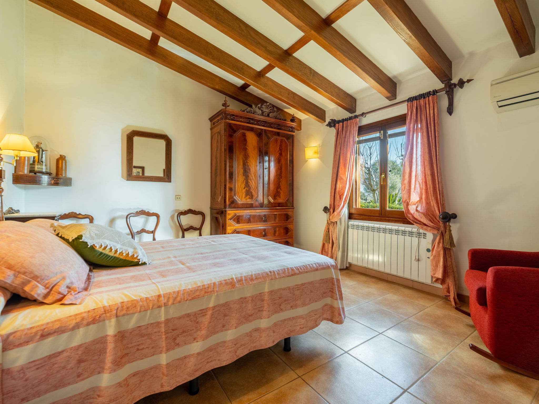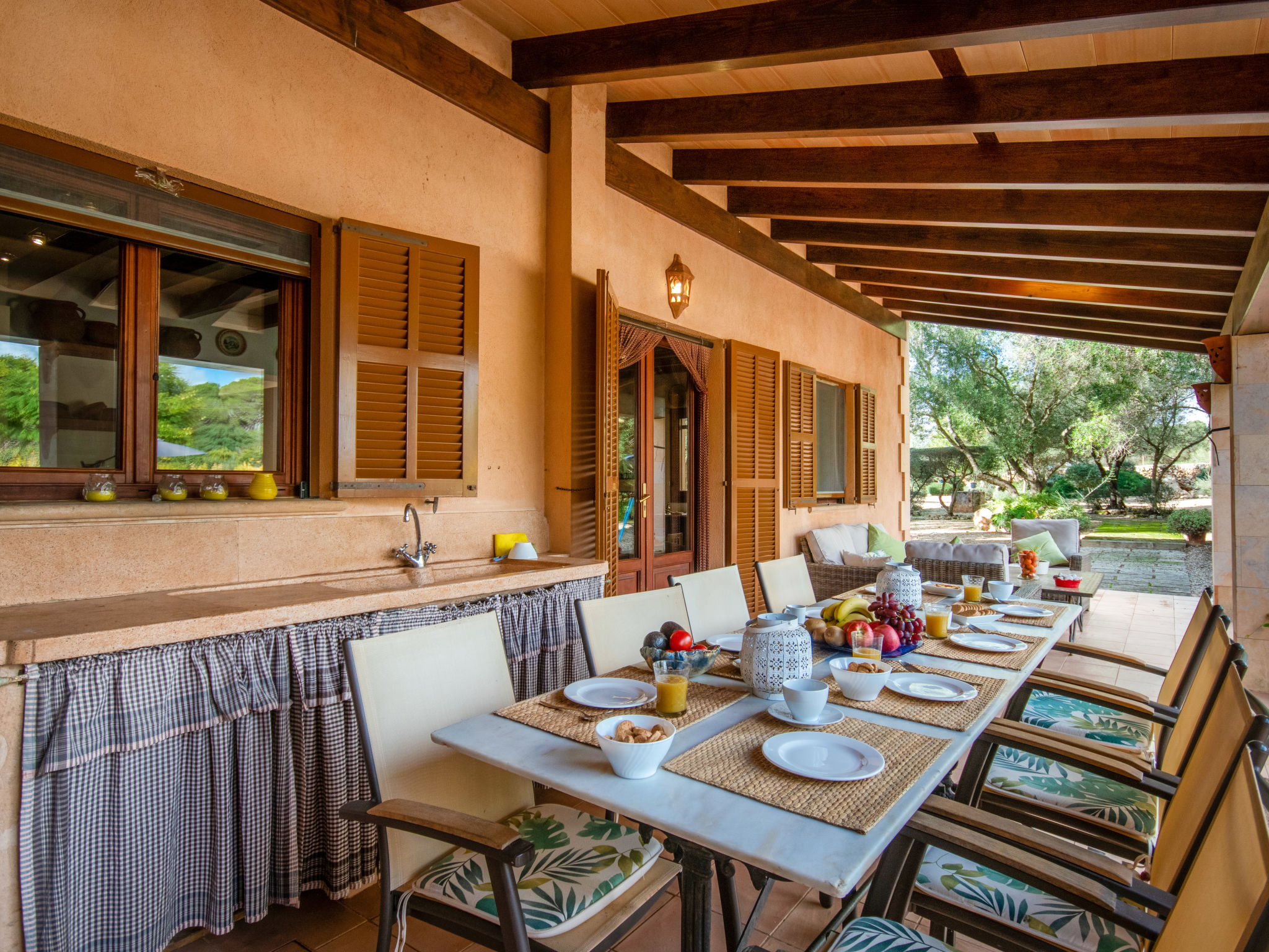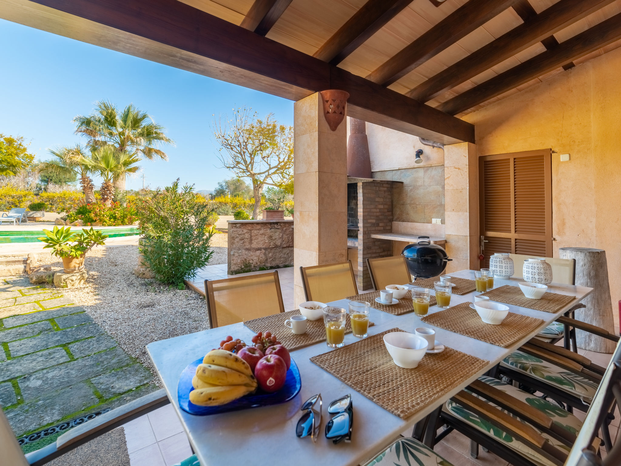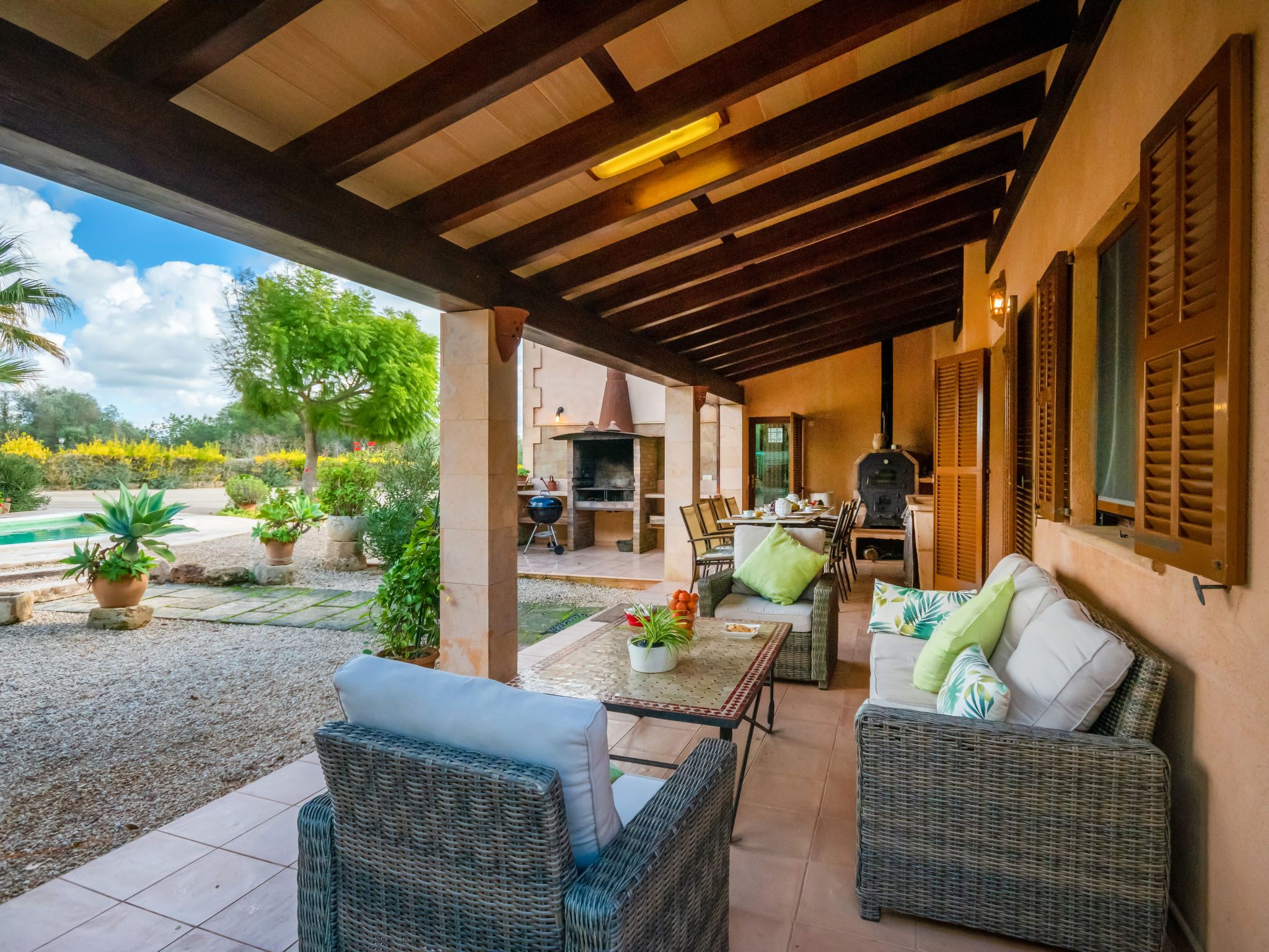 "Es Rafalet", 5-Zimmer-Villa 180 m2 auf 2 Stockwerken. Objekt geeignet für 8 Erwachsene. Geräumig, vollständig renoviert, sehr komfortabel und gemütlich eingerichtet: grosses Wohnzimmer mit offenem Kamin, Digital-TV und Flachbildschirm. Ausgang zum Gartensitzplatz. 1 Doppelzimmer mit Panoramafenster mit 1 franz. Bett (150 cm, Länge 200 cm), Klimaanlage und Warmluftheizung. Wohnküche (4 Kochplatten, Backofen, Geschirrspüler, Toaster, Wasserkocher, Mikrowelle, Tiefkühler, elektrische Kaffeemaschine) mit Esstisch, offenem Kamin (nur Deko). Ausgang zum Gartensitzplatz, zum Schwimmbad. Dusche/WC. Obergeschoss: 1 grosses Doppelzimmer mit Panoramafenster begehbarer Kleiderschrank mit 1 franz. Bett (150 cm, Länge 200 cm), Dusche/Bidet/WC, E-Heizung, Klimaanlage und Warmluftheizung. 1 grosses Doppelzimmer mit Panoramafenster mit 1 franz. Bett (150 cm, Länge 200 cm), E-Heizung, Klimaanlage und Warmluftheizung. 1 Doppelzimmer mit Panoramafenster mit 2 Betten (105 cm, Länge 200 cm), E-Heizung, Klimaanlage und Warmluftheizung. Bad/Dusche/Bidet/WC. E-Heizung. Grosser Gartensitzplatz, Laube. Terrassenmöbel, Balkonmöbel, Gartengrill, Liegestühle, Loggia. Zur Verfügung: Waschmaschine, Wäschetrockner, Bügeleisen, Kinderhochstuhl, Babybett bis 2 Jahre, Haartrockner. Internet (Wireless LAN, gratis). Parkplatz (überdacht) beim Haus. Bitte beachten: Nichtraucher-Haus. Feuerlöscher. ETV2942