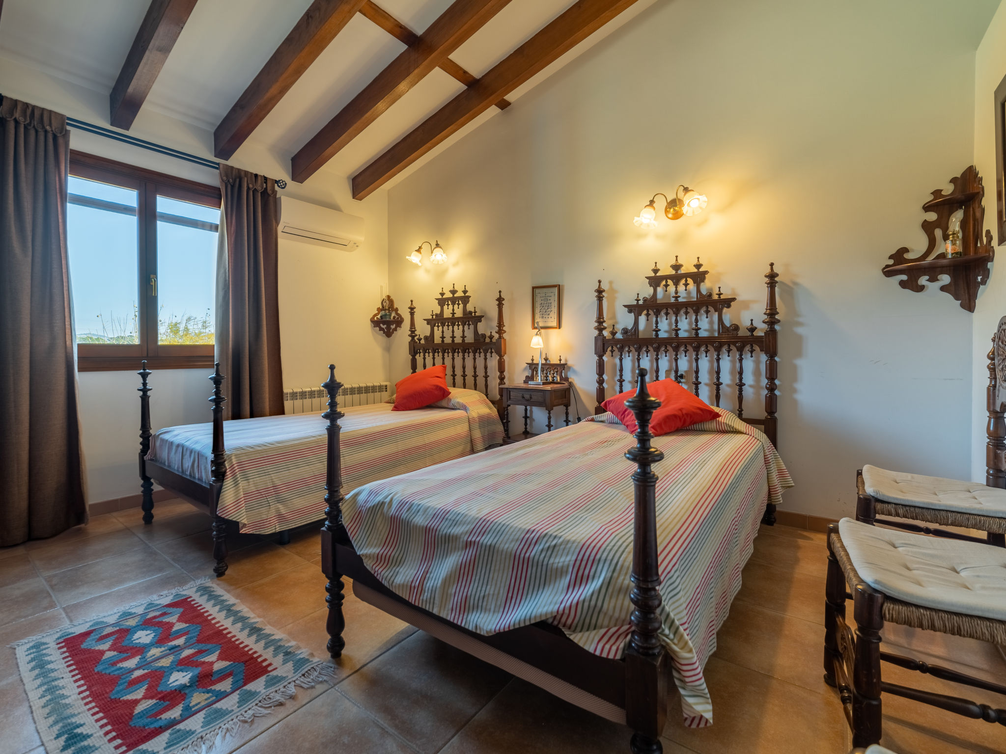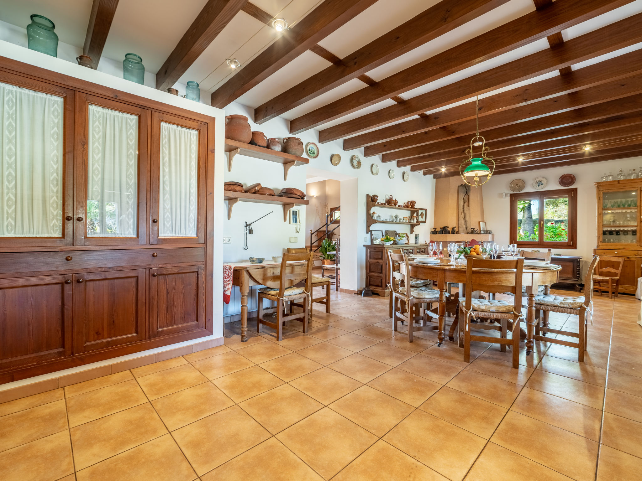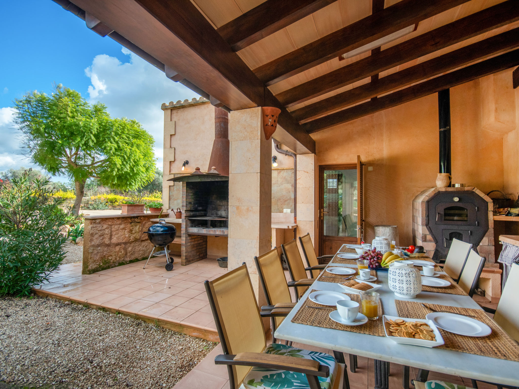 "Es Rafalet", 5-Zimmer-Villa 180 m2 auf 2 Stockwerken. Objekt geeignet für 8 Erwachsene. Geräumig, vollständig renoviert, sehr komfortabel und gemütlich eingerichtet: grosses Wohnzimmer mit offenem Kamin, Digital-TV und Flachbildschirm. Ausgang zum Gartensitzplatz. 1 Doppelzimmer mit Panoramafenster mit 1 franz. Bett (150 cm, Länge 200 cm), Klimaanlage und Warmluftheizung. Wohnküche (4 Kochplatten, Backofen, Geschirrspüler, Toaster, Wasserkocher, Mikrowelle, Tiefkühler, elektrische Kaffeemaschine) mit Esstisch, offenem Kamin (nur Deko). Ausgang zum Gartensitzplatz, zum Schwimmbad. Dusche/WC. Obergeschoss: 1 grosses Doppelzimmer mit Panoramafenster begehbarer Kleiderschrank mit 1 franz. Bett (150 cm, Länge 200 cm), Dusche/Bidet/WC, E-Heizung, Klimaanlage und Warmluftheizung. 1 grosses Doppelzimmer mit Panoramafenster mit 1 franz. Bett (150 cm, Länge 200 cm), E-Heizung, Klimaanlage und Warmluftheizung. 1 Doppelzimmer mit Panoramafenster mit 2 Betten (105 cm, Länge 200 cm), E-Heizung, Klimaanlage und Warmluftheizung. Bad/Dusche/Bidet/WC. E-Heizung. Grosser Gartensitzplatz, Laube. Terrassenmöbel, Balkonmöbel, Gartengrill, Liegestühle, Loggia. Zur Verfügung: Waschmaschine, Wäschetrockner, Bügeleisen, Kinderhochstuhl, Babybett bis 2 Jahre, Haartrockner. Internet (Wireless LAN, gratis). Parkplatz (überdacht) beim Haus. Bitte beachten: Nichtraucher-Haus. Feuerlöscher. ETV2942