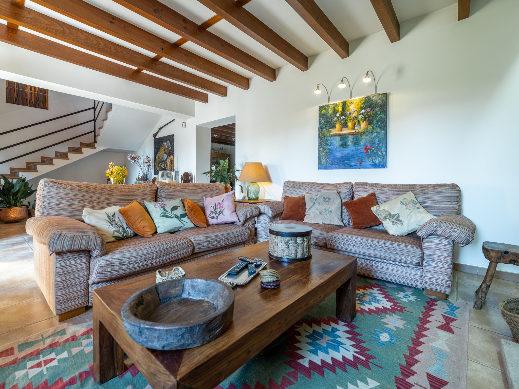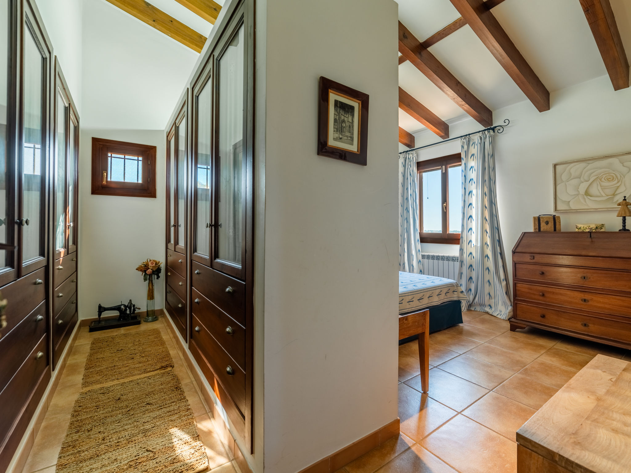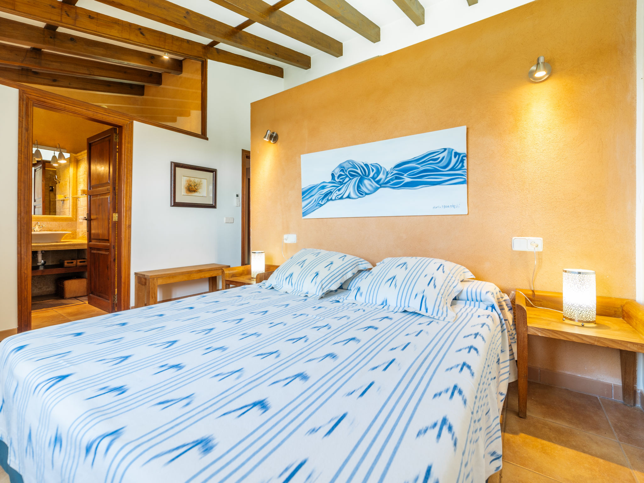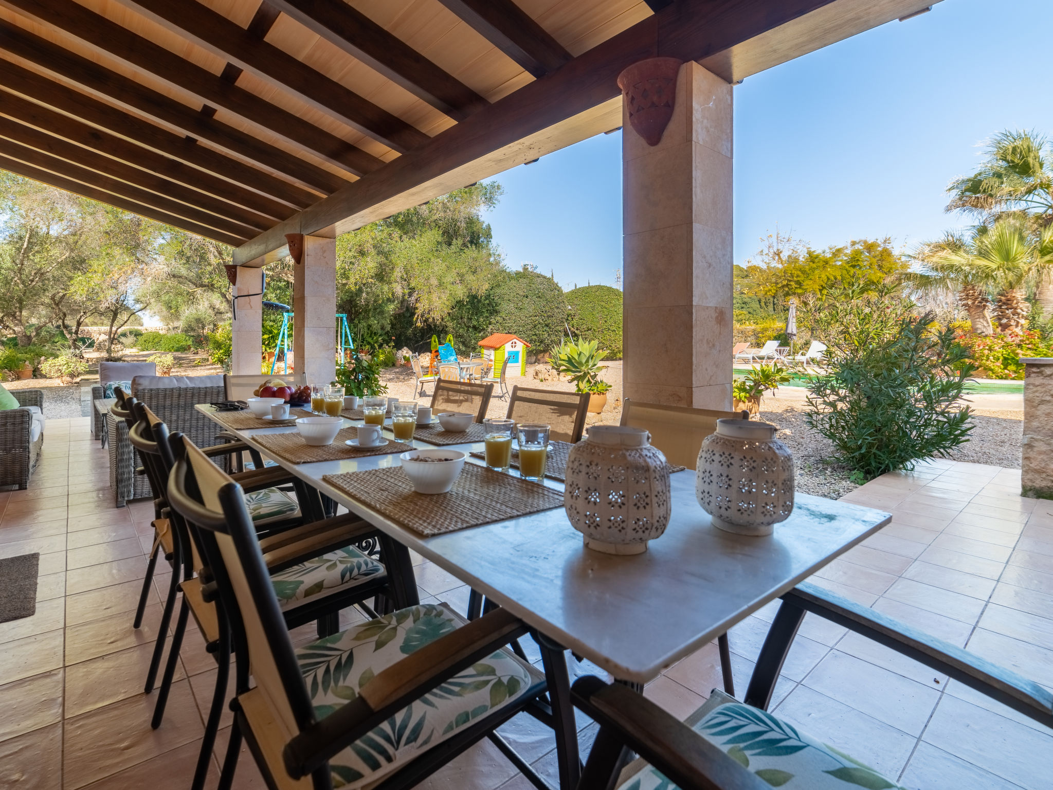 "Es Rafalet", 5-Zimmer-Villa 180 m2 auf 2 Stockwerken. Objekt geeignet für 8 Erwachsene. Geräumig, vollständig renoviert, sehr komfortabel und gemütlich eingerichtet: grosses Wohnzimmer mit offenem Kamin, Digital-TV und Flachbildschirm. Ausgang zum Gartensitzplatz. 1 Doppelzimmer mit Panoramafenster mit 1 franz. Bett (150 cm, Länge 200 cm), Klimaanlage und Warmluftheizung. Wohnküche (4 Kochplatten, Backofen, Geschirrspüler, Toaster, Wasserkocher, Mikrowelle, Tiefkühler, elektrische Kaffeemaschine) mit Esstisch, offenem Kamin (nur Deko). Ausgang zum Gartensitzplatz, zum Schwimmbad. Dusche/WC. Obergeschoss: 1 grosses Doppelzimmer mit Panoramafenster begehbarer Kleiderschrank mit 1 franz. Bett (150 cm, Länge 200 cm), Dusche/Bidet/WC, E-Heizung, Klimaanlage und Warmluftheizung. 1 grosses Doppelzimmer mit Panoramafenster mit 1 franz. Bett (150 cm, Länge 200 cm), E-Heizung, Klimaanlage und Warmluftheizung. 1 Doppelzimmer mit Panoramafenster mit 2 Betten (105 cm, Länge 200 cm), E-Heizung, Klimaanlage und Warmluftheizung. Bad/Dusche/Bidet/WC. E-Heizung. Grosser Gartensitzplatz, Laube. Terrassenmöbel, Balkonmöbel, Gartengrill, Liegestühle, Loggia. Zur Verfügung: Waschmaschine, Wäschetrockner, Bügeleisen, Kinderhochstuhl, Babybett bis 2 Jahre, Haartrockner. Internet (Wireless LAN, gratis). Parkplatz (überdacht) beim Haus. Bitte beachten: Nichtraucher-Haus. Feuerlöscher. ETV2942