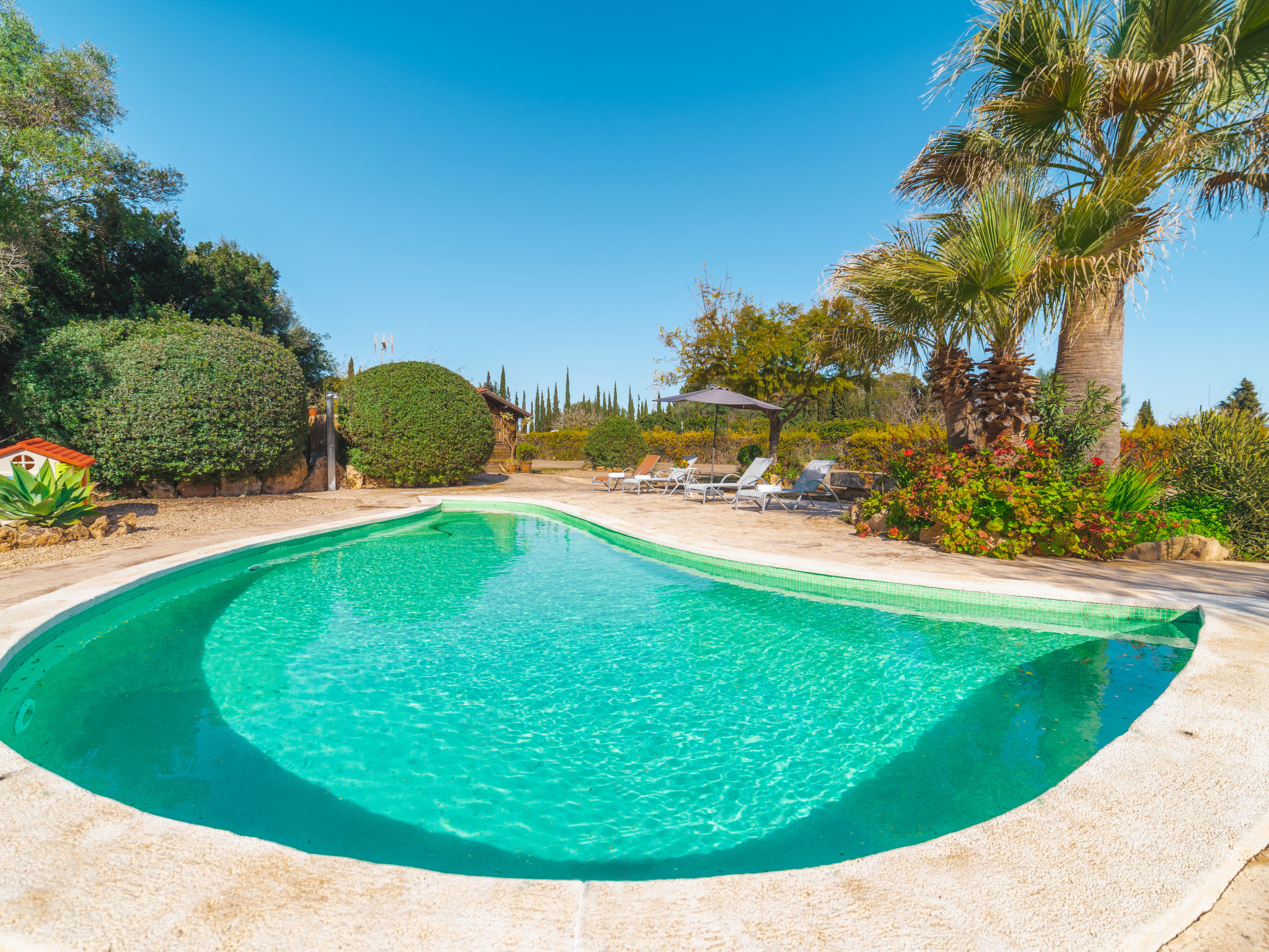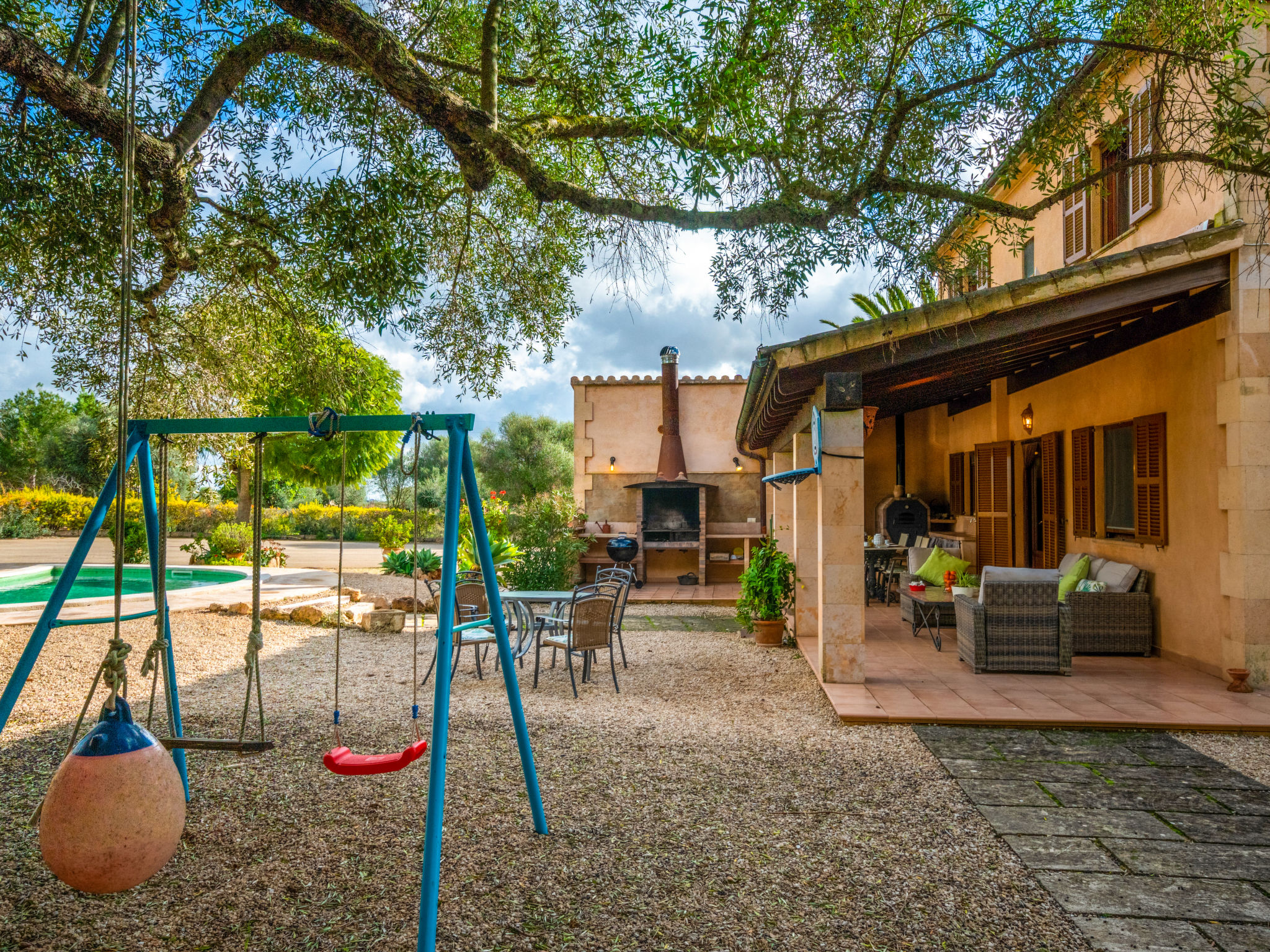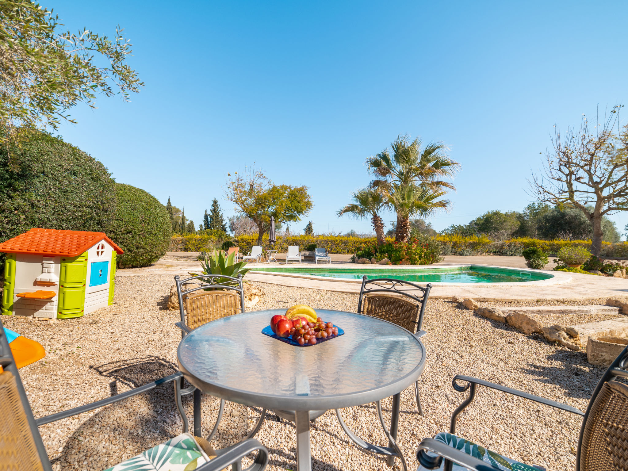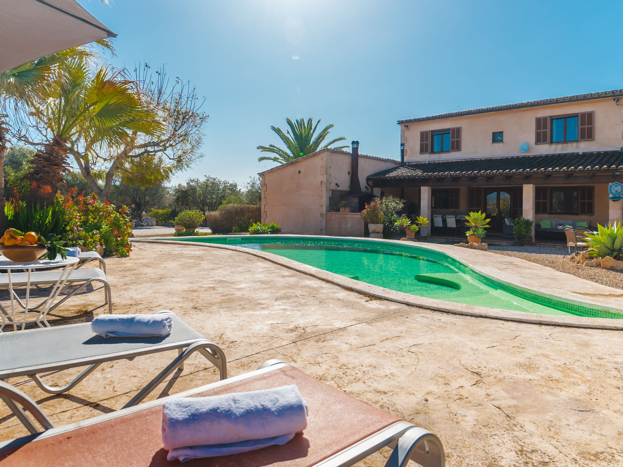 Sehr grosse, schöne, komfortable Finca "Es Rafalet", auf 2 Stockwerken, renoviert. Ausserhalb des Ortes, 5.5 km vom Zentrum von Llucmajor, ruhige, sonnige Lage, 10 km vom Waldrand, 7.2 km vom Meer, im Grünen. Zur Alleinbenutzung: naturbelassenes Grundstück (eingezäunt), schöner, gepflegter Garten mit Pflanzen und Bäumen, Schwimmbad (6 x 4 m, 20 - 150 cm tief, 01.01.-31.12.). Ungleichmässige Schwimmbadform, Tischtennis, Sitzplatz, Laube, Pergola, Gartenmöbel, Grill (Rutschbahn, Schaukel), Poolpflege durch den Besitzer/Gärtner. Im Hause: Internetzugang, Wireless LAN, Einstellraum für Fahrräder, Klimaanlage, Wäscherei, Waschmaschine, Wäschetrockner. Parkplatz (überdacht) beim Haus auf dem Grundstück. Einkaufsgeschäft 6 km, Supermarkt 5.2 km, Einkaufszentrum 15 km, Restaurant 5.5 km, Bar 5.2 km, Bäckerei 5.5 km, Fußgängerzone 6 km, Fahrradverleih 6.9 km, Zentrum zu Fuss in 70 Minuten erreichbar, Bushaltestelle "Polígono Son Noguera" 2.3 km, Sandstrand "S'Arenal" 7.2 km, Steinstrand "Es Caló de Sant Antoni" 7.6 km. Sporthafen 7.5 km, Jacht-Hafen 7.5 km, Golfplatz (18 Loch) 3.1 km, Segelschule 7.5 km, Tennis 7.6 km, Wanderwege ab Haus, Radweg 500 m. Nahe gelegene Sehenswürdigkeiten: Pueblos de Llucmajor, Campos, Algaida. Ciudad Palma de Mallorca 20 km, Acuatic Park Aqualand 7 km, Fan Mallorca Shoping Center 16 km, Golf Son Antem 3.1 km, Bodegas Bordoy 11.5 km. Wandergebiete: Santuari de Cura 16 km, Serra de Tramuntana 45 km. Bitte beachten: Fahrzeug empfohlen. Geeignet für Familien, geeignet für Senioren. Objekt geeignet für 8 Erwachsene. Der Besitzer akzeptiert keine Jugendgruppen. Autobahn in der Nähe. Flugplatz 16 km vom Haus.