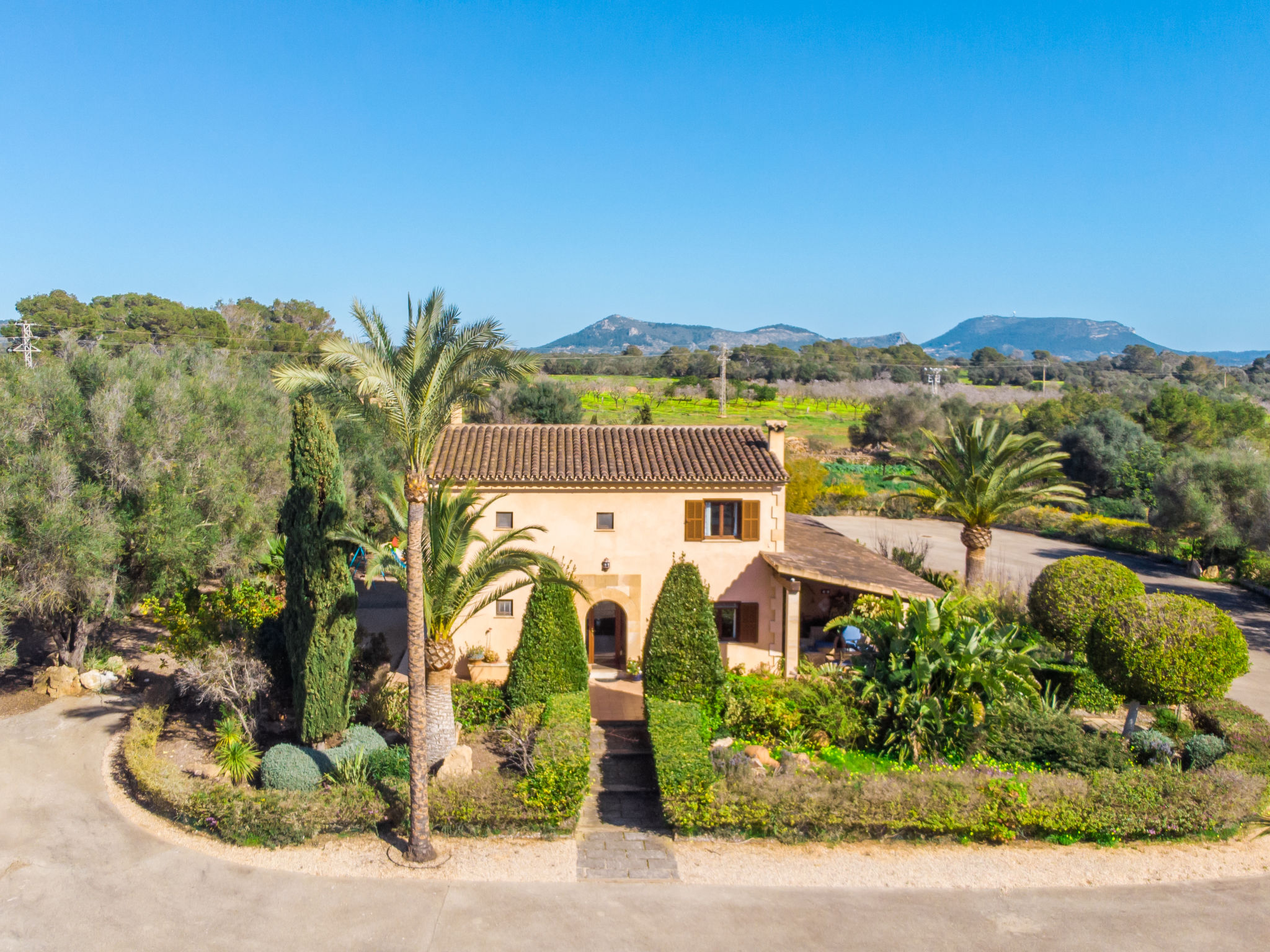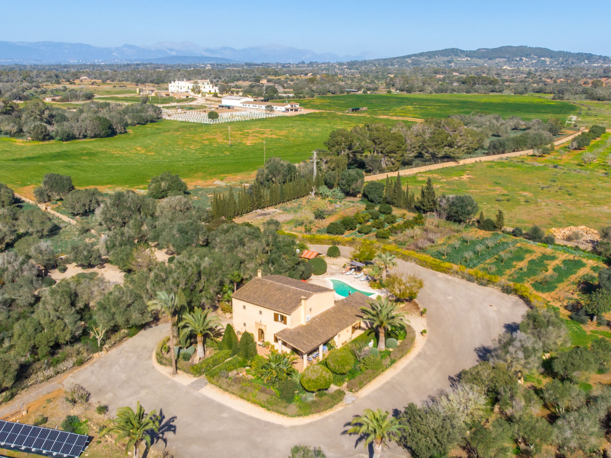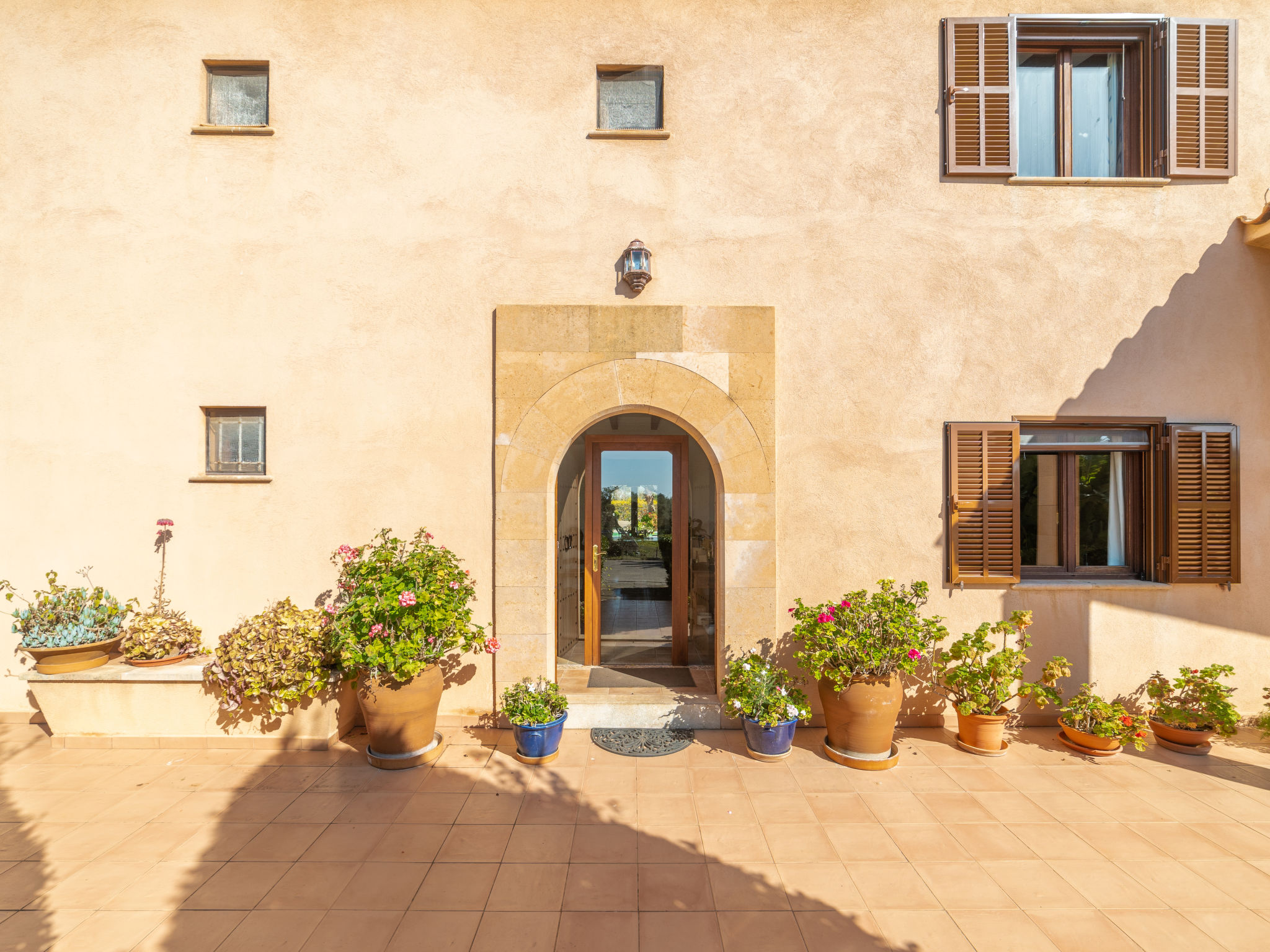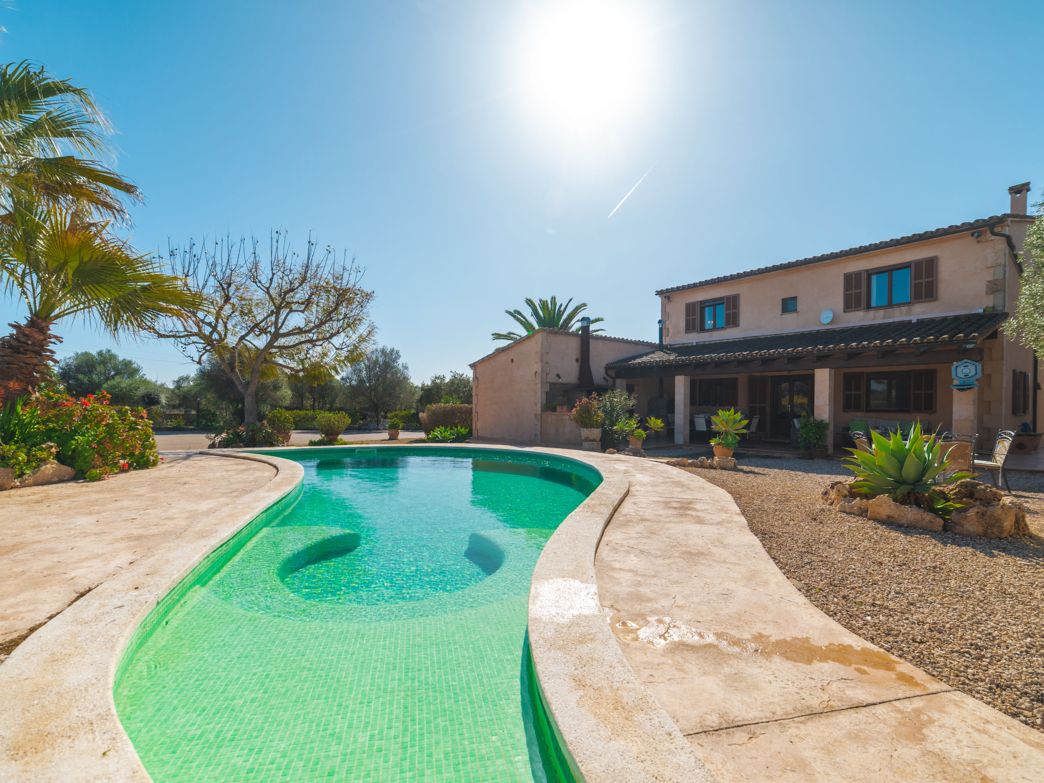 Sehr grosse, schöne, komfortable Finca "Es Rafalet", auf 2 Stockwerken, renoviert. Ausserhalb des Ortes, 5.5 km vom Zentrum von Llucmajor, ruhige, sonnige Lage, 10 km vom Waldrand, 7.2 km vom Meer, im Grünen. Zur Alleinbenutzung: naturbelassenes Grundstück (eingezäunt), schöner, gepflegter Garten mit Pflanzen und Bäumen, Schwimmbad (6 x 4 m, 20 - 150 cm tief, 01.01.-31.12.). Ungleichmässige Schwimmbadform, Tischtennis, Sitzplatz, Laube, Pergola, Gartenmöbel, Grill (Rutschbahn, Schaukel), Poolpflege durch den Besitzer/Gärtner. Im Hause: Internetzugang, Wireless LAN, Einstellraum für Fahrräder, Klimaanlage, Wäscherei, Waschmaschine, Wäschetrockner. Parkplatz (überdacht) beim Haus auf dem Grundstück. Einkaufsgeschäft 6 km, Supermarkt 5.2 km, Einkaufszentrum 15 km, Restaurant 5.5 km, Bar 5.2 km, Bäckerei 5.5 km, Fußgängerzone 6 km, Fahrradverleih 6.9 km, Zentrum zu Fuss in 70 Minuten erreichbar, Bushaltestelle "Polígono Son Noguera" 2.3 km, Sandstrand "S'Arenal" 7.2 km, Steinstrand "Es Caló de Sant Antoni" 7.6 km. Sporthafen 7.5 km, Jacht-Hafen 7.5 km, Golfplatz (18 Loch) 3.1 km, Segelschule 7.5 km, Tennis 7.6 km, Wanderwege ab Haus, Radweg 500 m. Nahe gelegene Sehenswürdigkeiten: Pueblos de Llucmajor, Campos, Algaida. Ciudad Palma de Mallorca 20 km, Acuatic Park Aqualand 7 km, Fan Mallorca Shoping Center 16 km, Golf Son Antem 3.1 km, Bodegas Bordoy 11.5 km. Wandergebiete: Santuari de Cura 16 km, Serra de Tramuntana 45 km. Bitte beachten: Fahrzeug empfohlen. Geeignet für Familien, geeignet für Senioren. Objekt geeignet für 8 Erwachsene. Der Besitzer akzeptiert keine Jugendgruppen. Autobahn in der Nähe. Flugplatz 16 km vom Haus.