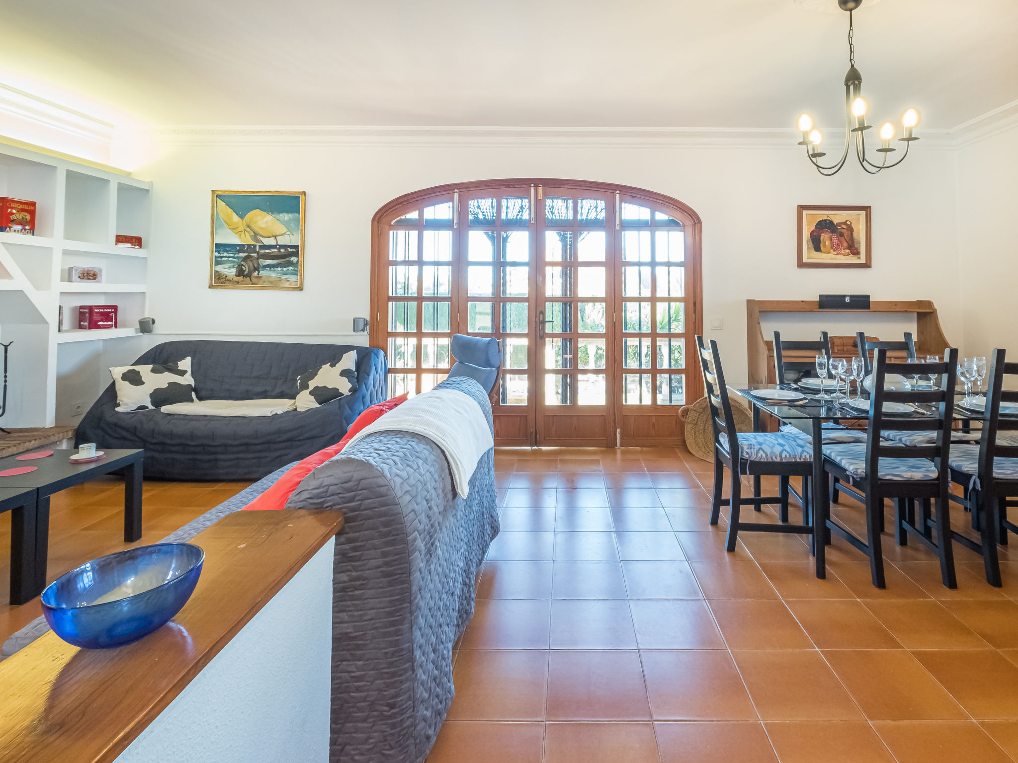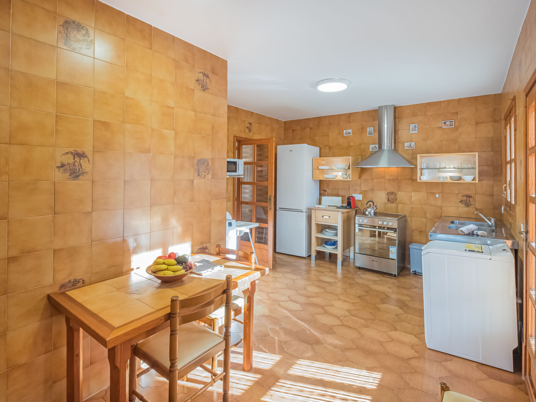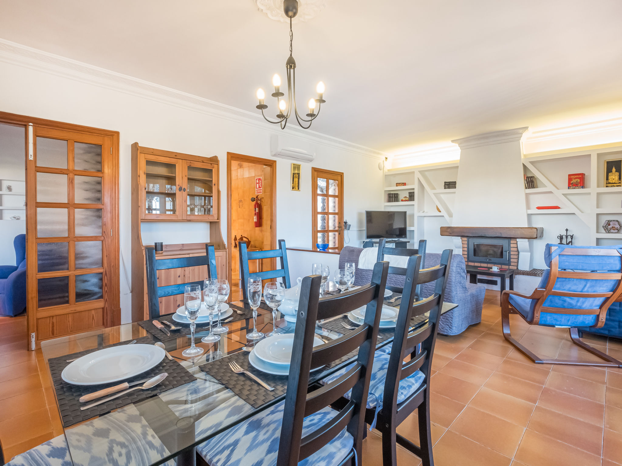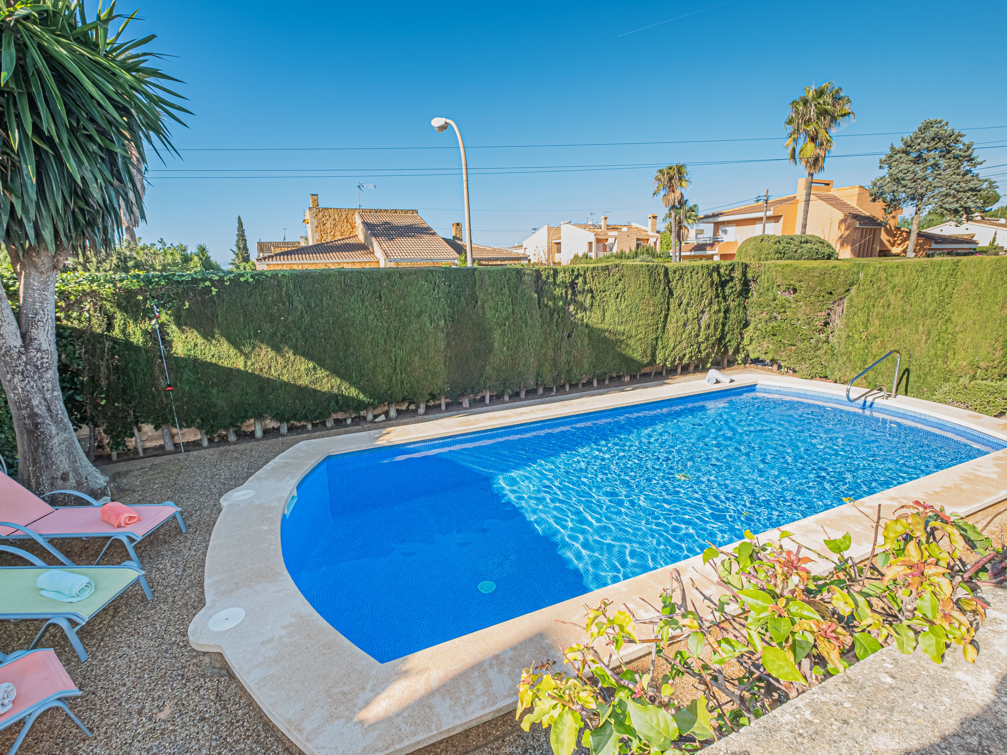 "Dofins Bahia Azul", 4-Zimmer-Villa 180 m2, im erhöhten Erdgeschoss. Objekt geeignet für 6 Erwachsene. Geräumig und hell, teilweise renoviert, zweckmässig und komfortabel eingerichtet: grosses Wohn-/Esszimmer mit offenem Kamin (nur Deko), Esstisch, Digital-TV, Flachbildschirm, E-Heizung, Klimaanlage und Warmluftheizung. Ausgang zum Gartensitzplatz, zum Schwimmbad. 1 grosses Doppelzimmer mit Panoramafenster mit 2 Betten (90 cm, Länge 200 cm), Dusche/WC, Digital-TV, Flachbildschirm, E-Heizung, Klimaanlage und Warmluftheizung. 2 grosse Doppelzimmer, jedes Zimmer mit 2 Betten (105 cm, Länge 200 cm), E-Heizung, Klimaanlage und Warmluftheizung. Wohnküche (Backofen, 3 Glaskeramikherd Platten, Toaster, Wasserkocher, Mikrowelle, Tiefkühler, elektrische Kaffeemaschine) mit Esstisch, E-Heizung. Ausgang zum Gartensitzplatz. Dusche/Bidet/WC. E-Heizung. 2 grosse Terrassen, Garten, Rasen, Laube. Terrassenmöbel, Gartengrill, Liegestühle, Loggia. Sicht auf die Ortschaft. Zur Verfügung: Waschmaschine, Wäschetrockner, Bügeleisen, Kinderhochstuhl, Babybett bis 2 Jahre, Haartrockner. Internet (Wireless LAN, gratis). Parkplatz (eingezäunt) beim Haus. Bitte beachten: geeignet für Familien. Nichtraucher-Haus. Feuerlöscher. ETV7913