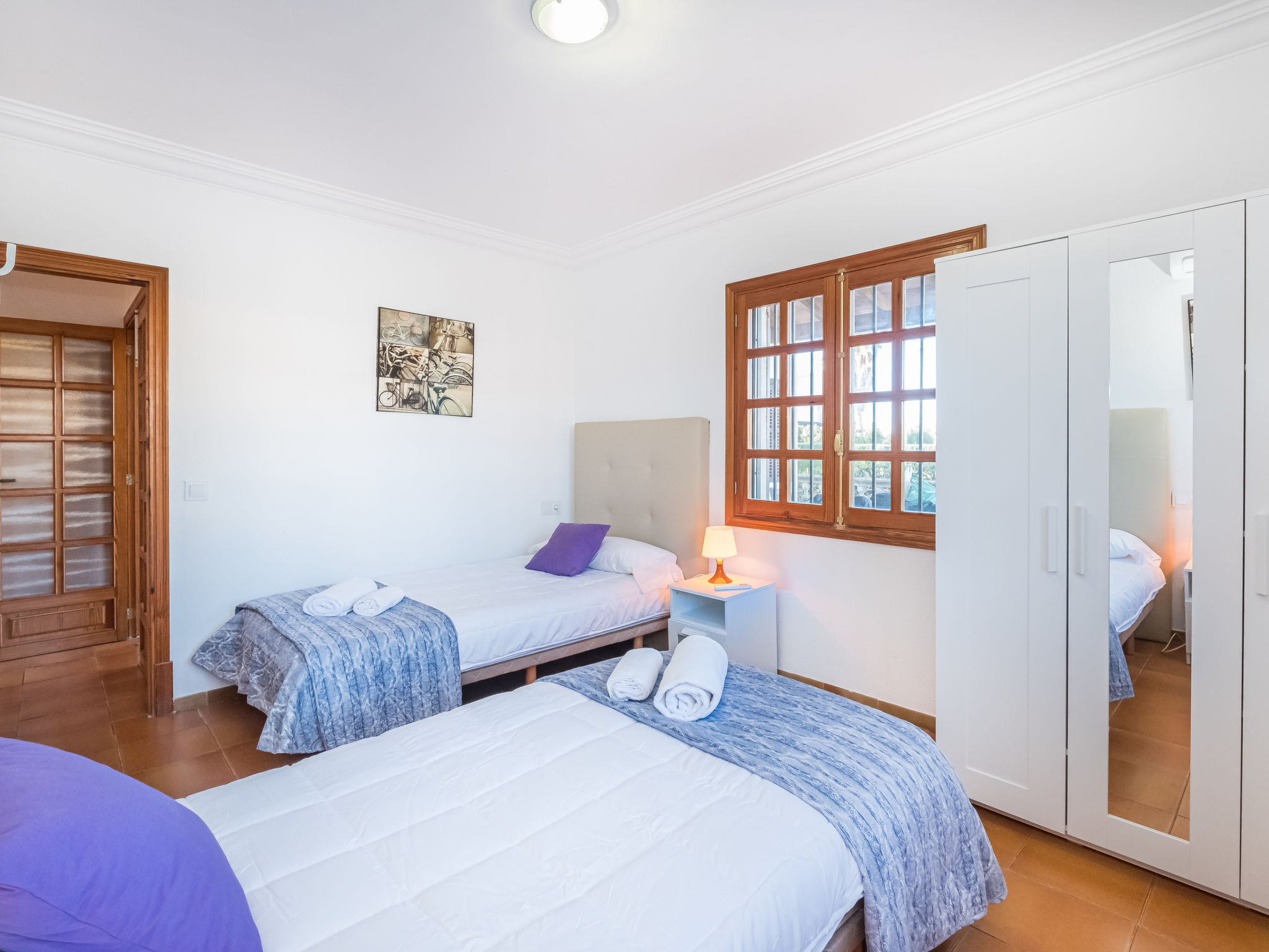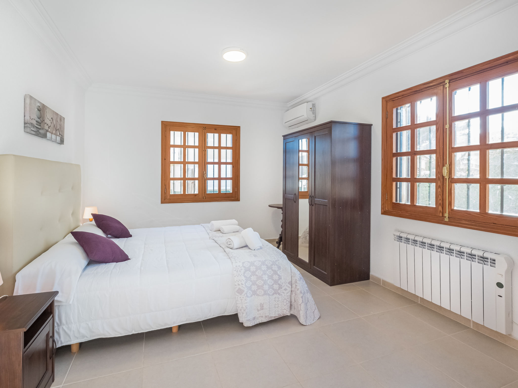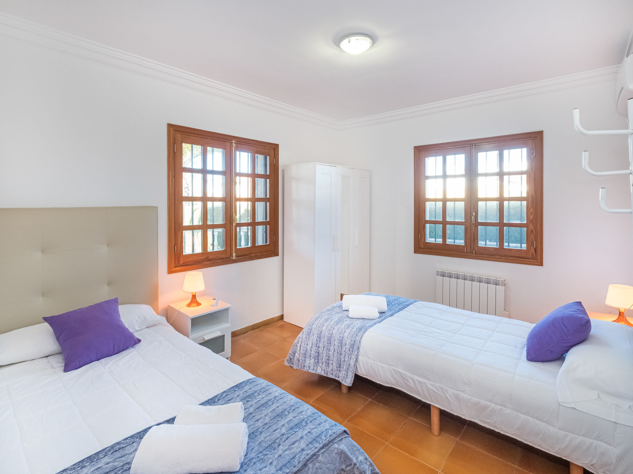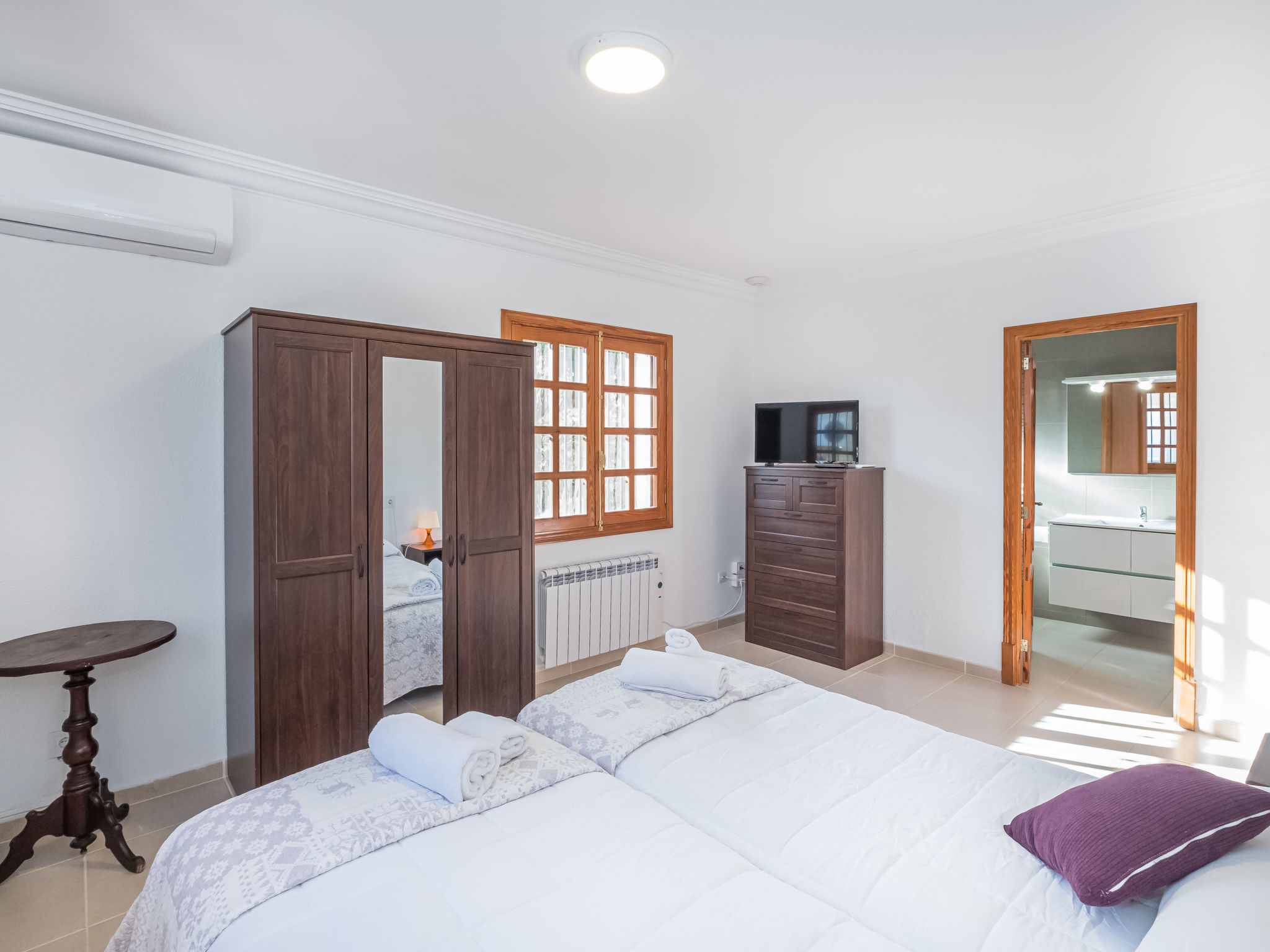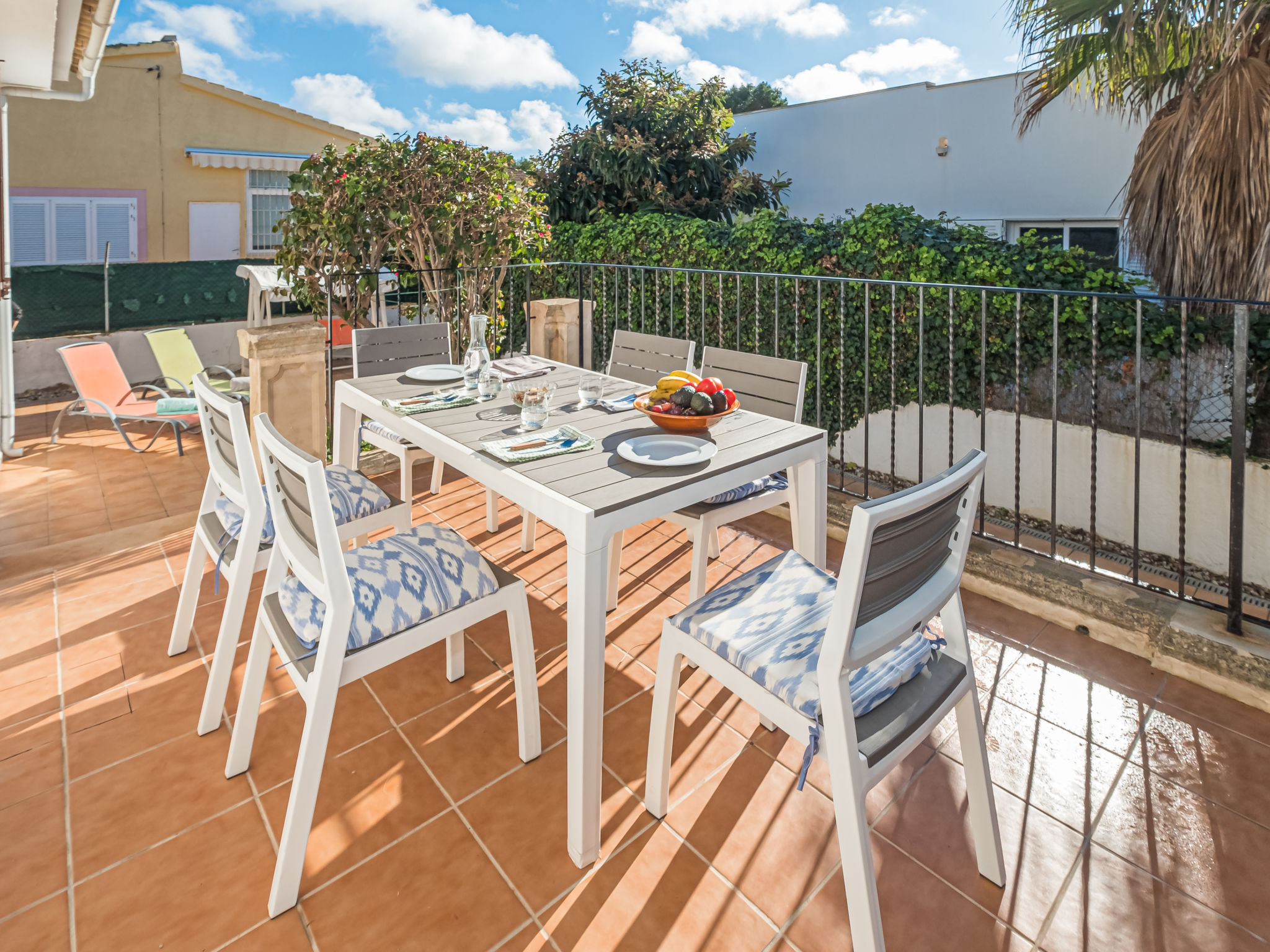 "Dofins Bahia Azul", 4-Zimmer-Villa 180 m2, im erhöhten Erdgeschoss. Objekt geeignet für 6 Erwachsene. Geräumig und hell, teilweise renoviert, zweckmässig und komfortabel eingerichtet: grosses Wohn-/Esszimmer mit offenem Kamin (nur Deko), Esstisch, Digital-TV, Flachbildschirm, E-Heizung, Klimaanlage und Warmluftheizung. Ausgang zum Gartensitzplatz, zum Schwimmbad. 1 grosses Doppelzimmer mit Panoramafenster mit 2 Betten (90 cm, Länge 200 cm), Dusche/WC, Digital-TV, Flachbildschirm, E-Heizung, Klimaanlage und Warmluftheizung. 2 grosse Doppelzimmer, jedes Zimmer mit 2 Betten (105 cm, Länge 200 cm), E-Heizung, Klimaanlage und Warmluftheizung. Wohnküche (Backofen, 3 Glaskeramikherd Platten, Toaster, Wasserkocher, Mikrowelle, Tiefkühler, elektrische Kaffeemaschine) mit Esstisch, E-Heizung. Ausgang zum Gartensitzplatz. Dusche/Bidet/WC. E-Heizung. 2 grosse Terrassen, Garten, Rasen, Laube. Terrassenmöbel, Gartengrill, Liegestühle, Loggia. Sicht auf die Ortschaft. Zur Verfügung: Waschmaschine, Wäschetrockner, Bügeleisen, Kinderhochstuhl, Babybett bis 2 Jahre, Haartrockner. Internet (Wireless LAN, gratis). Parkplatz (eingezäunt) beim Haus. Bitte beachten: geeignet für Familien. Nichtraucher-Haus. Feuerlöscher. ETV7913